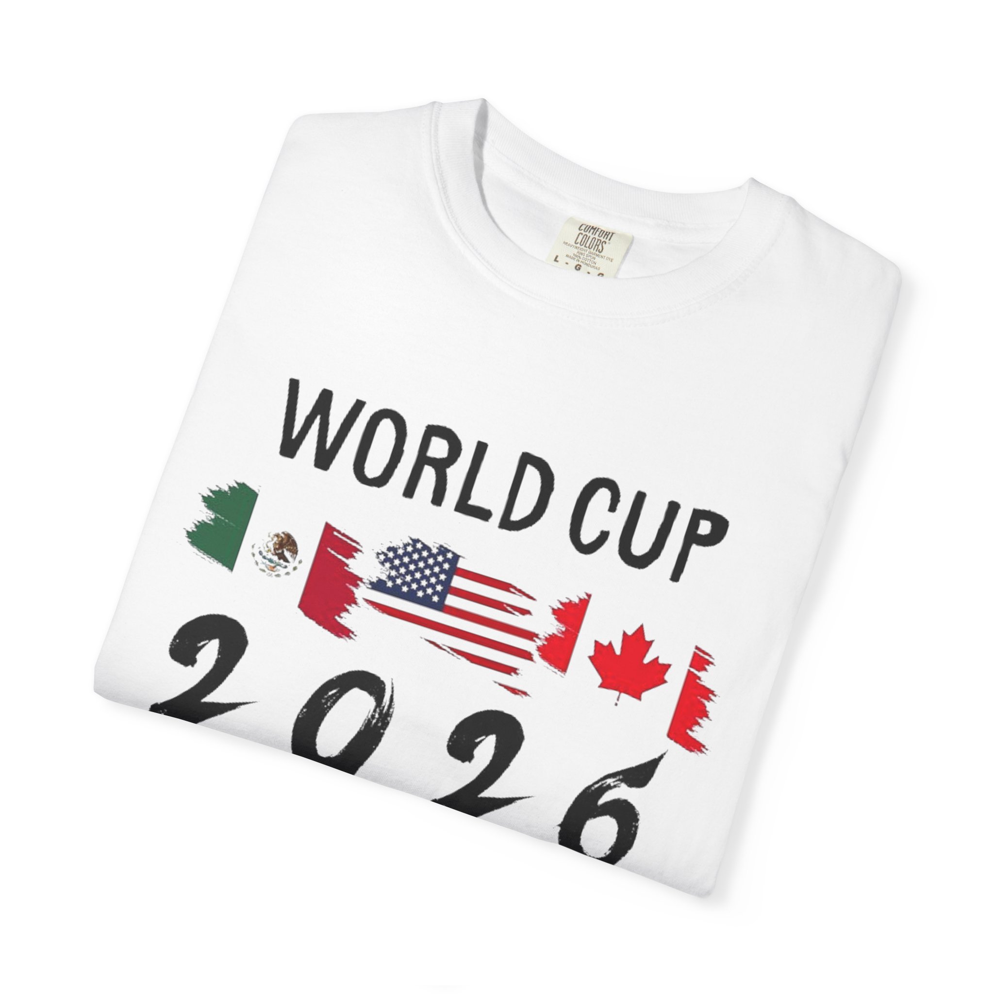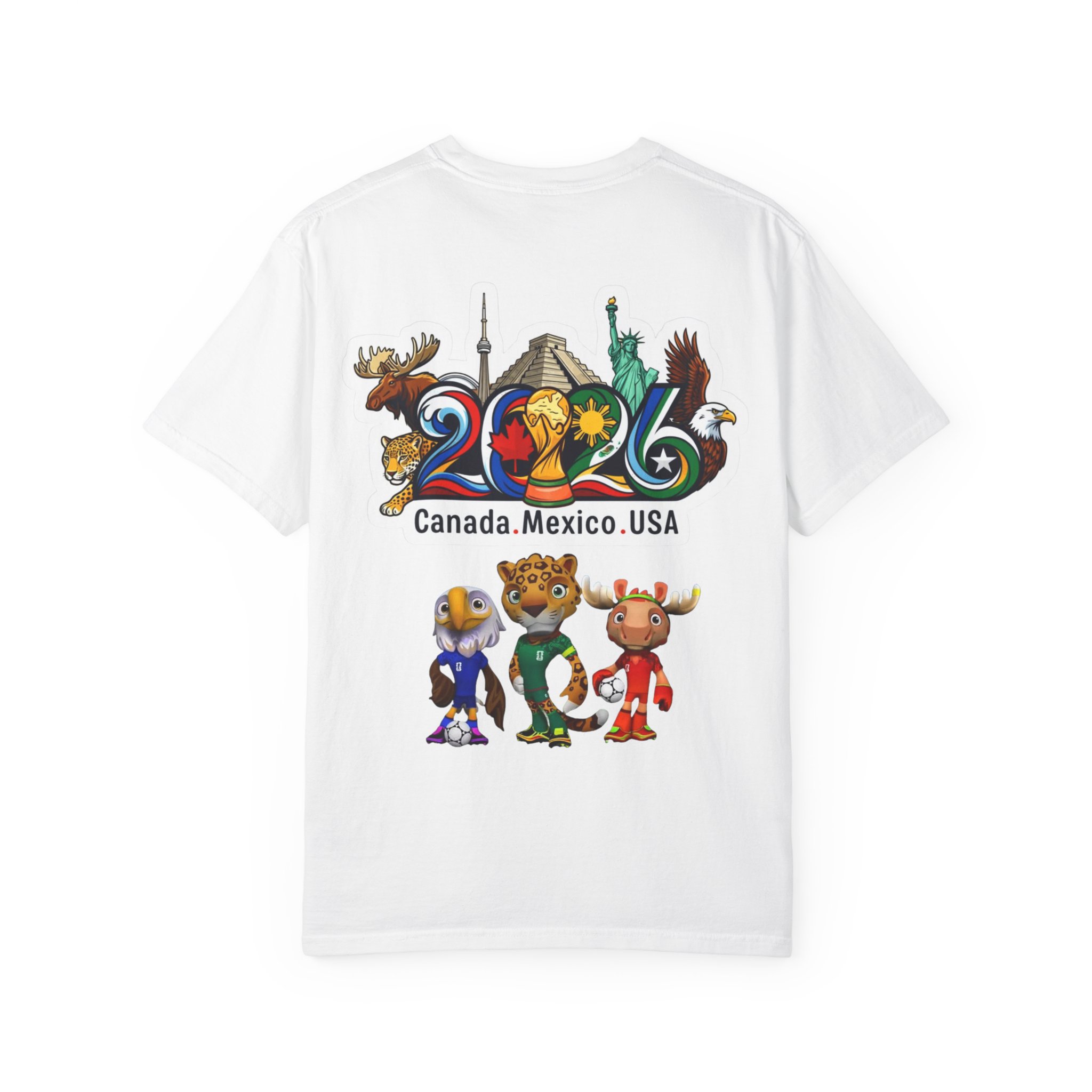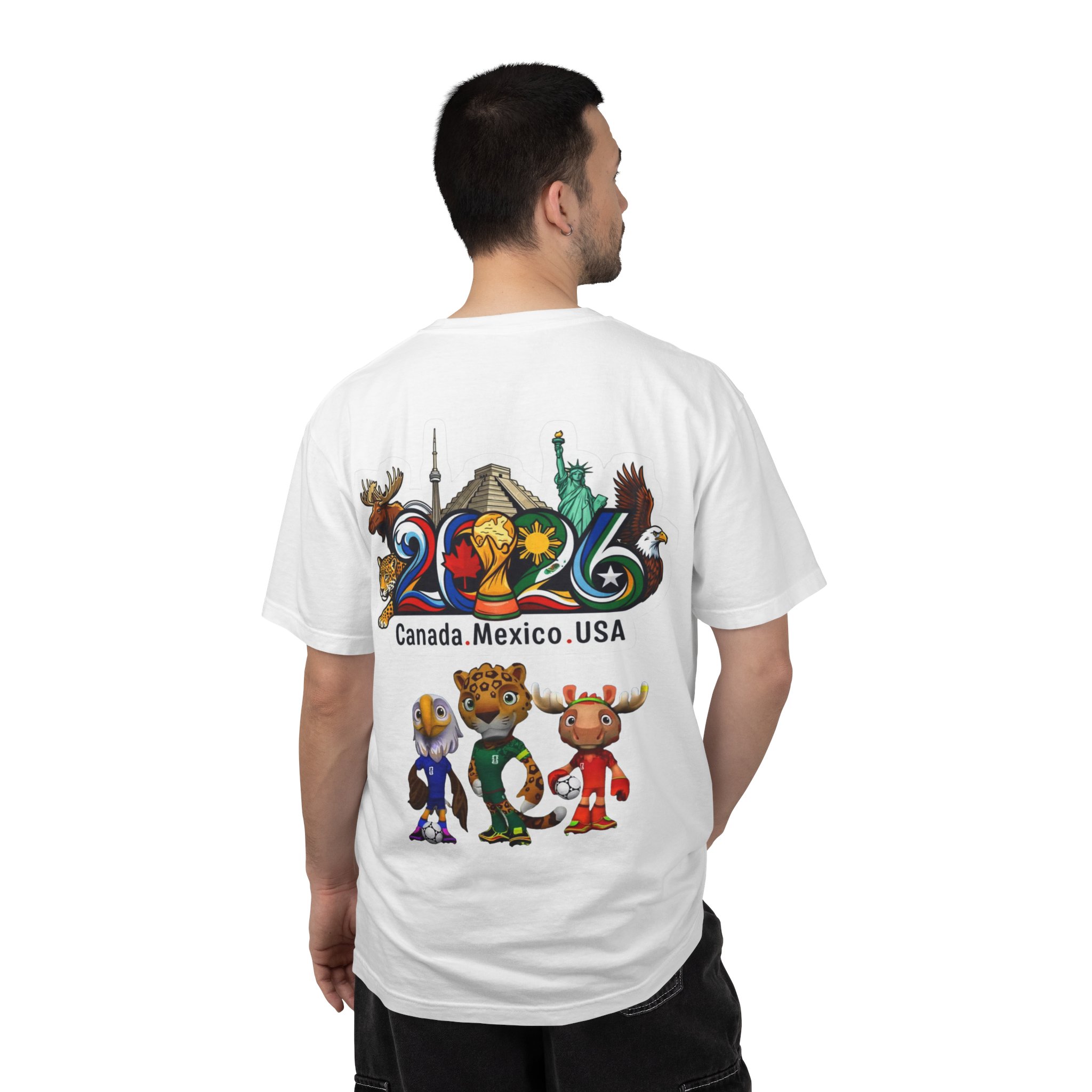 Celebrate the 2026 World Cup with a soft, garment-dyed tee that feels lived-in from the first wear. The relaxed, heavyweight cotton holds bold, colorful prints—front text and flags that nod to the tri-nation hosts, and a vibrant back scene featuring iconic landmarks and playful mascots. It sits comfortably on the sidelines, in the stands, or at watch parties, bringing stadium energy to everyday moments. Wear it with worn denim or layered under a jacket for game day or travel. The dyed finish gives each shirt a slightly unique tone and a vintage, well-loved look that blends with your regular rotation.