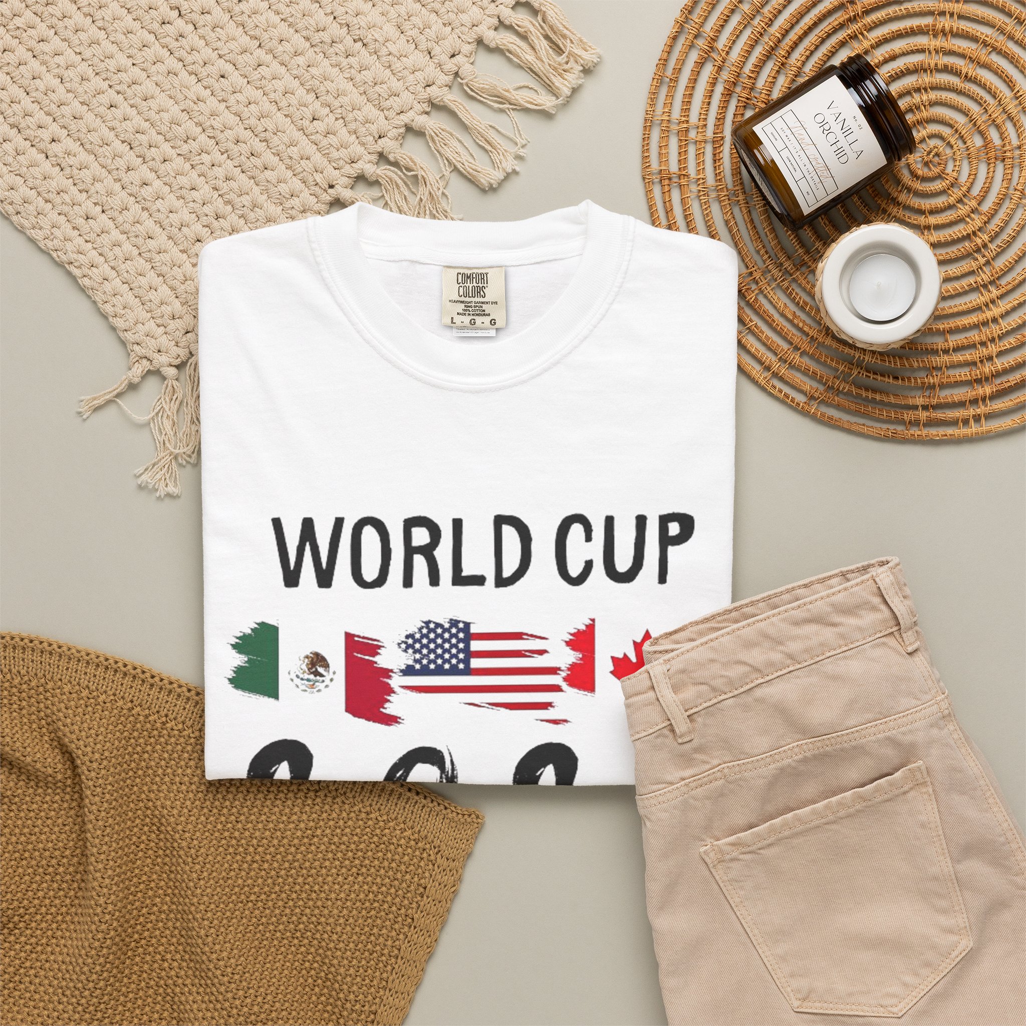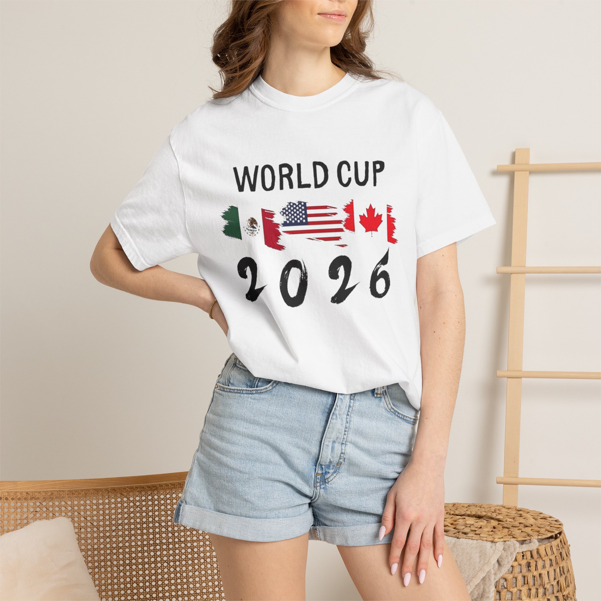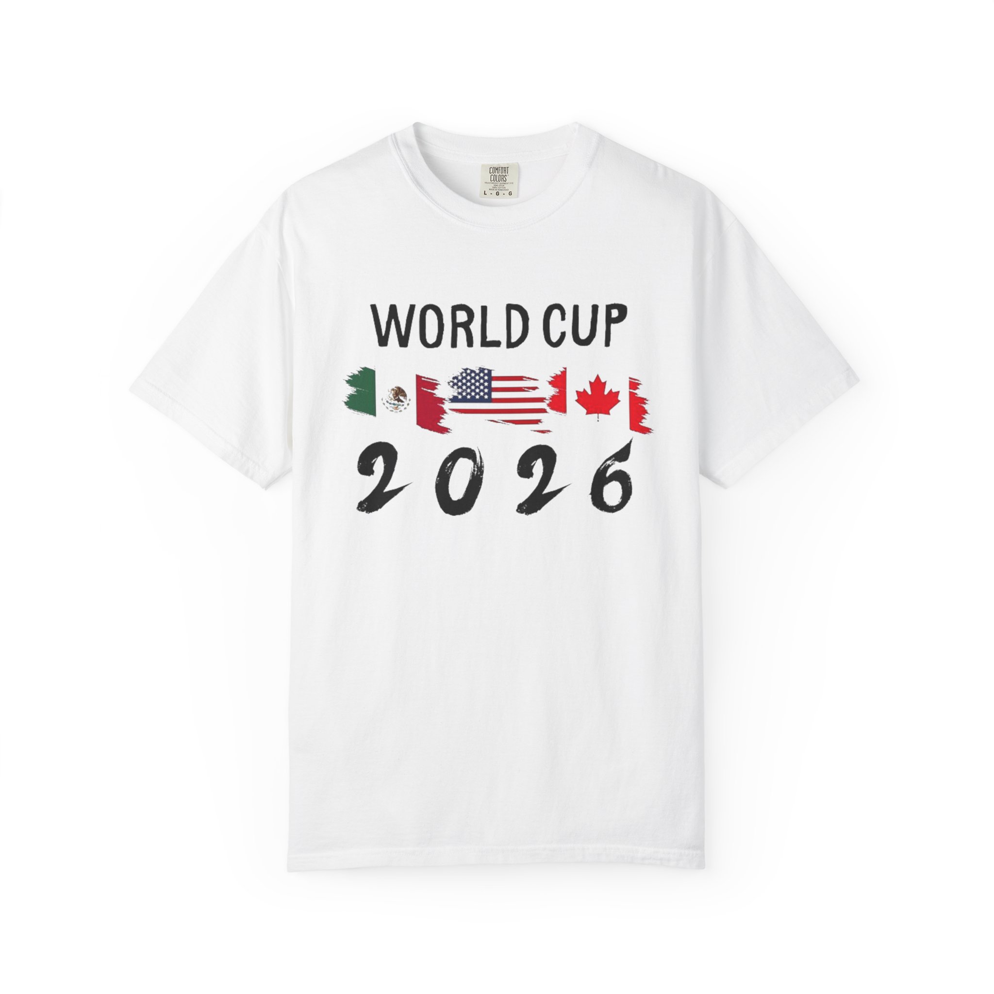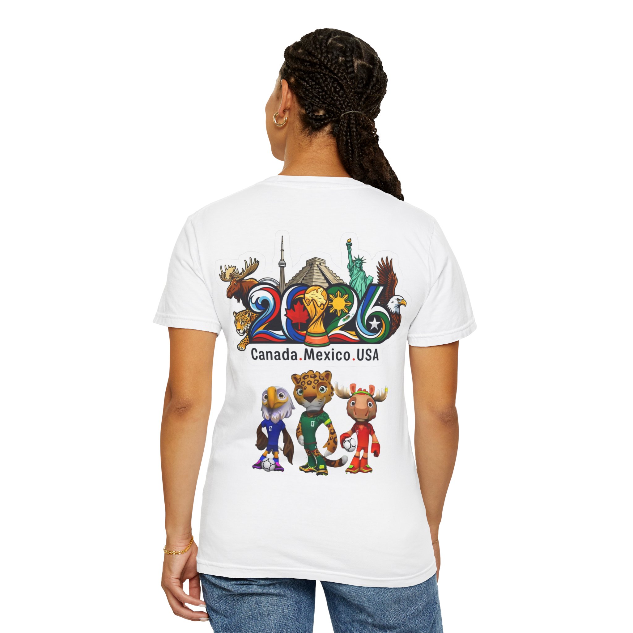Celebrate the 2026 World Cup with a soft, garment-dyed tee that feels lived-in from the first wear. The relaxed, heavyweight cotton holds bold, colorful prints—front text and flags that nod to the tri-nation hosts, and a vibrant back scene featuring iconic landmarks and playful mascots. It sits comfortably on the sidelines, in the stands, or at watch parties, bringing stadium energy to everyday moments. Wear it with worn denim or layered under a jacket for game day or travel. The dyed finish gives each shirt a slightly unique tone and a vintage, well-loved look that blends with your regular rotation.
