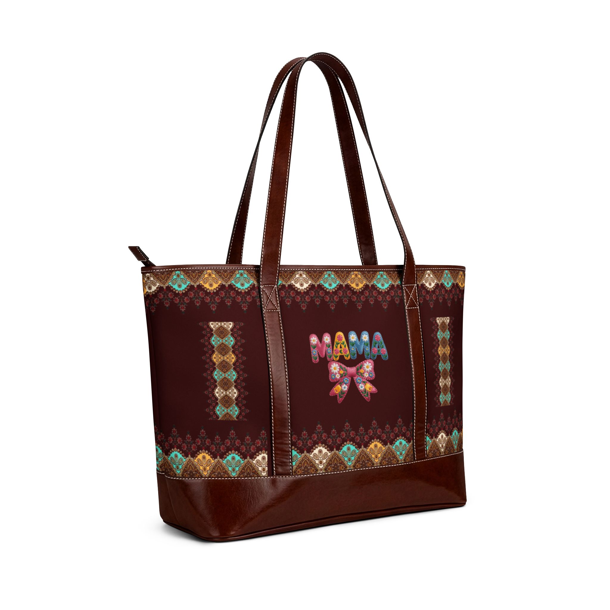 This handcrafted handbag blends practical design with a warm, folk-inspired look. Rich mahogany tones frame a central cat motif surrounded by geometric, tapestry-like accents. The roomy interior keeps everyday essentials organized with all-around pockets, while water-resistant polyester protects contents from unexpected weather. Faux leather handles and a reinforced base lend structure and a polished finish, making it a companion for days when you want function wrapped in rustic, artful style.