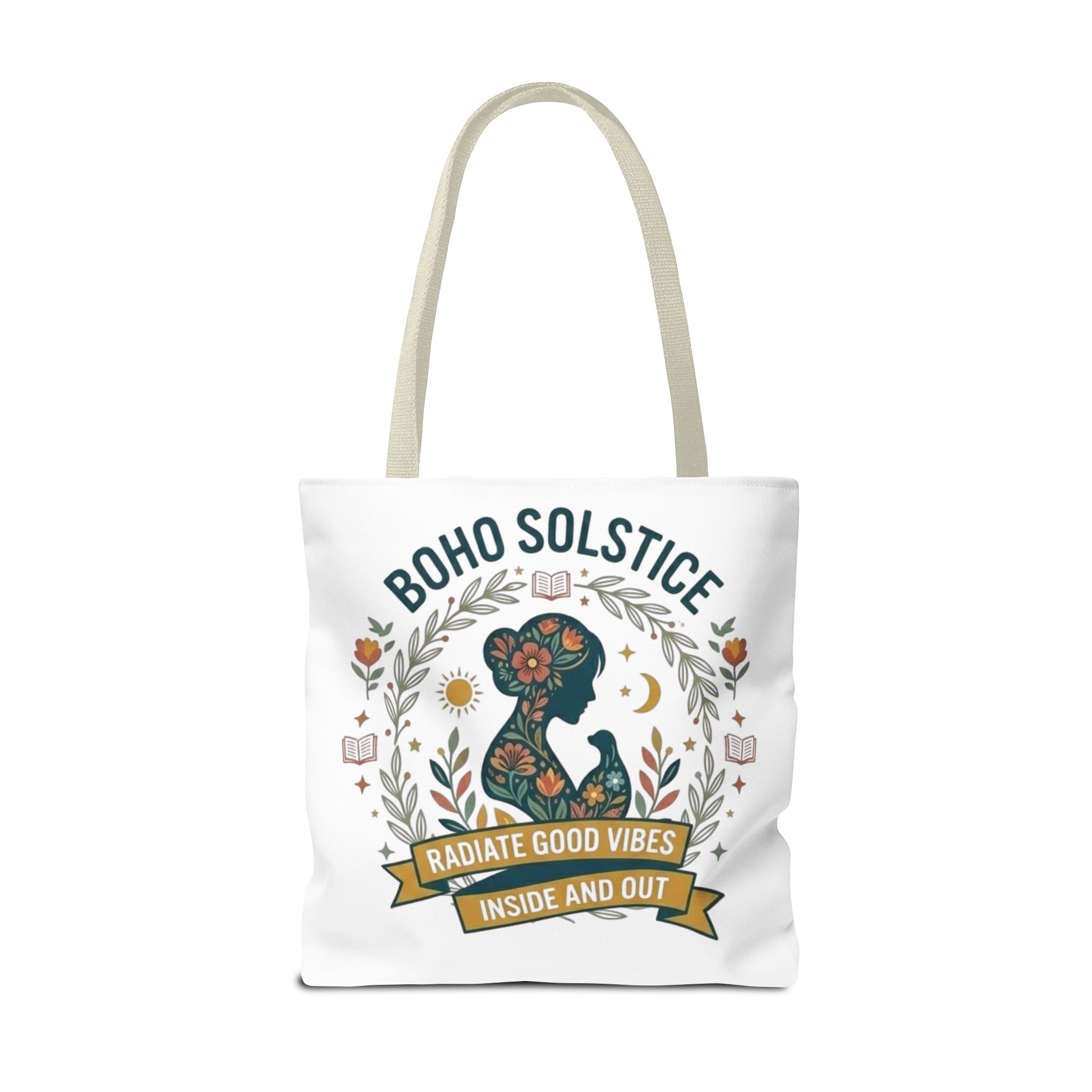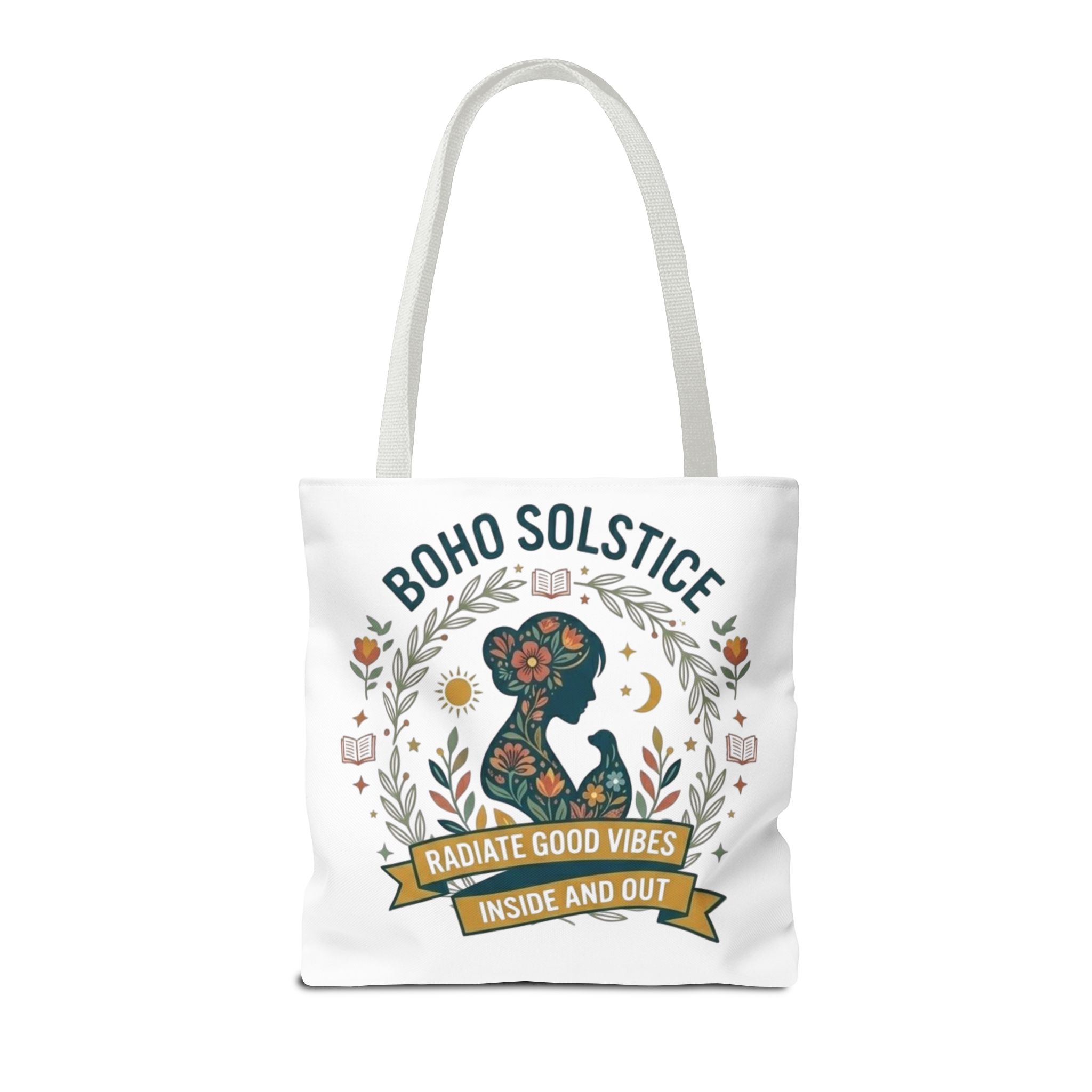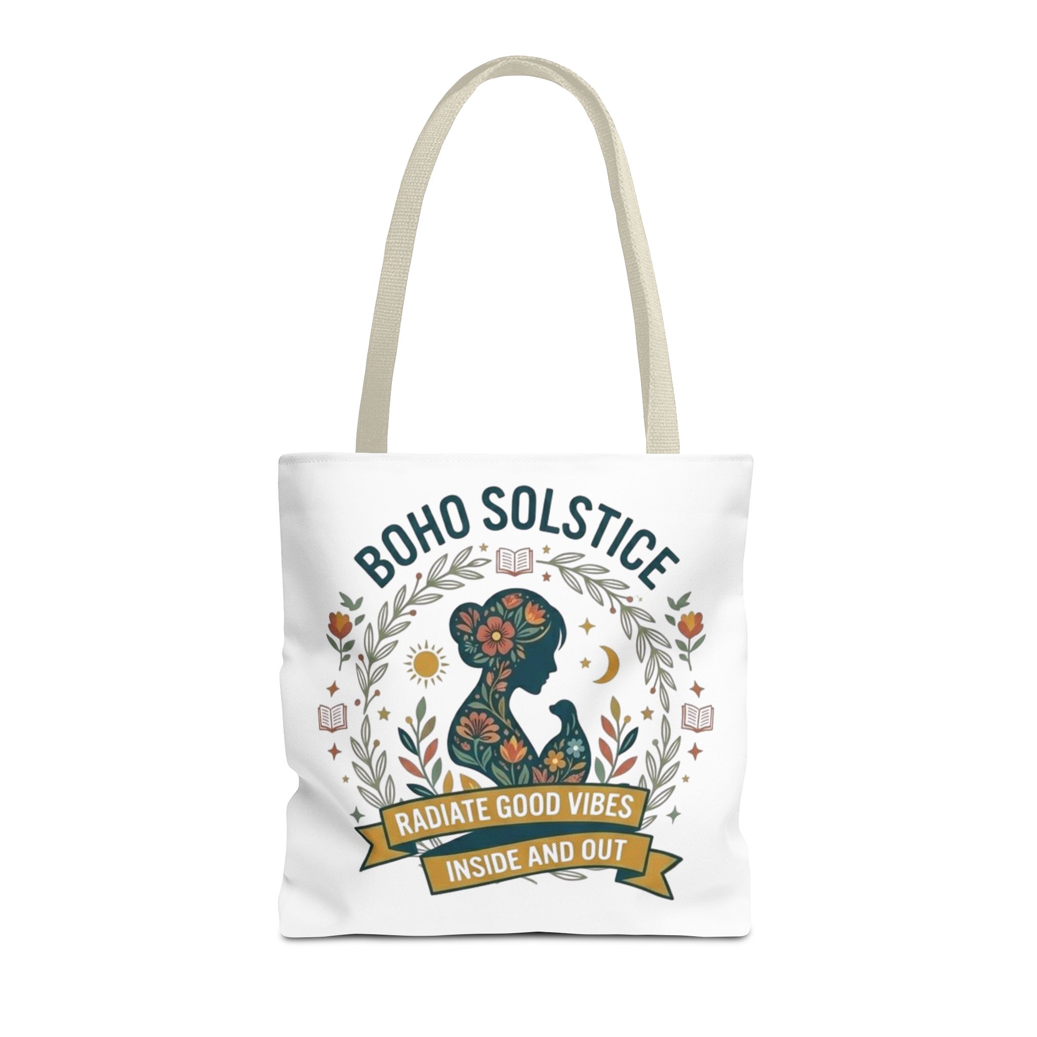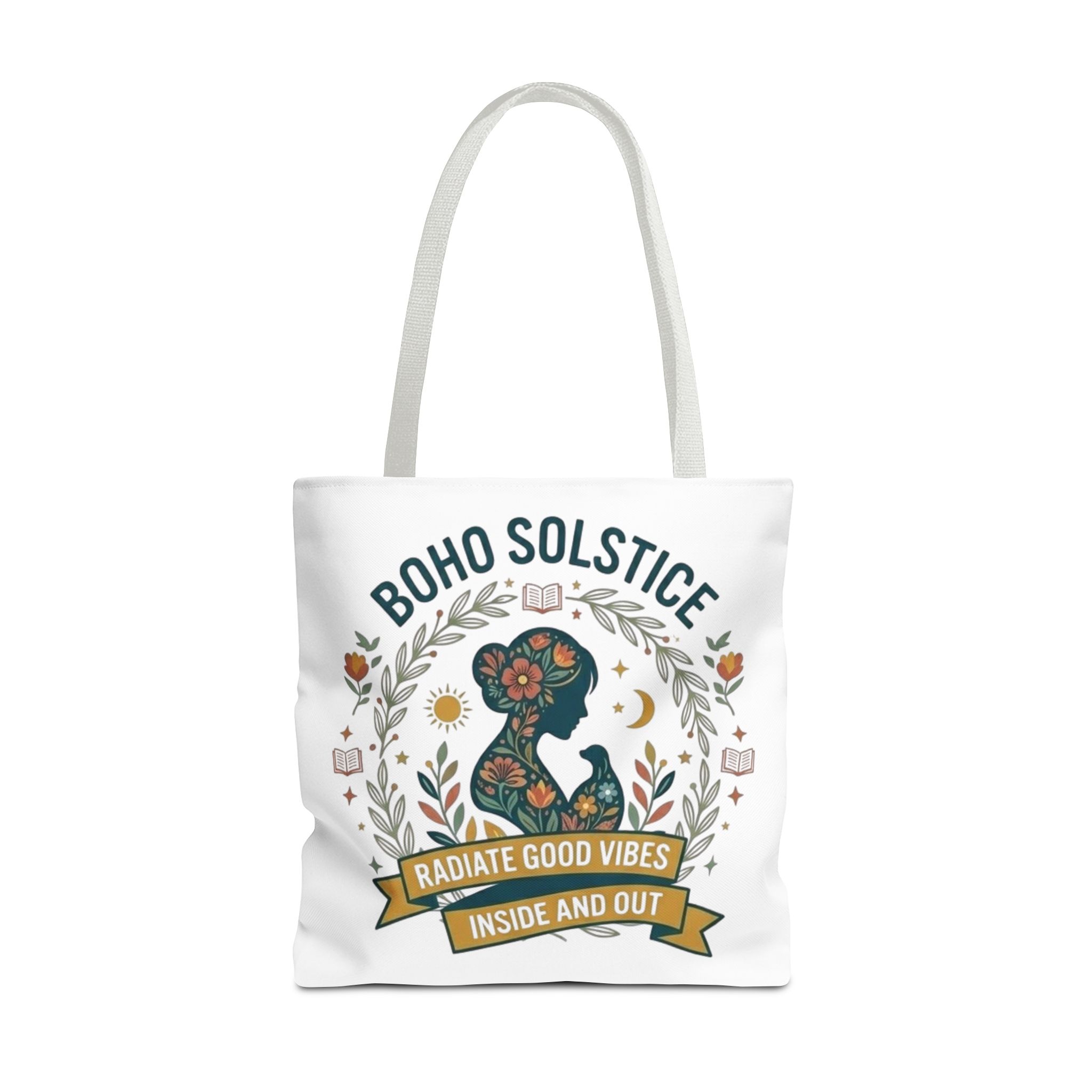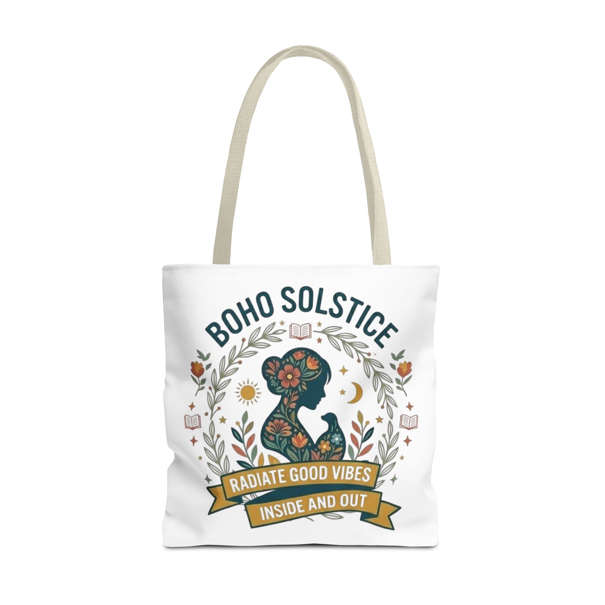 This roomy tote brings a gentle boho energy to everyday errands and seasonal rituals. Soft white polyester holds a colorful, nature-inspired silhouette framed in leafy wreaths and warm sun motifs. The illustration whispers of slow mornings, incense-streaked air, and long walks through golden fields — an accessory that carries books, market finds, or a picnic blanket while reflecting an inward calm. The sturdy construction and boxy shape mean it won’t sag under pottery or groceries, and the color-contrasting handles add a subtle, handcrafted touch that suits a wardrobe layered with linen, crochet, and well-worn denim. Use it during solstice gatherings, market mornings, or as a daily reminder to radiate good vibes.