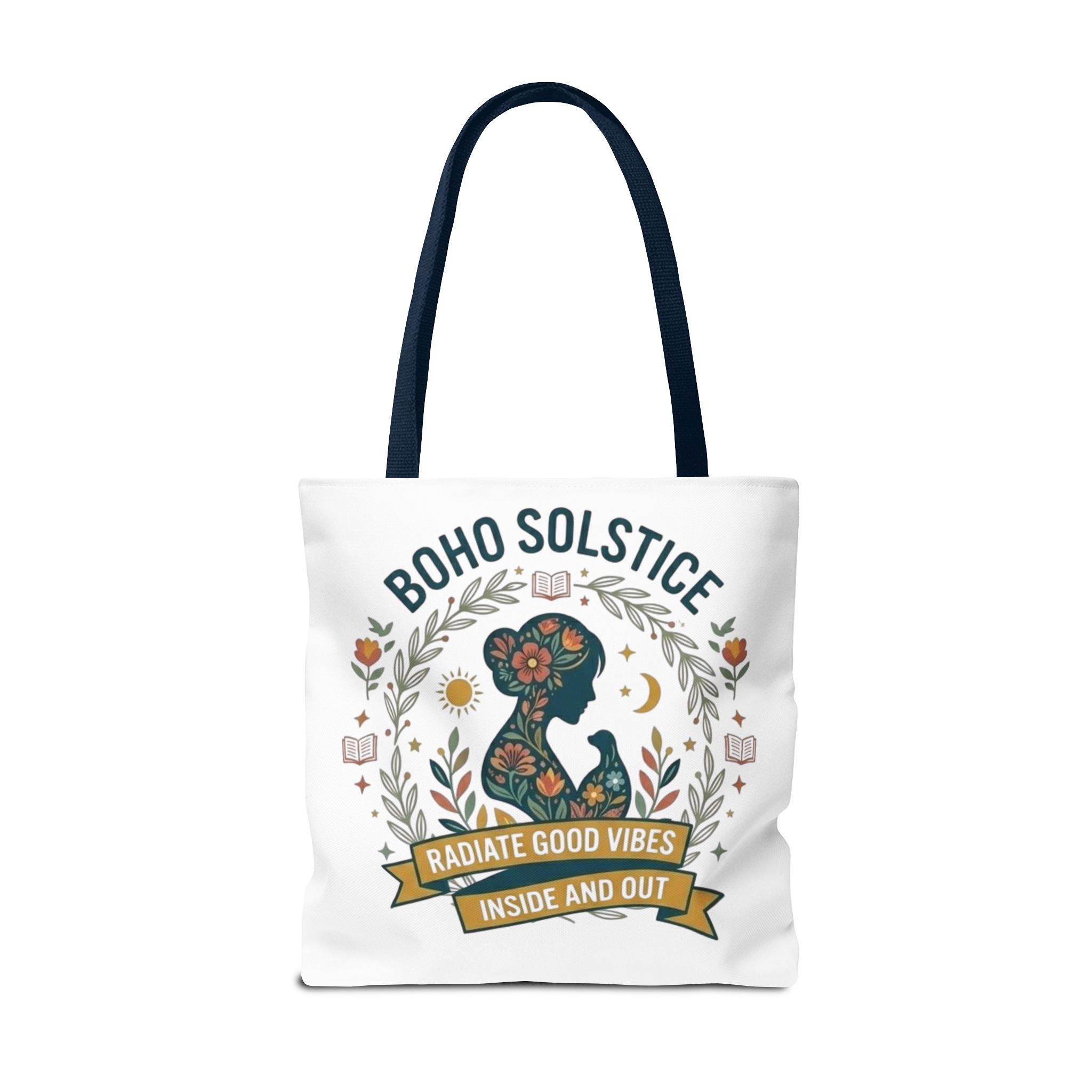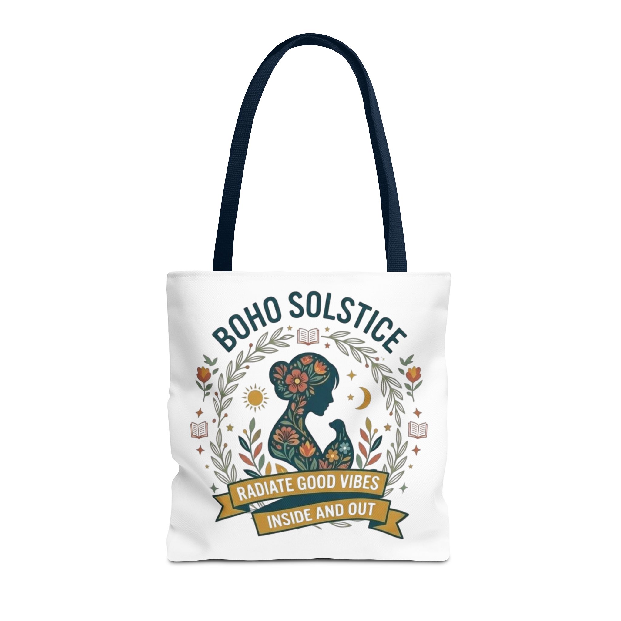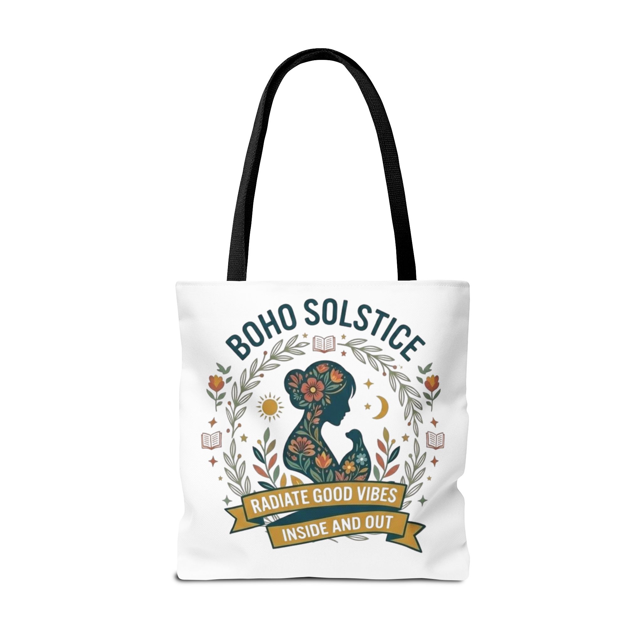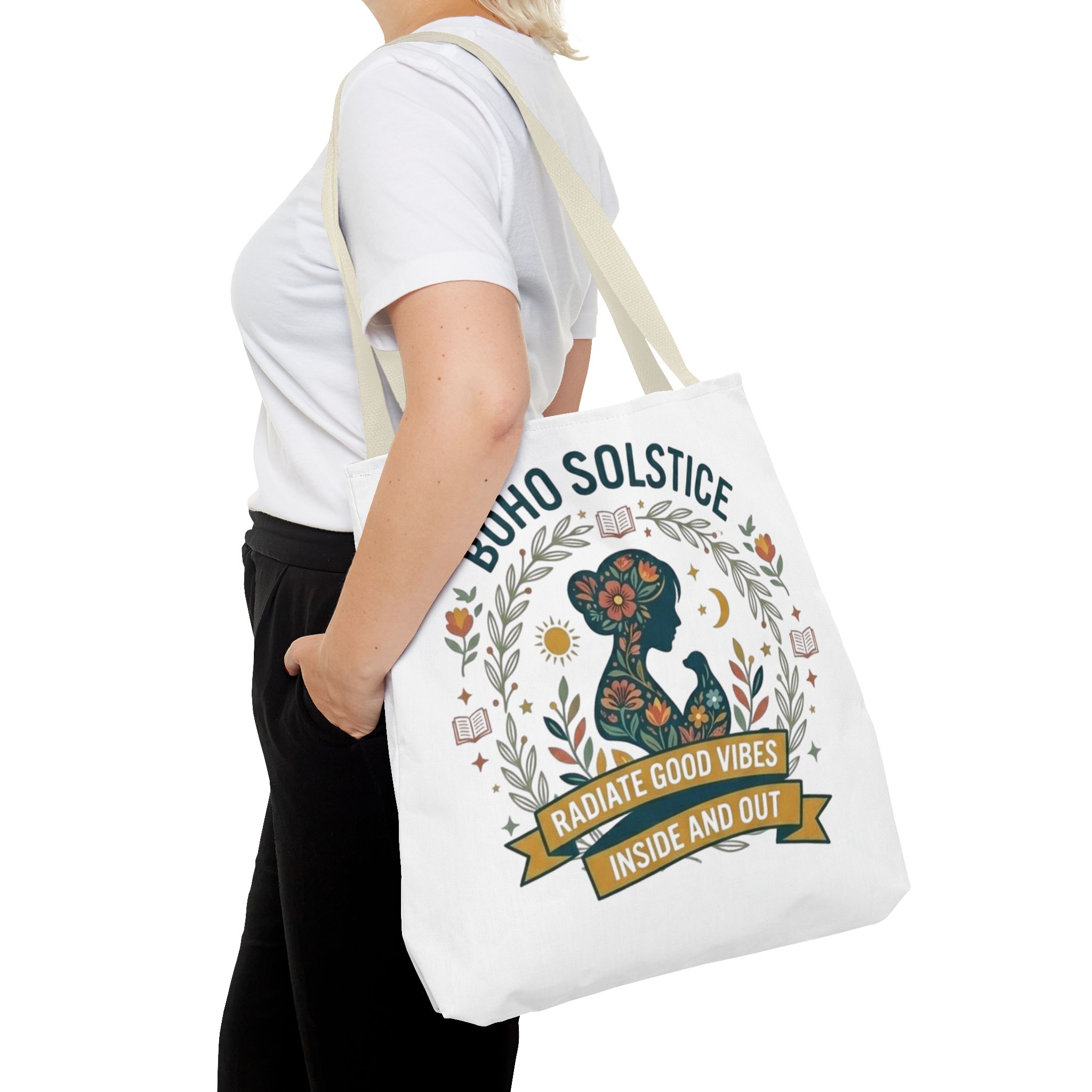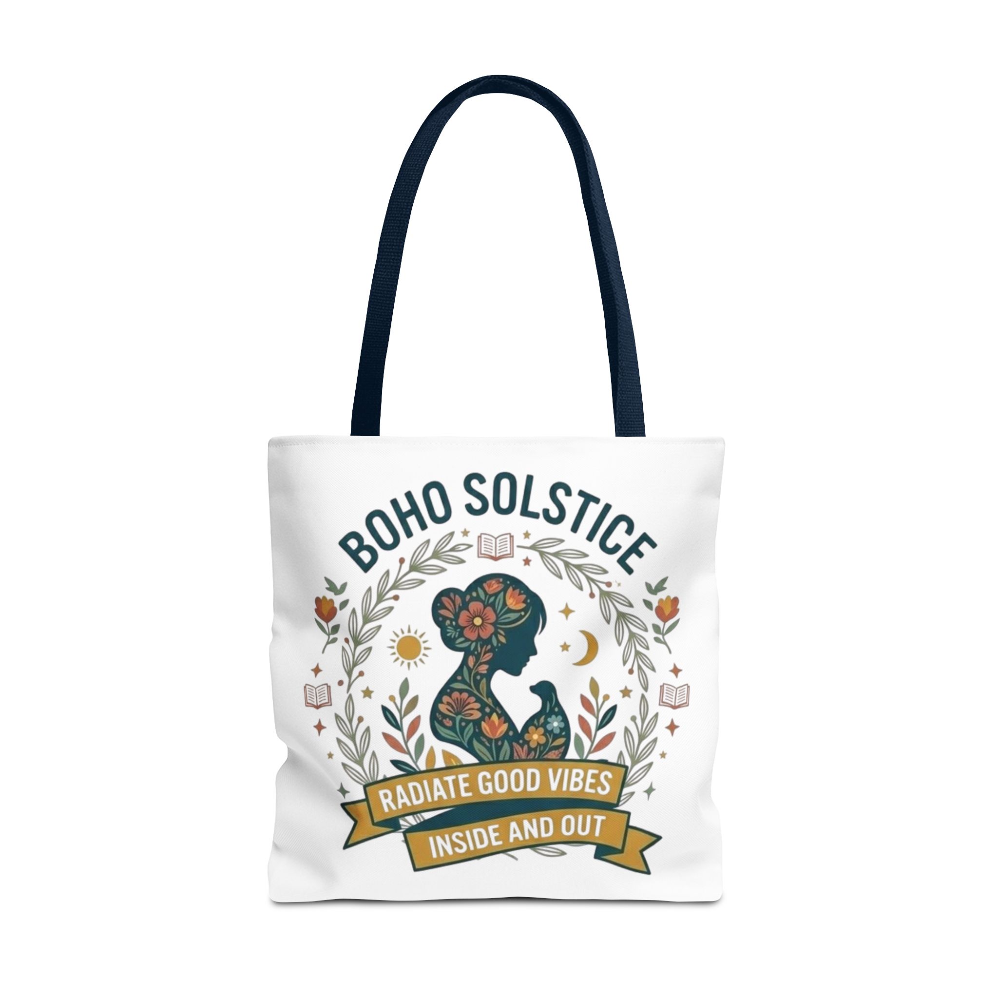 This roomy tote brings a gentle boho energy to everyday errands and seasonal rituals. Soft white polyester holds a colorful, nature-inspired silhouette framed in leafy wreaths and warm sun motifs. The illustration whispers of slow mornings, incense-streaked air, and long walks through golden fields — an accessory that carries books, market finds, or a picnic blanket while reflecting an inward calm. The sturdy construction and boxy shape mean it won’t sag under pottery or groceries, and the color-contrasting handles add a subtle, handcrafted touch that suits a wardrobe layered with linen, crochet, and well-worn denim. Use it during solstice gatherings, market mornings, or as a daily reminder to radiate good vibes.