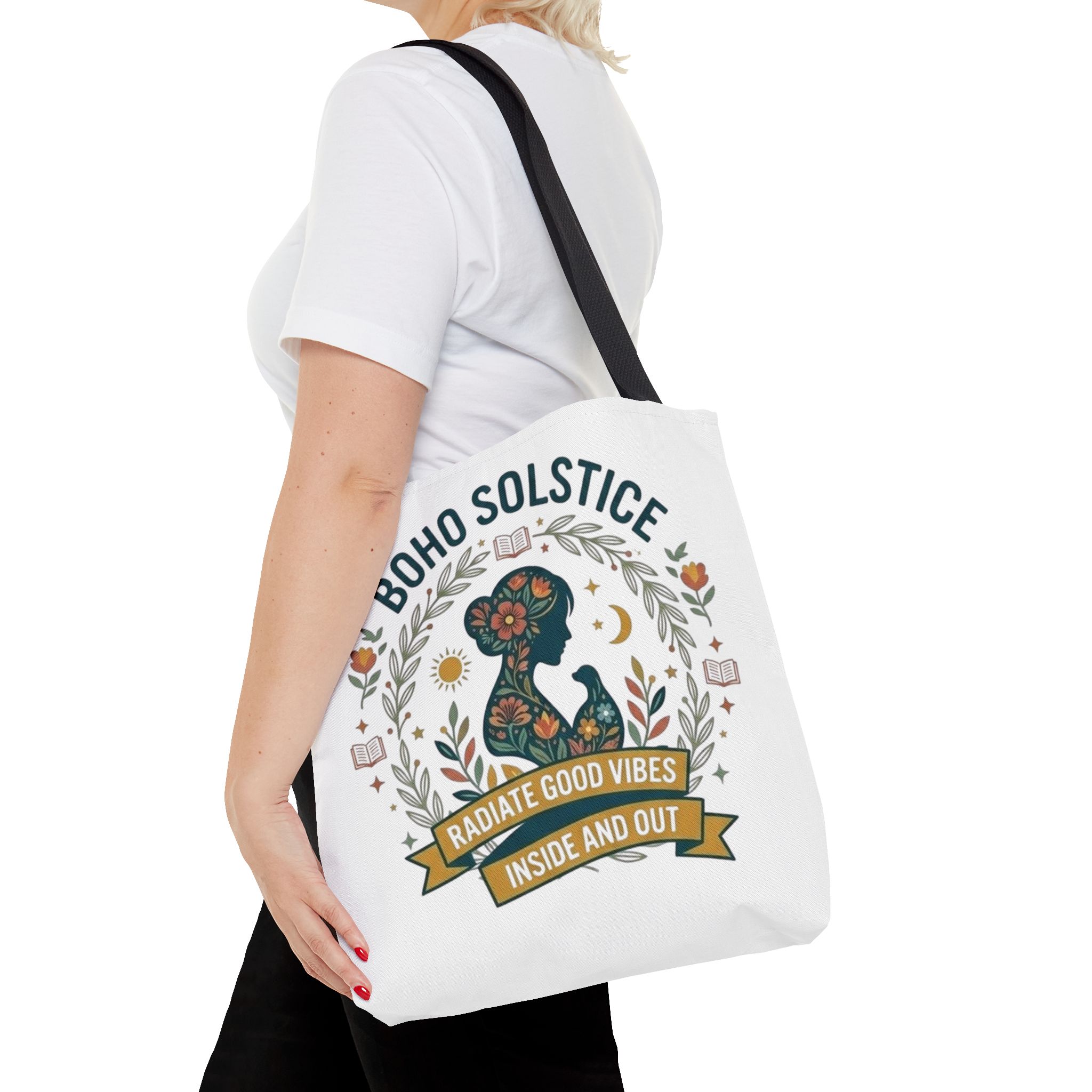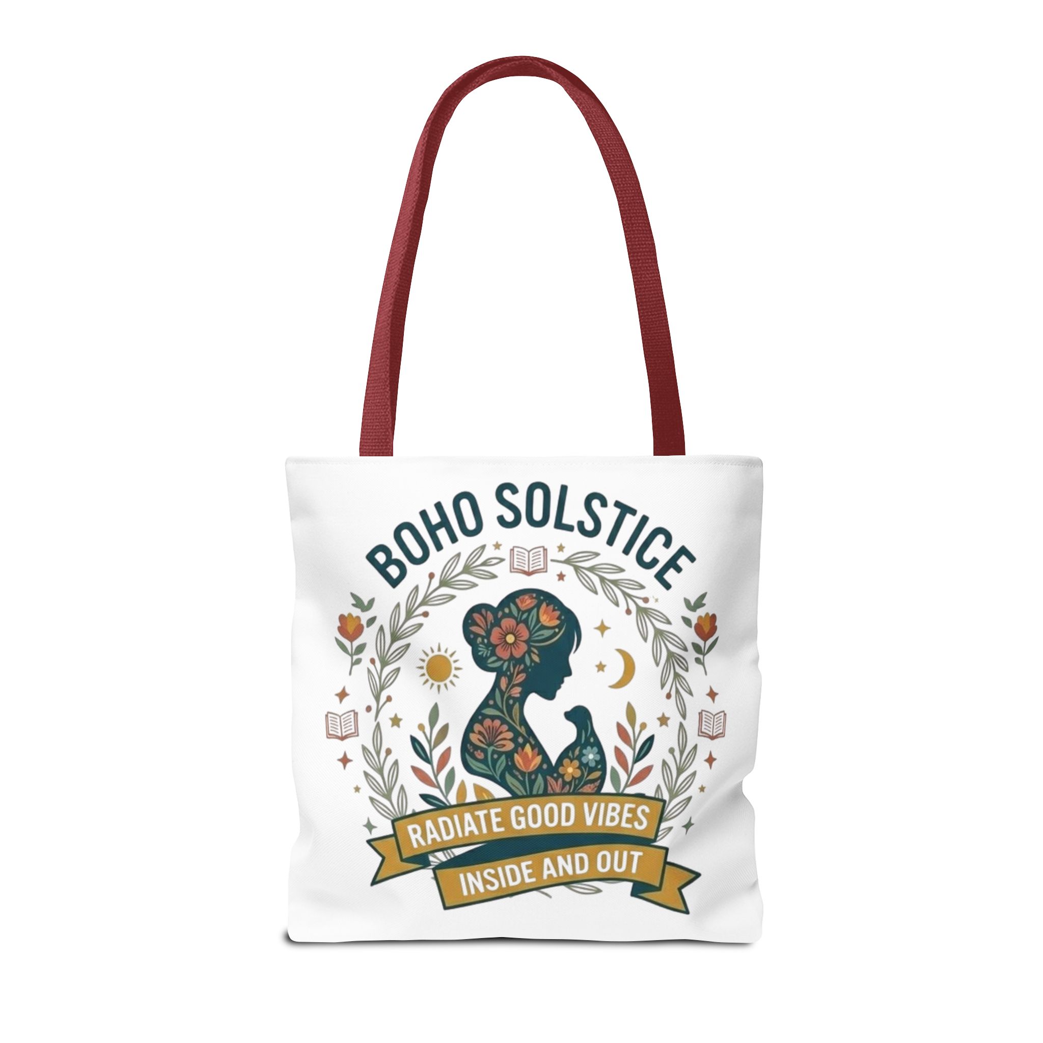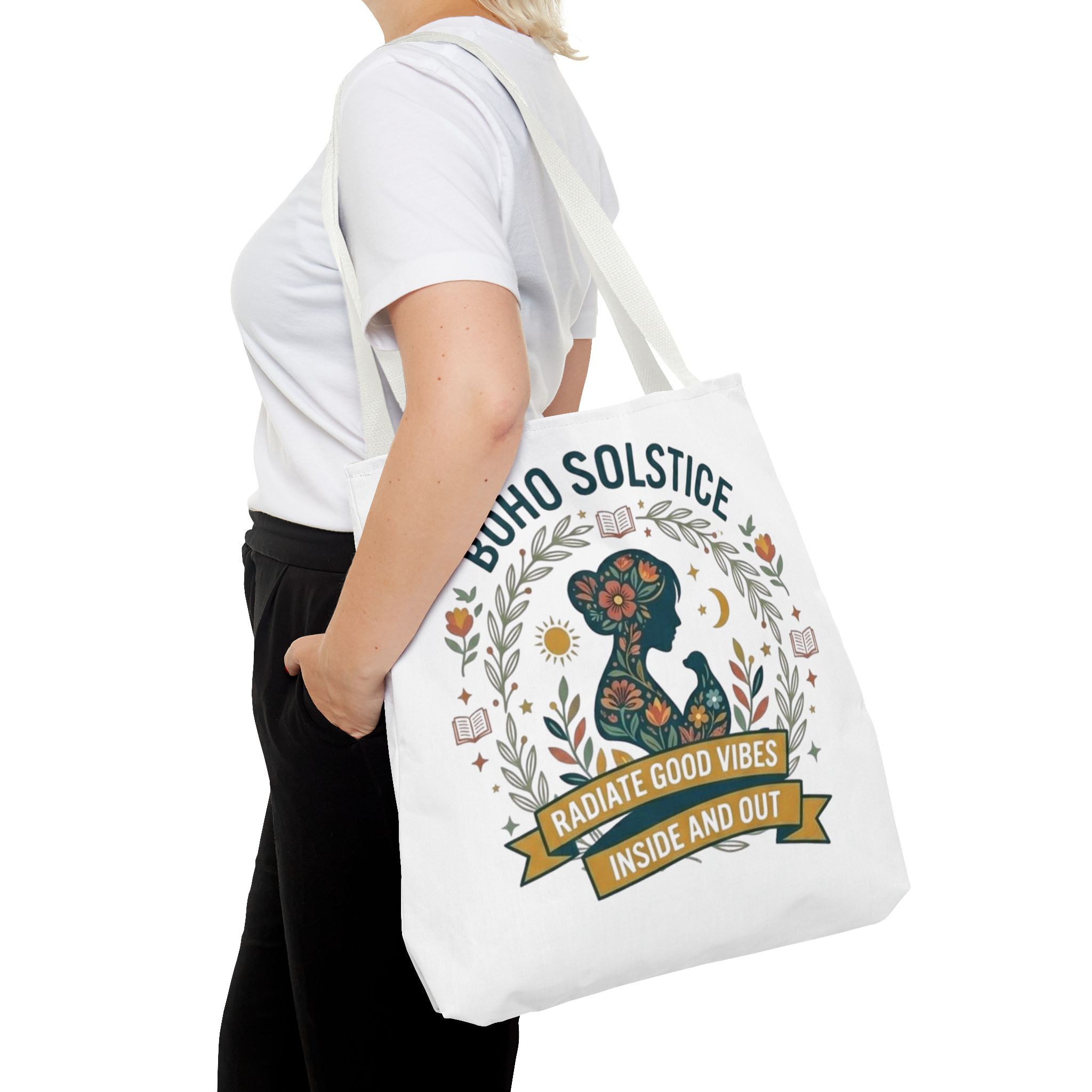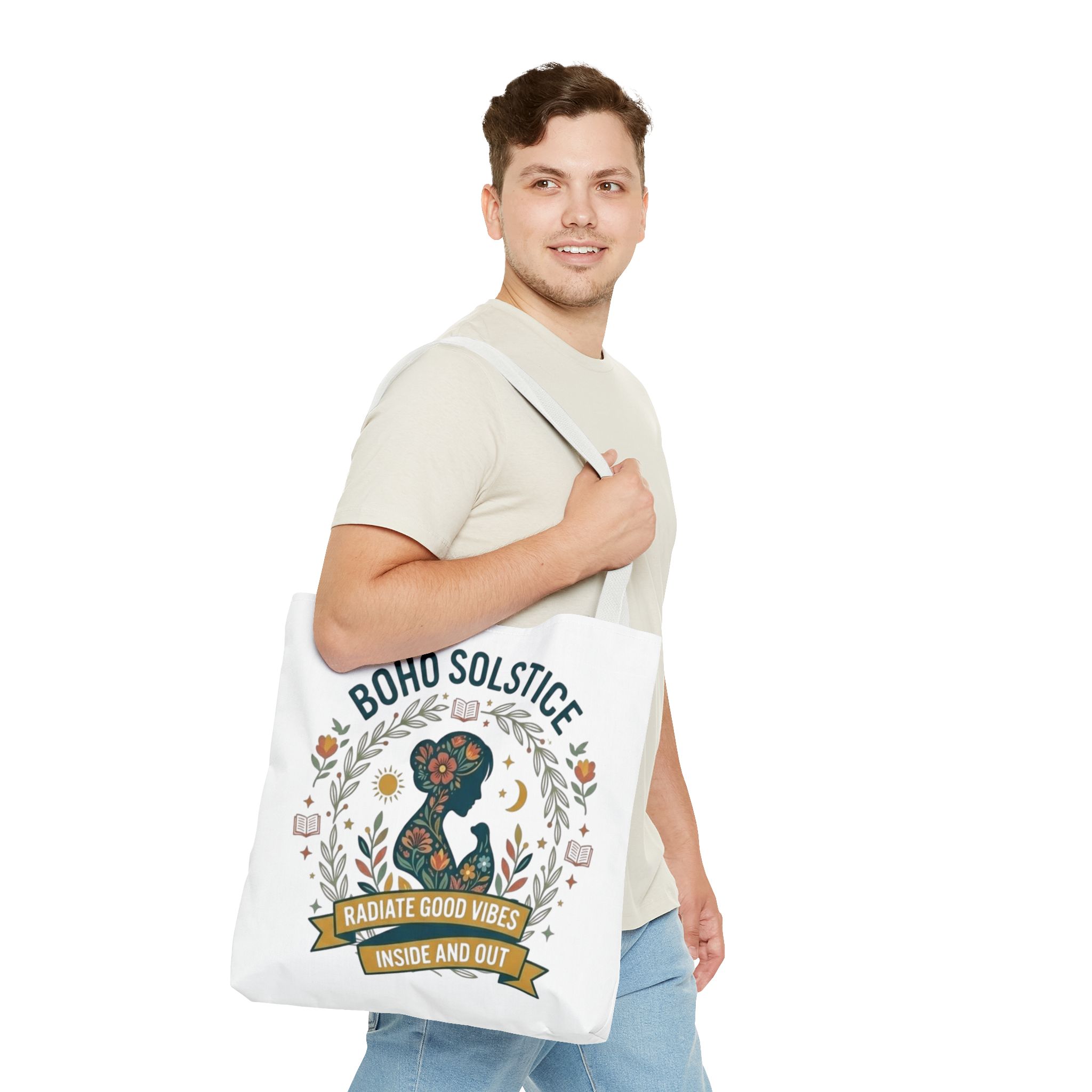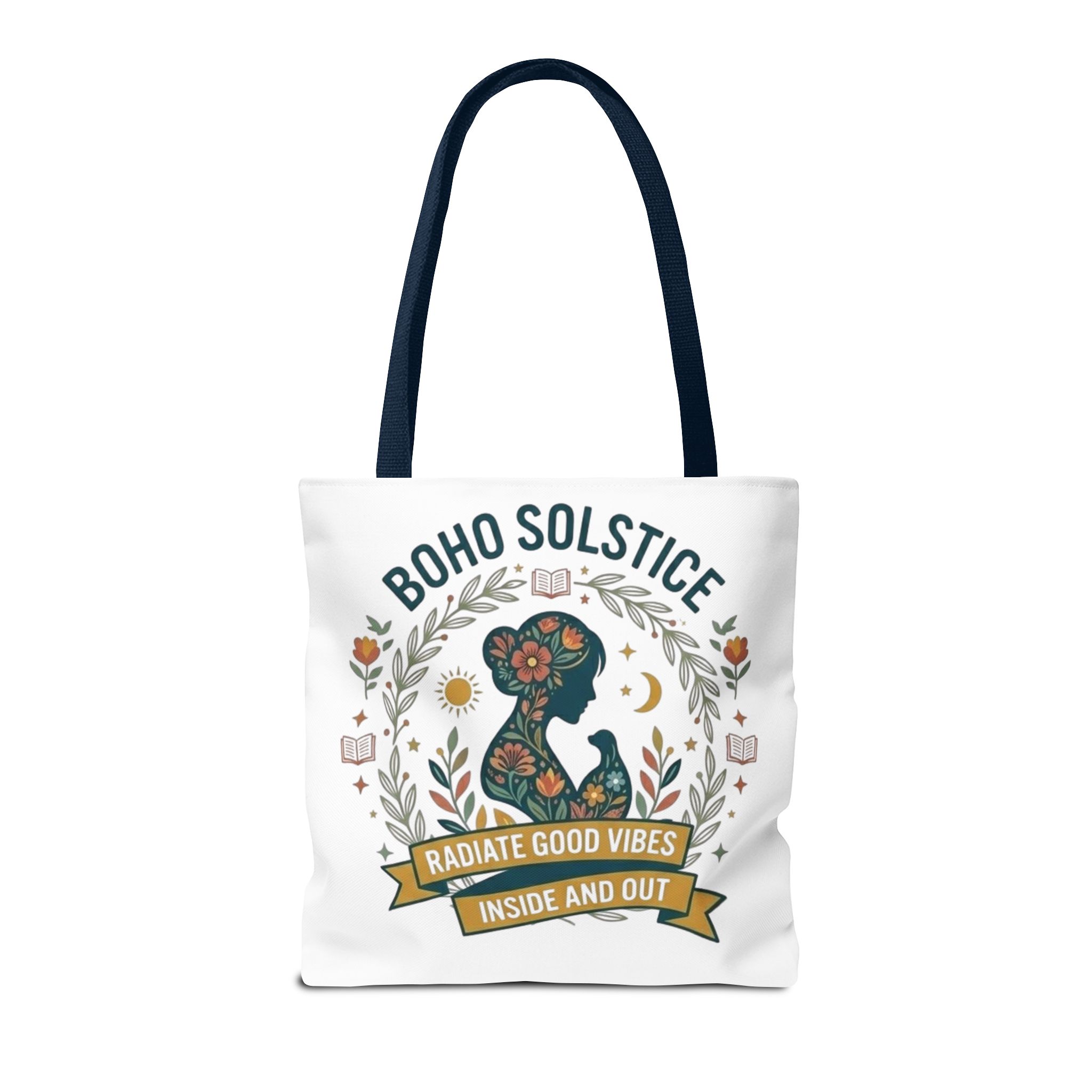 This roomy tote brings a gentle boho energy to everyday errands and seasonal rituals. Soft white polyester holds a colorful, nature-inspired silhouette framed in leafy wreaths and warm sun motifs. The illustration whispers of slow mornings, incense-streaked air, and long walks through golden fields — an accessory that carries books, market finds, or a picnic blanket while reflecting an inward calm. The sturdy construction and boxy shape mean it won’t sag under pottery or groceries, and the color-contrasting handles add a subtle, handcrafted touch that suits a wardrobe layered with linen, crochet, and well-worn denim. Use it during solstice gatherings, market mornings, or as a daily reminder to radiate good vibes.