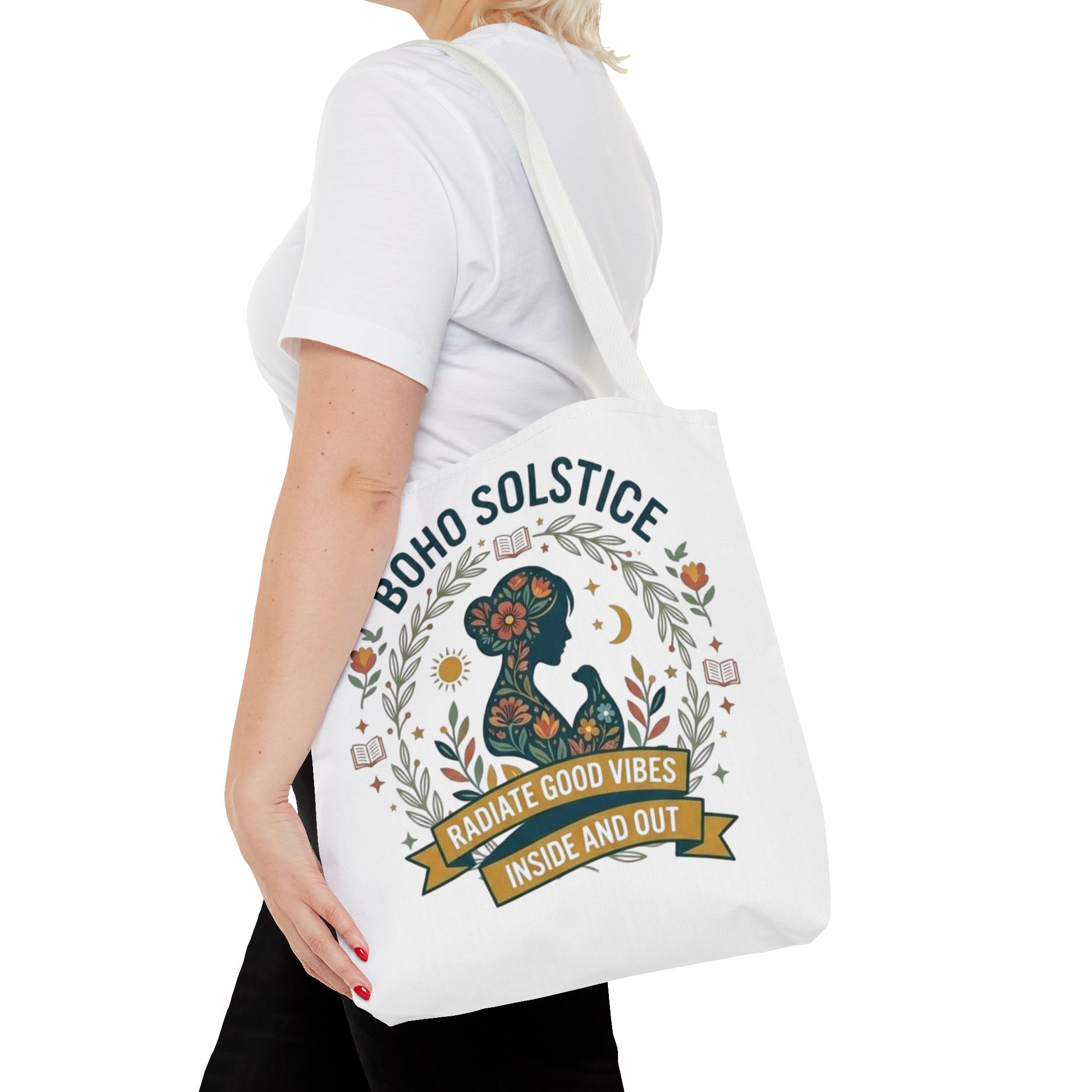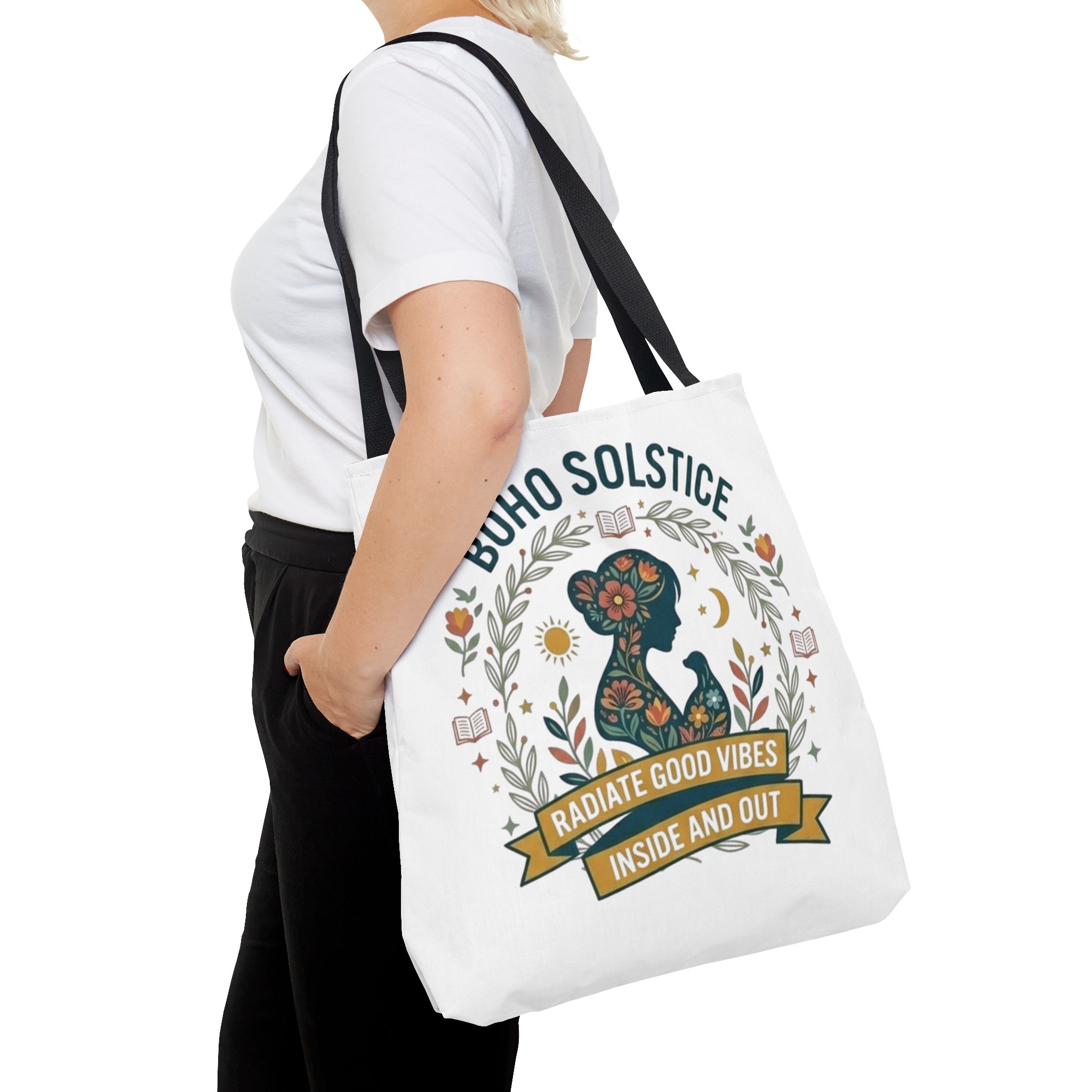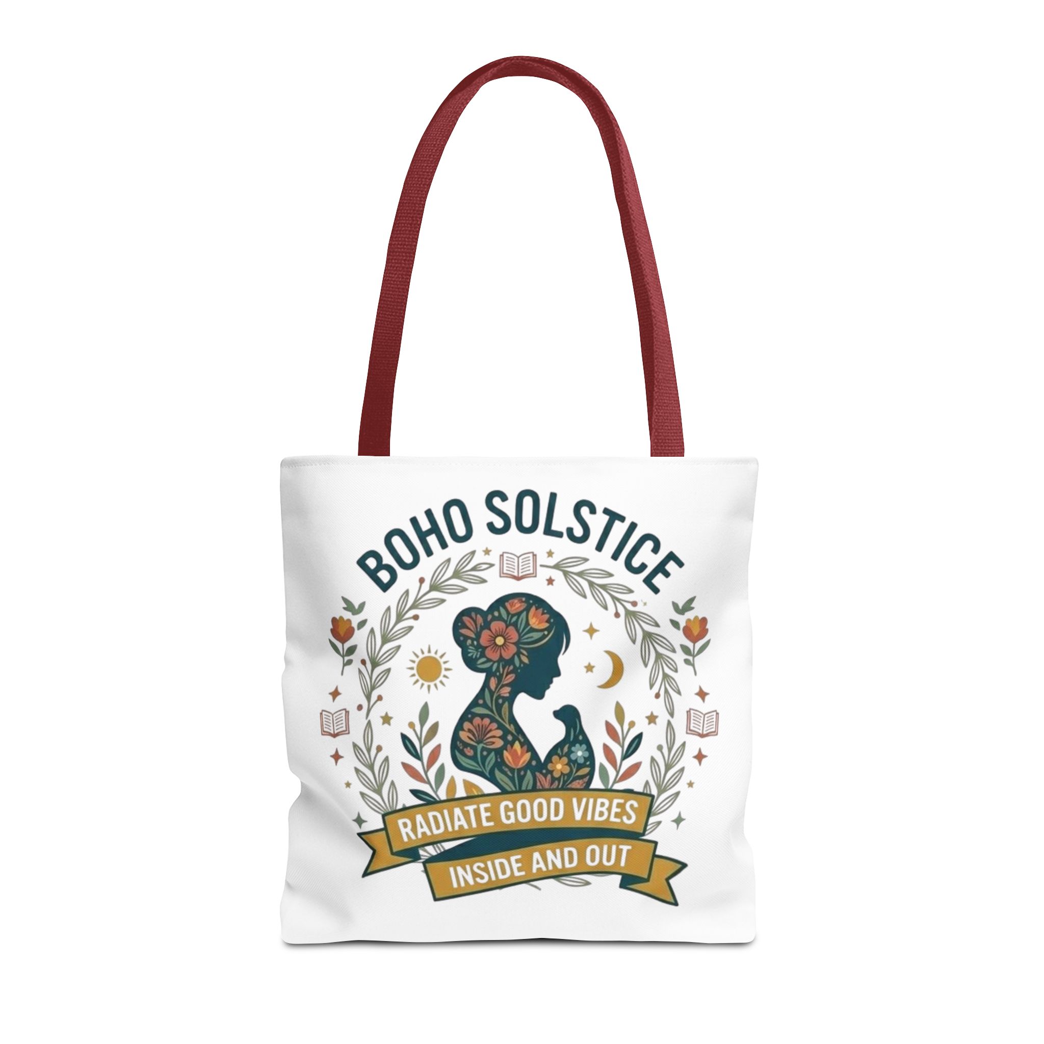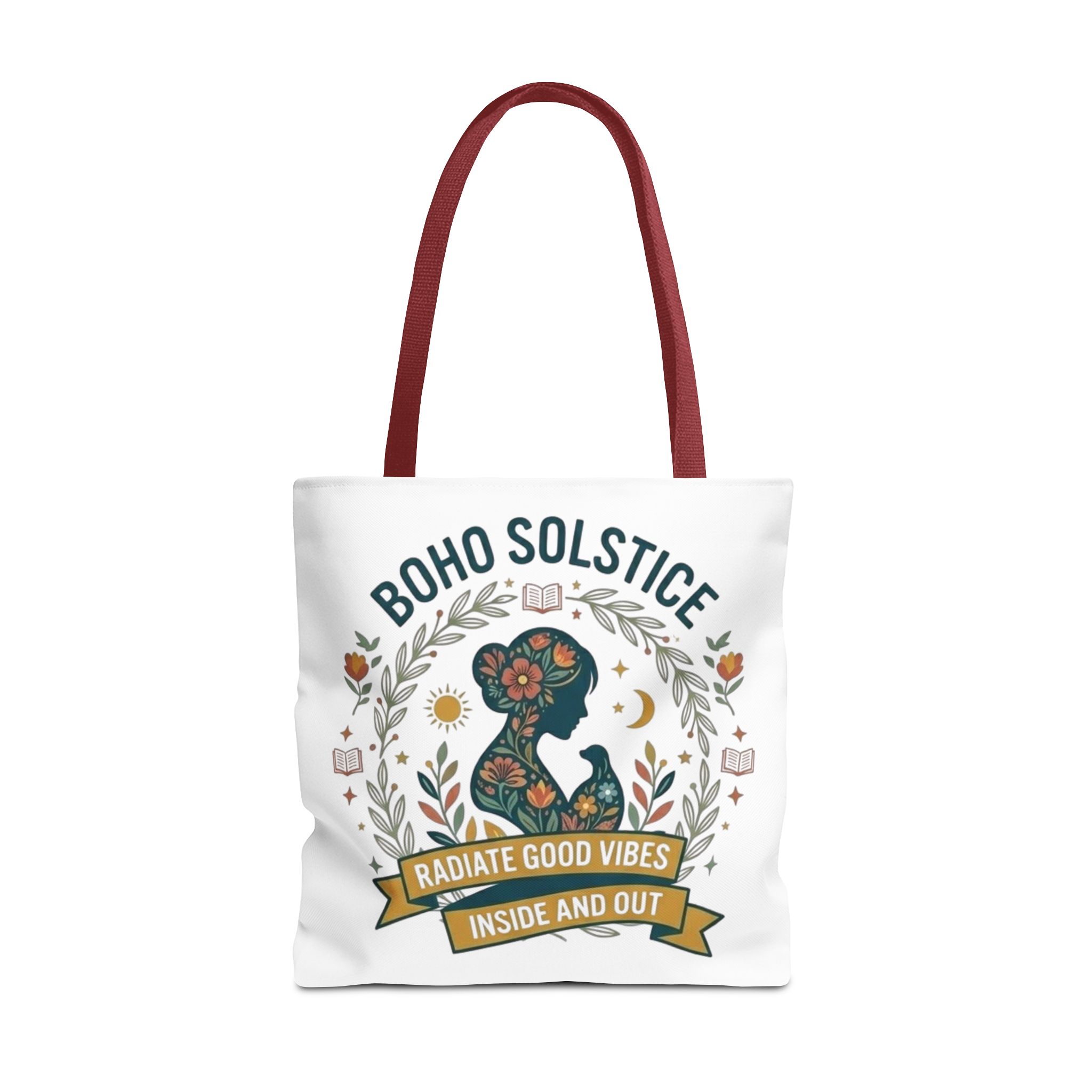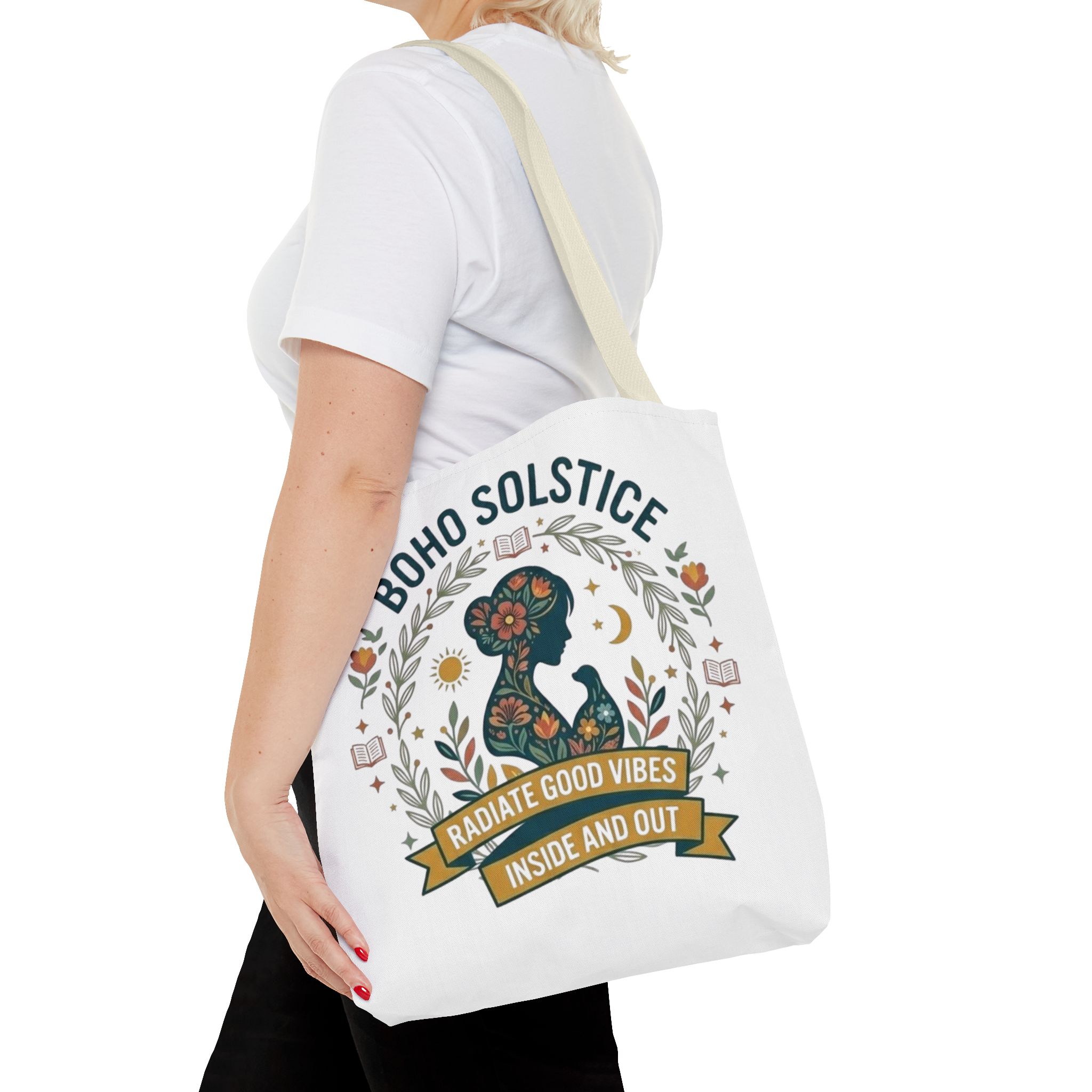 This roomy tote brings a gentle boho energy to everyday errands and seasonal rituals. Soft white polyester holds a colorful, nature-inspired silhouette framed in leafy wreaths and warm sun motifs. The illustration whispers of slow mornings, incense-streaked air, and long walks through golden fields — an accessory that carries books, market finds, or a picnic blanket while reflecting an inward calm. The sturdy construction and boxy shape mean it won’t sag under pottery or groceries, and the color-contrasting handles add a subtle, handcrafted touch that suits a wardrobe layered with linen, crochet, and well-worn denim. Use it during solstice gatherings, market mornings, or as a daily reminder to radiate good vibes.