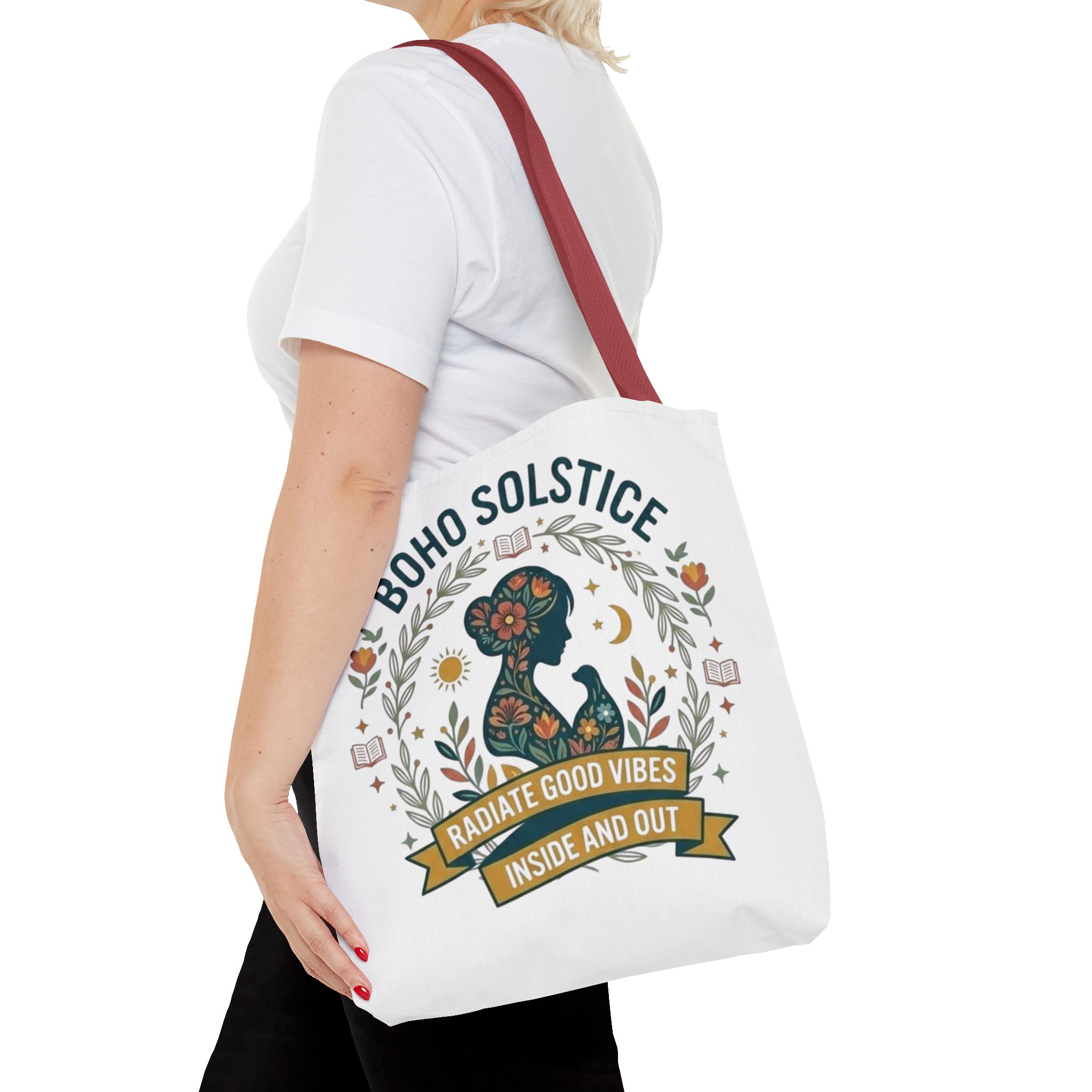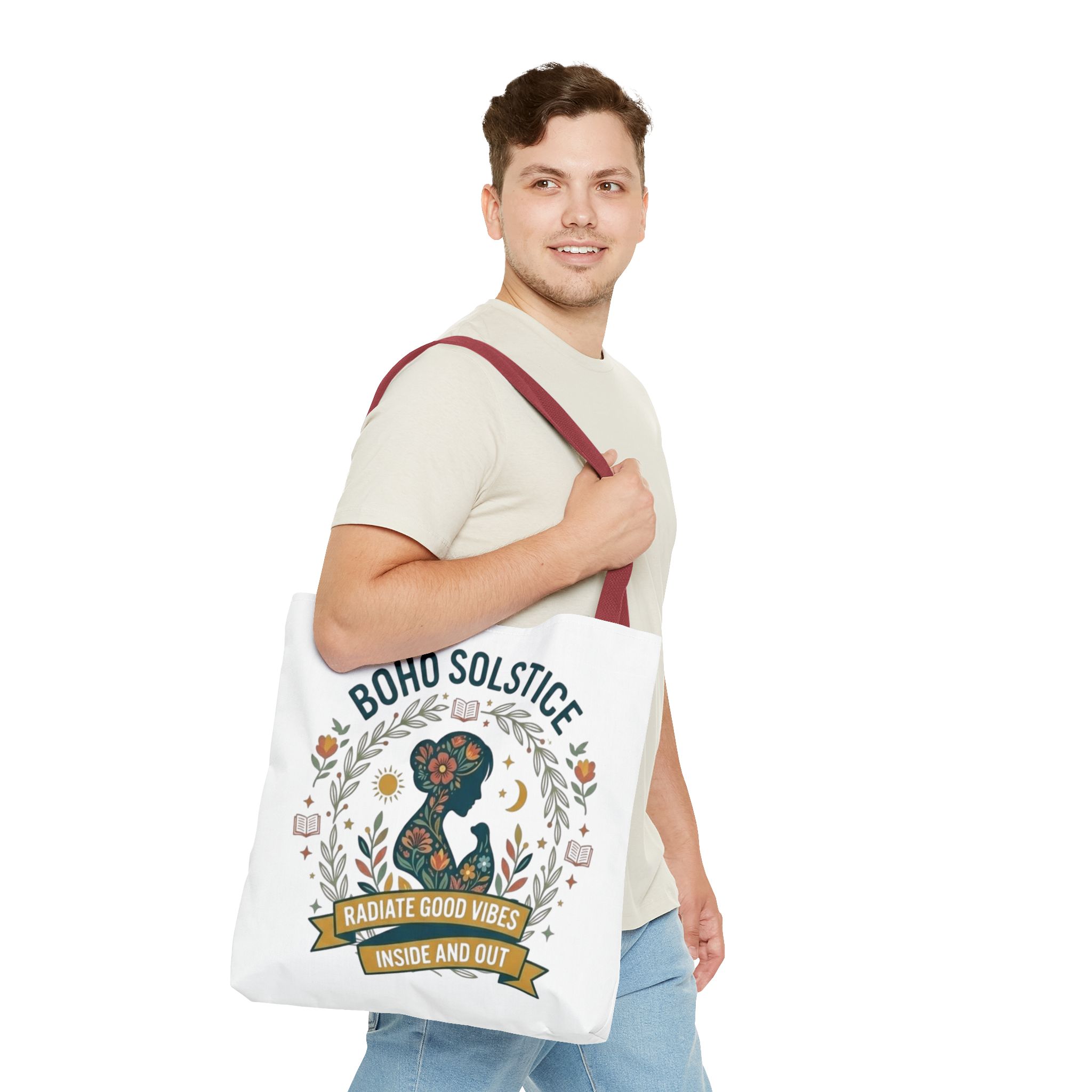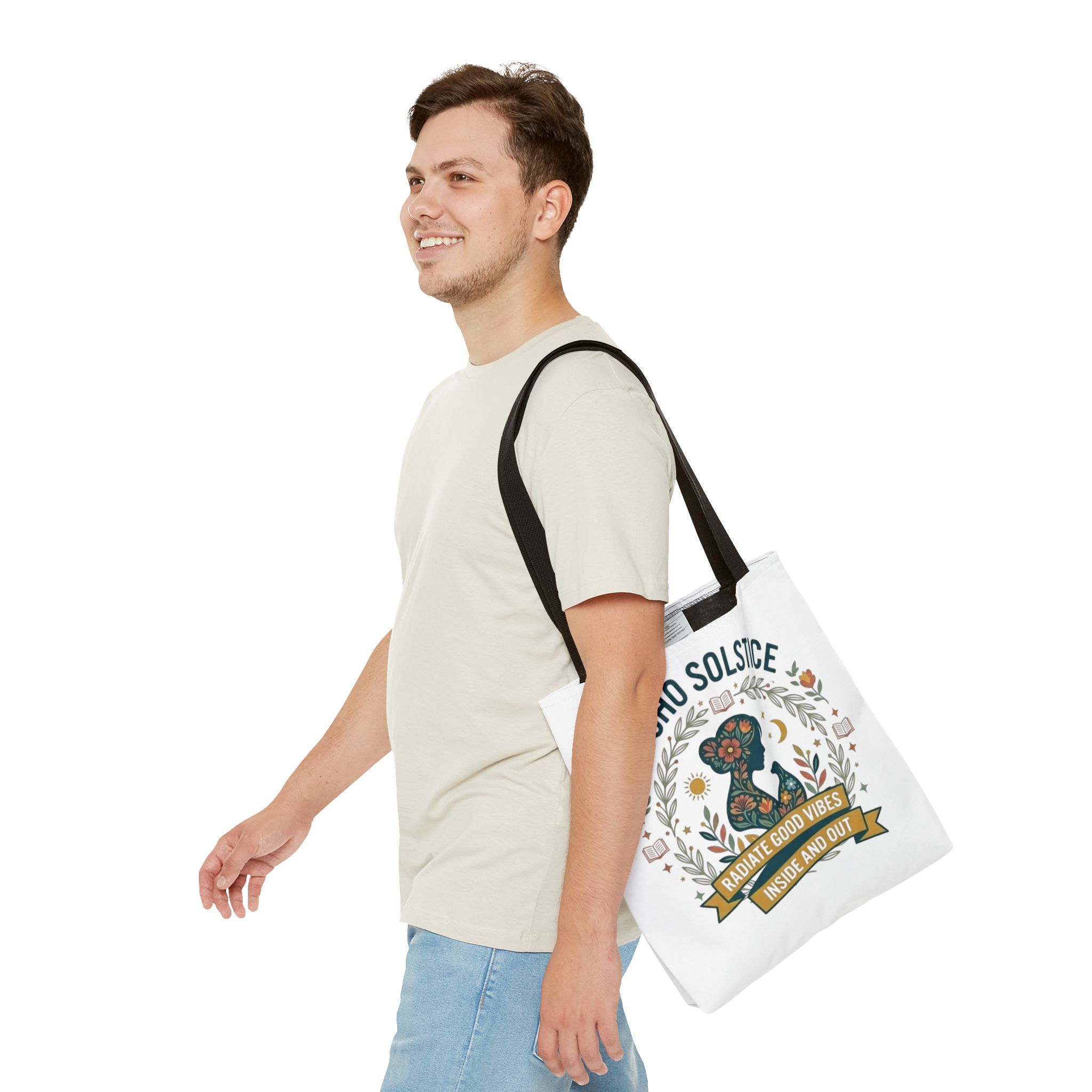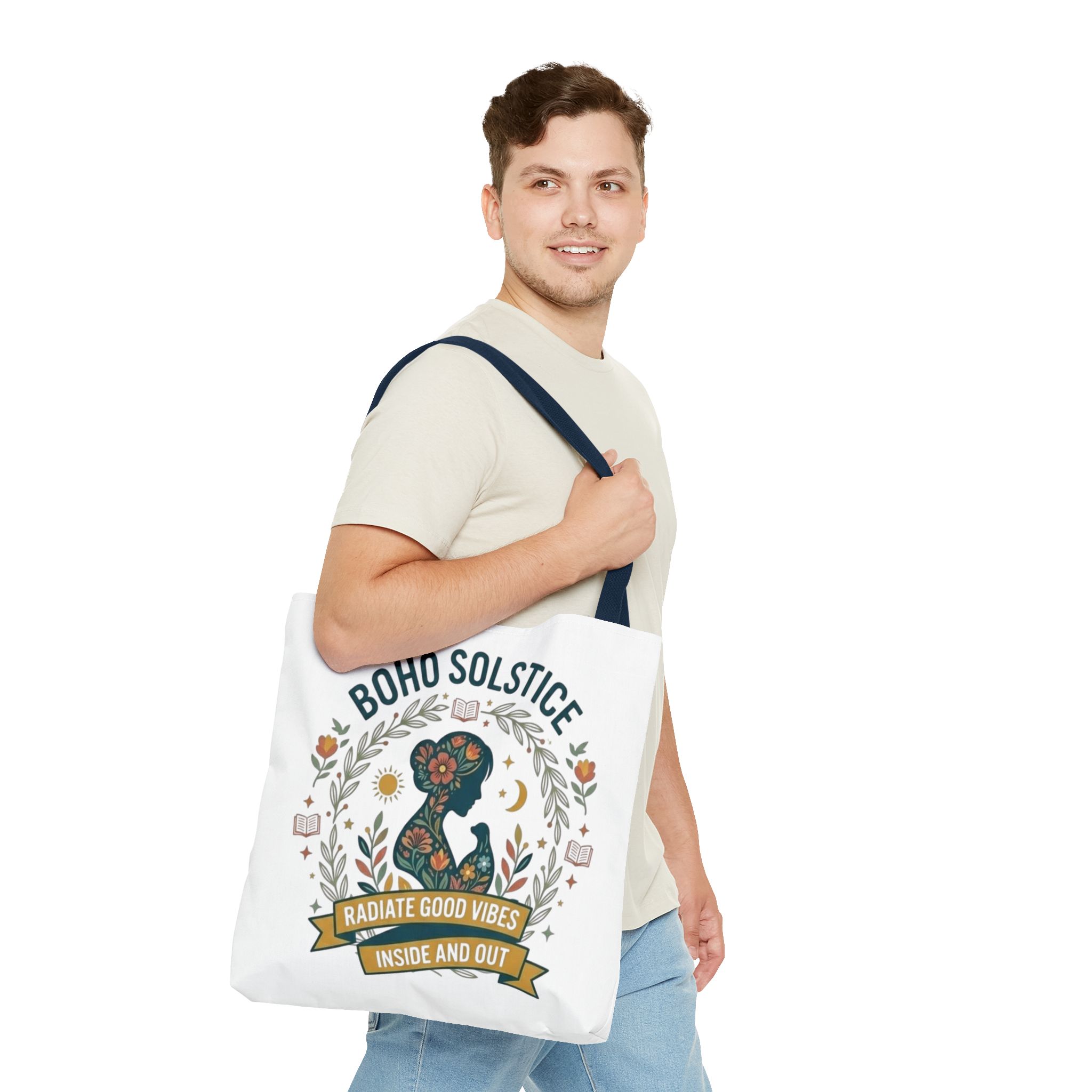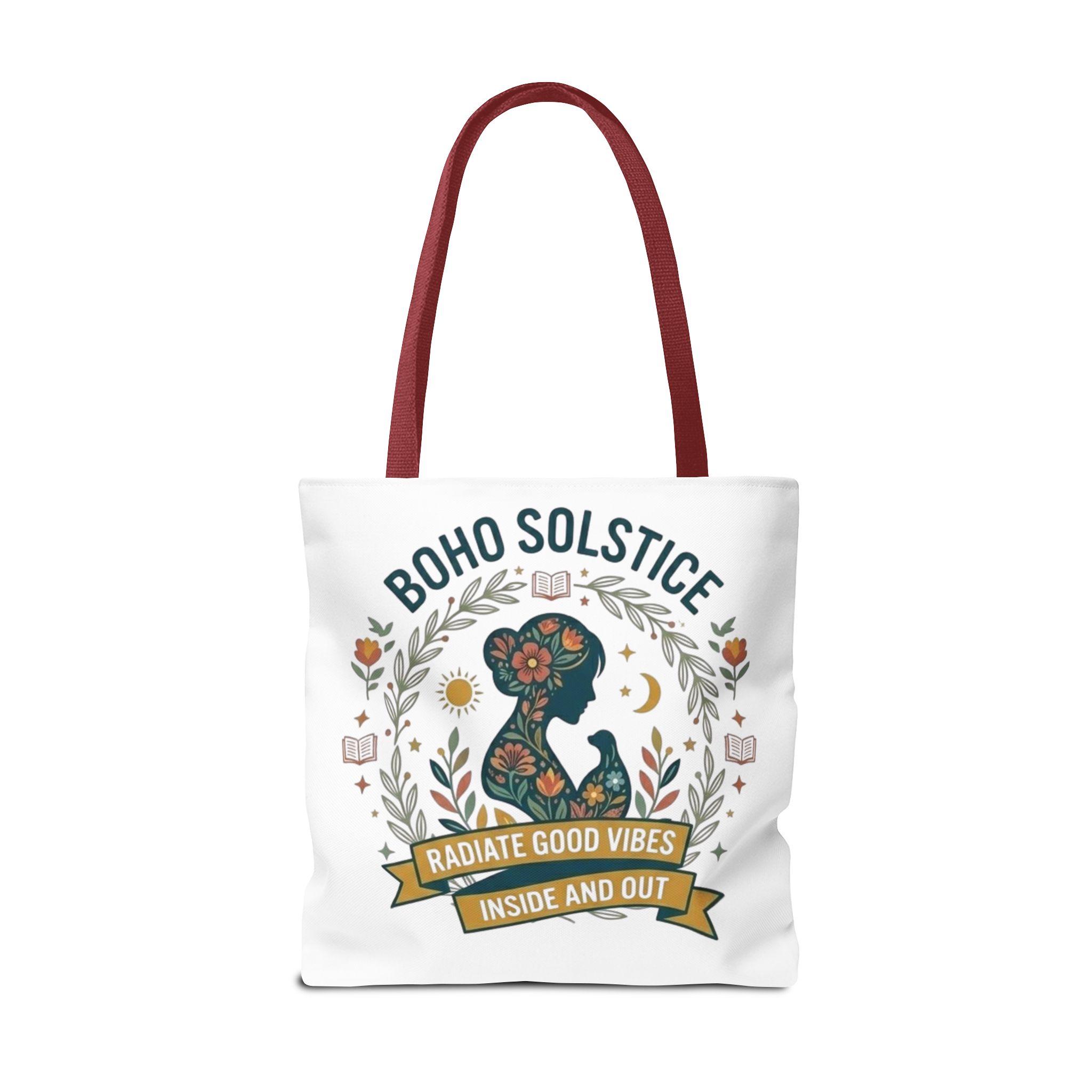 This roomy tote brings a gentle boho energy to everyday errands and seasonal rituals. Soft white polyester holds a colorful, nature-inspired silhouette framed in leafy wreaths and warm sun motifs. The illustration whispers of slow mornings, incense-streaked air, and long walks through golden fields — an accessory that carries books, market finds, or a picnic blanket while reflecting an inward calm. The sturdy construction and boxy shape mean it won’t sag under pottery or groceries, and the color-contrasting handles add a subtle, handcrafted touch that suits a wardrobe layered with linen, crochet, and well-worn denim. Use it during solstice gatherings, market mornings, or as a daily reminder to radiate good vibes.