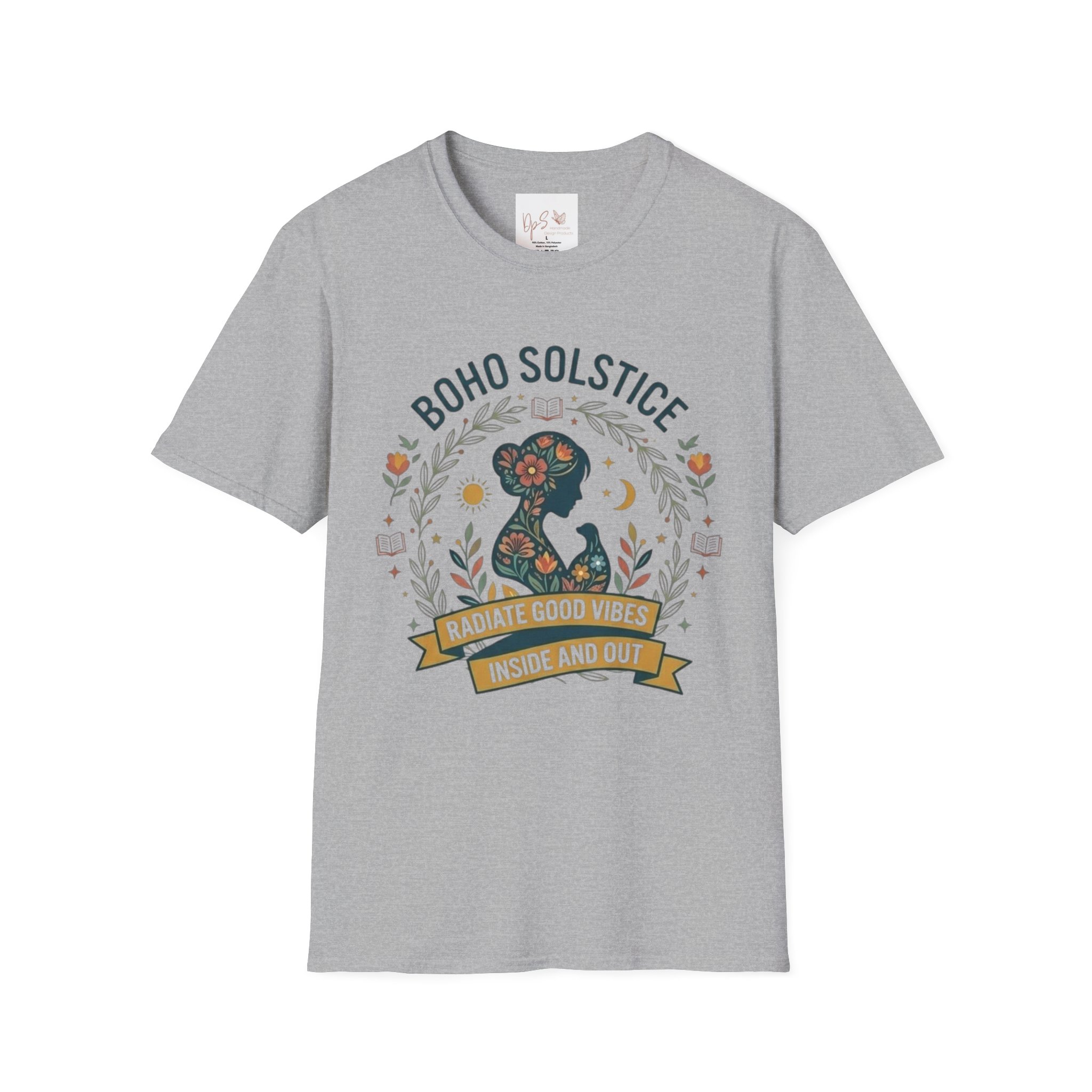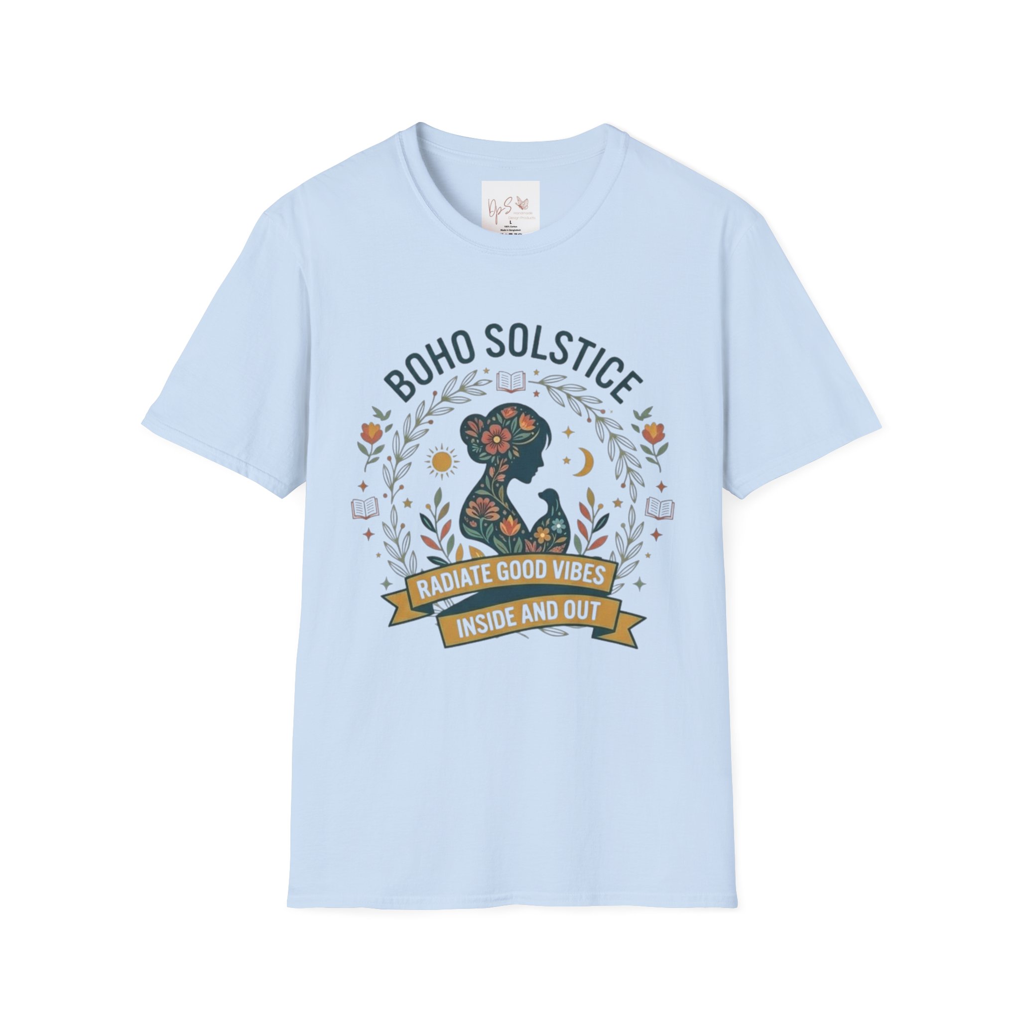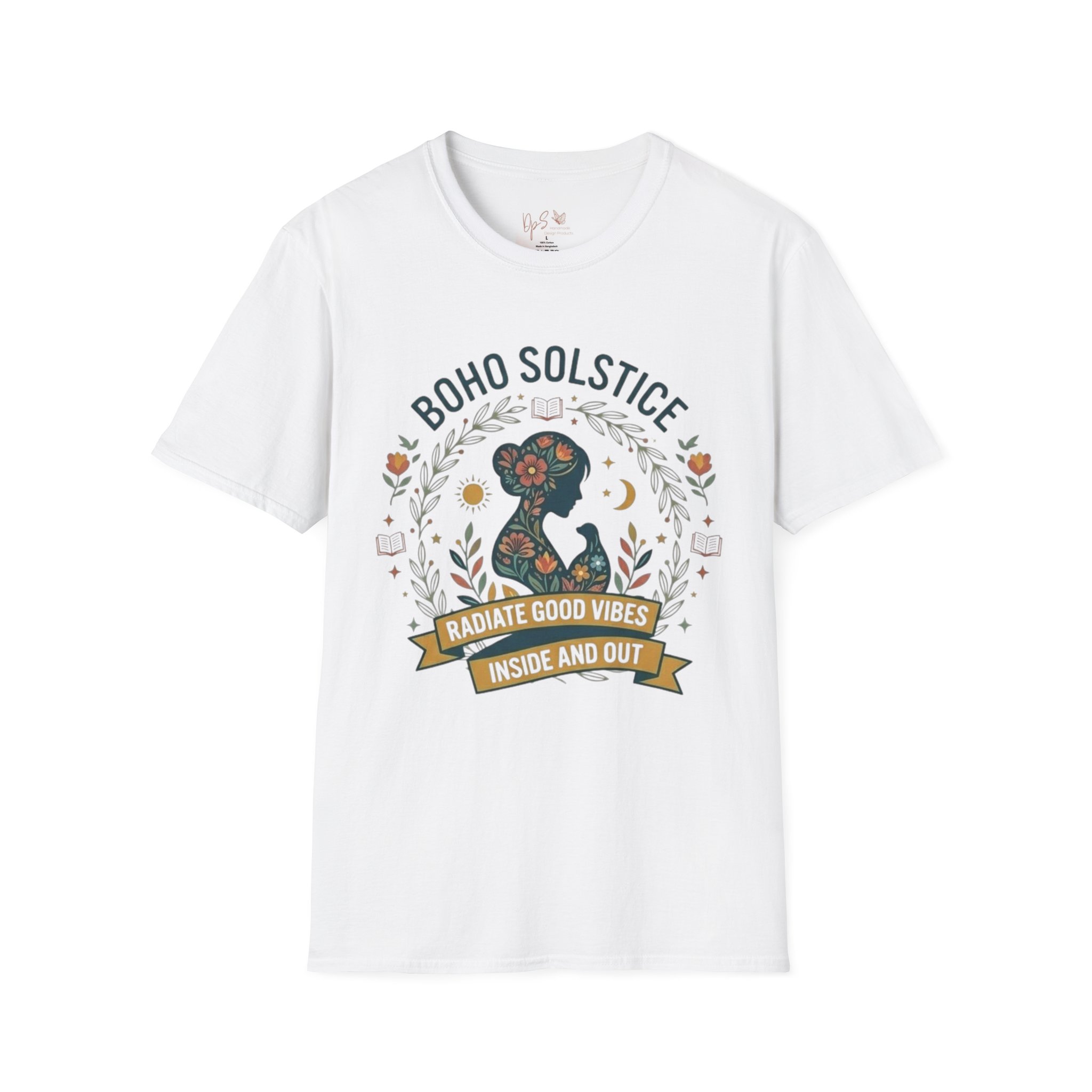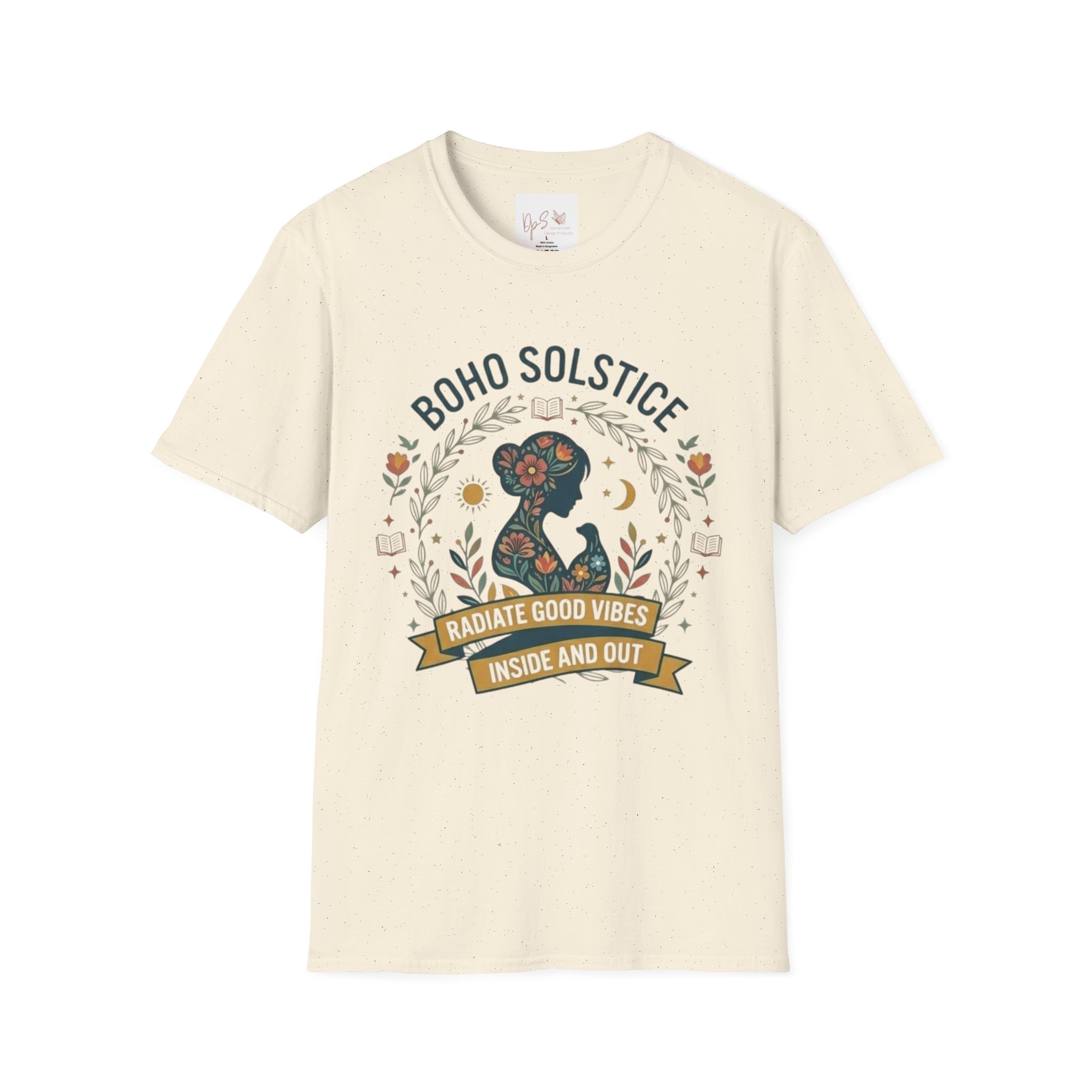 A soft, lightweight tee printed with a warm, bohemian solstice design — a floral silhouette framed by leaves, stars and a crescent moon, with the banner reading “Radiate Good Vibes Inside and Out.” The breathable ring-spun cotton feels gentle against skin, while the crew neckline and classic fit keep the look relaxed and effortless. Wear it layered under a cardigan for chilly evenings or alone when the sun lingers late; the muted earthy palette and hand-drawn motif bring a calm, ritual-like energy to everyday outfits. Thoughtful details like a tear-away label and reinforced shoulder tape make this shirt comfortable for long days of gatherings, markets, or quiet backyard rituals.