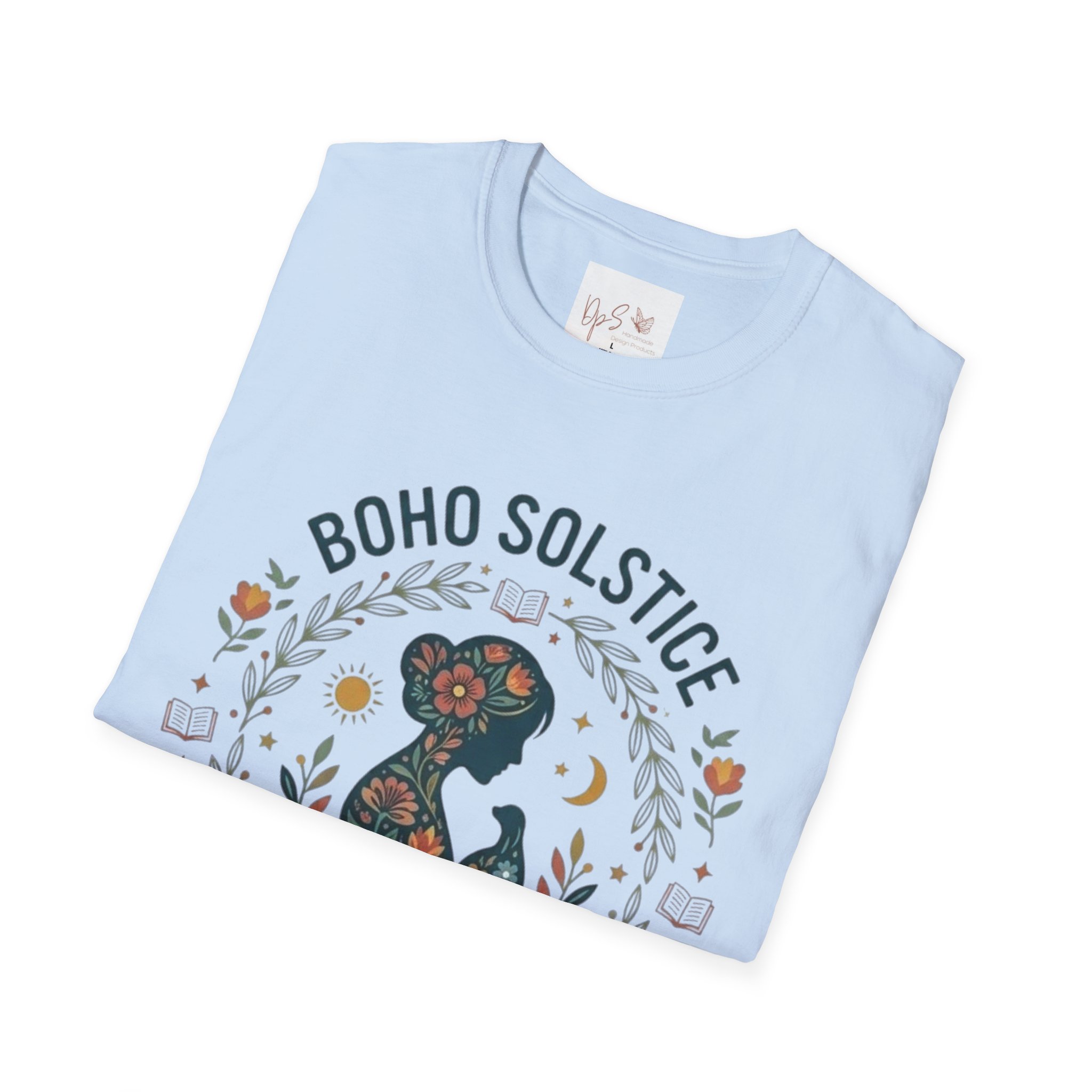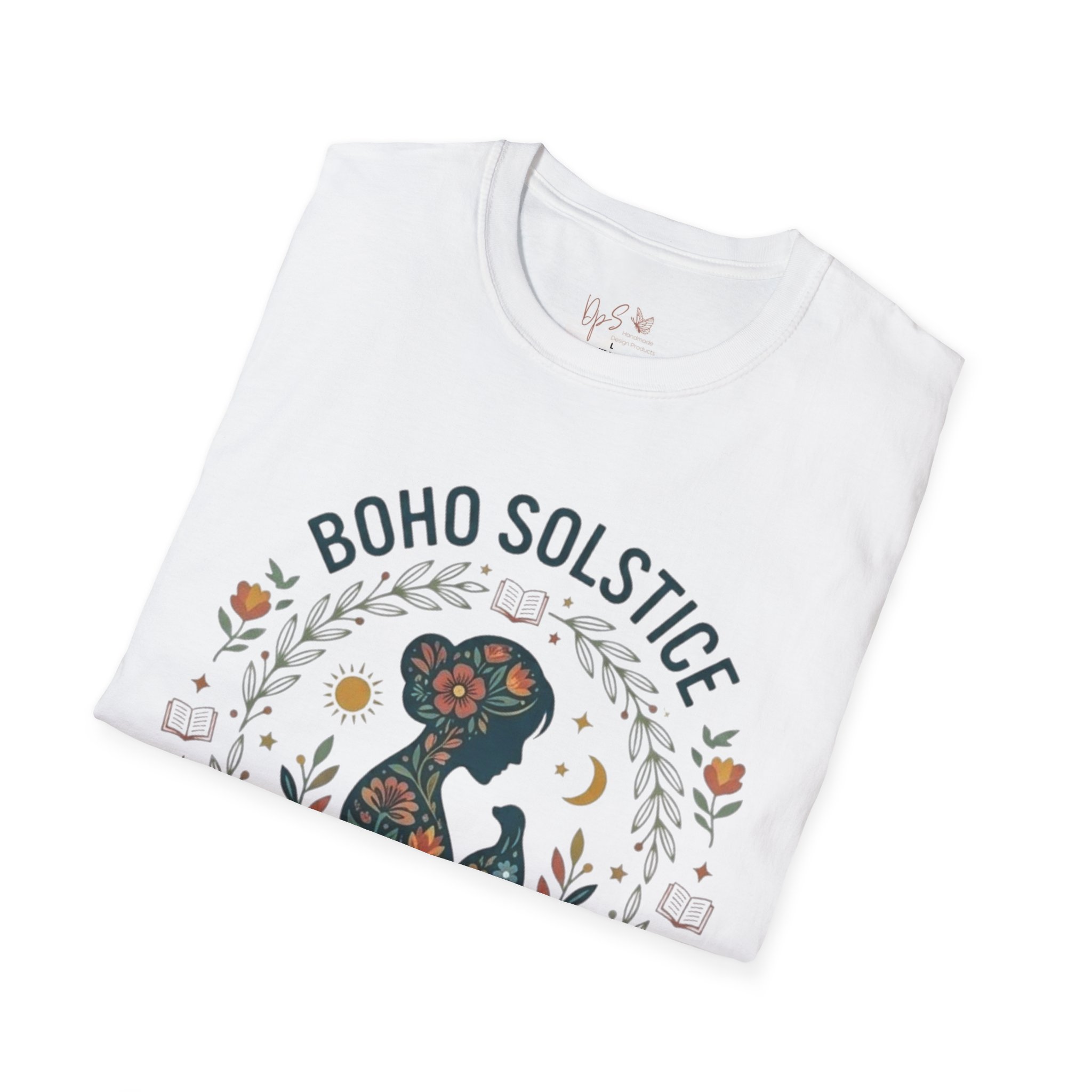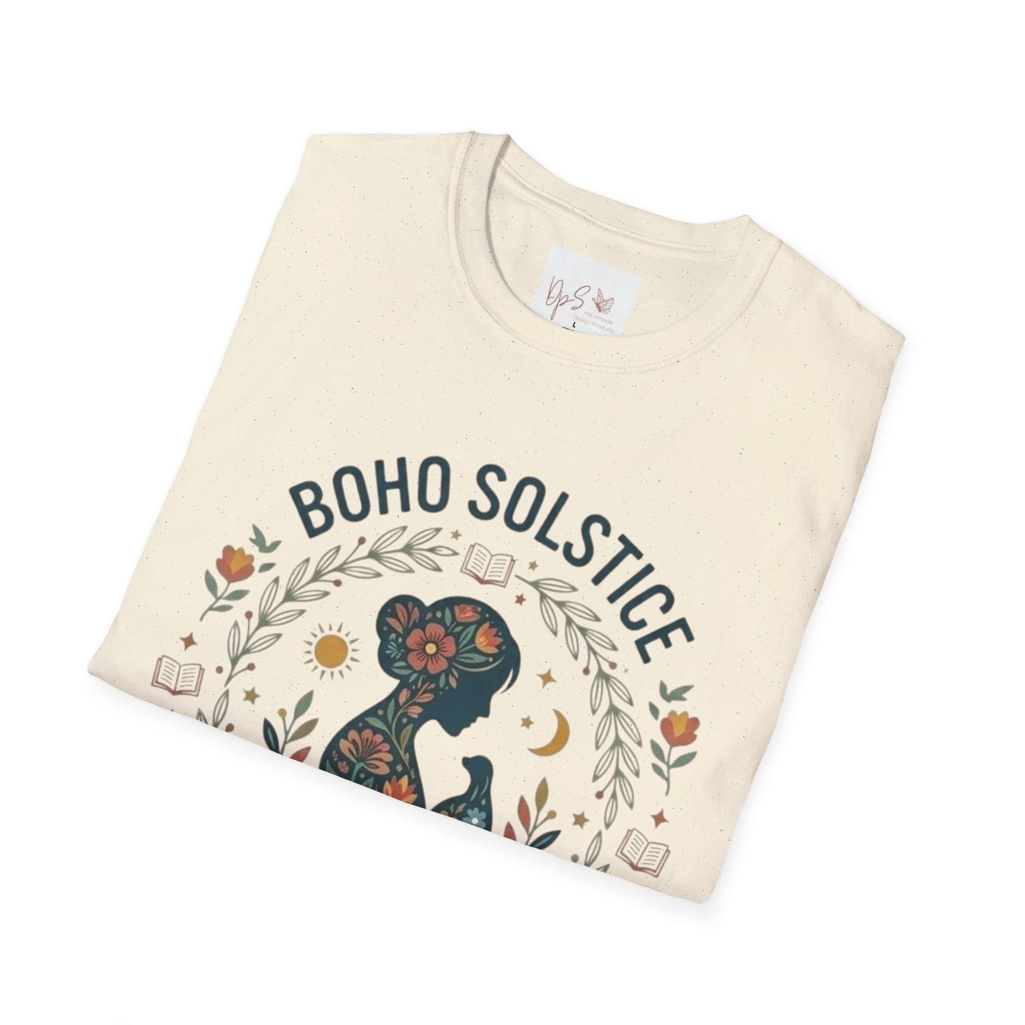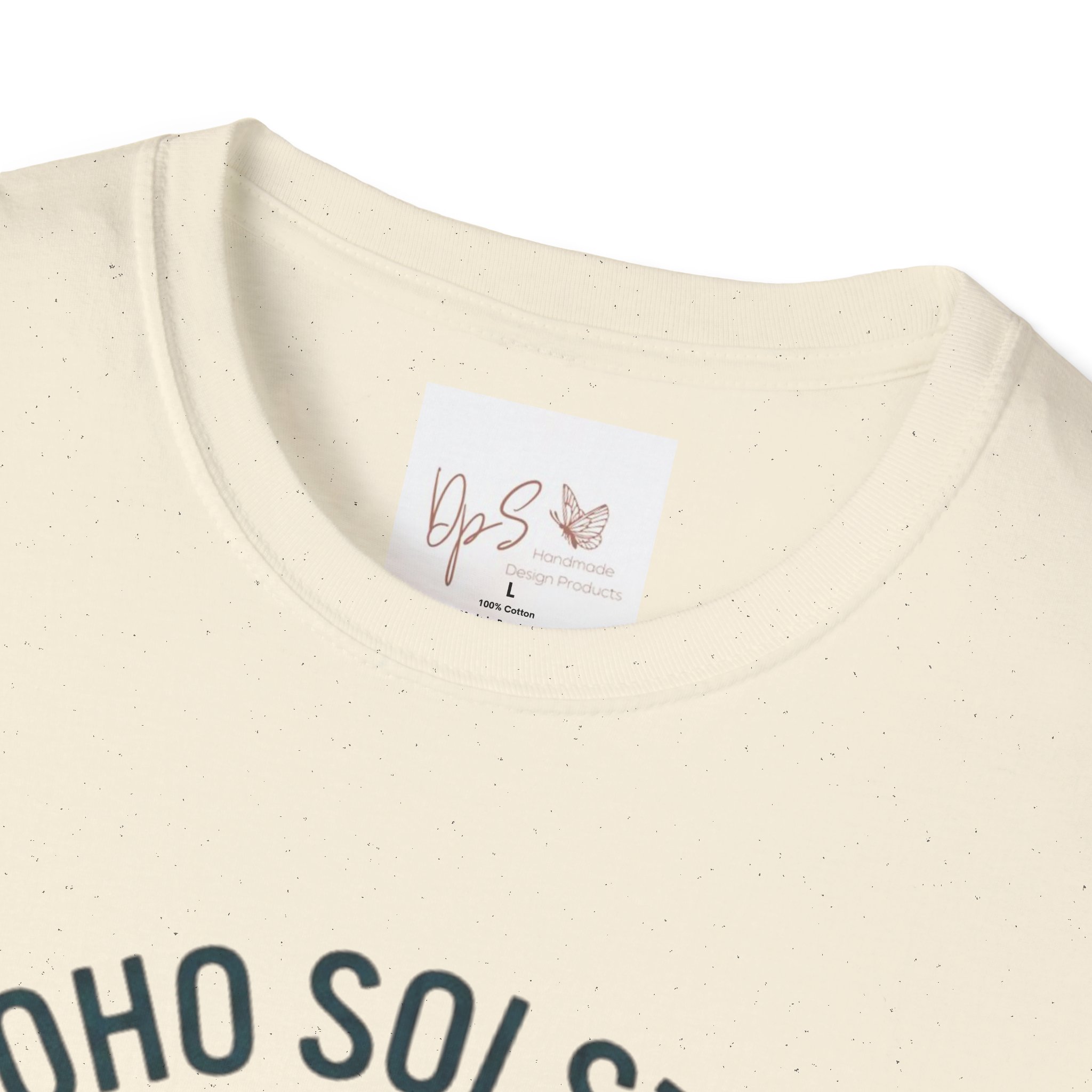 A soft, lightweight tee printed with a warm, bohemian solstice design — a floral silhouette framed by leaves, stars and a crescent moon, with the banner reading “Radiate Good Vibes Inside and Out.” The breathable ring-spun cotton feels gentle against skin, while the crew neckline and classic fit keep the look relaxed and effortless. Wear it layered under a cardigan for chilly evenings or alone when the sun lingers late; the muted earthy palette and hand-drawn motif bring a calm, ritual-like energy to everyday outfits. Thoughtful details like a tear-away label and reinforced shoulder tape make this shirt comfortable for long days of gatherings, markets, or quiet backyard rituals.