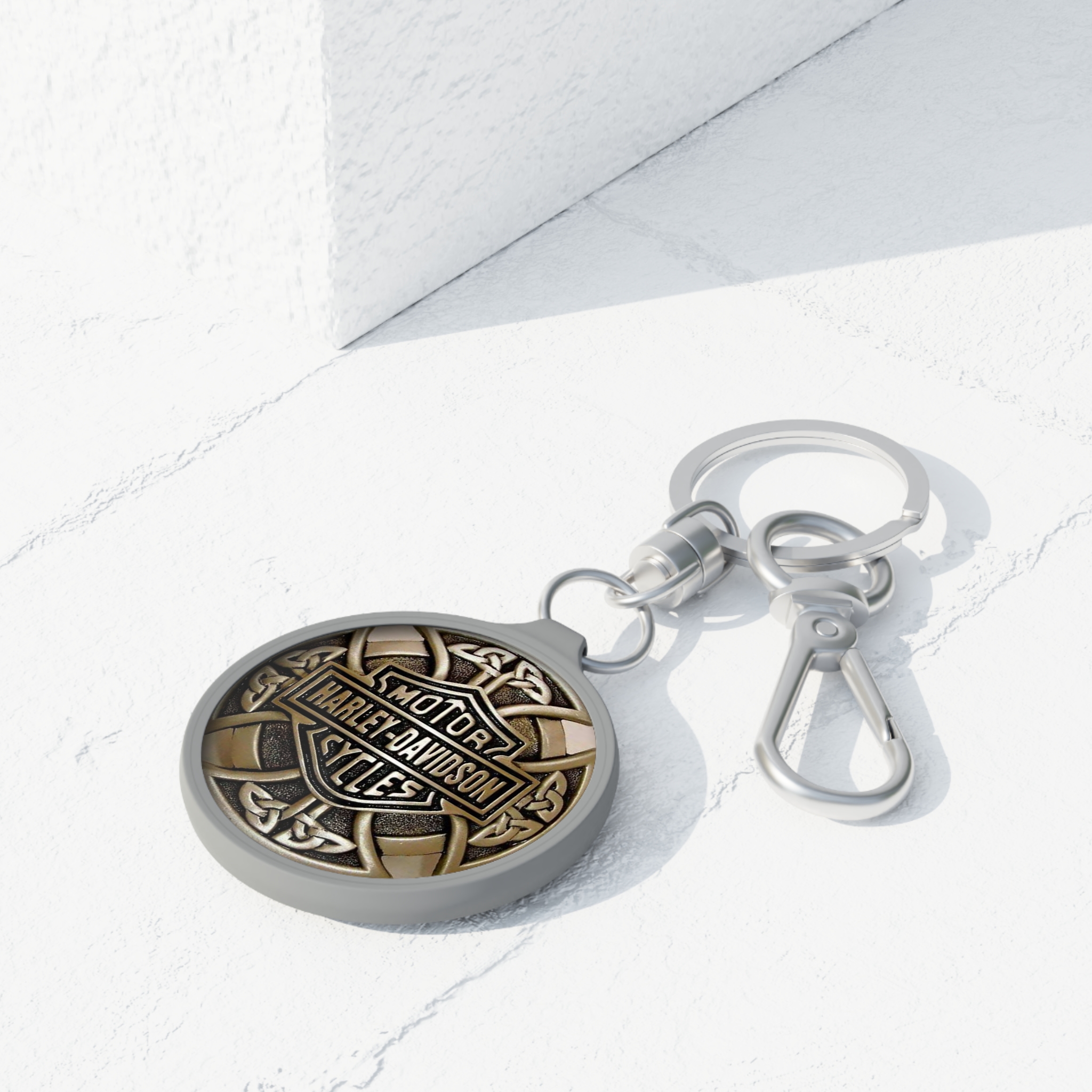 A rugged, round acrylic keyring that wears its attitude on the front. The matte TPU-coated face keeps the embossed, bronze-toned emblem vivid while softening scratches and fingerprints. It hangs from solid hardware — a split ring, swivel connector, and clip — so it lives comfortably on belt loops, saddlebags, or everyday key rings. This piece feels at home on the road: warm metallic tones, Celtic knot accents, and an heirloom-weathered finish that suggests long rides and familiar routes. It’s made for adults and built to meet safety and materials standards, with care instructions to keep it looking its best.