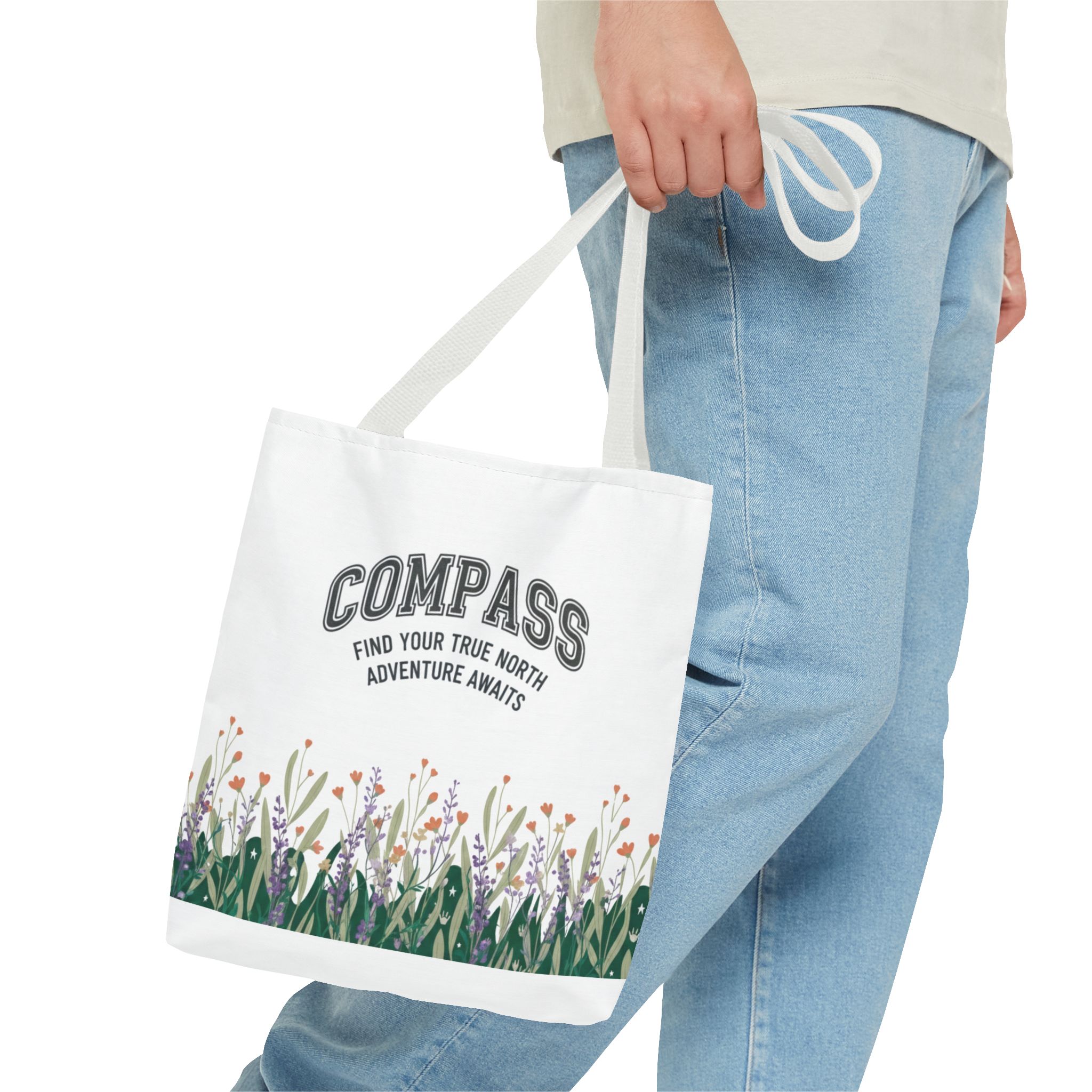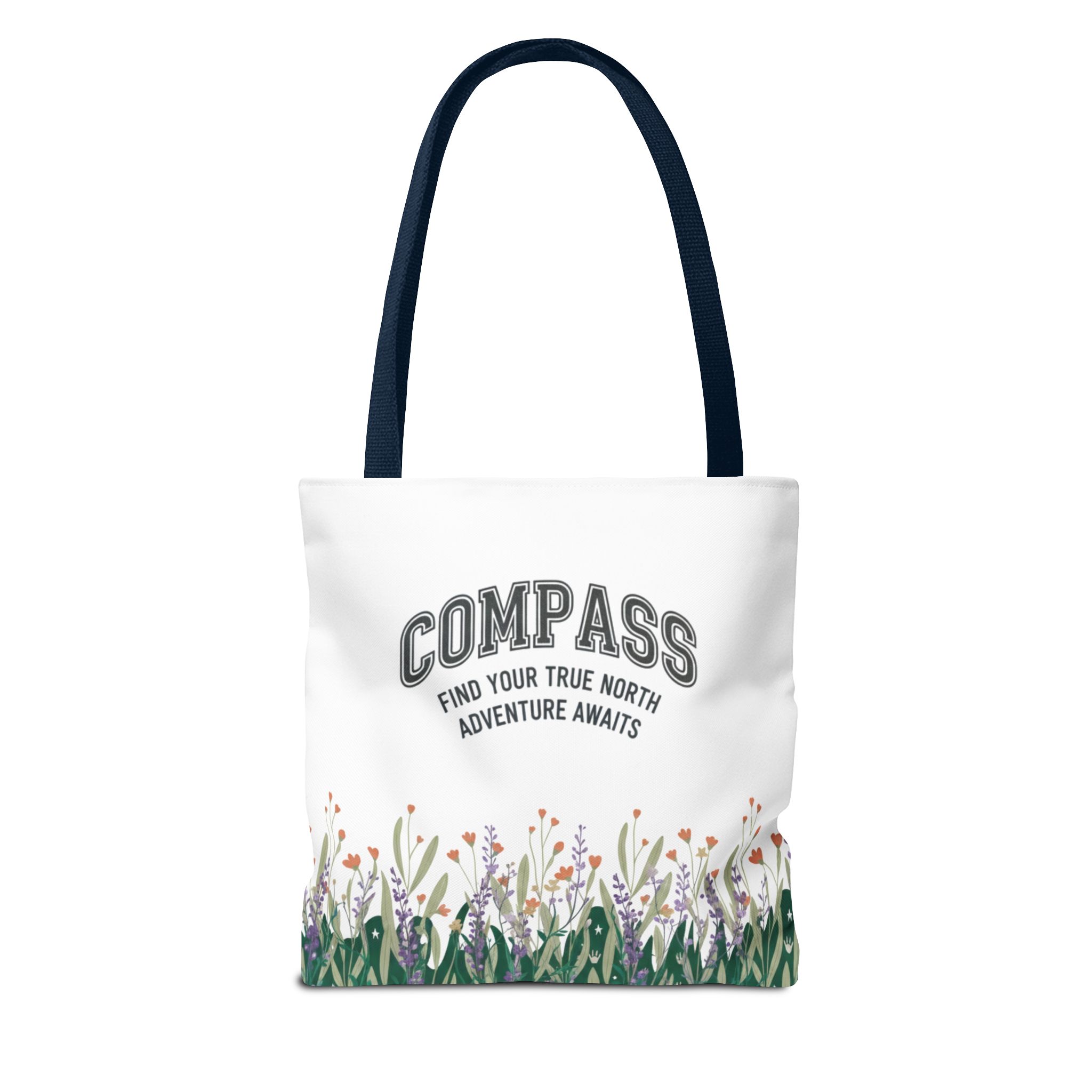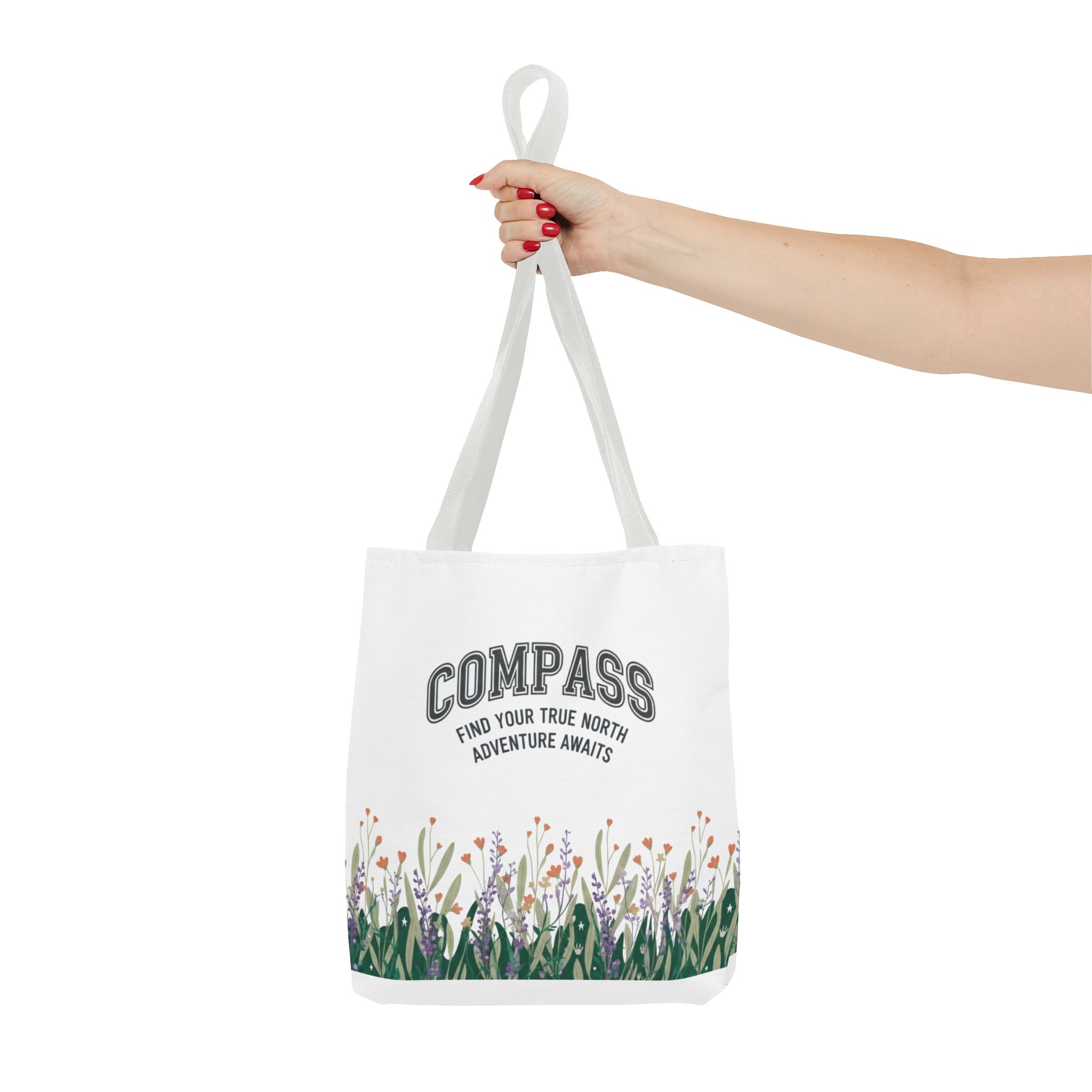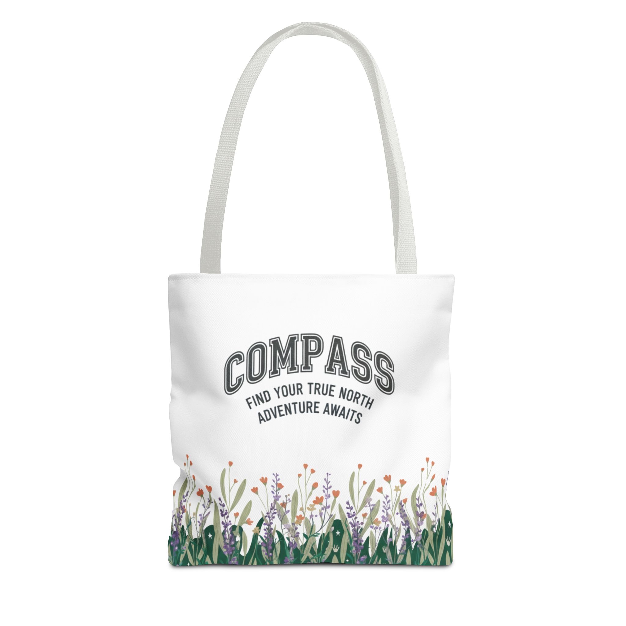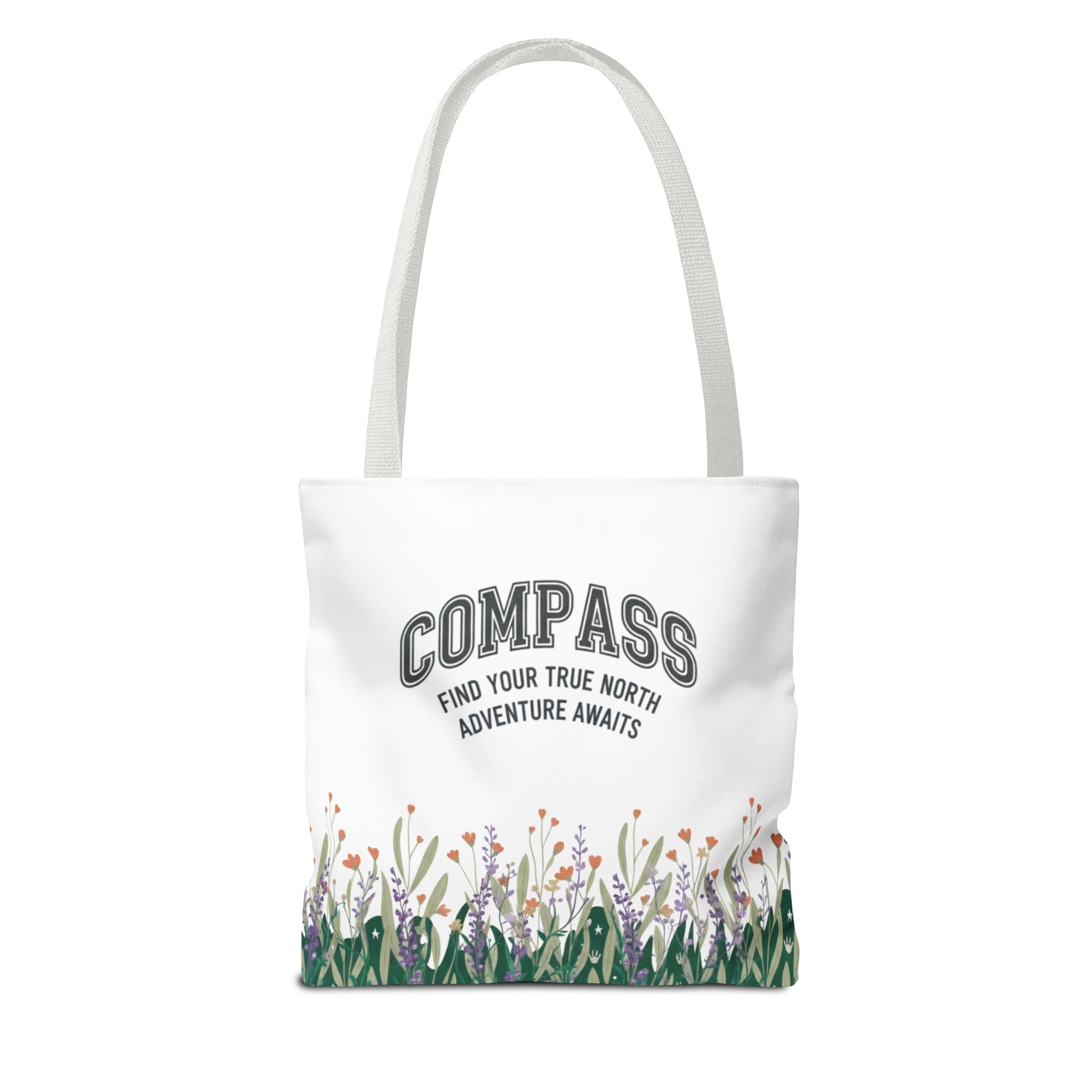 Lightweight, rugged, and intentionally simple — this tote speaks to people who live for weekend trailheads and map-strewn mornings. The vintage collegiate ‘COMPASS’ print sits bold and slightly weathered on a clean white canvas, while the understated tagline — ‘Find your true north / Adventure awaits’ — feels like a quiet nudge to lace up and go. It holds a water bottle, a guidebook, and the extras you collect along the way without fuss. The black handles and boxed corners give structure and a slightly urban edge, so it travels seamlessly from parking-lot prep to city coffee stops. Durable polyester and reinforced stitching mean this bag keeps its shape and keeps pace with an active life.