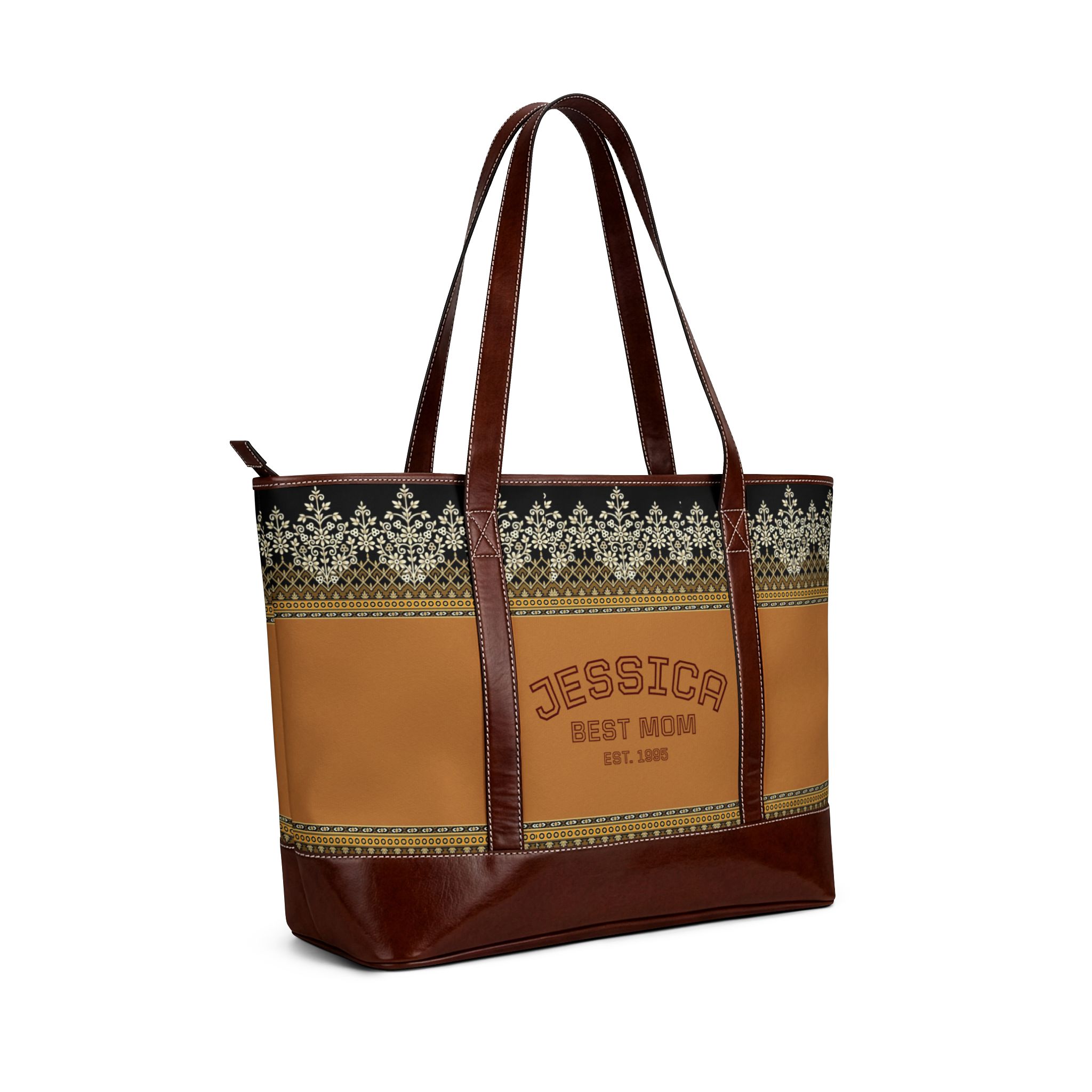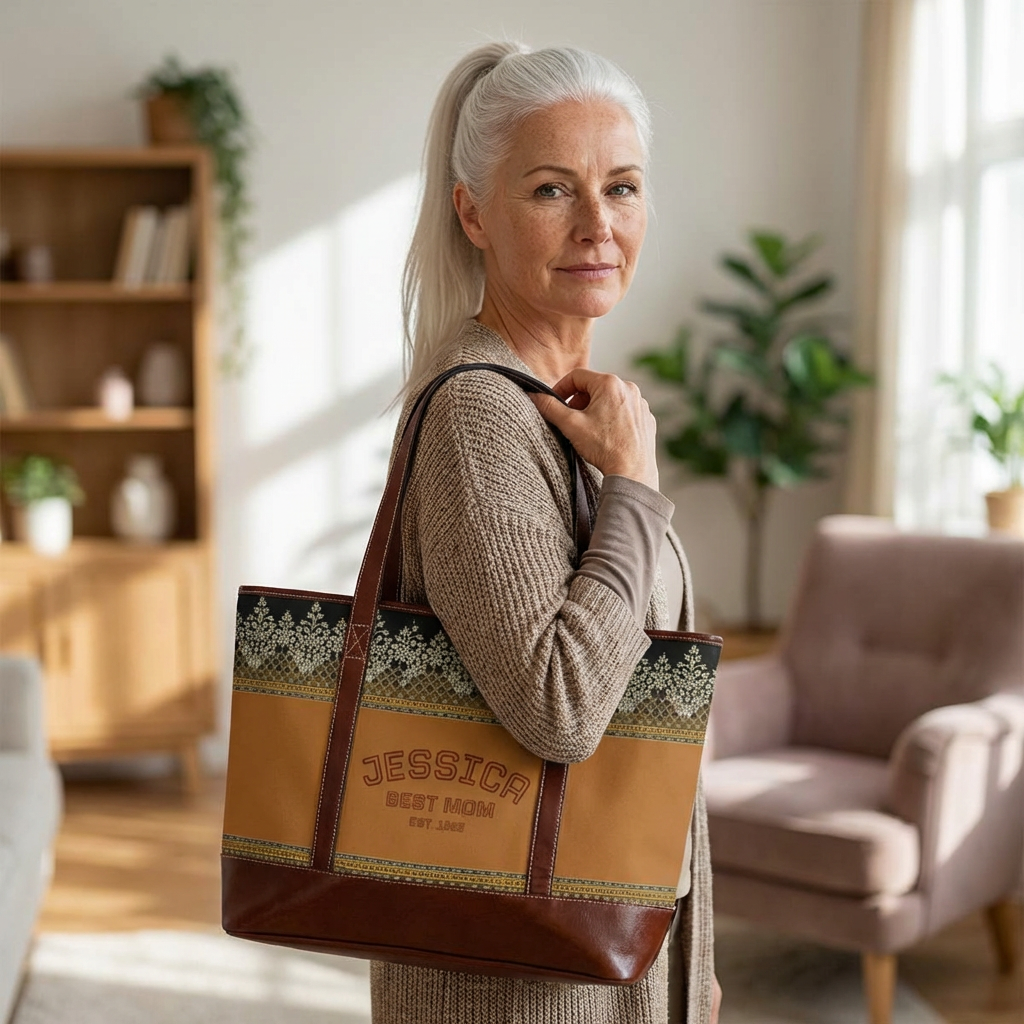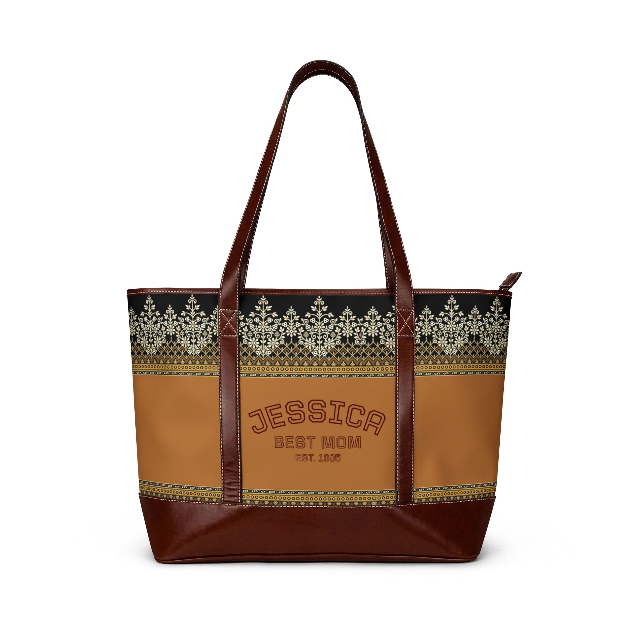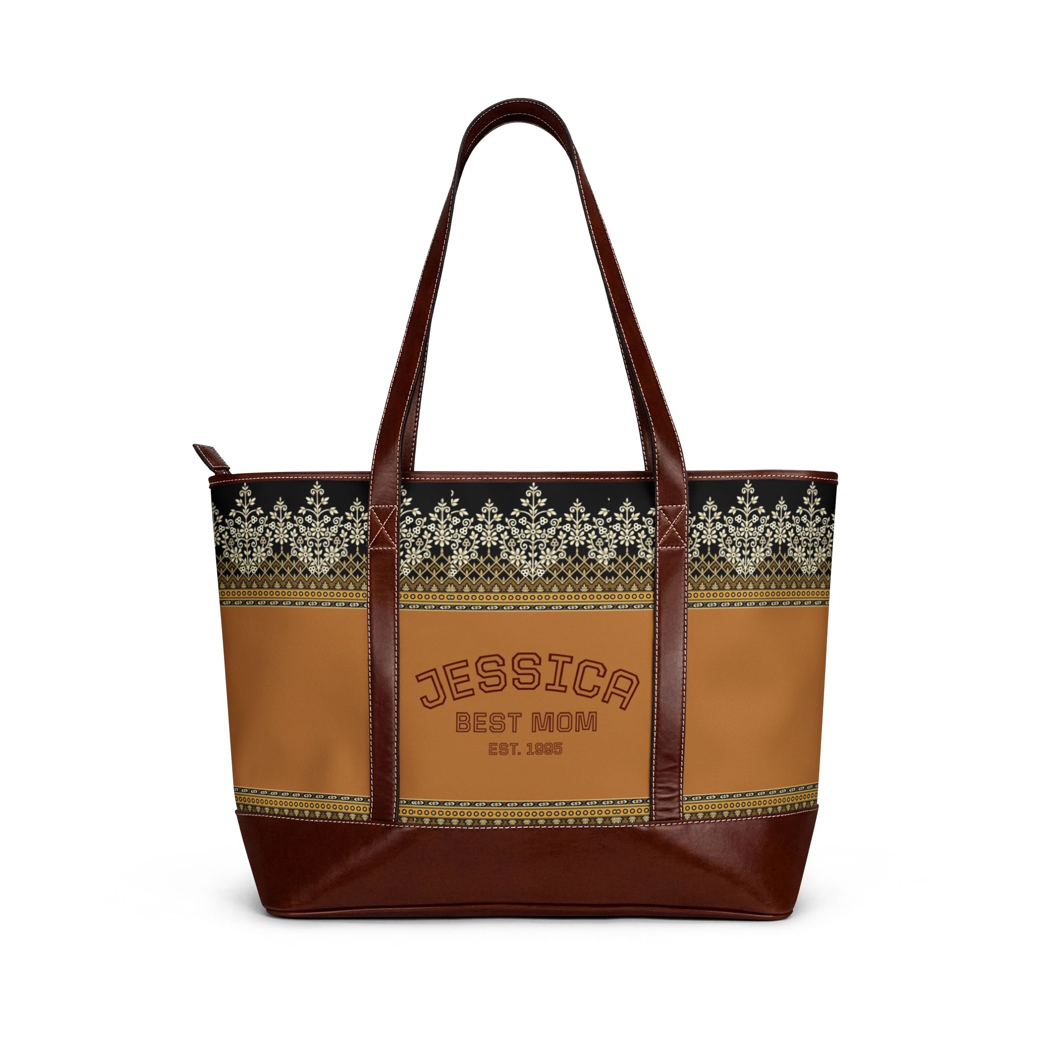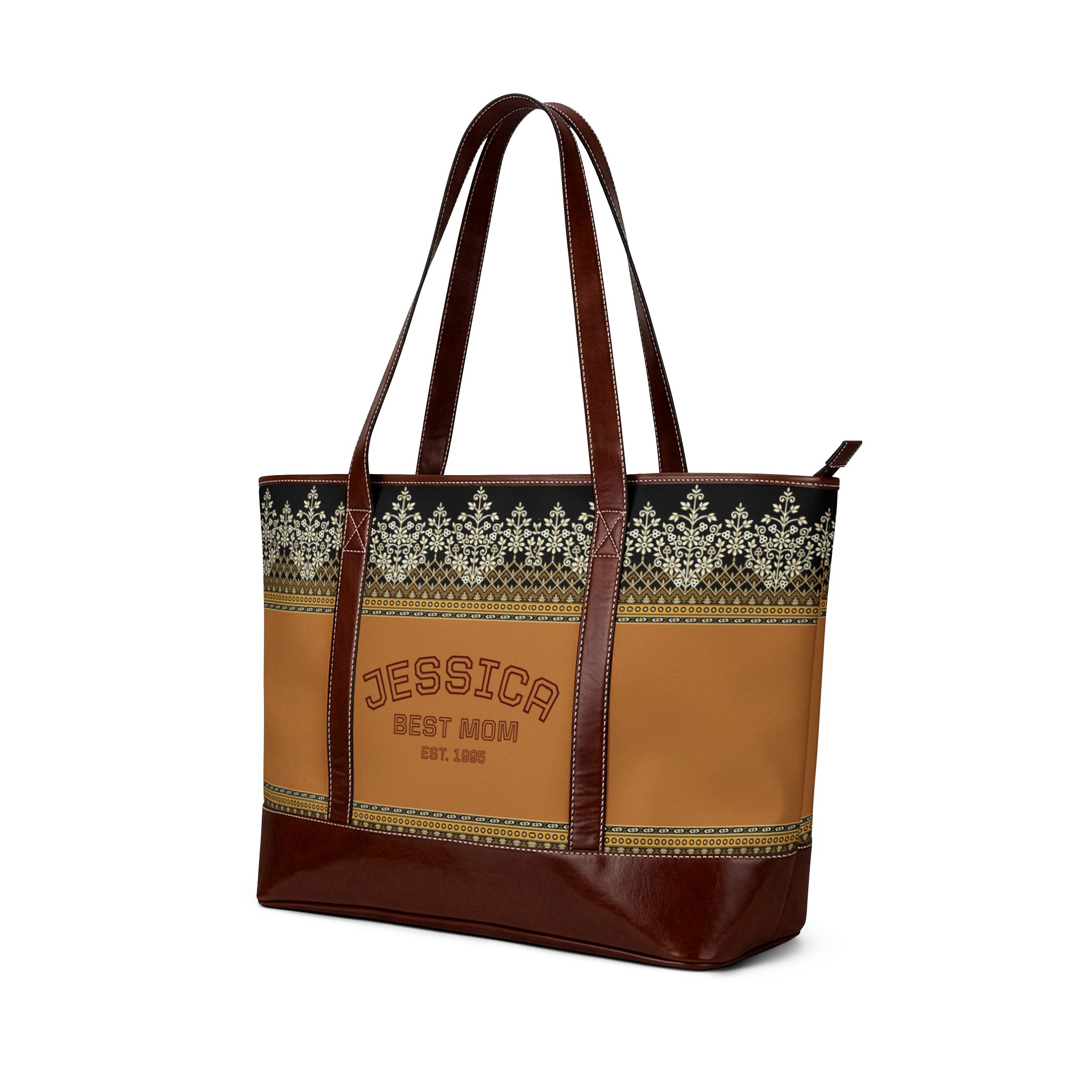 A beautifully crafted handbag that blends timeless ornamentation with everyday practicality. Deep indigo fabric is printed with an elegant paisley-like motif in soft gold and muted greens, sitting above a rich faux-leather base and matching sturdy handles. The roomy interior keeps a weekly planner, wallet, water bottle, and small tech organized thanks to full-length interior pockets, while the water-resistant polyester exterior stands up to rainy commutes and café spills. Warm, artisanal styling pairs with durable construction, so this bag feels at home from market mornings to evening gatherings.