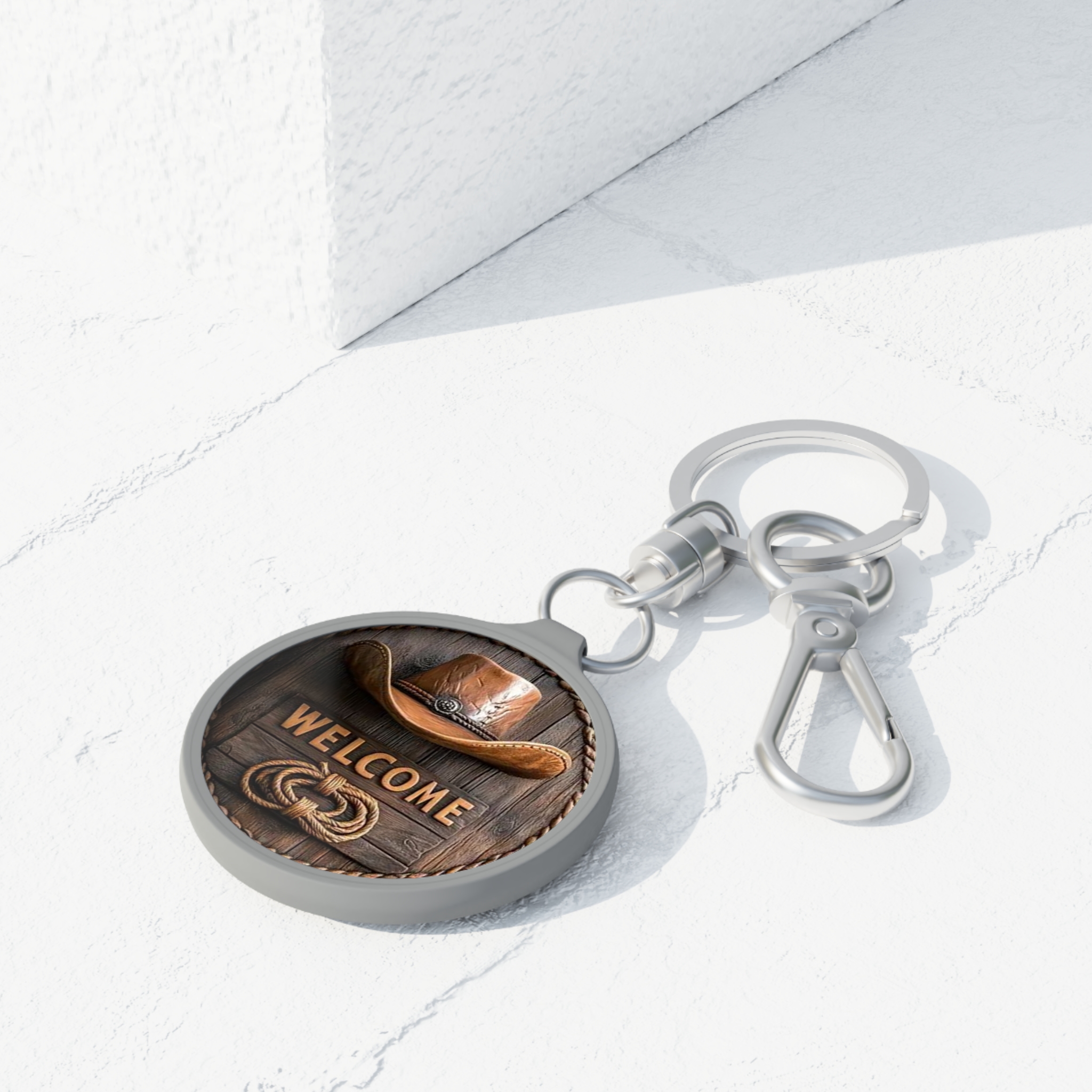 A round acrylic keyring tag that brings a warm, rustic welcome to everyday carry. The matte TPU-coated face showcases bright, detailed artwork — a weathered wooden plank backdrop, a worn leather cowboy hat, braided rope, and the word “WELCOME” carved in bold letters. The smooth surface feels pleasant to the touch, while sturdy metal hardware and an included split ring plus swivel clip make it easy to attach to keys, bags, or belt loops. Lightweight and durable, this tag slips into daily routines and cabin-life moments alike, carrying a hint of ranch-style charm wherever it goes.