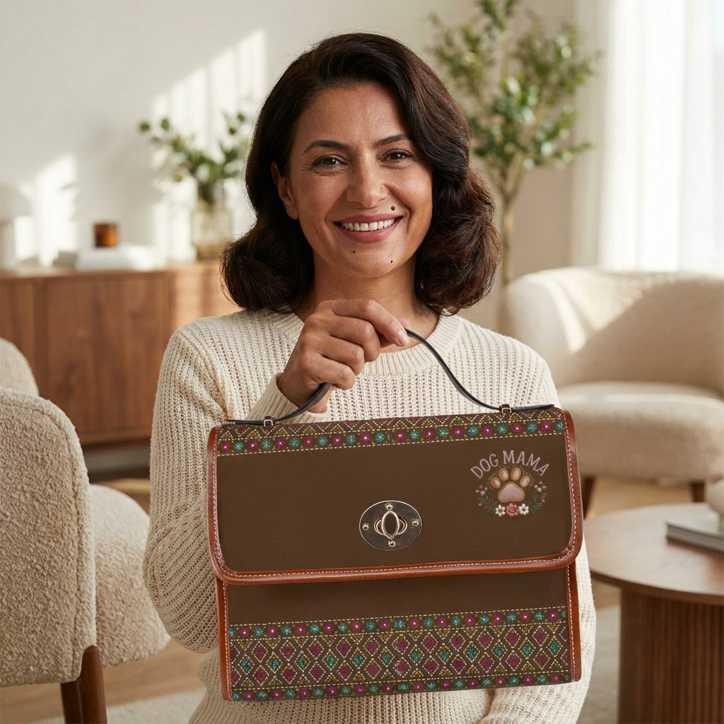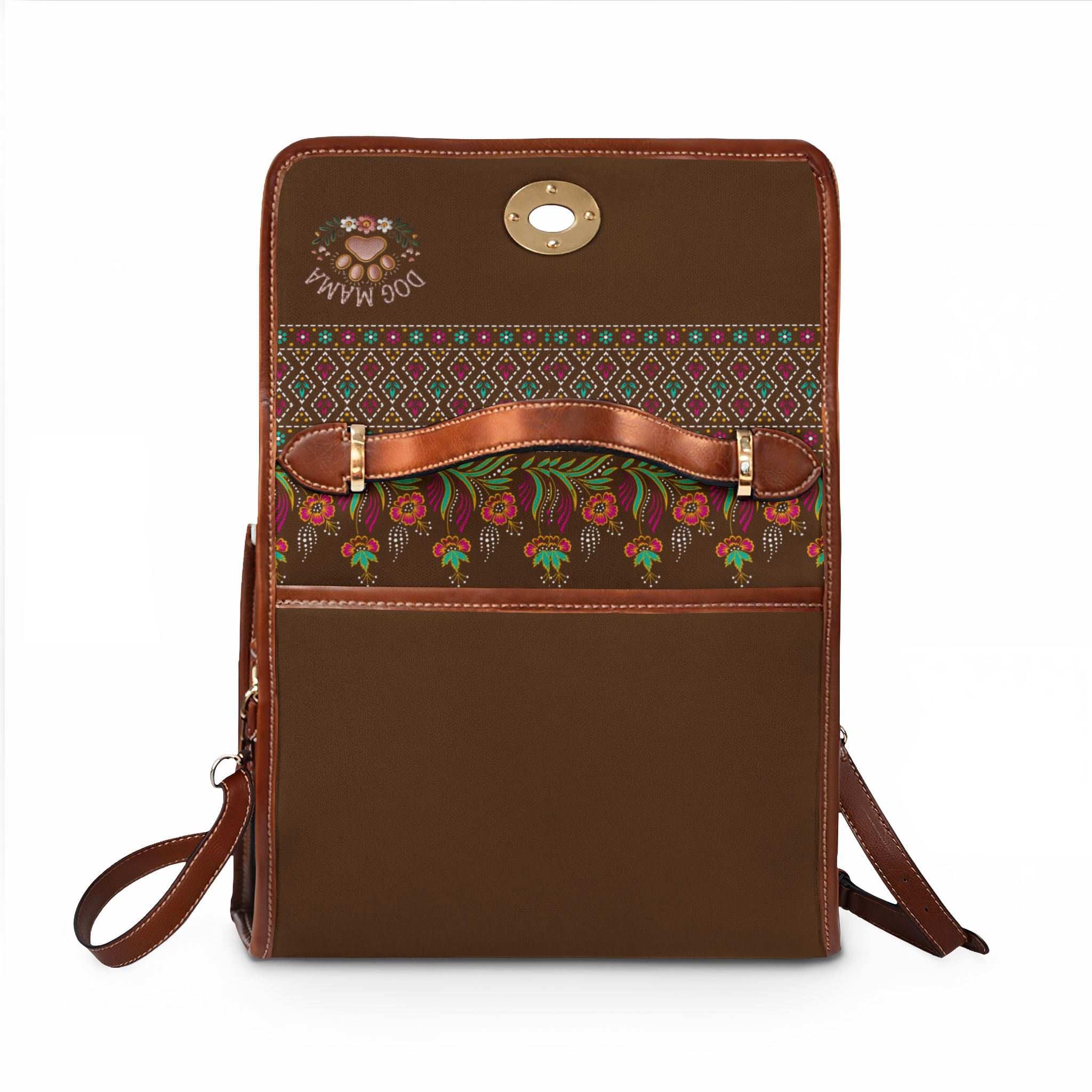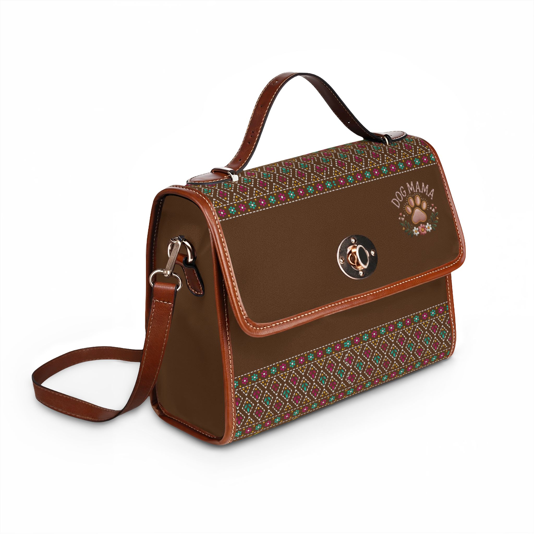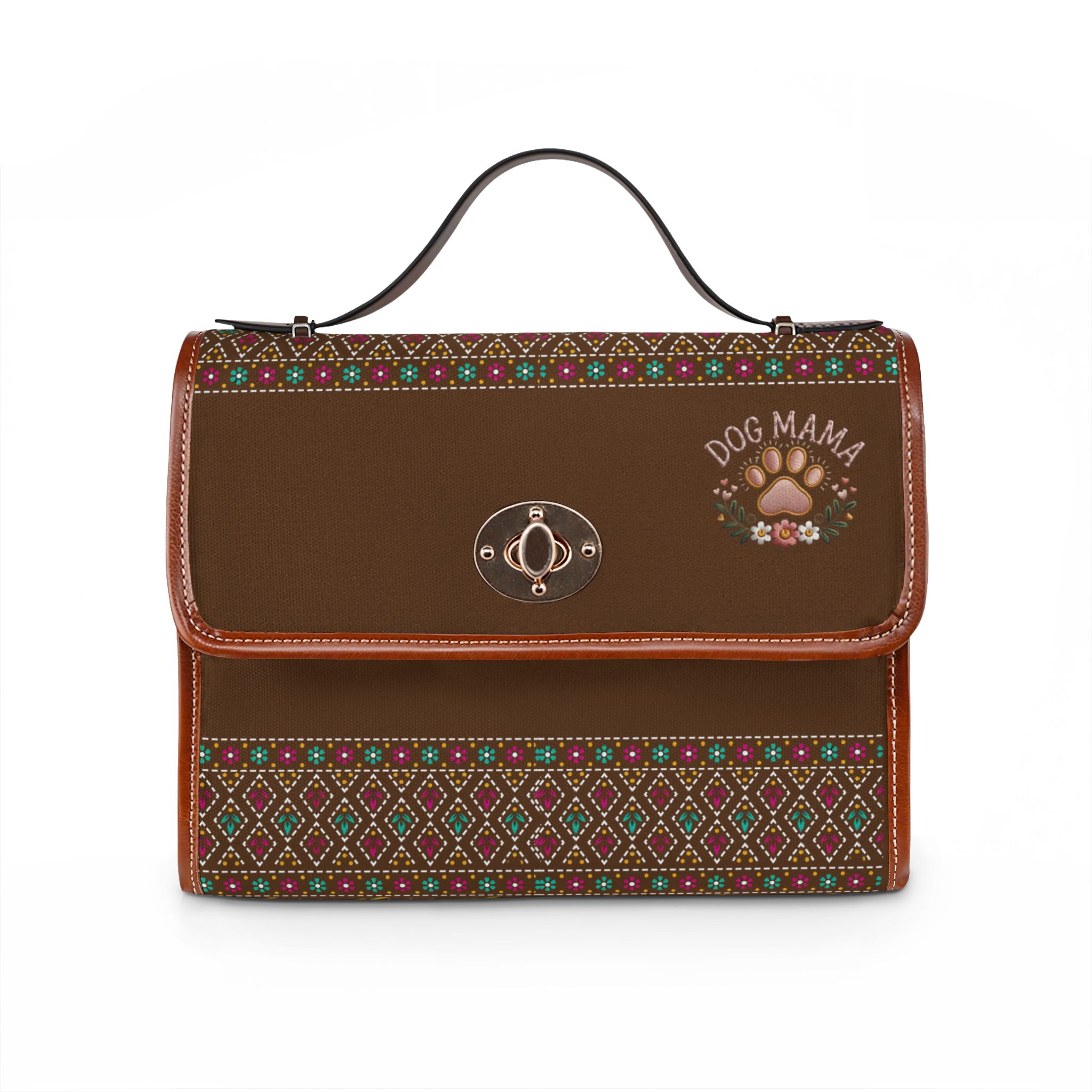 This waterproof canvas bag brings rugged functionality and warm, folk-inspired style together. Rich chocolate canvas is accented with PU leather handles and trim, and patterned woven panels add a cozy, vintage feel. The top flap secures with a metal twist clasp and reveals organized interior pockets—a zip pocket and a slip pocket—for your phone, keys, and small essentials. Carry it by the sturdy top handle or swap to the removable, adjustable shoulder strap when you need hands-free freedom. Built to shrug off rain and spills, it travels from city streets to weekend trails without fuss, and the subtle “Dog Mama” motif speaks to animal lovers who want practical gear with personality.