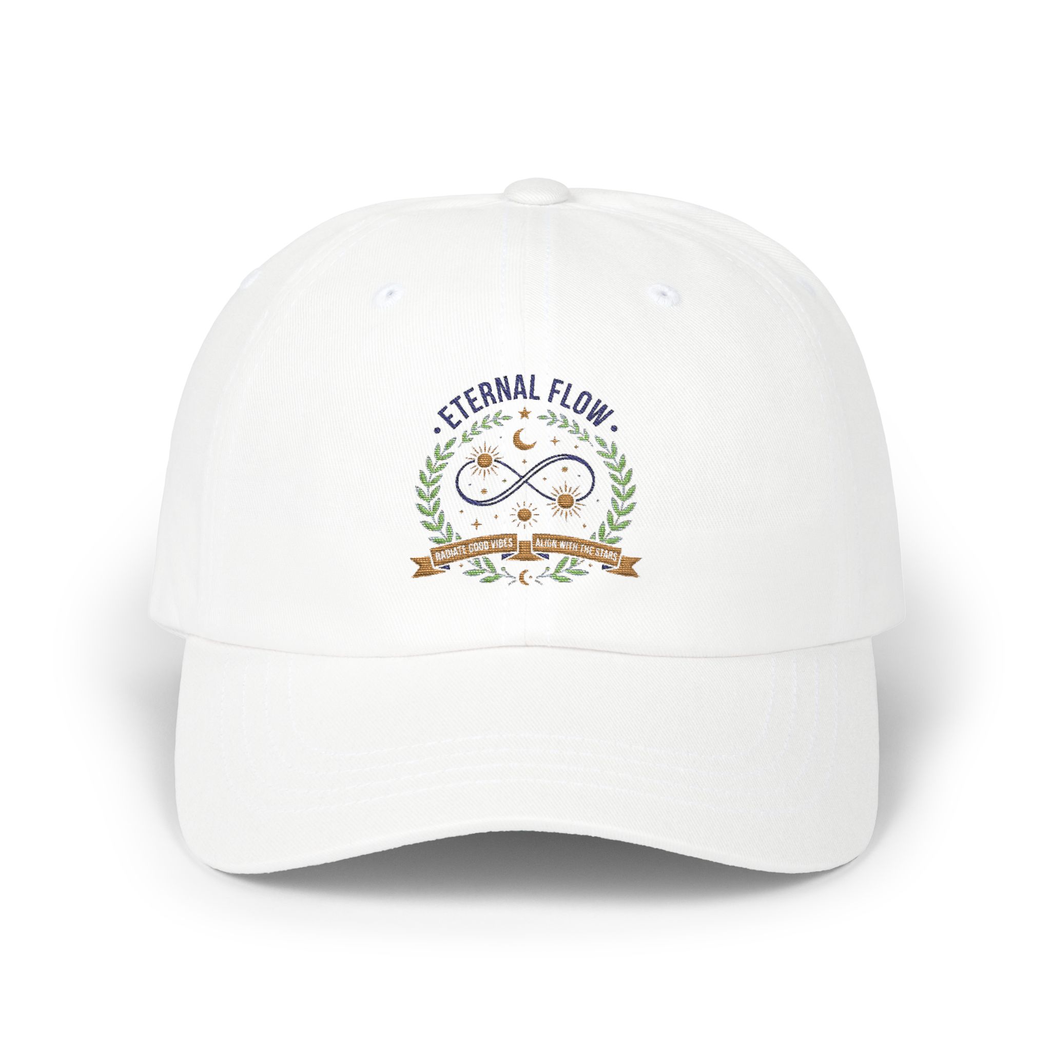 Soft, lived-in vibes meet quiet symbolism. This classic dad cap sits low and relaxed, carrying a small embroidered emblem that reads “Eternal Flow” above an elegant infinity motif framed by leaves and tiny stars. Wear it on slow mornings, park bench coffee runs, or museum afternoons — it folds into days when you want something simple, warm, and subtly meaningful. The precurved visor and adjustable hideaway strap make it feel personalized from the first wear, while the understated stitchwork keeps the look gentle and calm. It’s the kind of hat that settles into your routine and collects small stories.