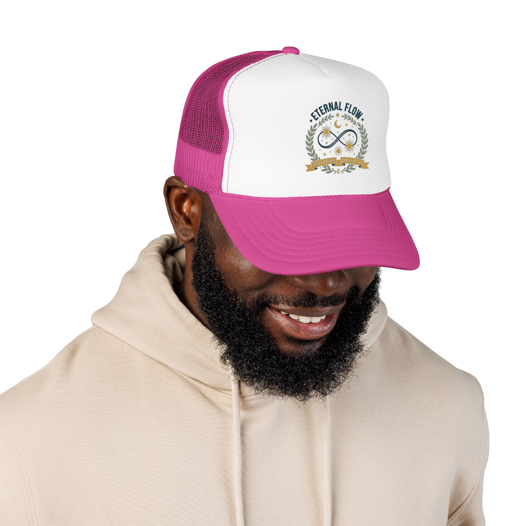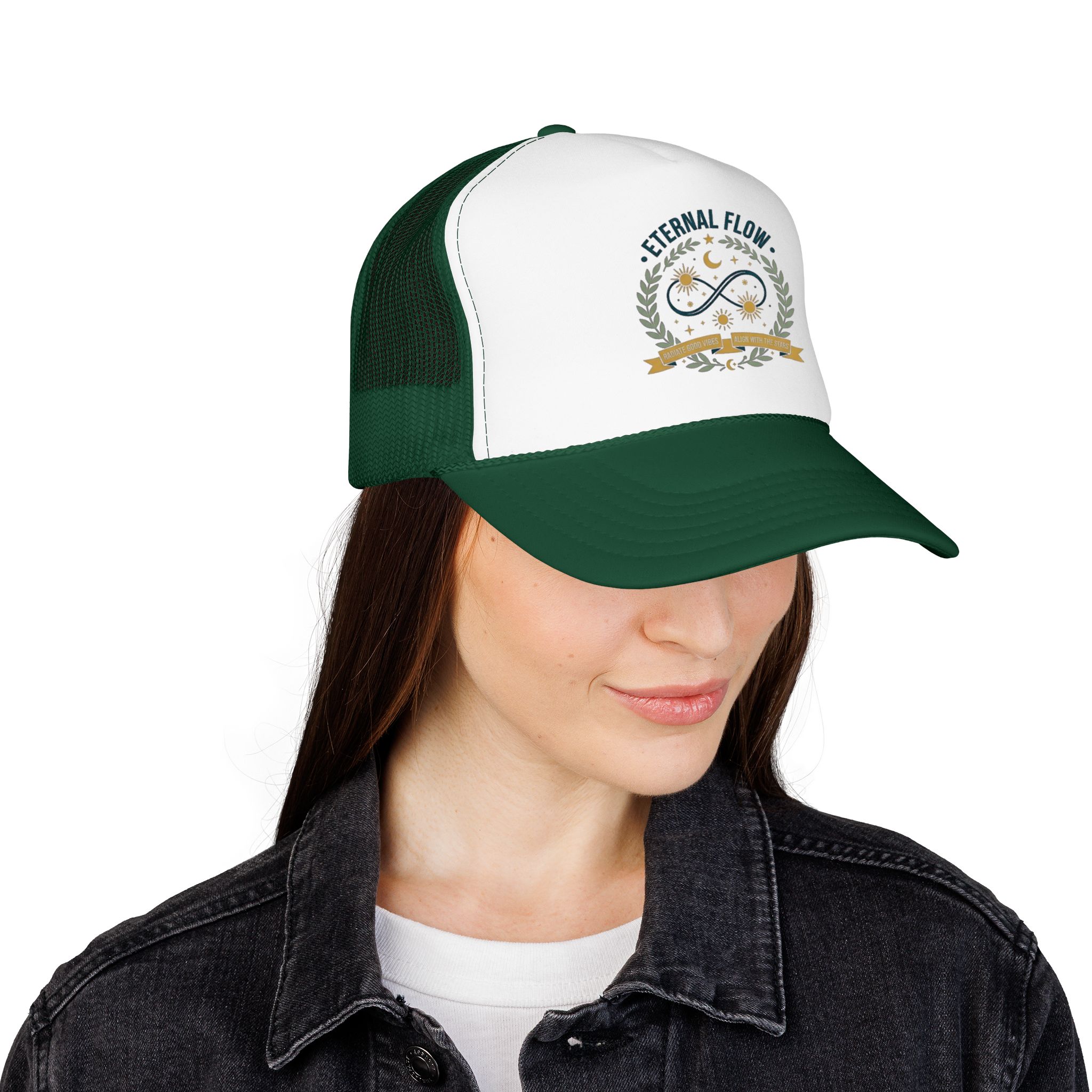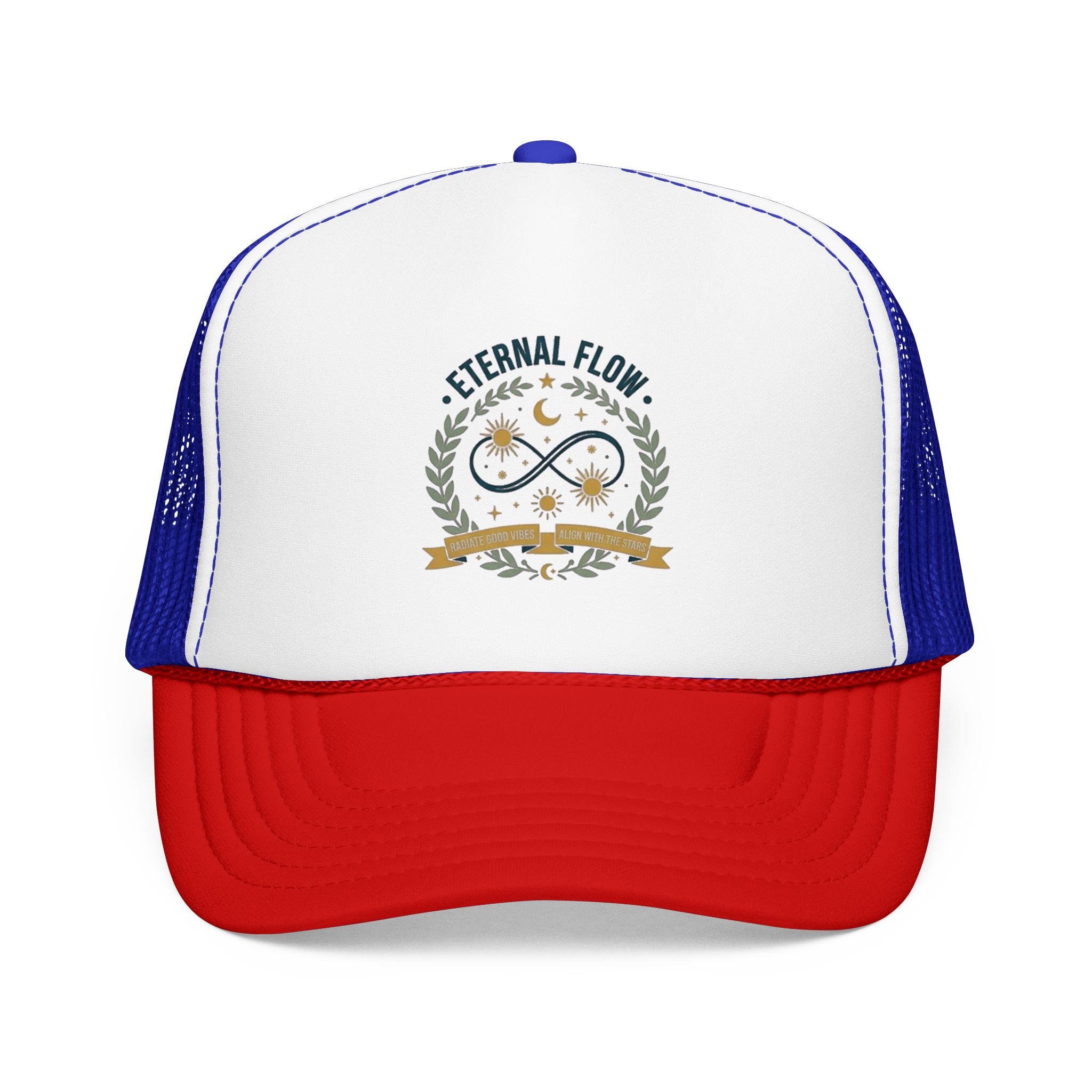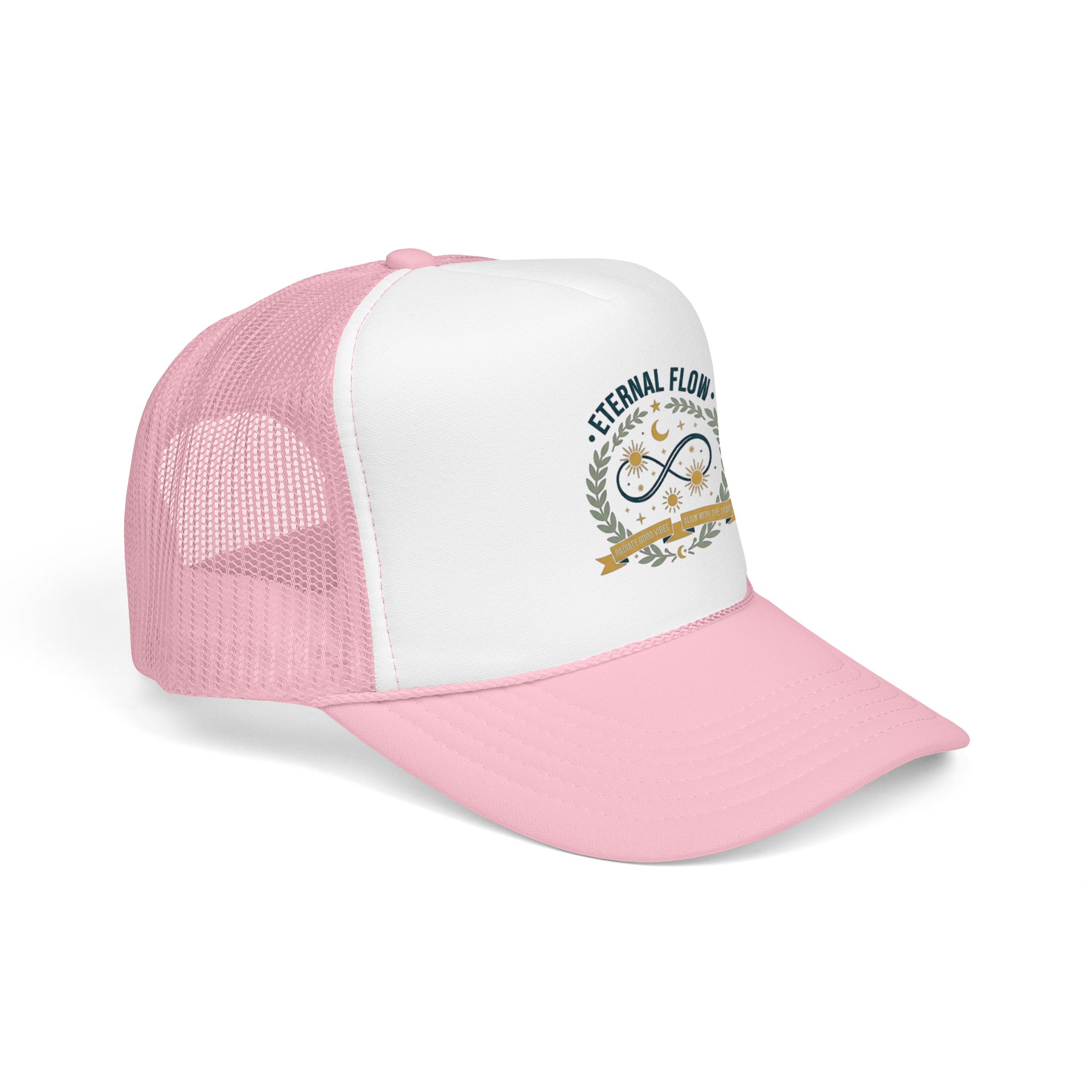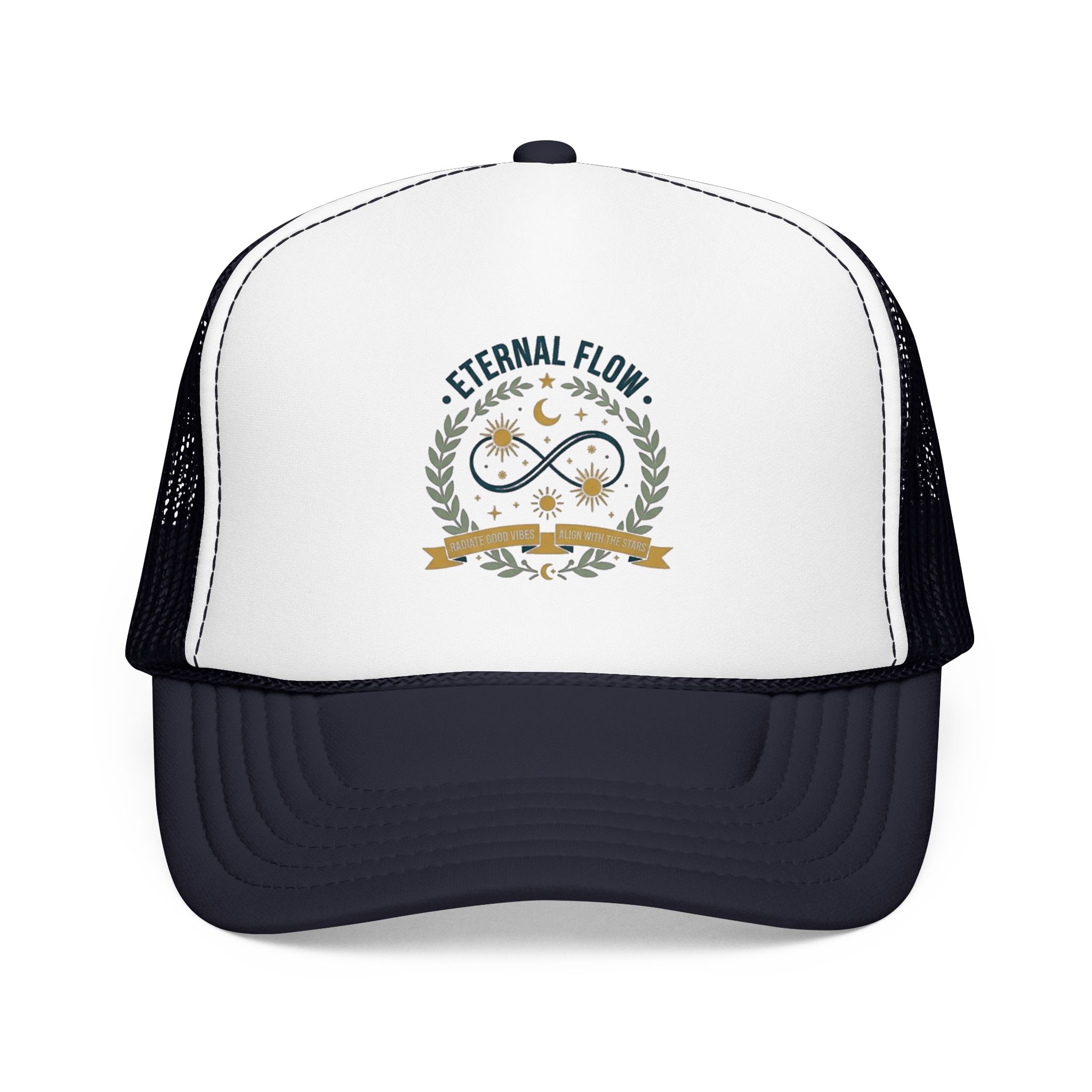 Eternal Flow infinity emblem Foam Trucker Hat | celestial moon stars wreath