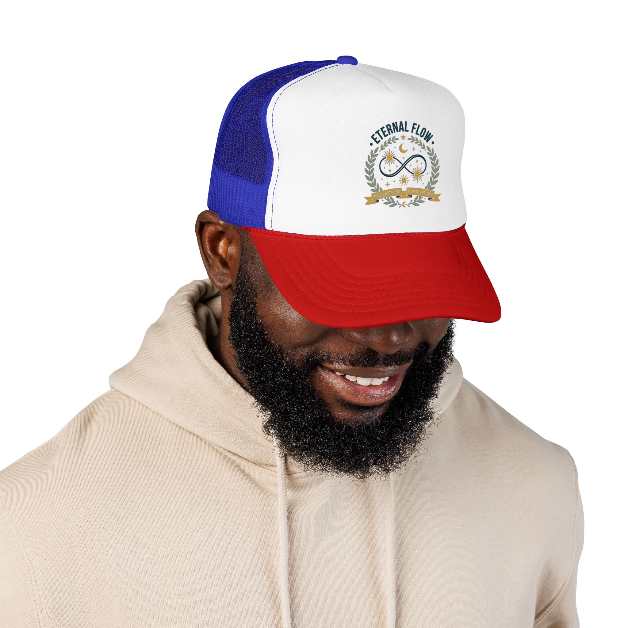 A vintage-inspired foam trucker hat that blends lightweight breathability with a structured, high-profile silhouette. The seamless foam front showcases a small, hand-drawn emblem reading “Eternal Flow” framed by laurel sprigs, stars, and a subtle crescent — a calm, nature-meets-cosmos motif. Mesh panels keep the head cool on long summer drives and outdoor chores, while the pre-curved visor with eight rows of stitching and matching undervisor add durable, polished detail. The adjustable snapback and generous lining make it comfortable for long wear; it slips into daily routines effortlessly, from morning coffee runs to dusk hikes, and feels like a quietly confident finishing touch to casual outfits.
