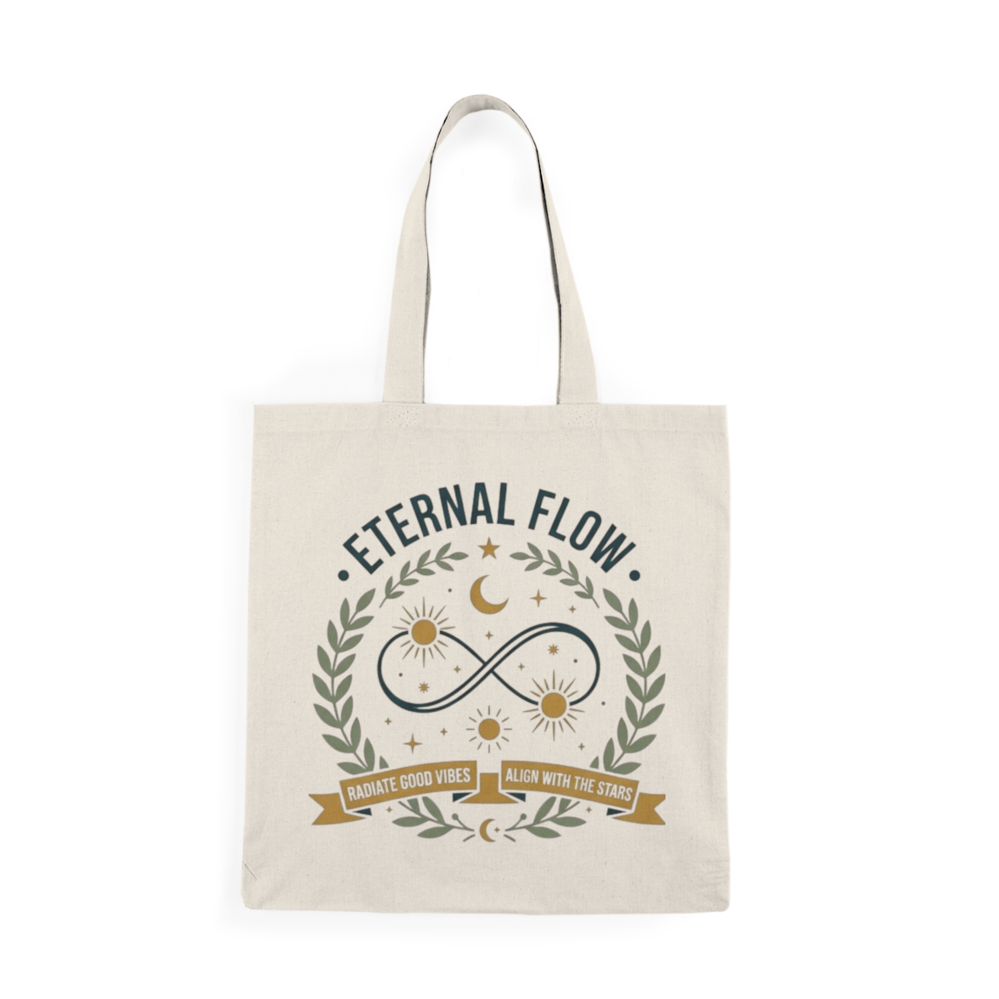A soft, natural cotton canvas tote stamped with a calm, botanical emblem. The earthy cream background lets the muted greens, warm golds, and midnight ink of the design breathe — a looping infinity motif sits between a sun and crescent moon, framed by laurel branches and a subtle banner reading “Radiate good vibes / Align with the stars.” It carries groceries, notebooks, and market finds while quietly broadcasting a mindful, nature-centered sensibility. Lightweight but sturdy, the one-size silhouette slips over a shoulder and becomes an everyday companion for walks to the farmers’ market, library runs, or quiet mornings with a coffee and sketchbook.