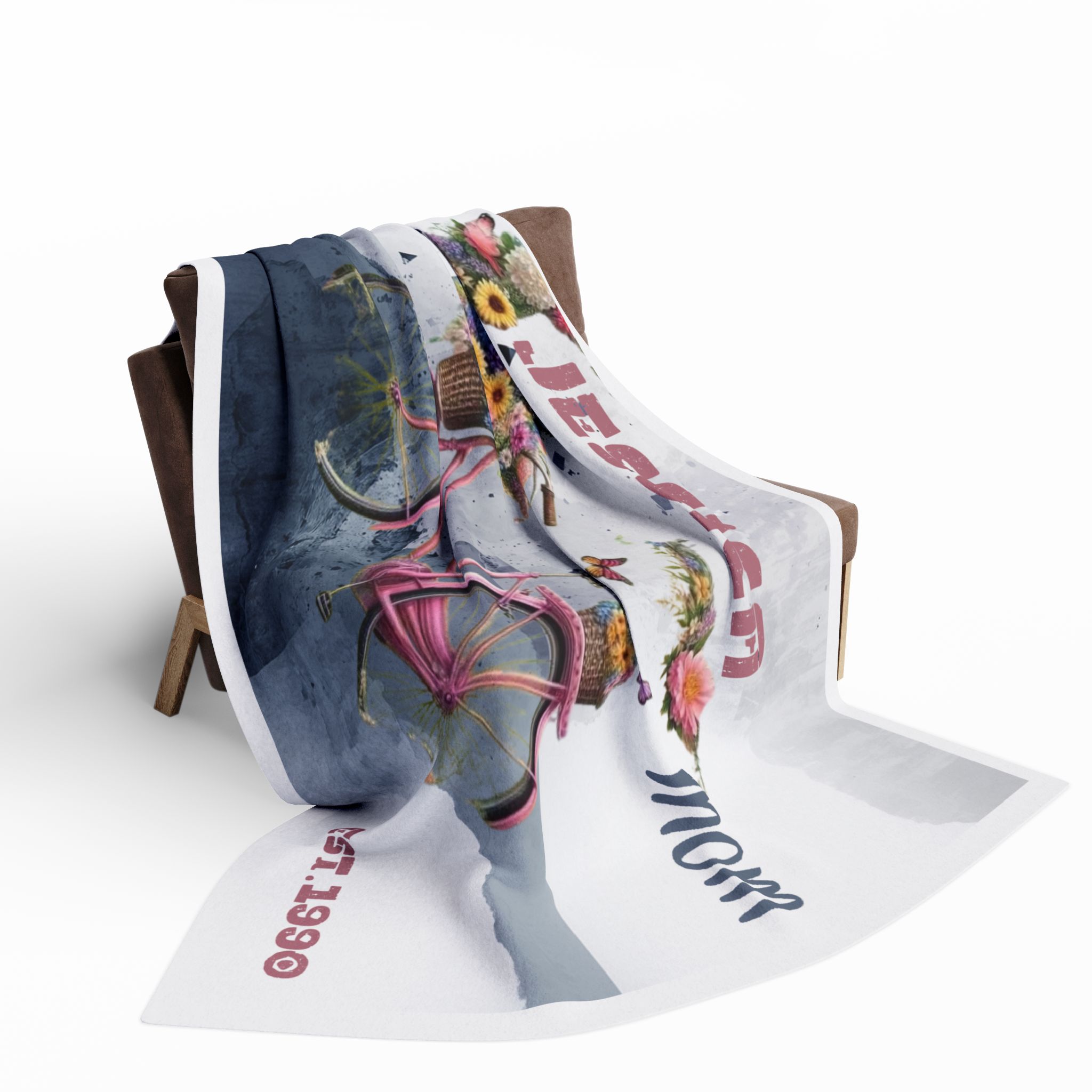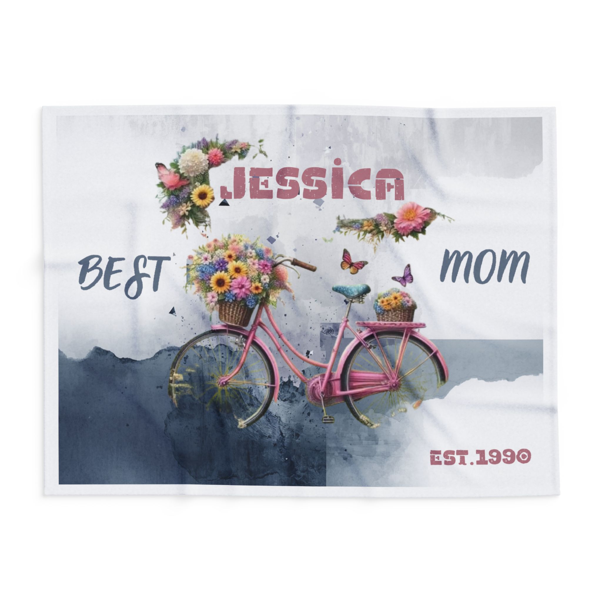 Imagine wrapping someone in a soft, cloud-like hug that smells of fresh blooms and slow, sunny afternoons. This fleece blanket features a vintage pink bicycle piled high with sunflowers, daisies and ribboned bouquets, floating against a watercolor wash of muted blues and grays. Personalized with a name and a small established date, it feels like a quiet keepsake — something to drape over knees while reading on the sofa, to take on a picnic by the river, or to tuck around shoulders during a cool evening on the porch. The plush, thick fleece and vivid print keep the scene alive, so every glance brings a little smile and a gentle reminder of home and memories made together.