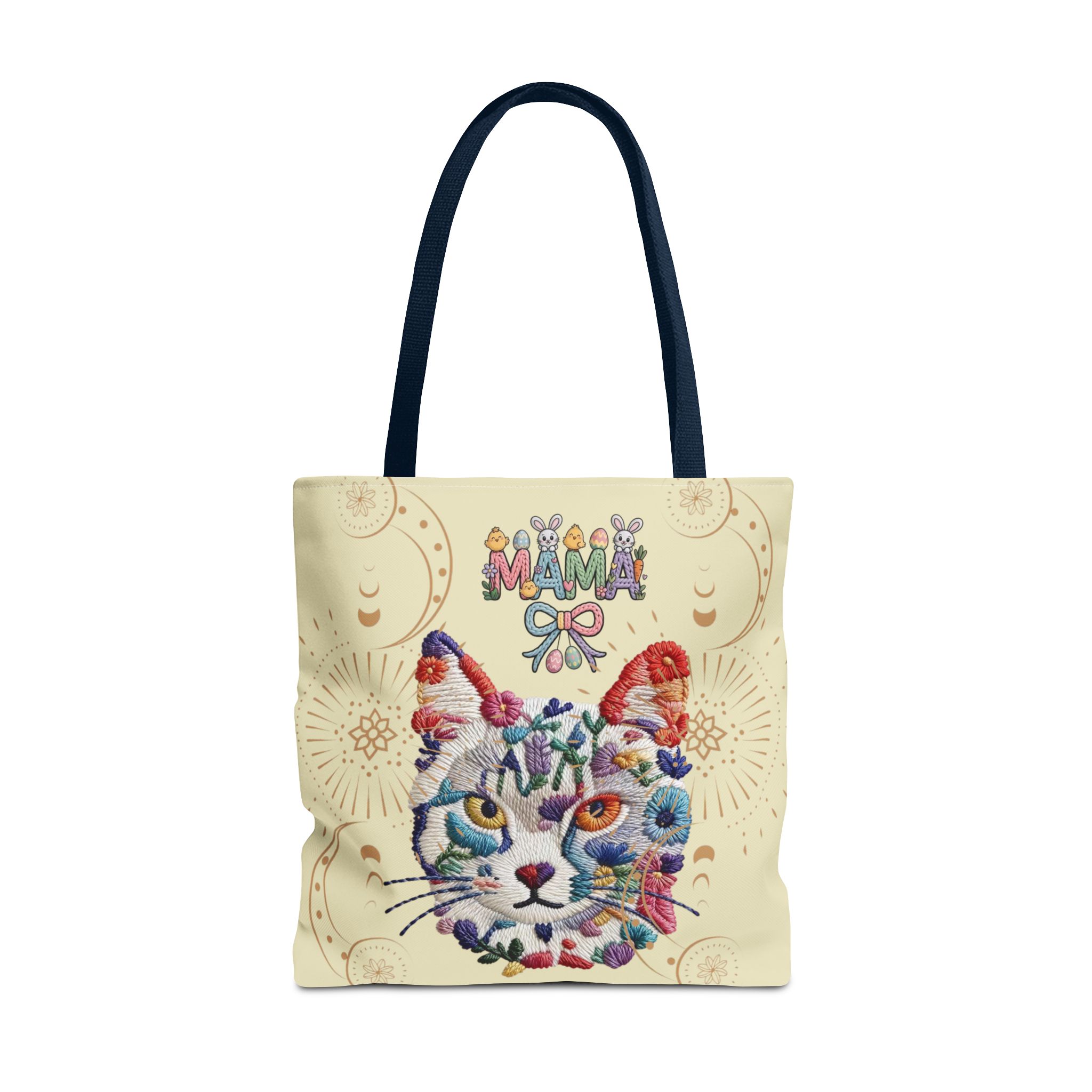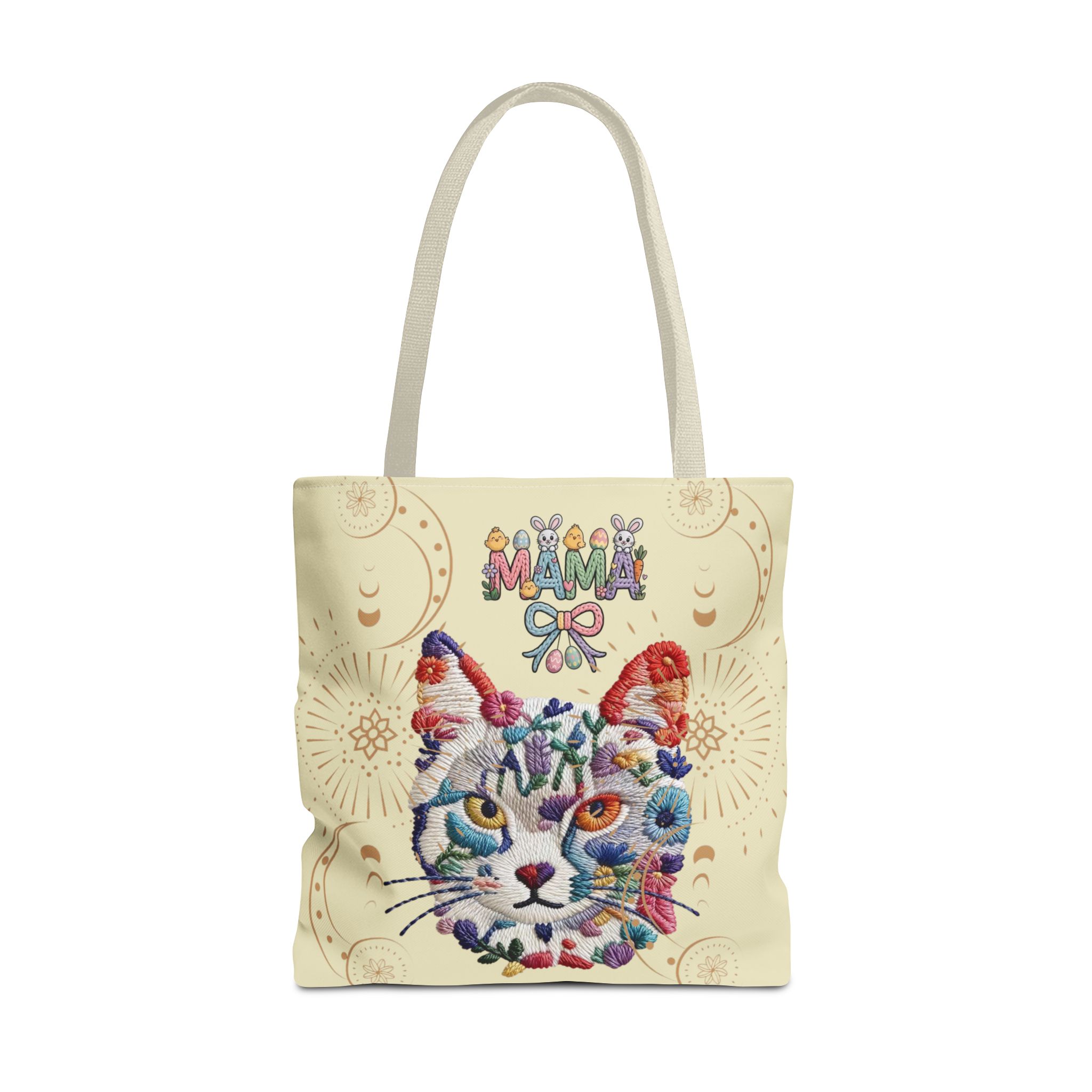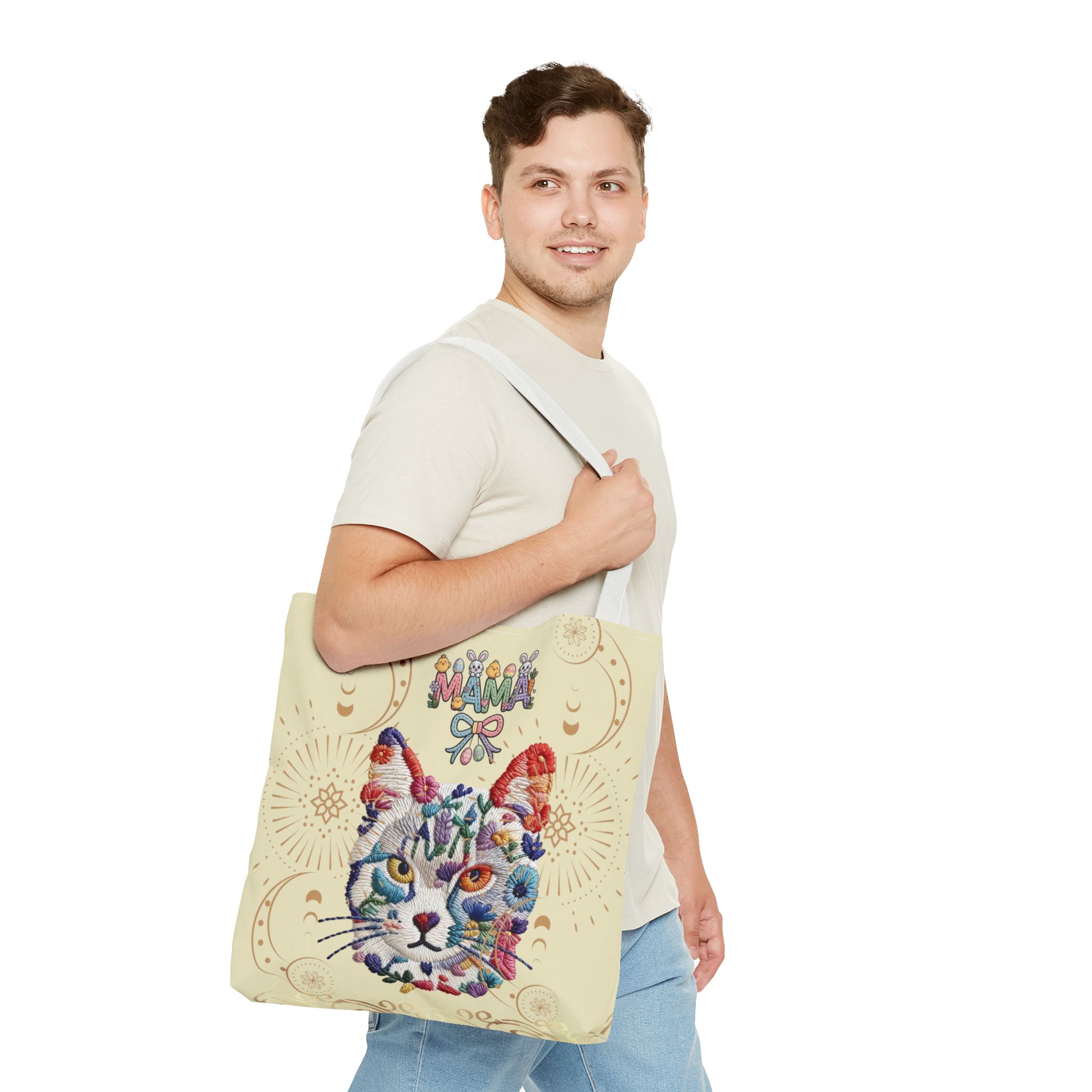 Soft cream canvas holds a playful embroidered-style cat face made of tiny flowers, stitches, and colorful motifs. Above the cat, a hand-drawn “MAMA” with a little bow adds warm, personal sentiment. This tote lives in the everyday moments — school runs, market strolls, or a relaxed coffee date — bringing a cheerful, crafty vibe wherever it goes. The roomy boxed corners give it structure for books or groceries, while the reinforced handles and durable polyester body stand up to daily use. Lightweight, quick-drying, and available with multiple handle colors, it feels like a small, wearable art piece that quietly celebrates family, creativity, and the joy of simple routines.