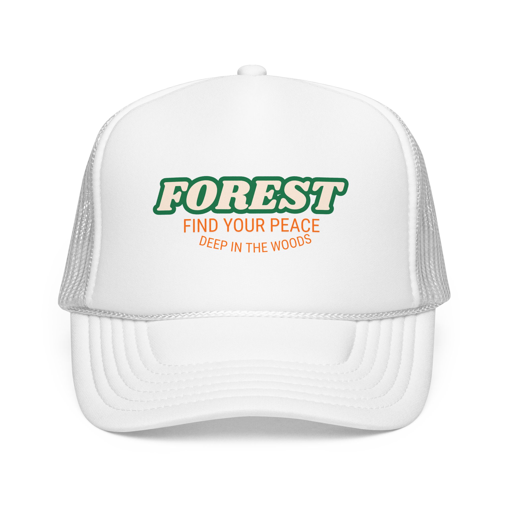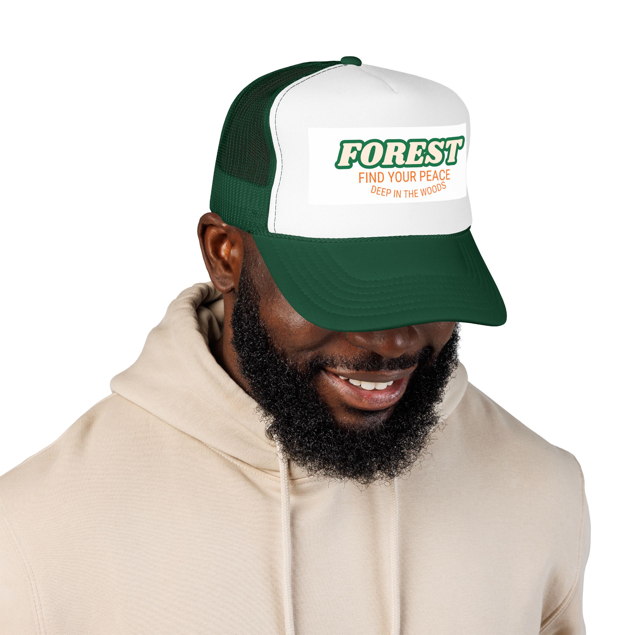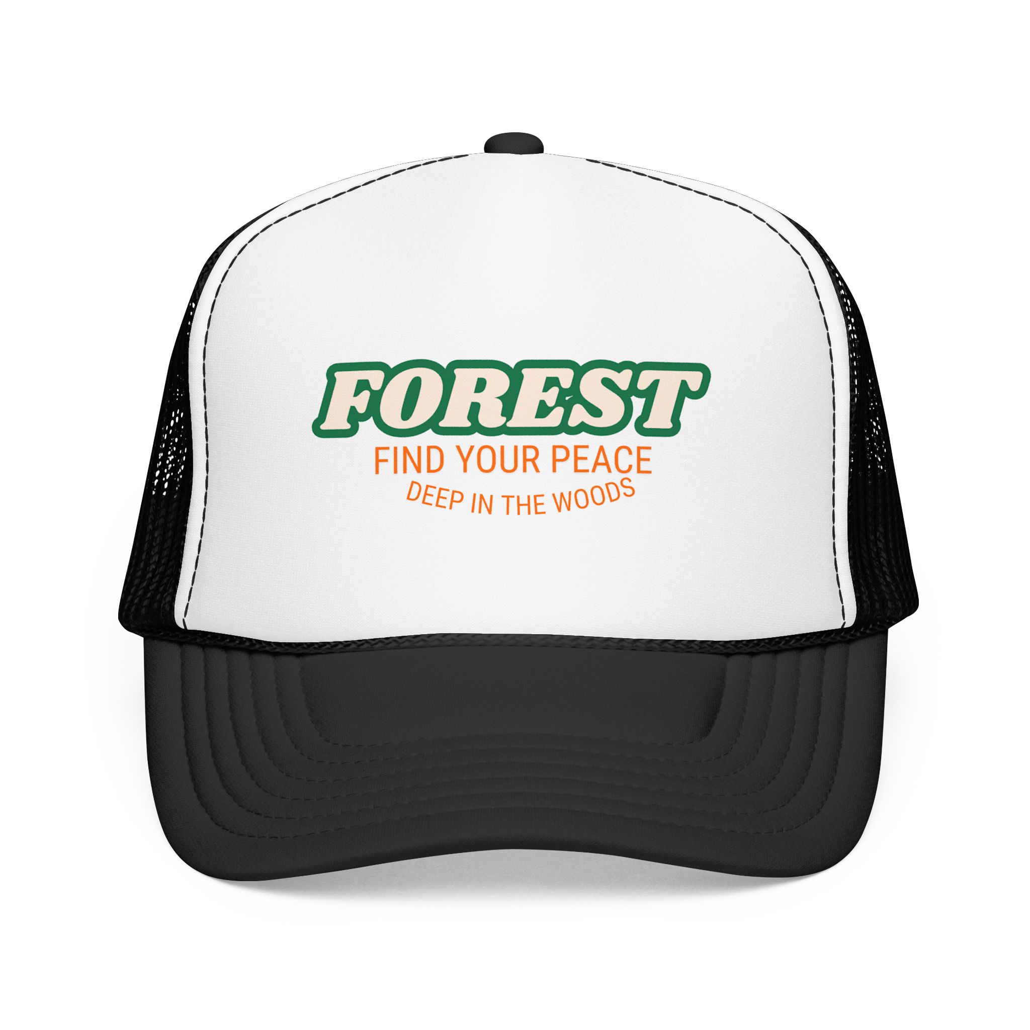 This foam trucker hat carries a quiet, woodsy mood — the white foam front showcases a bold green “FOREST” wordmark with warm orange subtext that reads “Find your peace — deep in the woods.” The black mesh back and pre-curved visor keep the cap breathable and road-ready while the structured, high-profile front holds the design crisp and visible. It sits comfortably for long days outside: hikes where you pause to listen to wind in the pines, weekend drives down country lanes, or afternoons spent at a campfire swapping slow stories. The hat feels substantial on the head and wears in with character, pairing easily with flannels, faded denim, or a pack slung over your shoulder. For someone who seeks calm in nature and likes their gear to look lived-in but intentional, this trucker slips into outdoor moments and everyday routines without fuss.