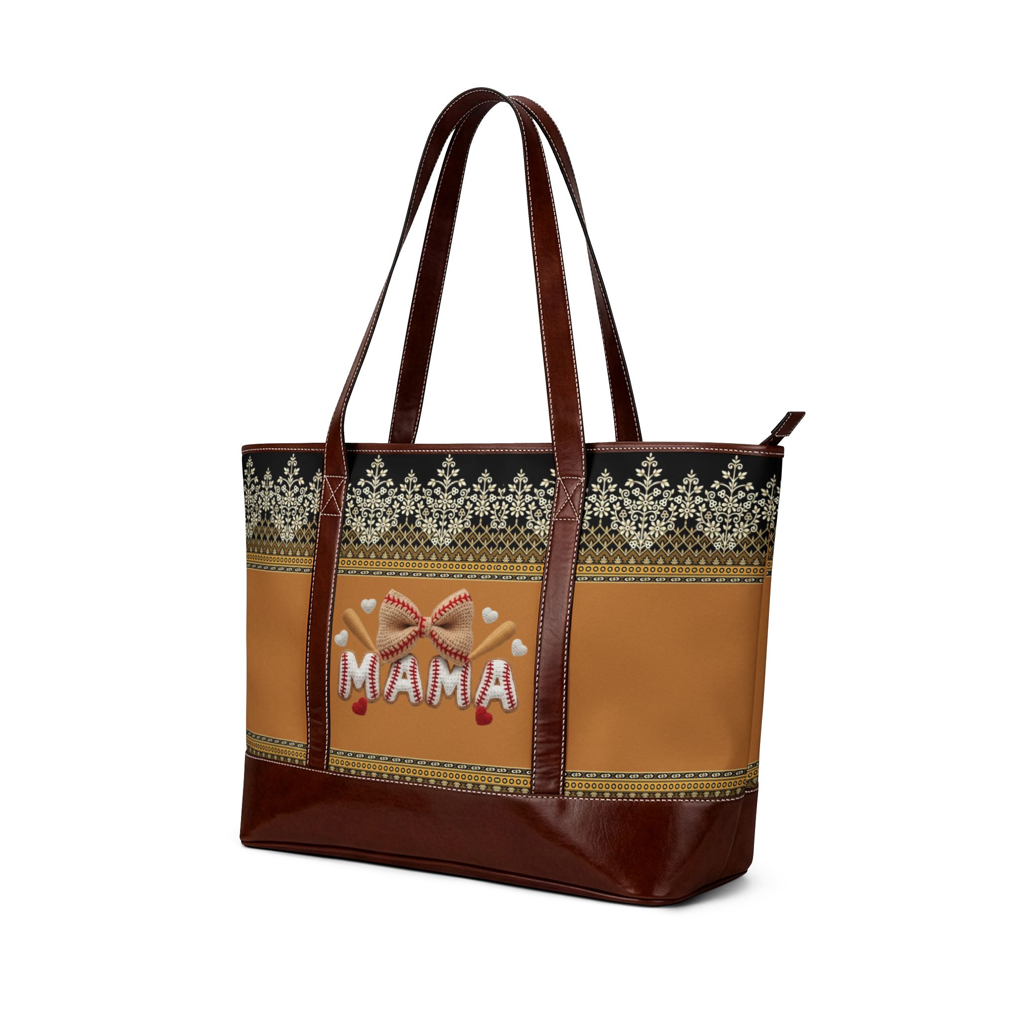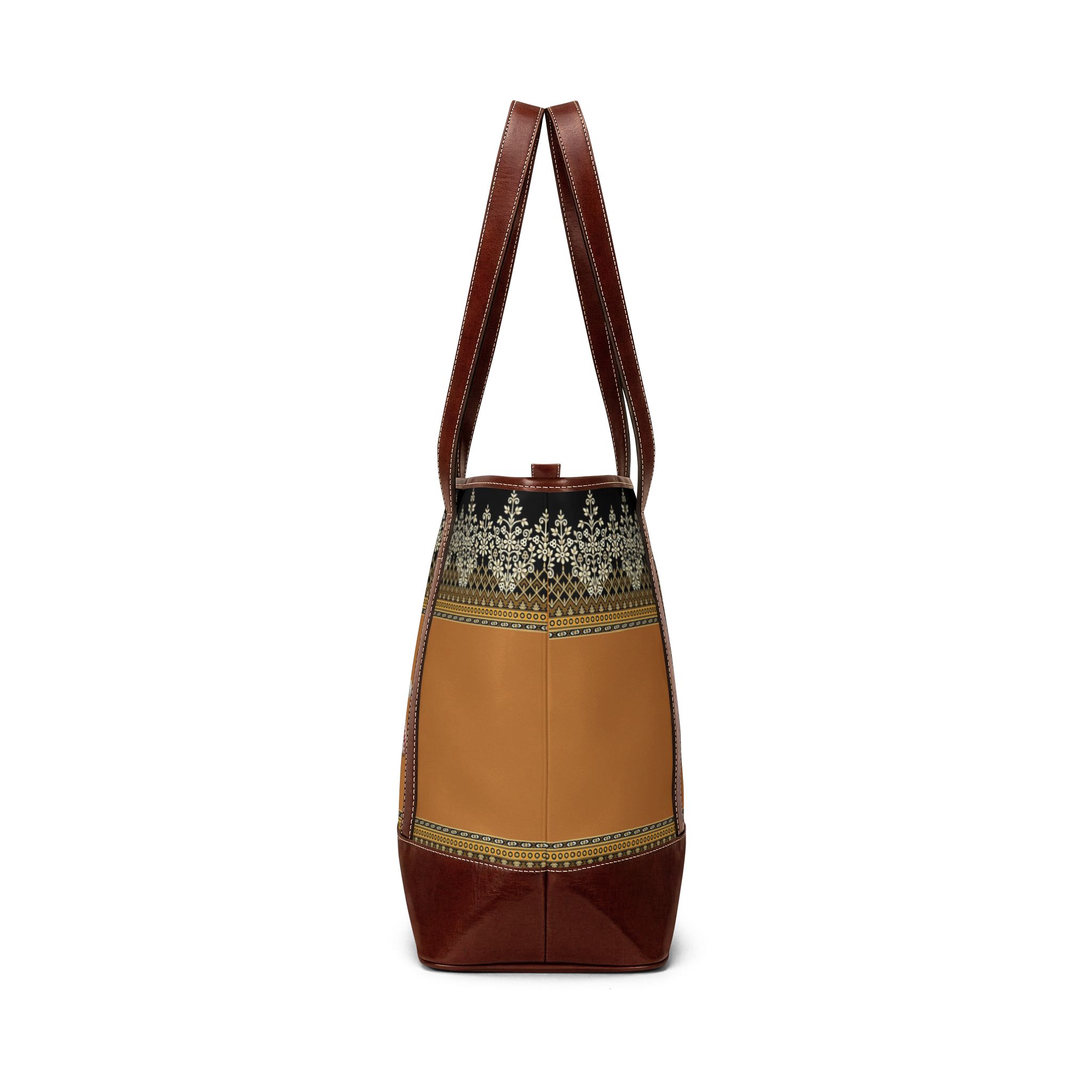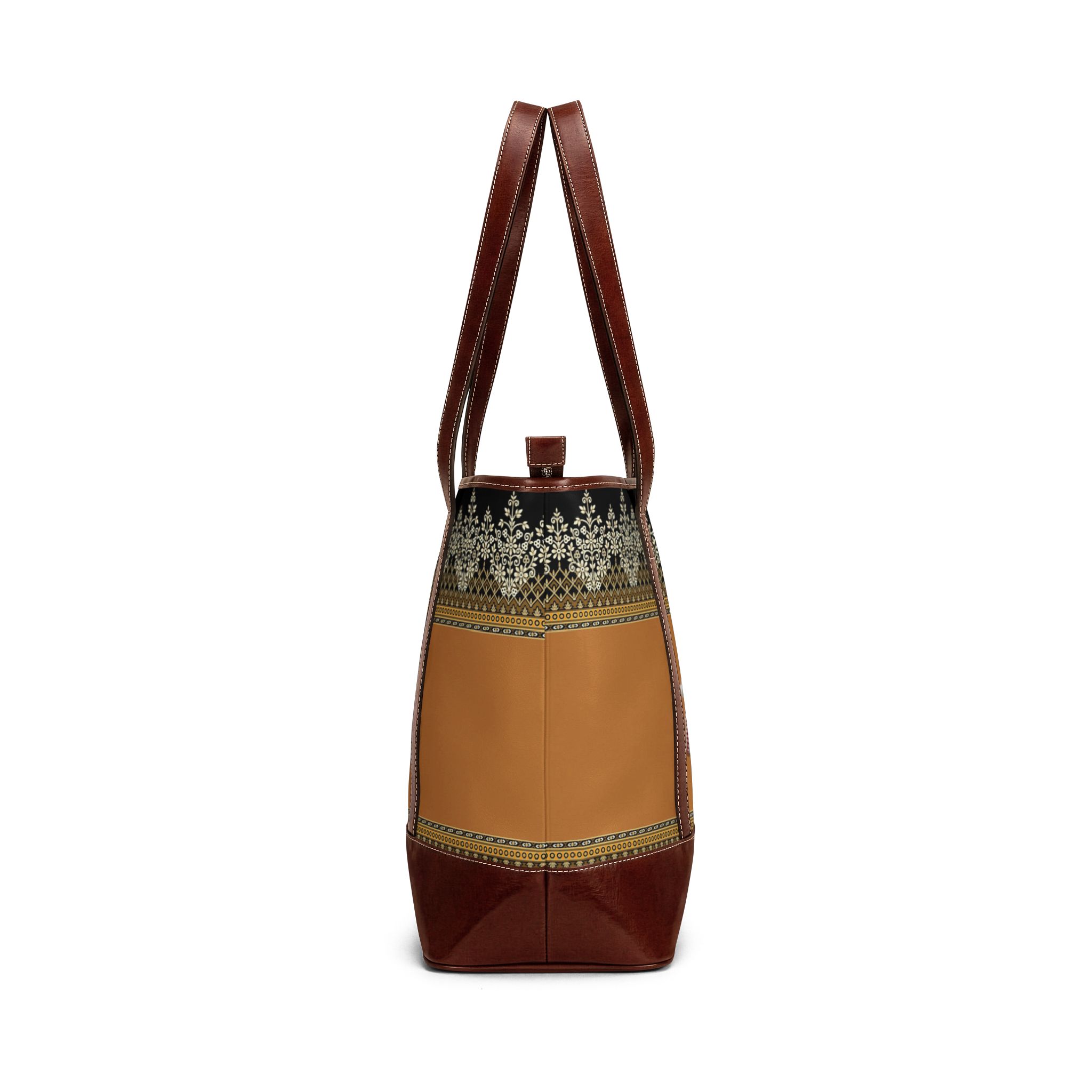 A beautifully crafted handbag that blends timeless ornamentation with everyday practicality. Deep indigo fabric is printed with an elegant paisley-like motif in soft gold and muted greens, sitting above a rich faux-leather base and matching sturdy handles. The roomy interior keeps a weekly planner, wallet, water bottle, and small tech organized thanks to full-length interior pockets, while the water-resistant polyester exterior stands up to rainy commutes and café spills. Warm, artisanal styling pairs with durable construction, so this bag feels at home from market mornings to evening gatherings.