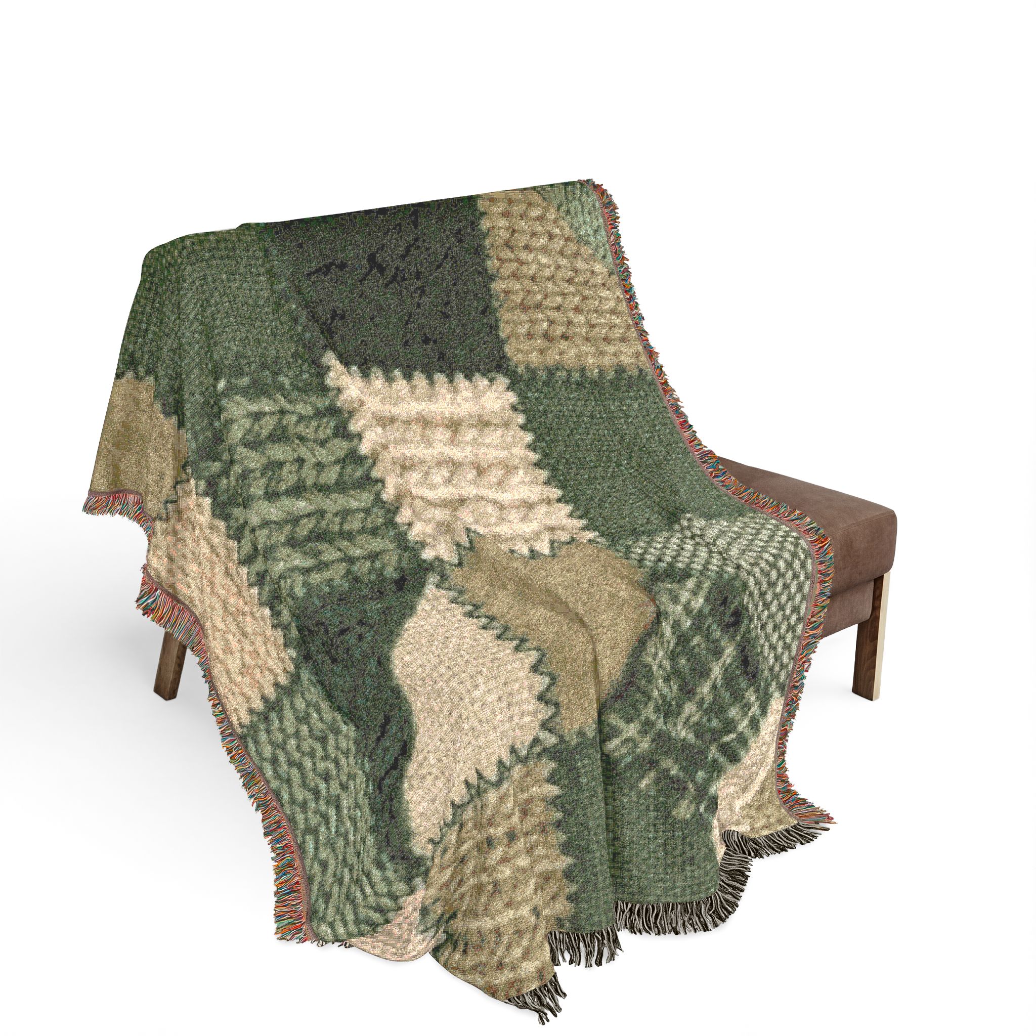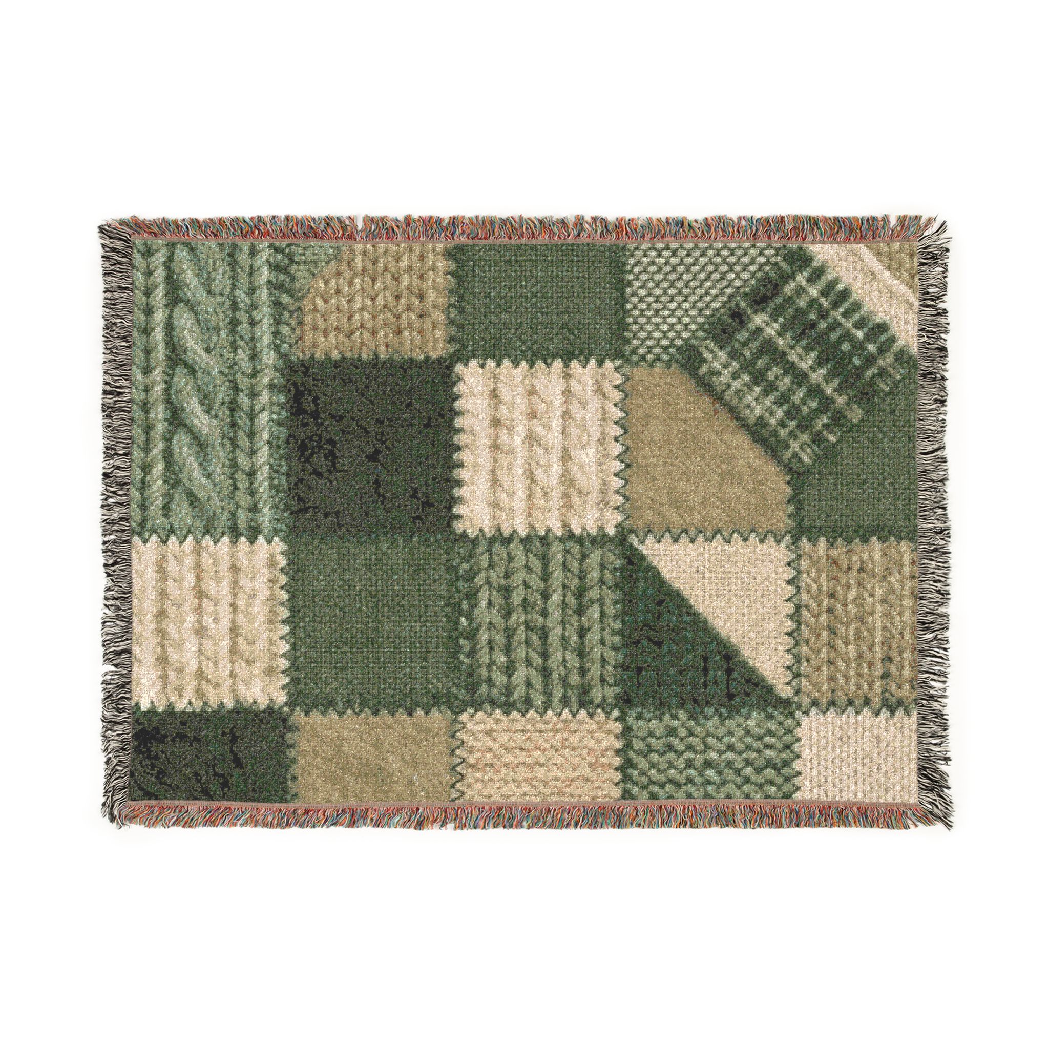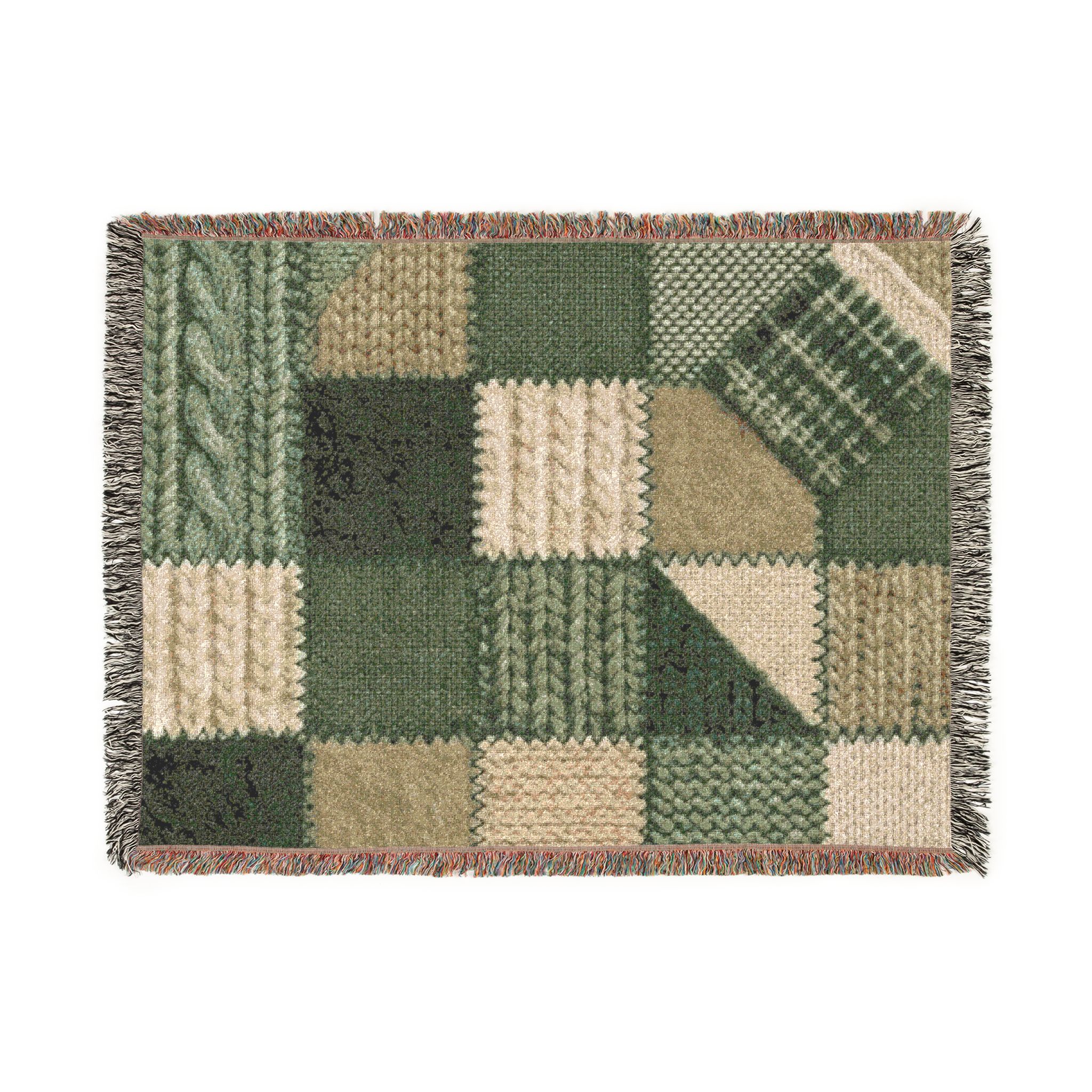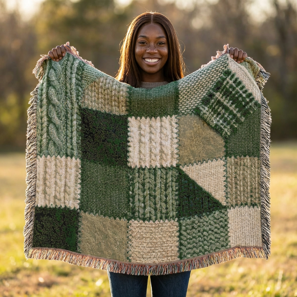 This woven blanket brings quiet, homey warmth to a favorite chair or the foot of your bed. Built from 100% cotton and crafted with woven threads and colorful fringed edges, it reads like a stitched story — textured squares of deep forest greens, mossy khakis, and cream that feel both rustic and refined. Pick the Artwork variant if you want crisp, bold blocks of color and strong graphic definition. Choose the Photo variant when your design relies on subtle color gradations and photographic detail. Available in three sizes, it layers easily over sofas, cushions, or picnic baskets and becomes part of daily routines — curling up with a book, warming cool evenings on the porch, or bringing a handcrafted look to a cabin table setting. Note that mockups are illustrative; the tactile weave and slight color shifts in person are part of the charm.