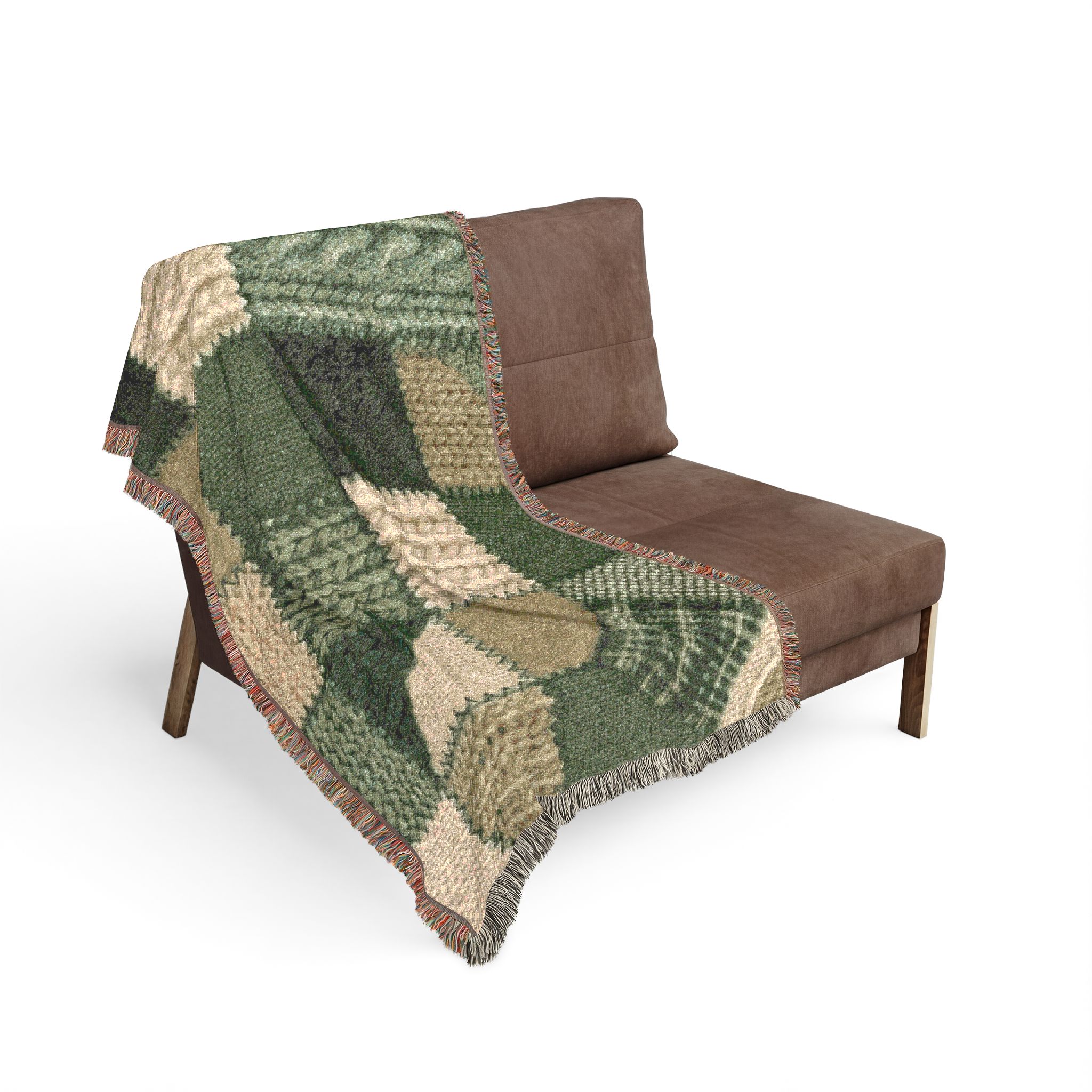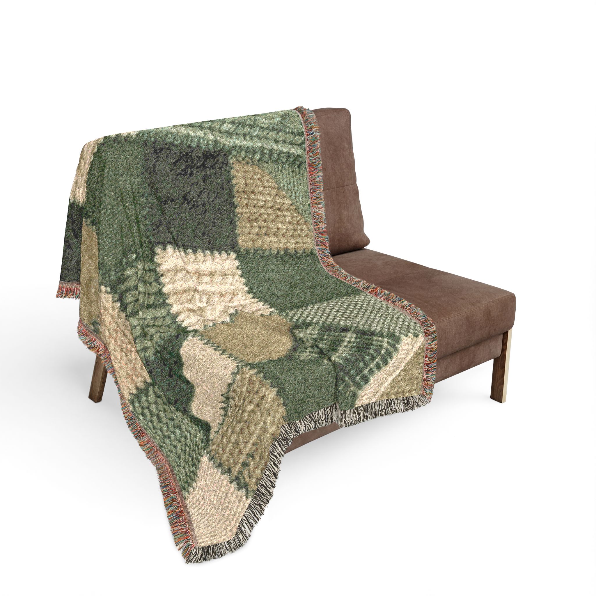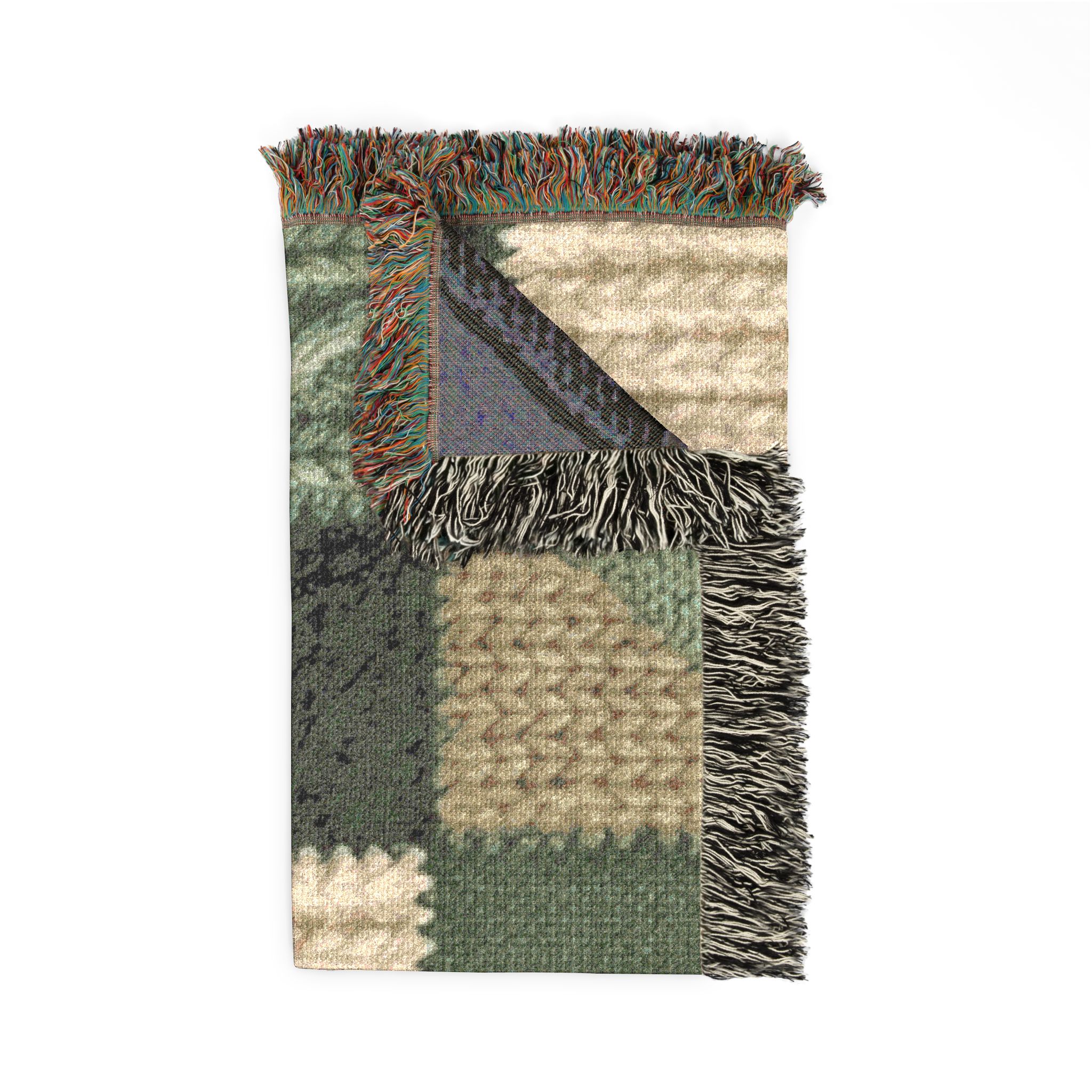 This woven blanket brings quiet, homey warmth to a favorite chair or the foot of your bed. Built from 100% cotton and crafted with woven threads and colorful fringed edges, it reads like a stitched story — textured squares of deep forest greens, mossy khakis, and cream that feel both rustic and refined. Pick the Artwork variant if you want crisp, bold blocks of color and strong graphic definition. Choose the Photo variant when your design relies on subtle color gradations and photographic detail. Available in three sizes, it layers easily over sofas, cushions, or picnic baskets and becomes part of daily routines — curling up with a book, warming cool evenings on the porch, or bringing a handcrafted look to a cabin table setting. Note that mockups are illustrative; the tactile weave and slight color shifts in person are part of the charm.