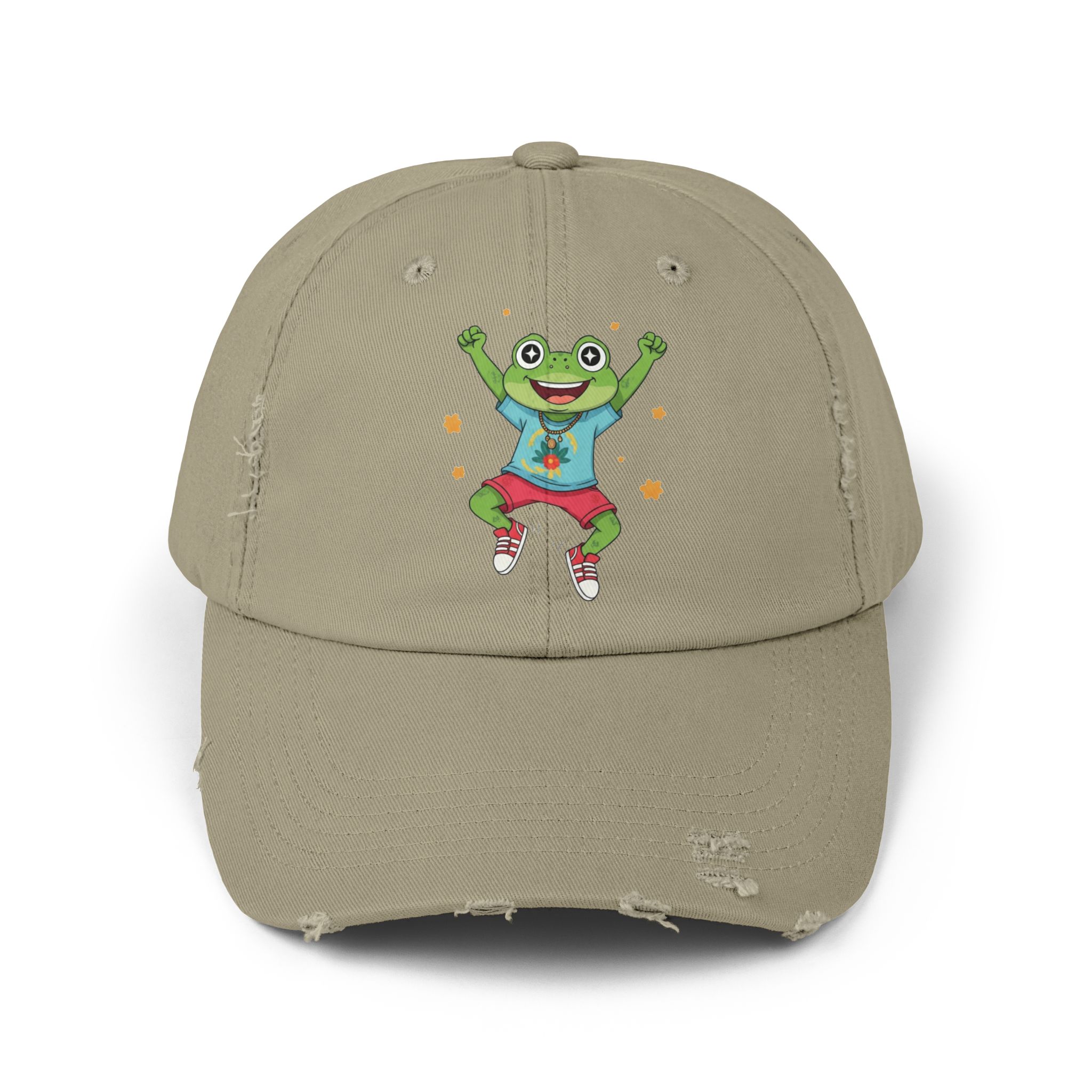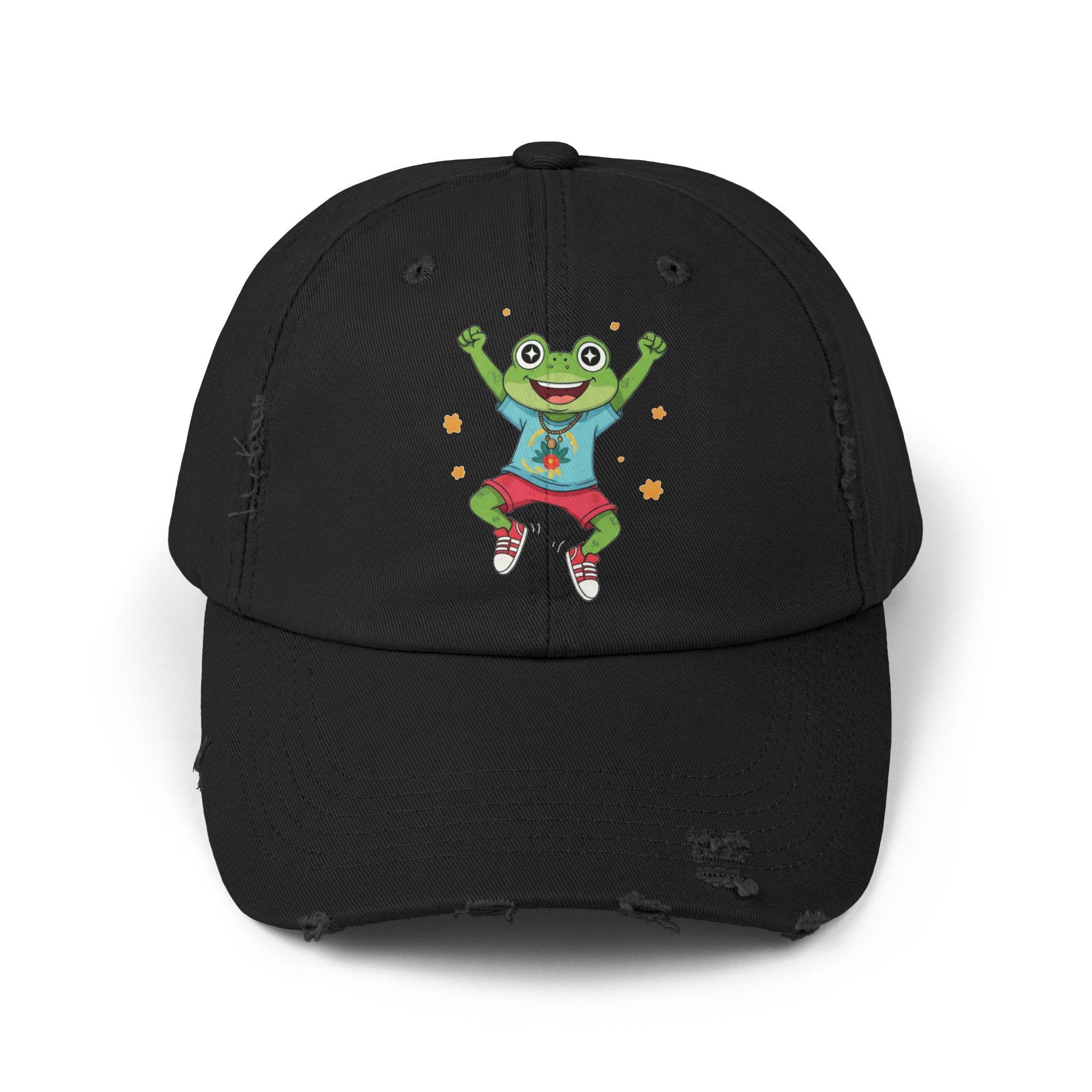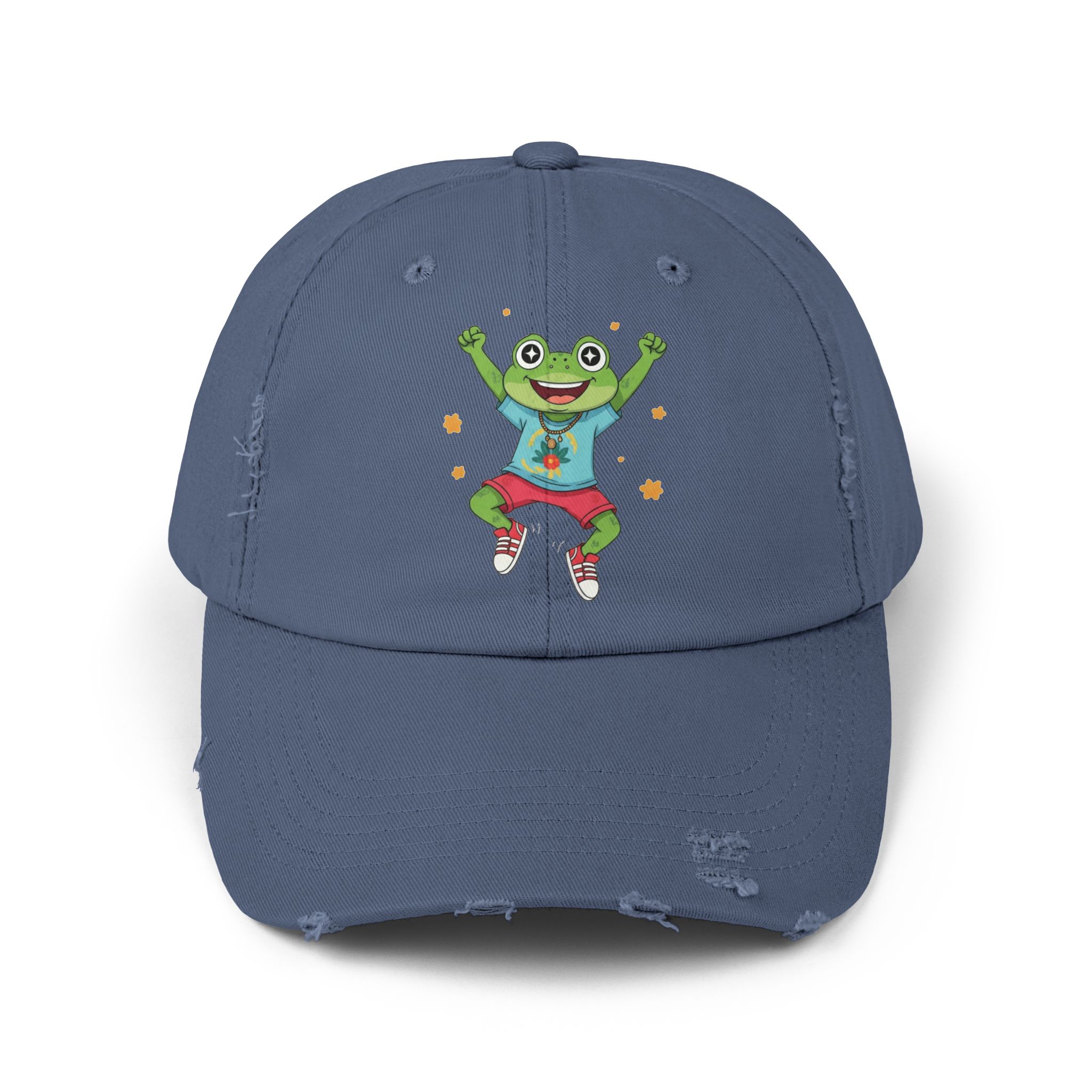A laid-back, lived-in cap that carries a playful spark. This 100% cotton twill hat has a low-profile, unstructured fit that settles softly on the head, while distressed edges and subtle wear bring a vintage, road-worn character. A cheerful frog illustration—bright colors and an energetic pose—adds a small burst of joy to the front, printed with DTF for crisp detail. The curved visor, six-panel construction, and sewn-in label keep it feeling familiar and well-made. The hideaway strap with metal D-ring lets you adjust the fit and tuck the end away for a clean look. Each hat’s finish and distressing vary slightly, so every piece feels personal and broken-in from day one.