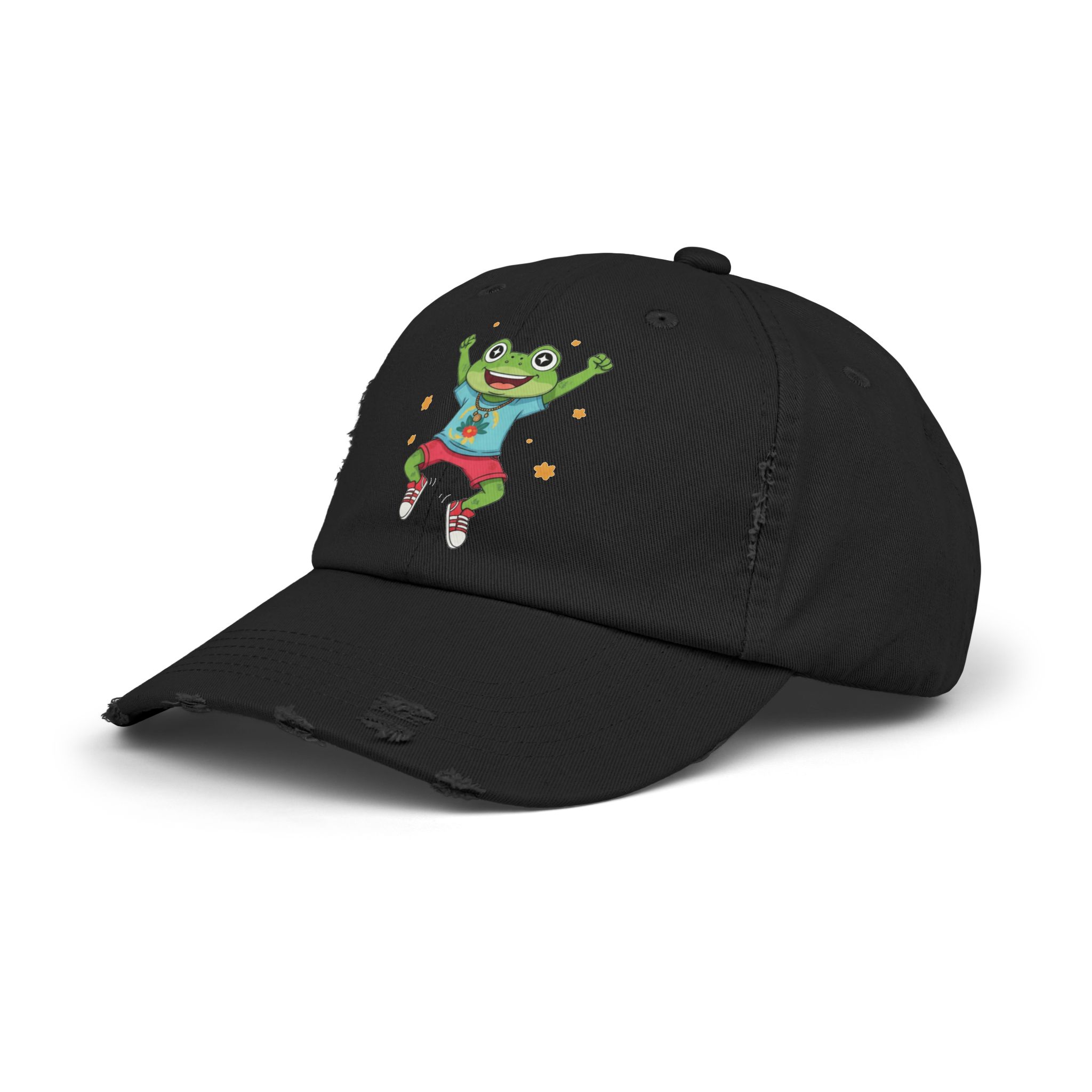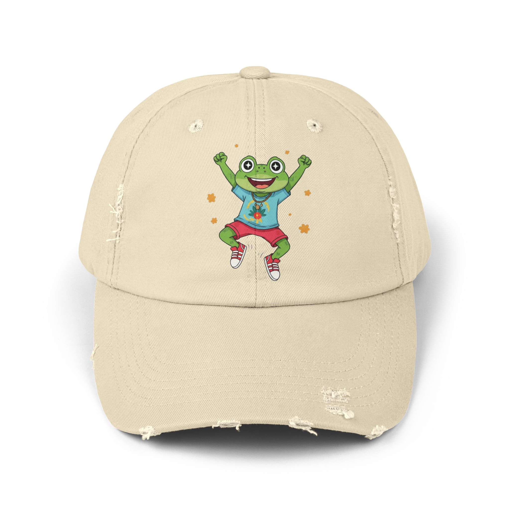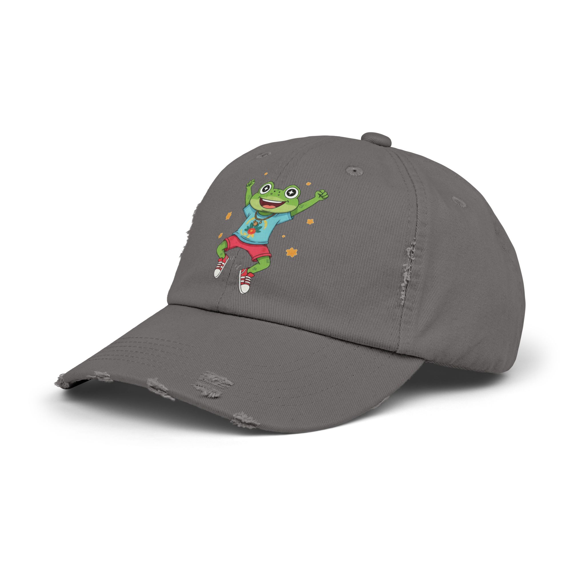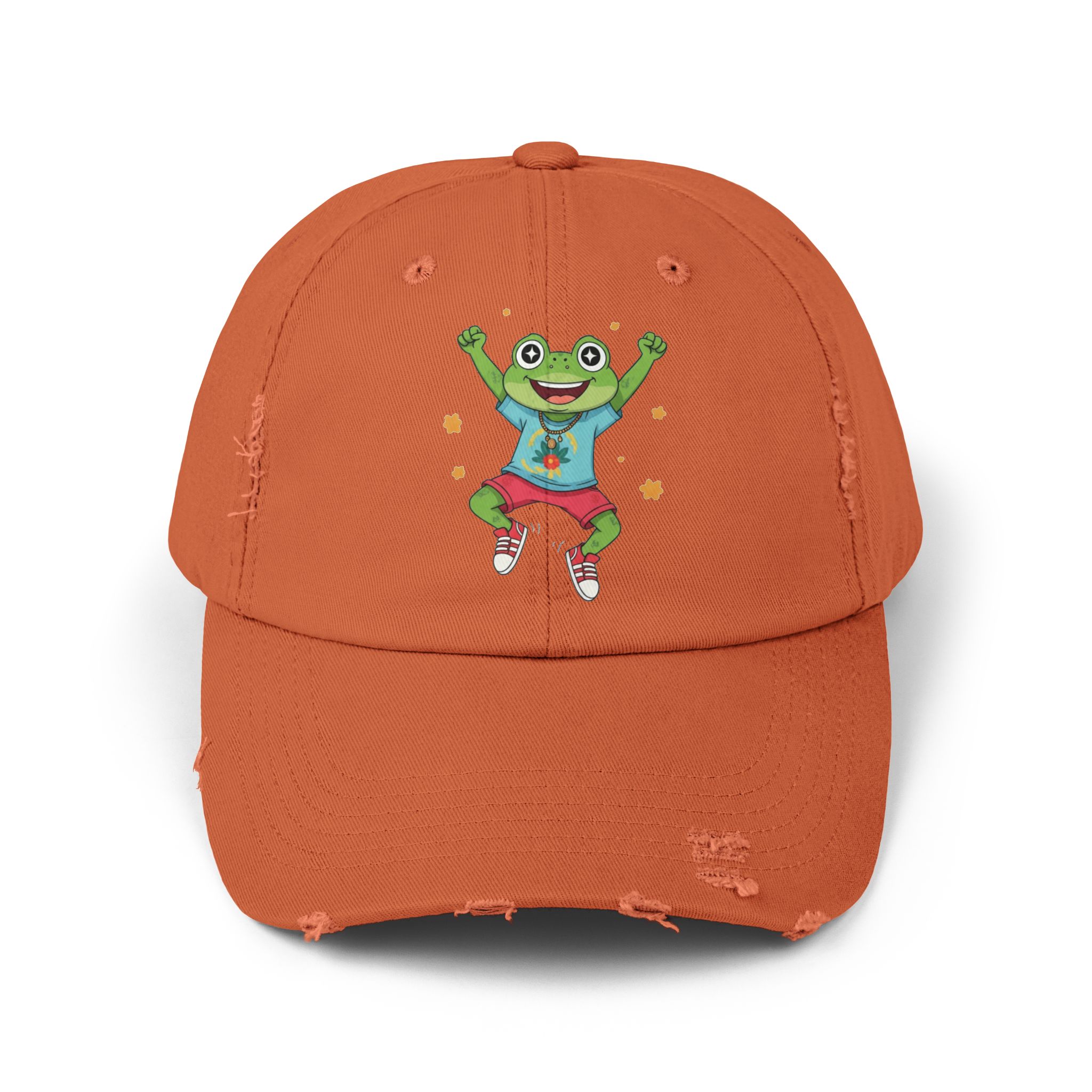 A laid-back, lived-in cap that carries a playful spark. This 100% cotton twill hat has a low-profile, unstructured fit that settles softly on the head, while distressed edges and subtle wear bring a vintage, road-worn character. A cheerful frog illustration—bright colors and an energetic pose—adds a small burst of joy to the front, printed with DTF for crisp detail. The curved visor, six-panel construction, and sewn-in label keep it feeling familiar and well-made. The hideaway strap with metal D-ring lets you adjust the fit and tuck the end away for a clean look. Each hat’s finish and distressing vary slightly, so every piece feels personal and broken-in from day one.