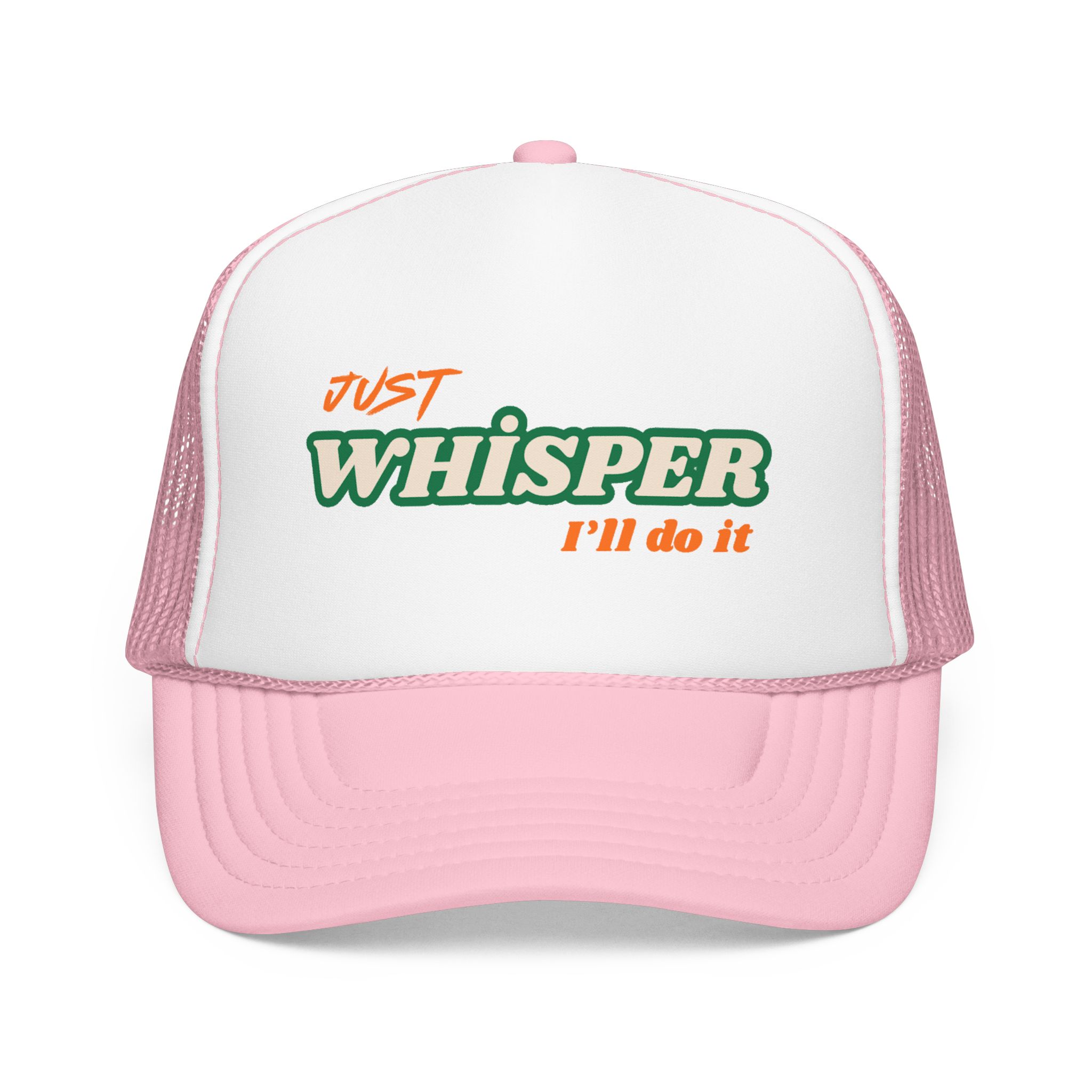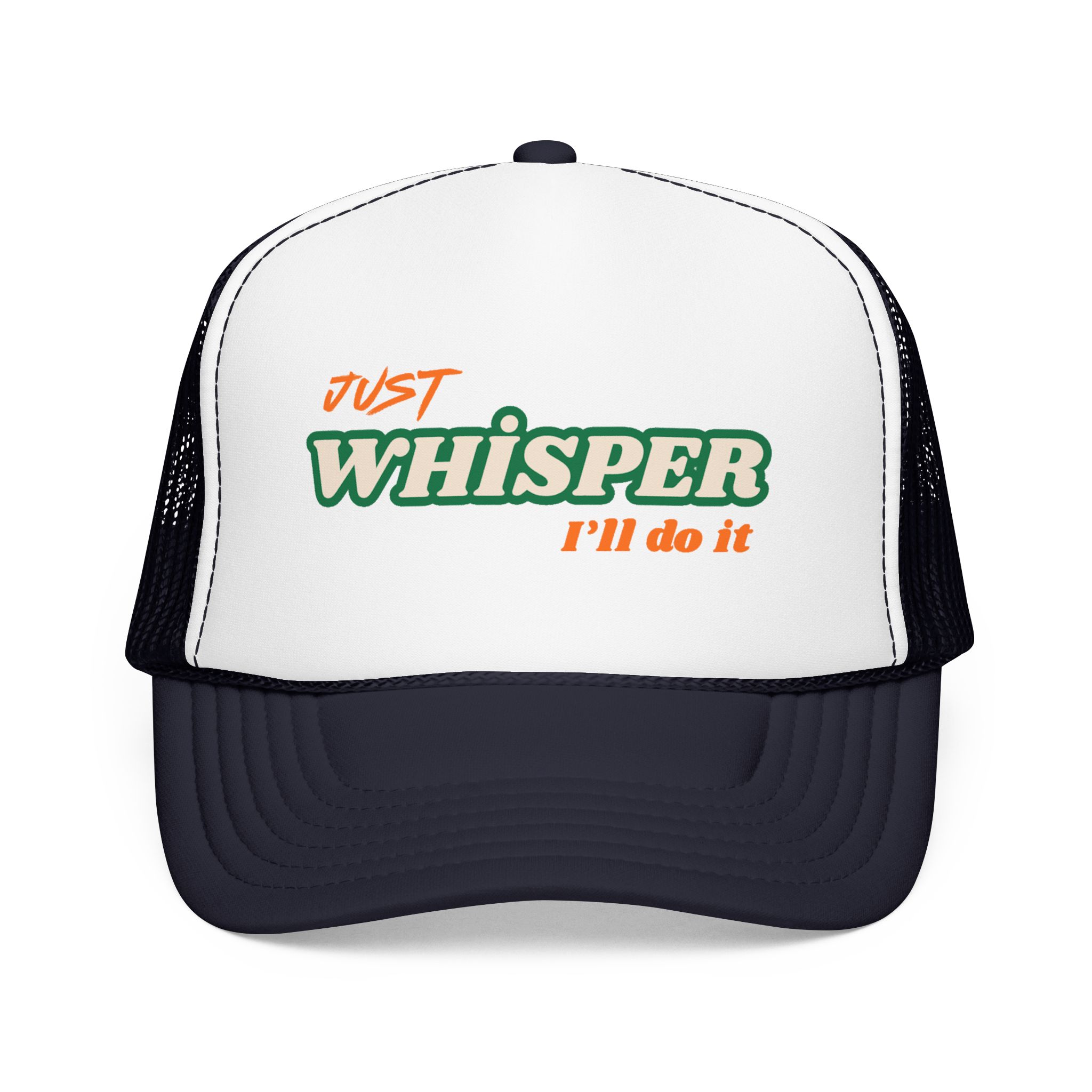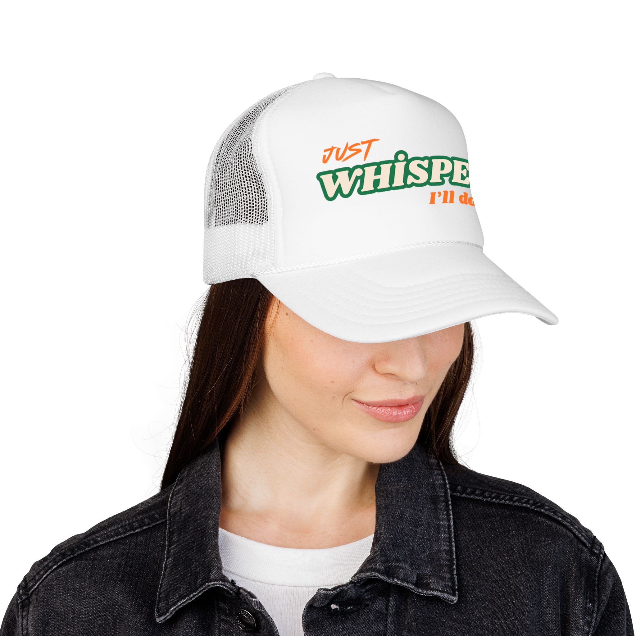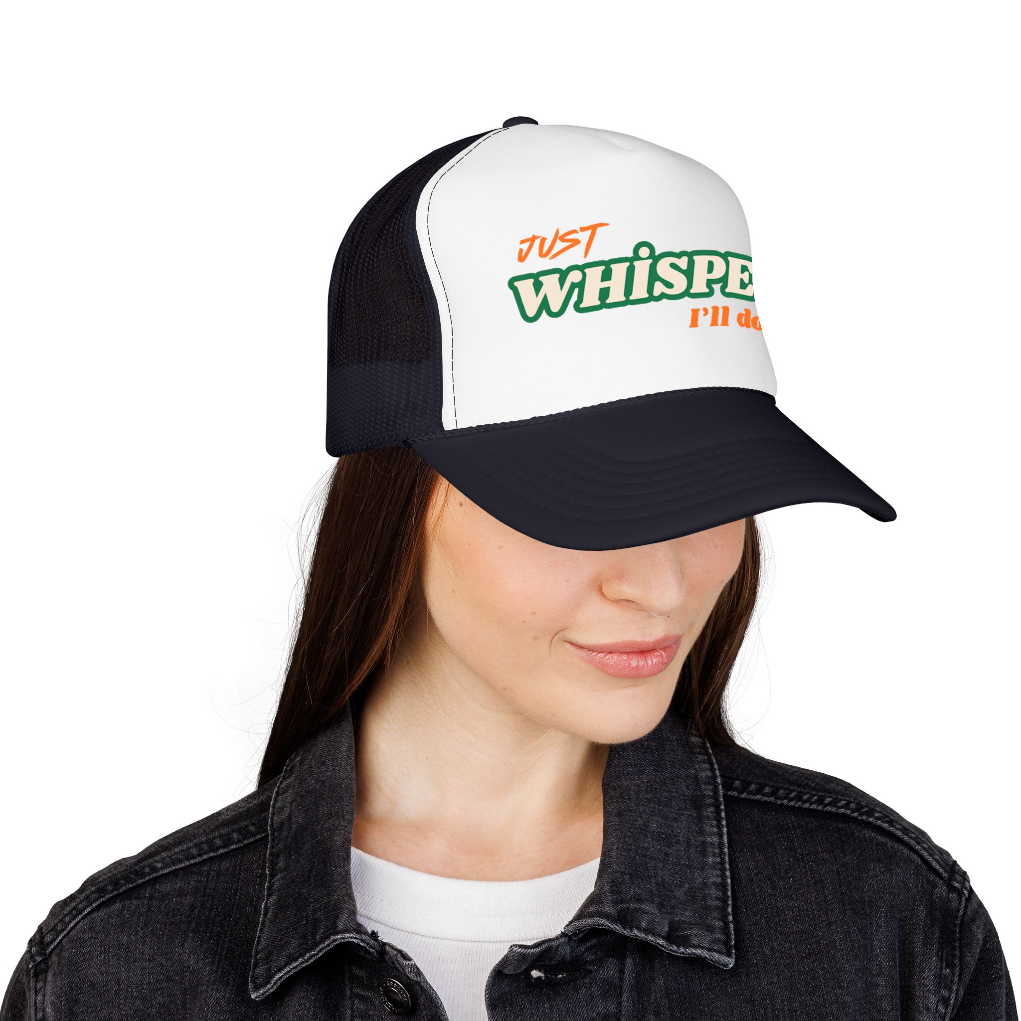 Just Whisper I’ll Do It foam trucker hat | Retro script logo, black mesh