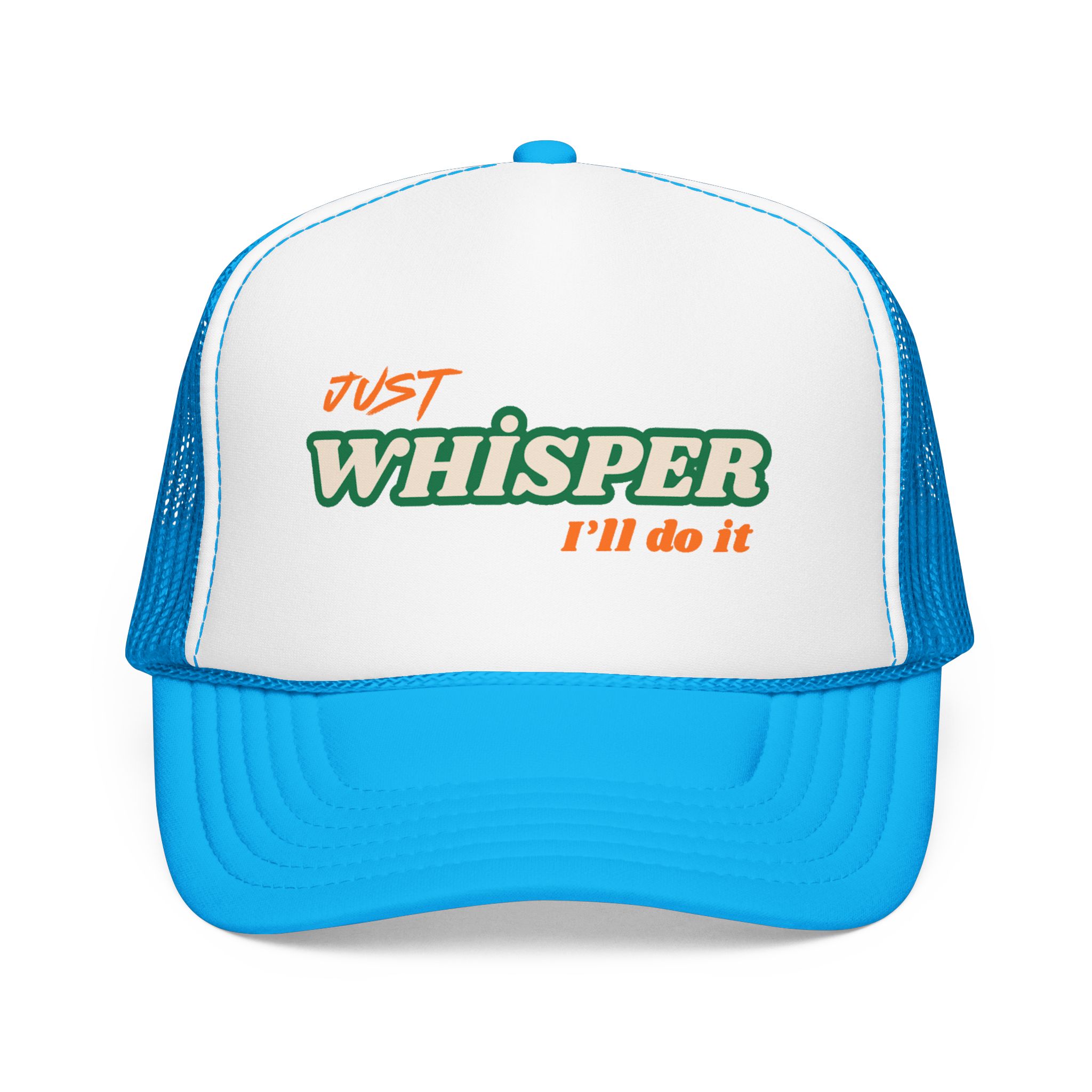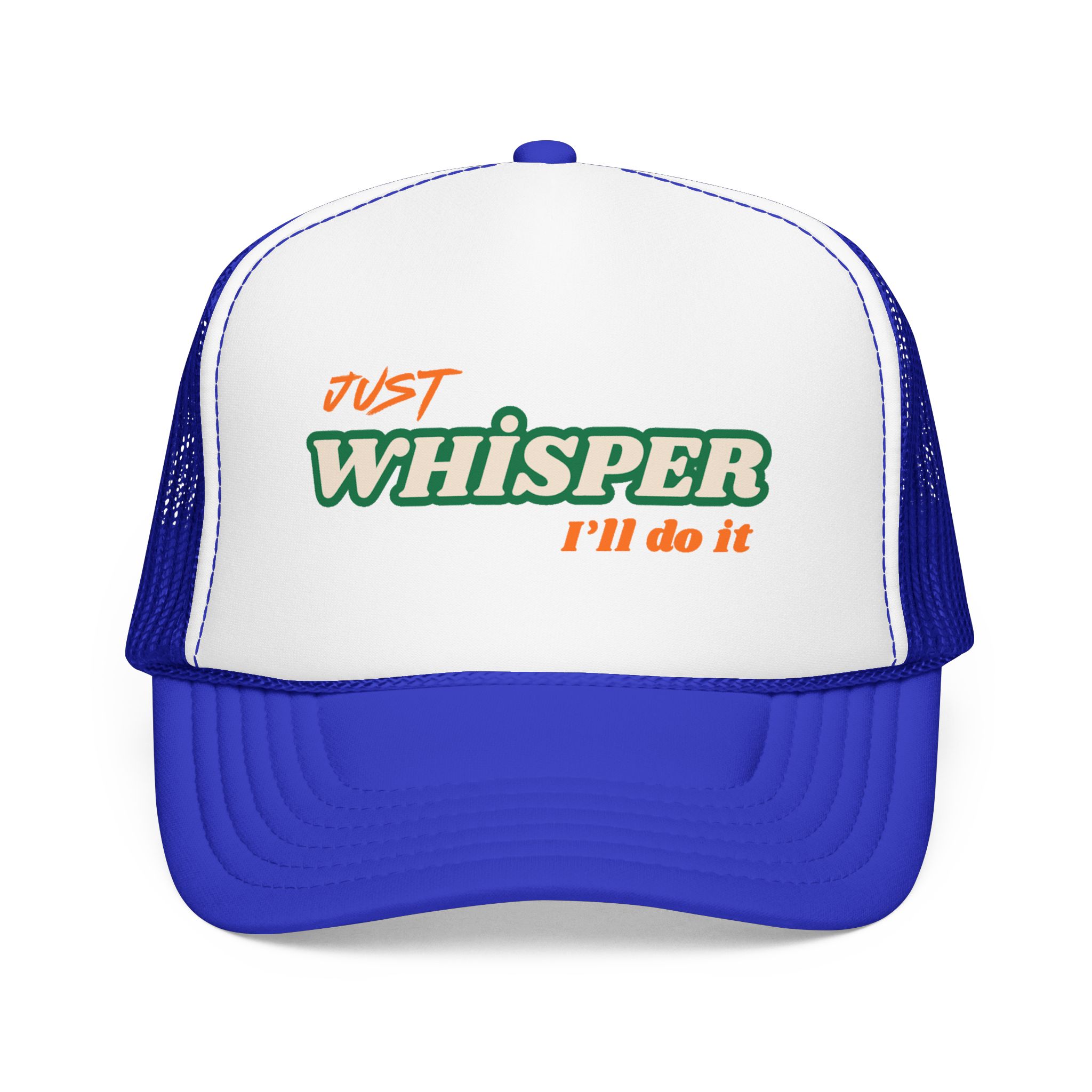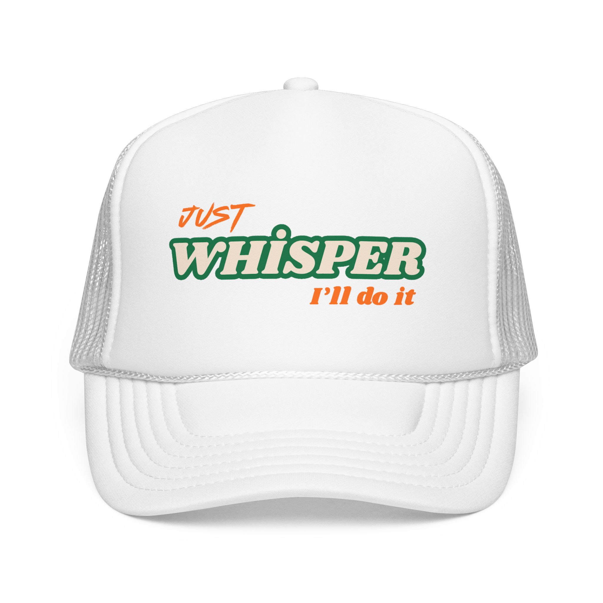 Just Whisper I’ll Do It foam trucker hat | Retro script logo, black mesh
