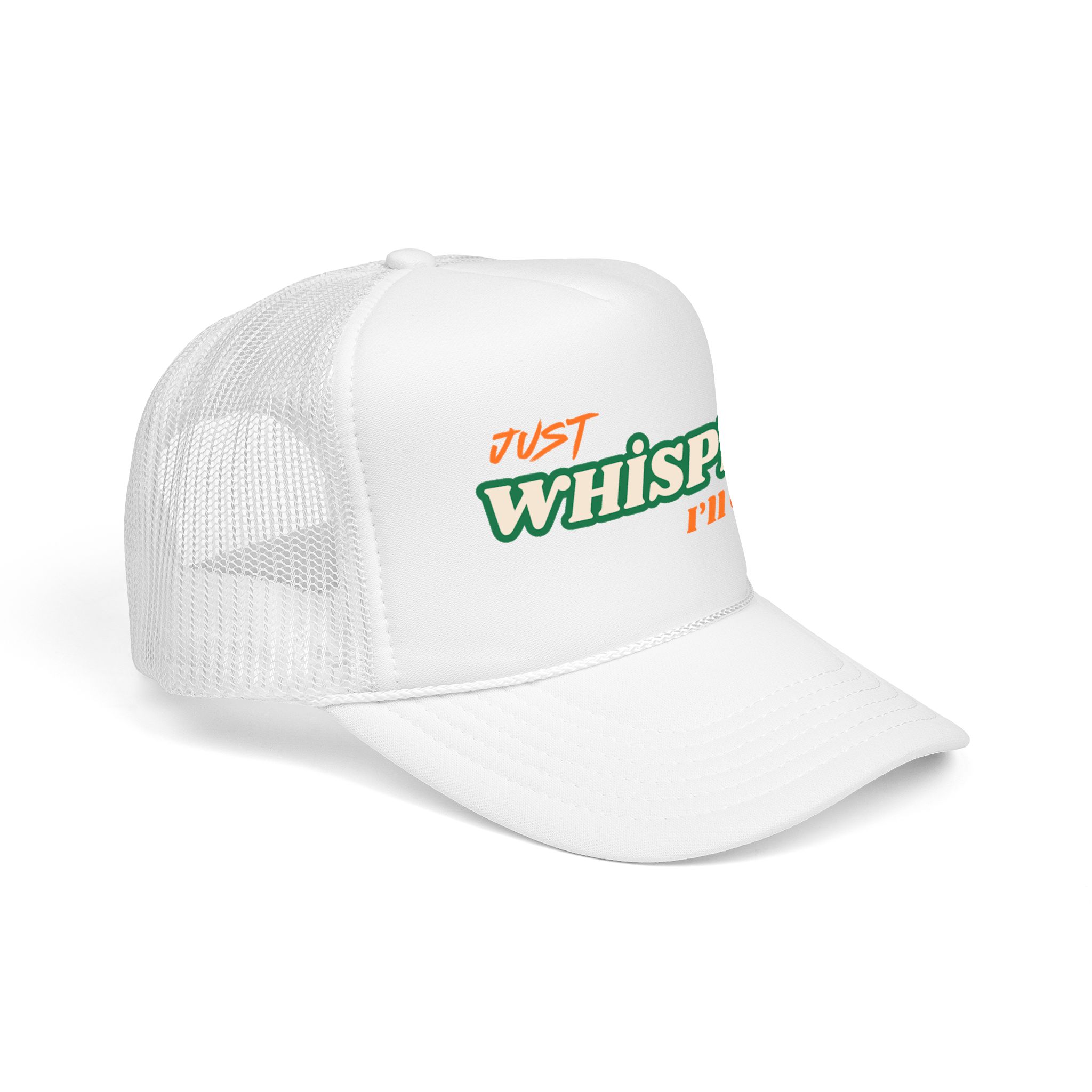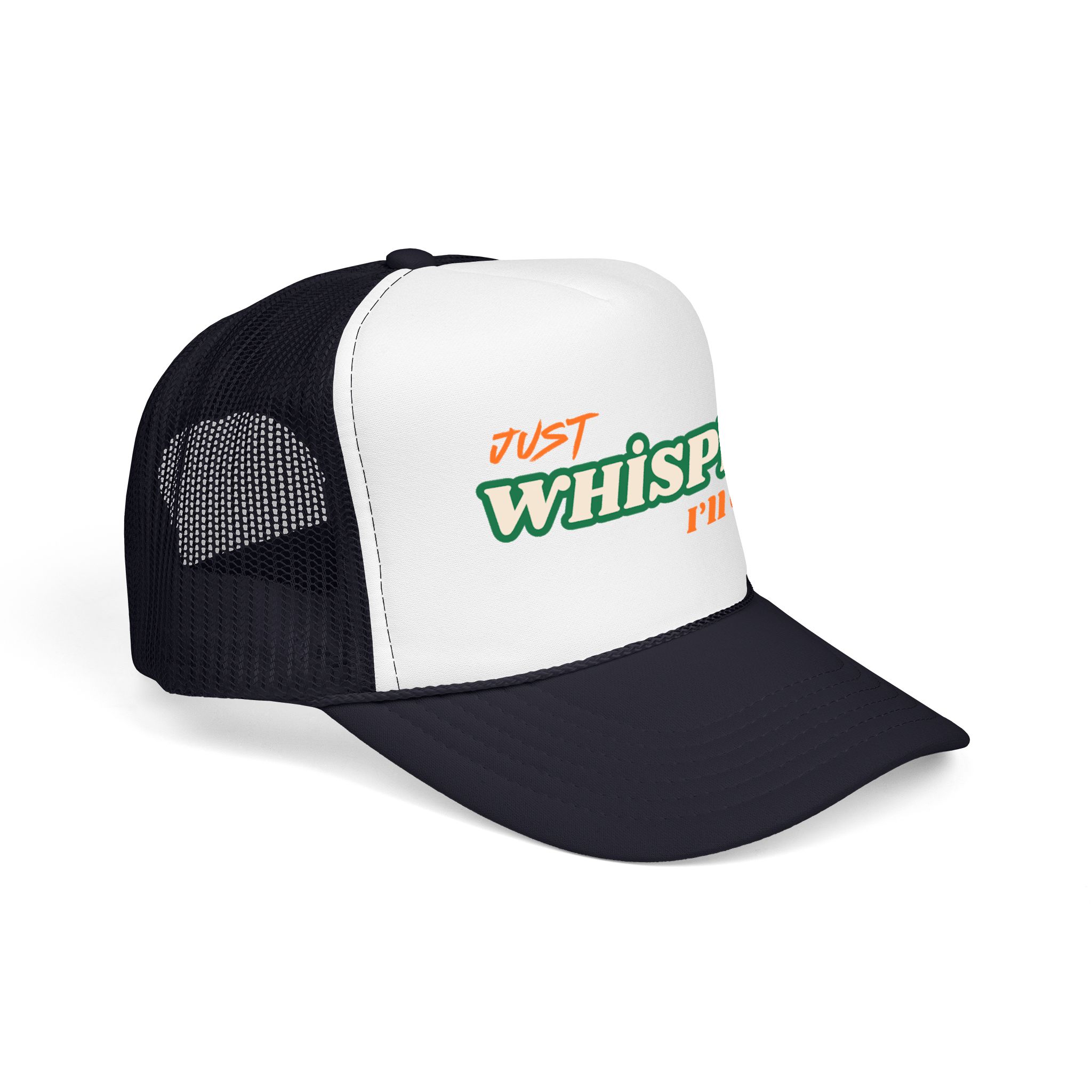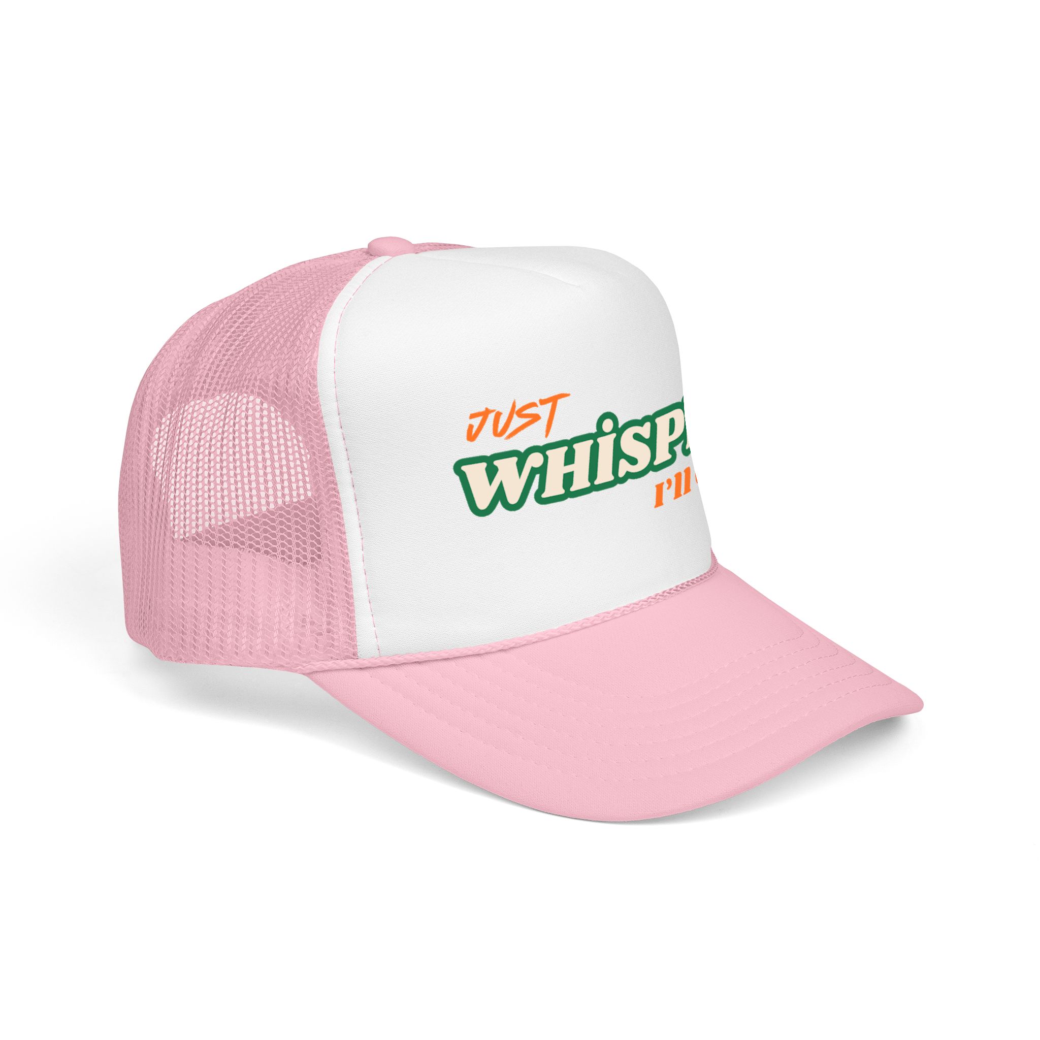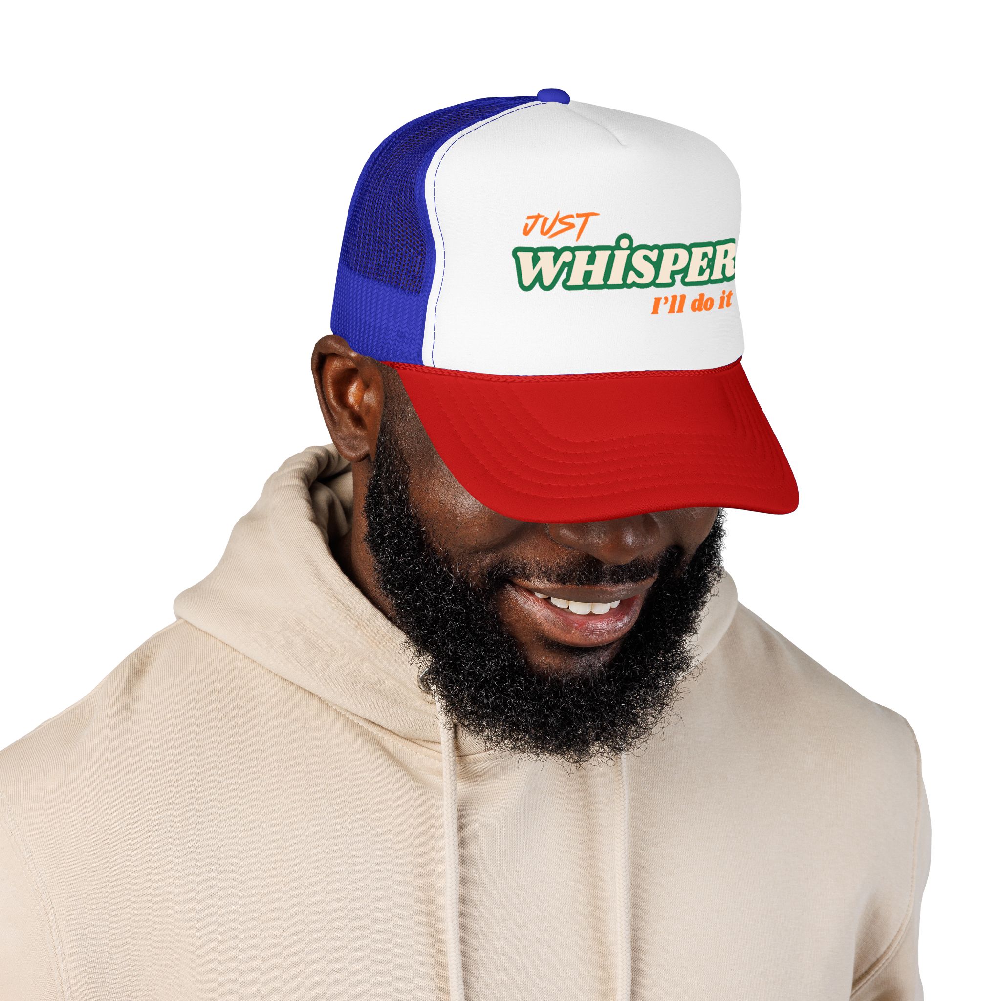 Just Whisper I’ll Do It foam trucker hat | Retro script logo, black mesh