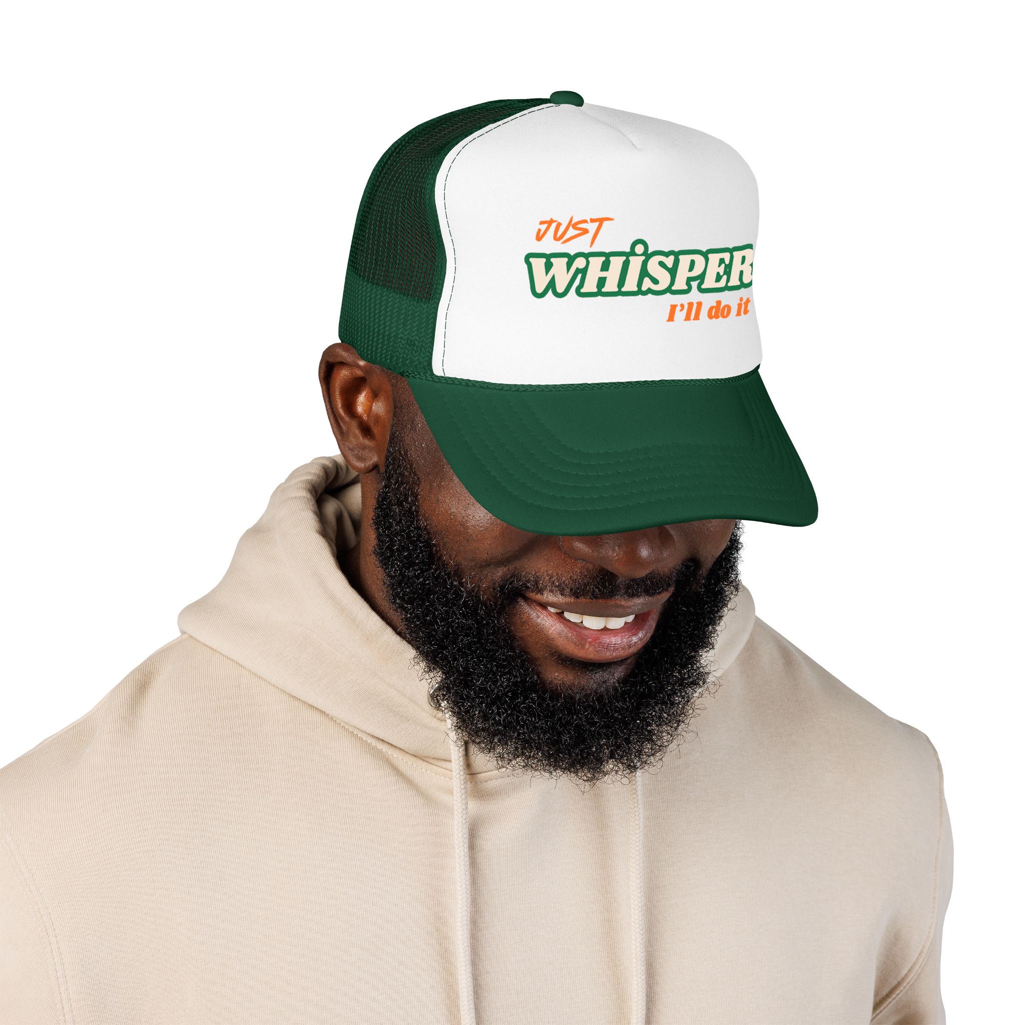 This foam trucker hat brings playful confidence to everyday wear. The smooth, seamless foam front showcases a bold, retro-inspired script: “Just Whisper I’ll do it,” in vibrant green and orange. A high-profile, structured crown keeps the message prominent, while the breathable mesh back and adjustable snap ensure comfort during long days on the move. It sits well with casual, outdoor, or road-trip outfits and adds a quirky, self-assured touch to someone who likes to keep their humor low-key but loud in style.