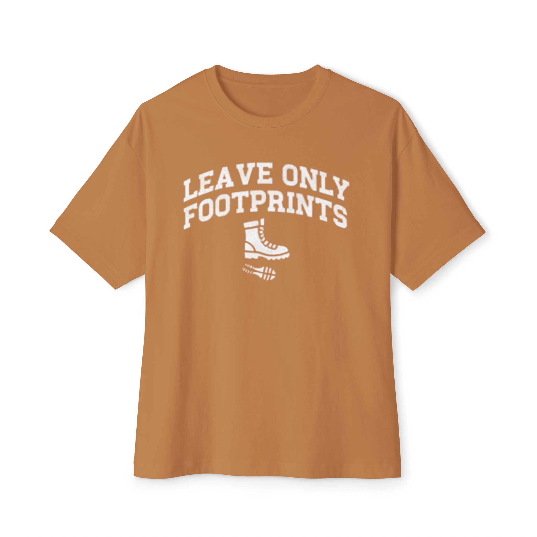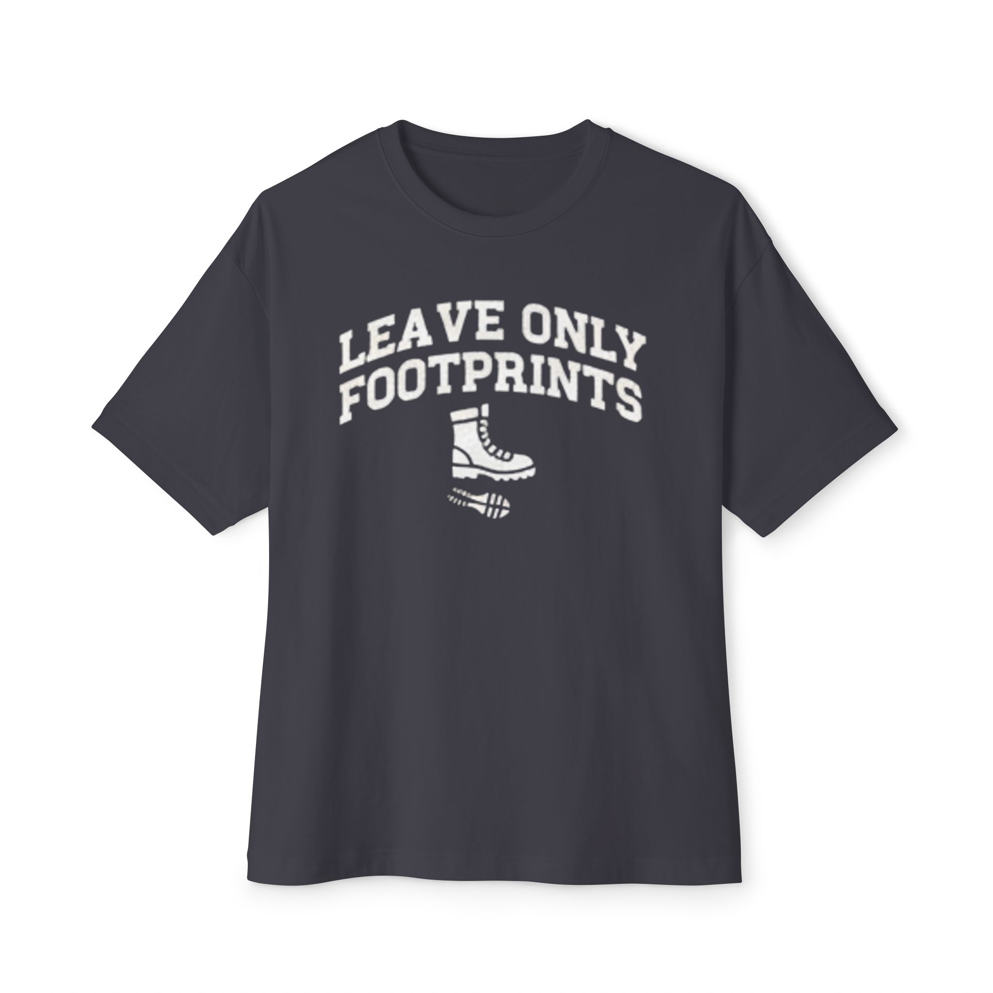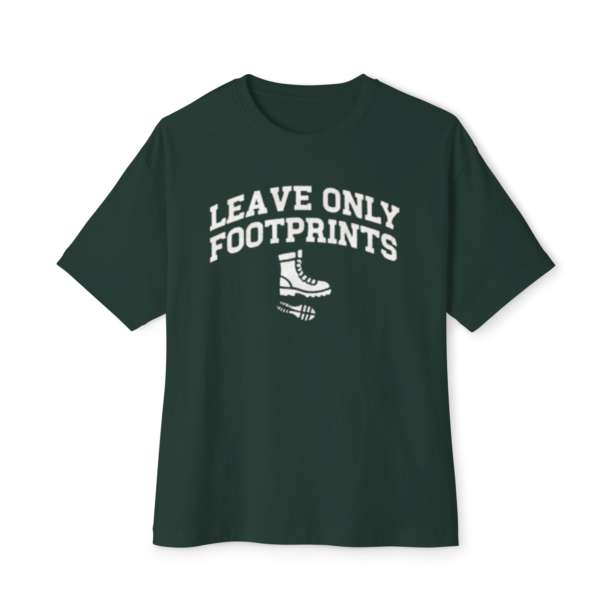 This oversized boxy tee carries a quiet outdoorsy statement: bold, hand-lettered text arches above a single hiking boot and sole mark — “LEAVE ONLY FOOTPRINTS.” It sits roomy on the shoulders, with a relaxed silhouette that layers easily over flannels or under light jackets. The medium-weight cotton feels broken-in but sturdy, and the tear-away label keeps the neckline comfortable during long walks. Wear it on trail mornings, campfire evenings, or around town when you want to share a simple ethic of low-impact adventure.