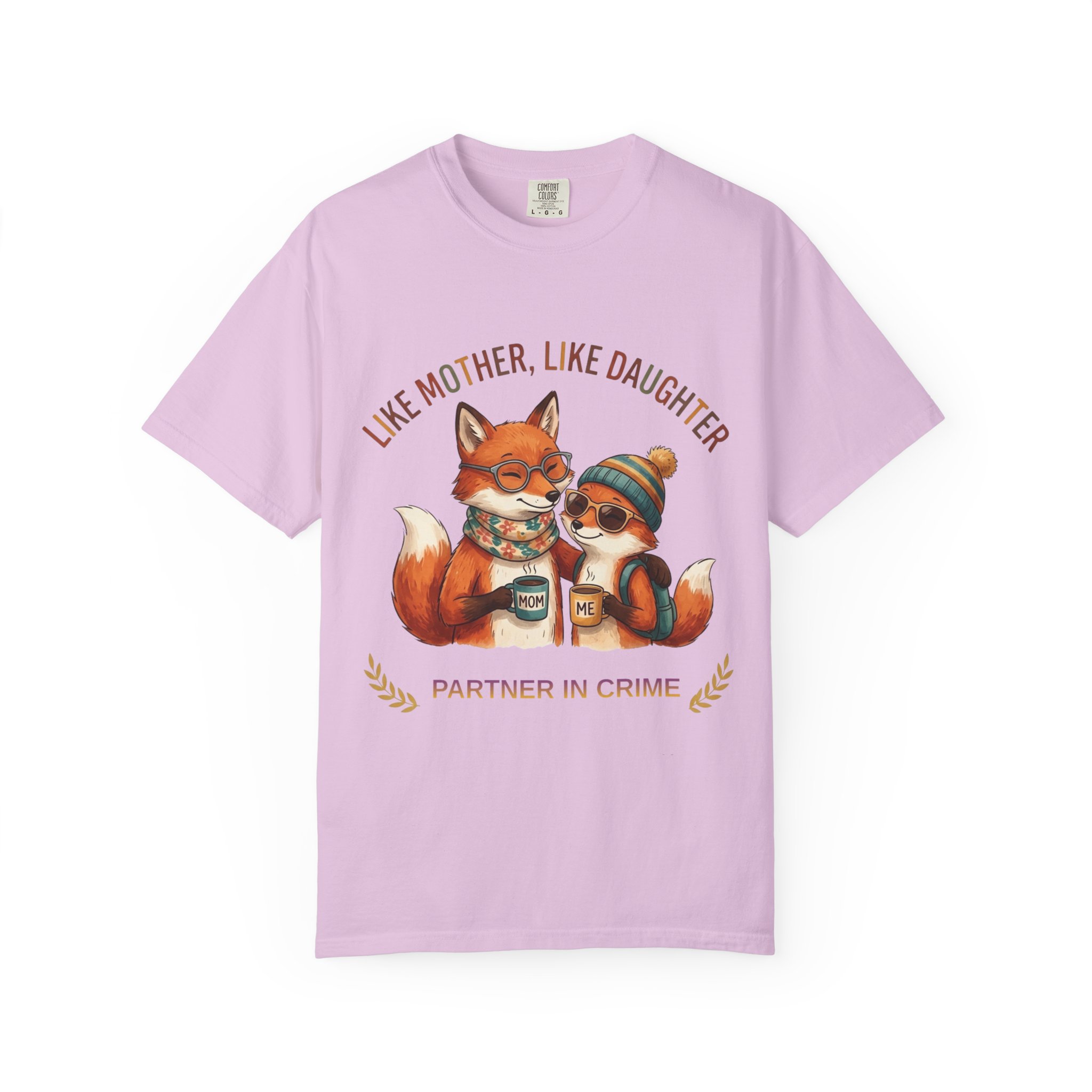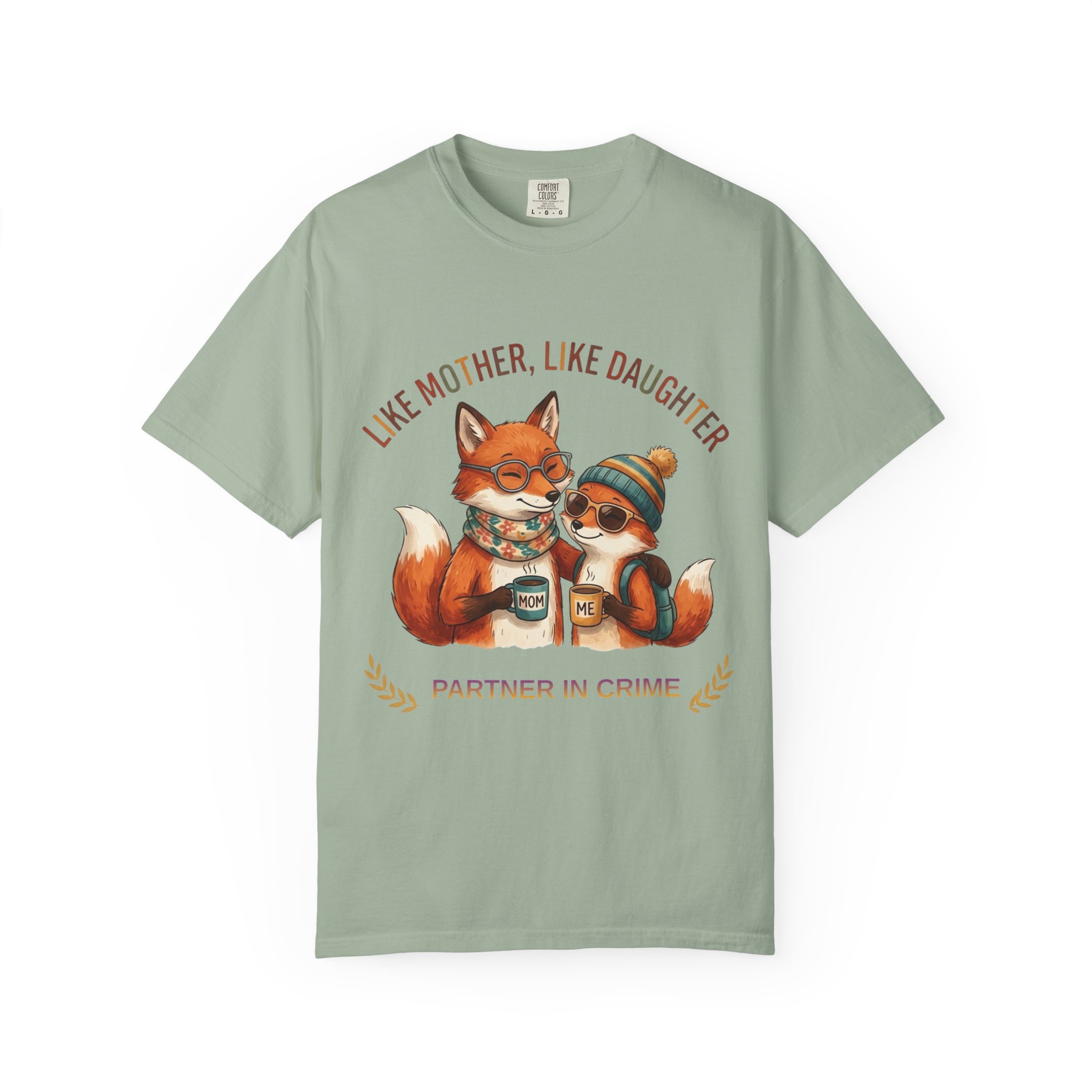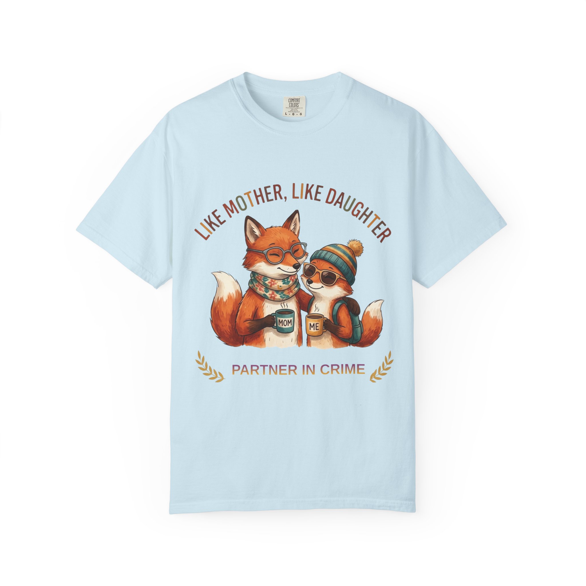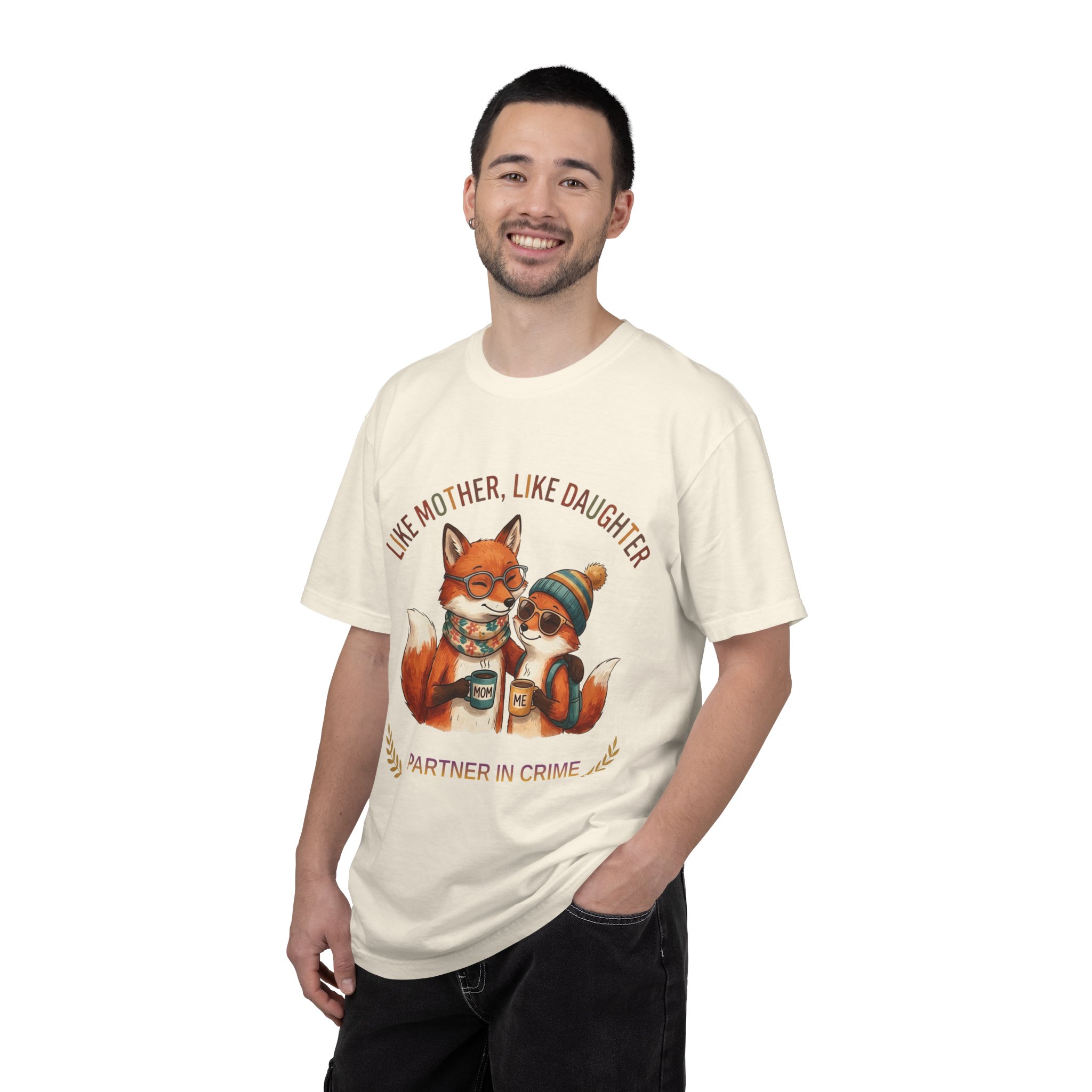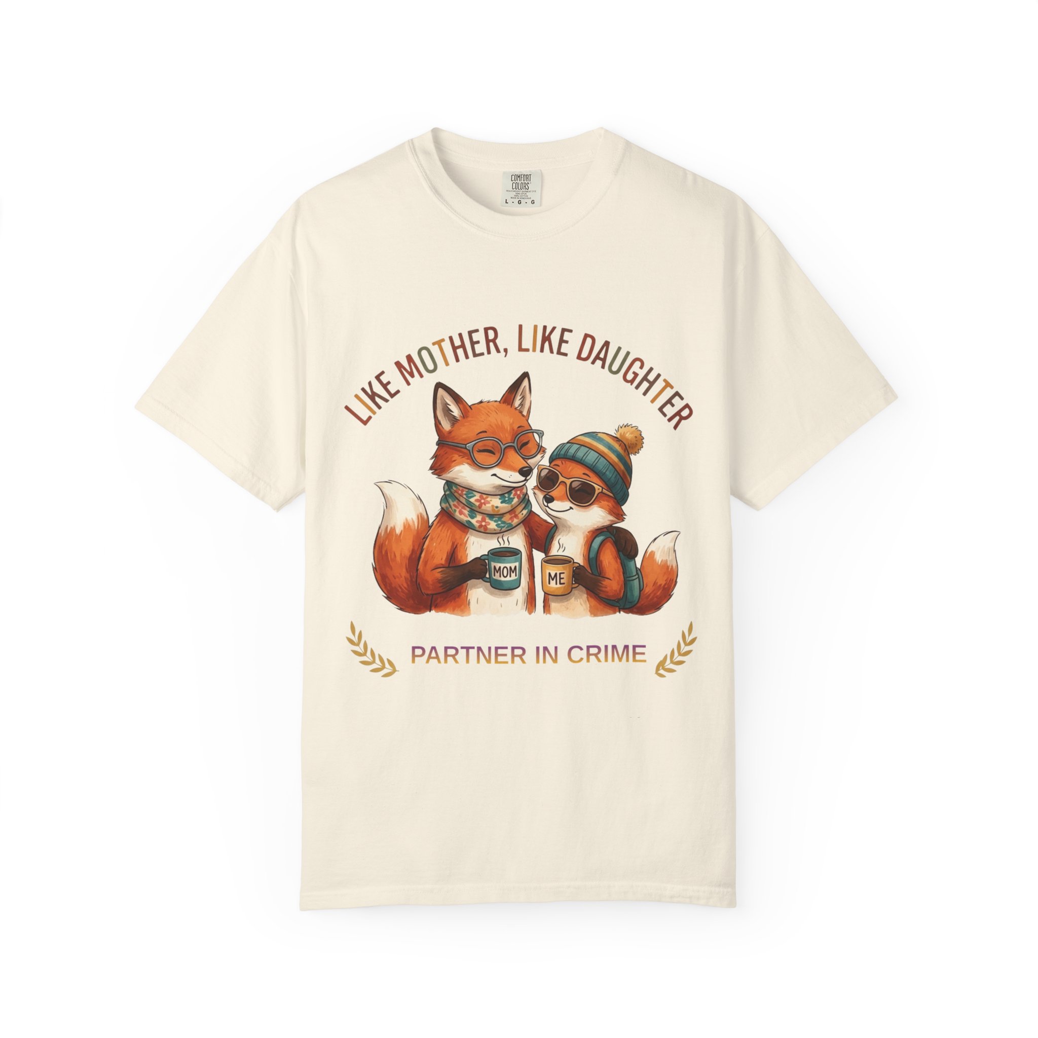 Slip into a soft, garment-dyed tee that feels lived-in from the first wear. This relaxed-fit shirt shows a warm illustration of a fox pair—mother and child—cuddled with little winter hats and scarves, captioned “Like Mother, Like Daughter” and “Partner in Crime.” It reads like a quiet, cozy moment: strolls through crunchy leaves, shared hot cocoa, and inside jokes that only the two of you laugh at. The heavyweight, tubular-knit fabric and garment-dyed finish give the design a gentle, vintage palette and a comforting hand. Sized from S to 4XL and available in many hues, it layers easily under jackets or stands alone on cool mornings during family outings, holiday visits, or casual days at home.