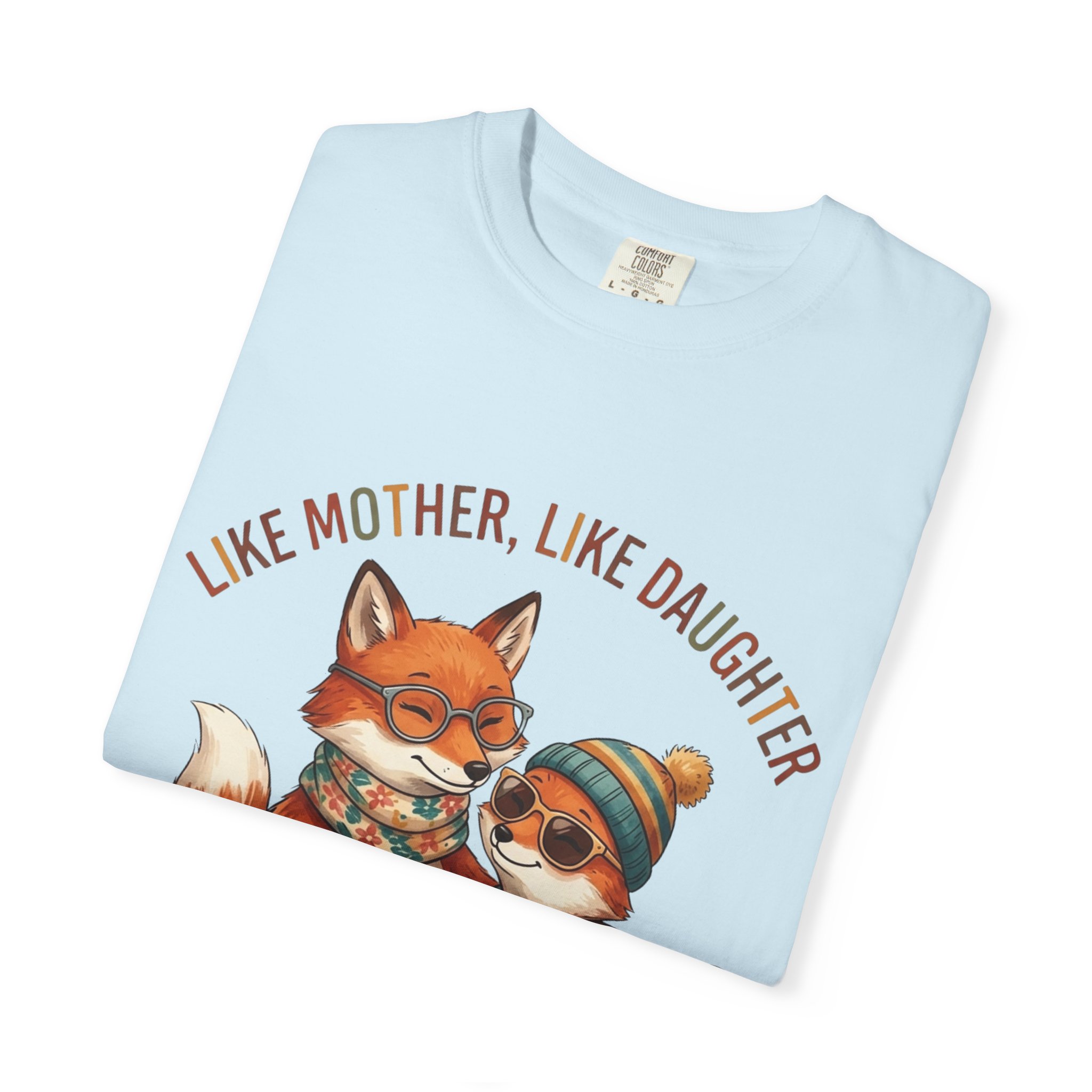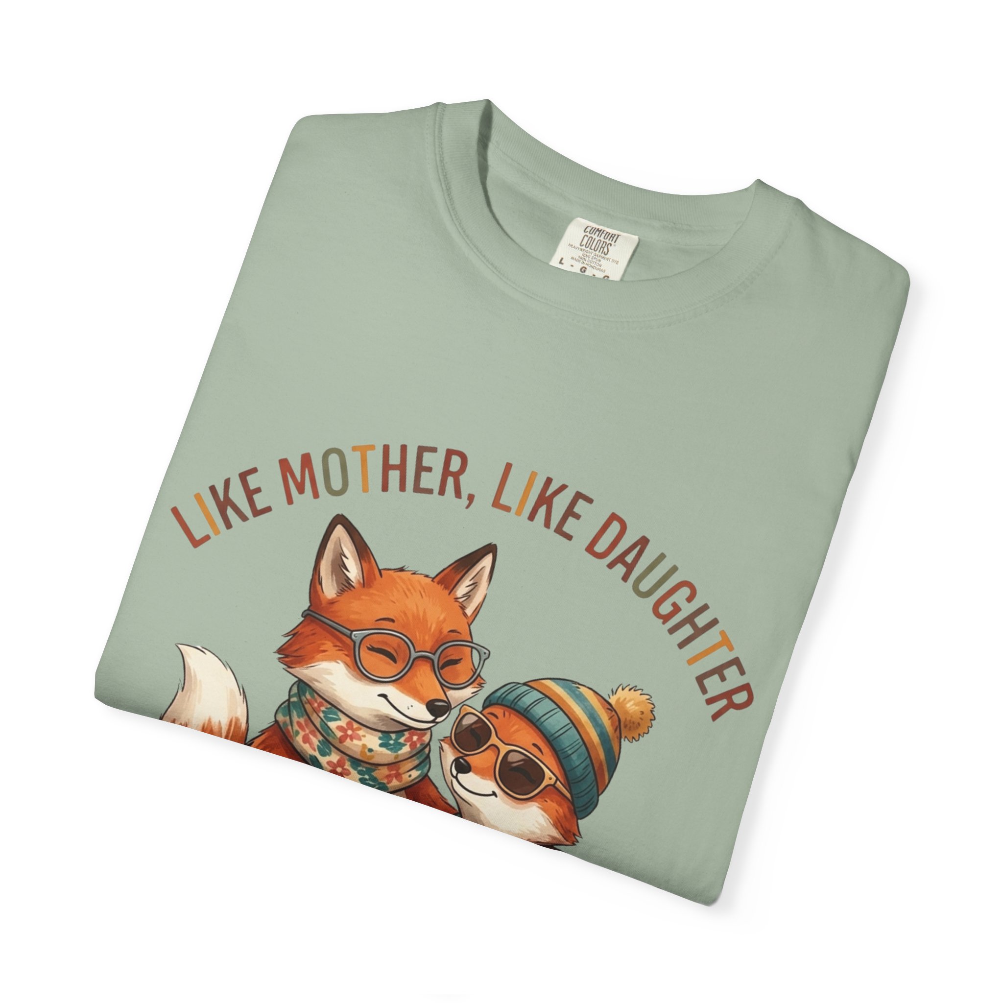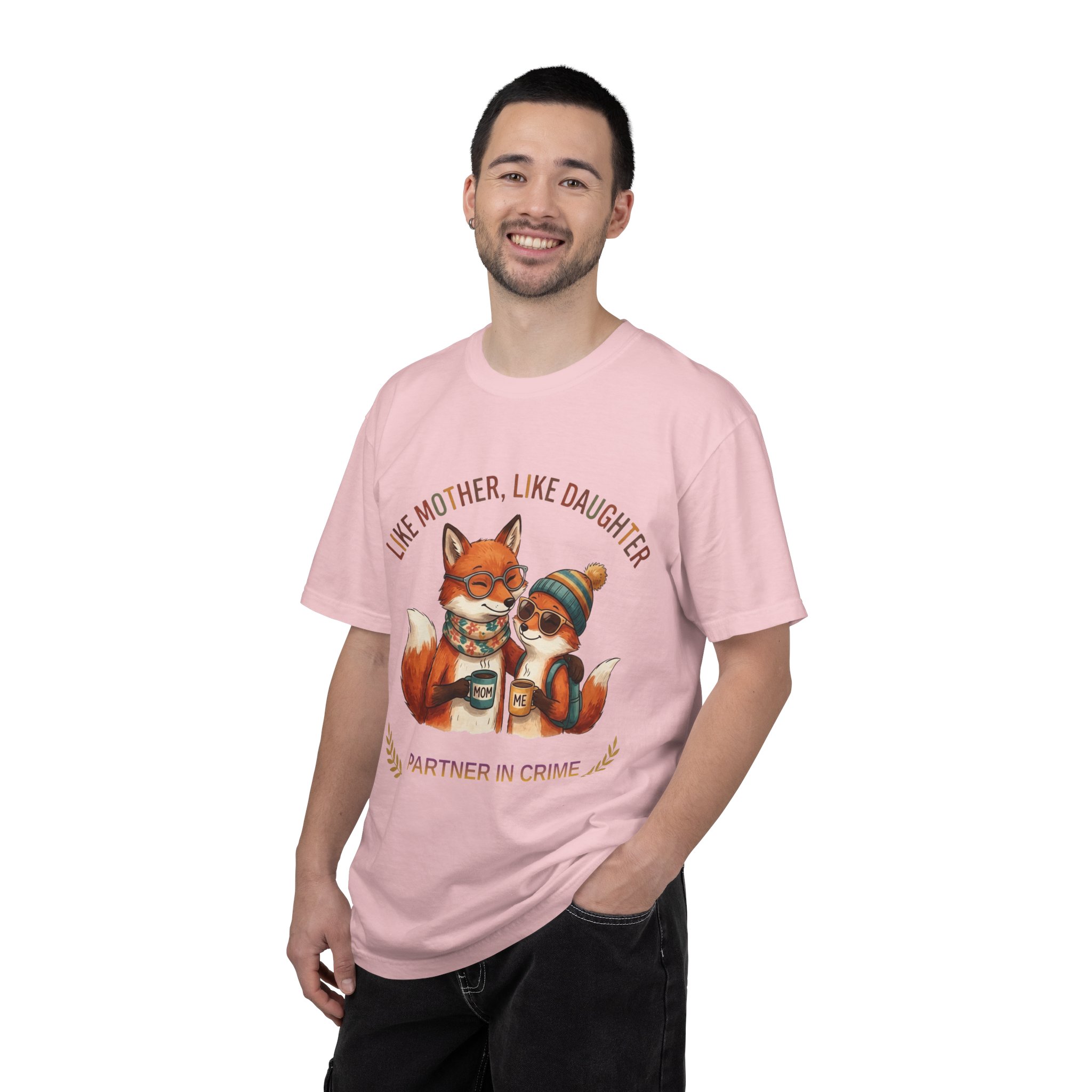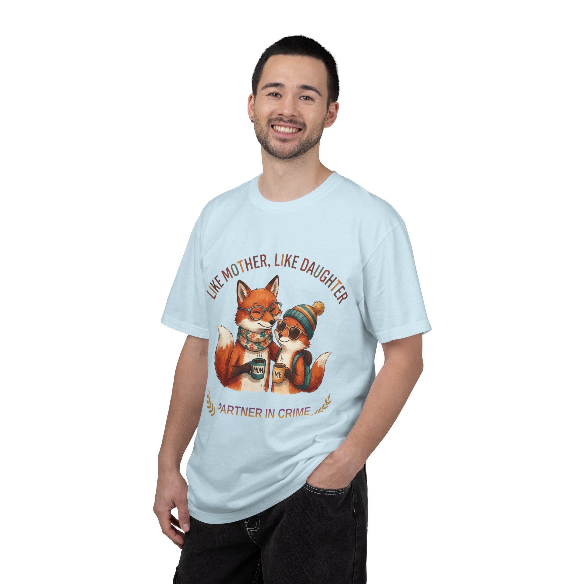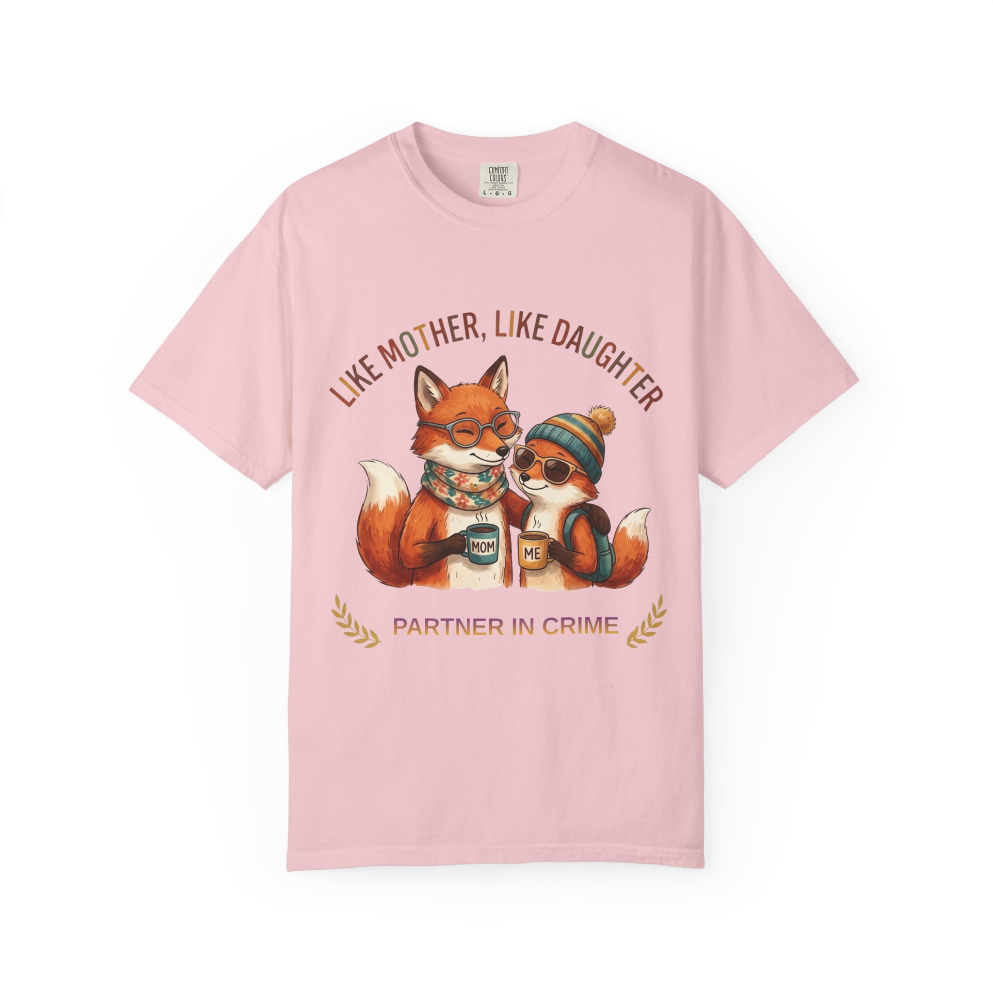 Slip into a soft, garment-dyed tee that feels lived-in from the first wear. This relaxed-fit shirt shows a warm illustration of a fox pair—mother and child—cuddled with little winter hats and scarves, captioned “Like Mother, Like Daughter” and “Partner in Crime.” It reads like a quiet, cozy moment: strolls through crunchy leaves, shared hot cocoa, and inside jokes that only the two of you laugh at. The heavyweight, tubular-knit fabric and garment-dyed finish give the design a gentle, vintage palette and a comforting hand. Sized from S to 4XL and available in many hues, it layers easily under jackets or stands alone on cool mornings during family outings, holiday visits, or casual days at home.