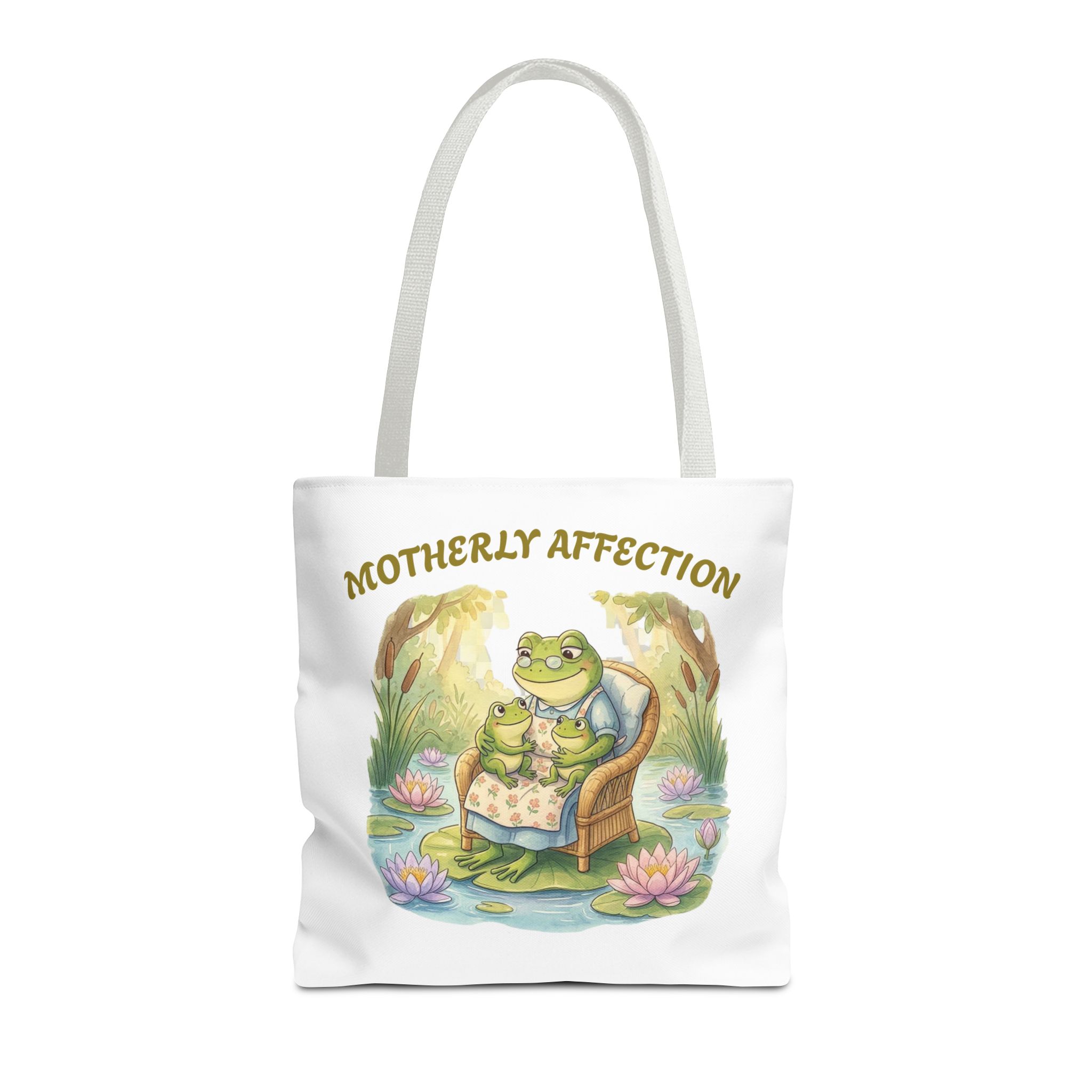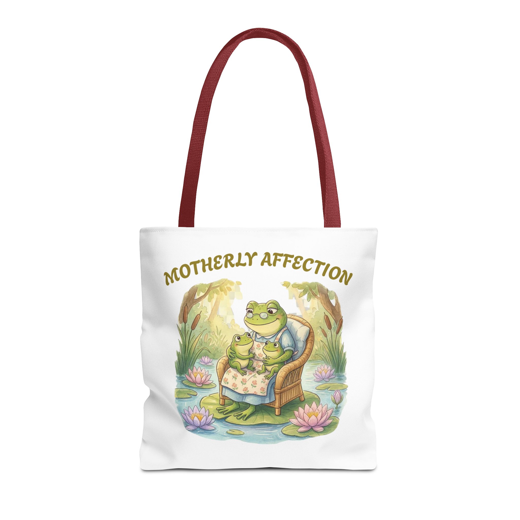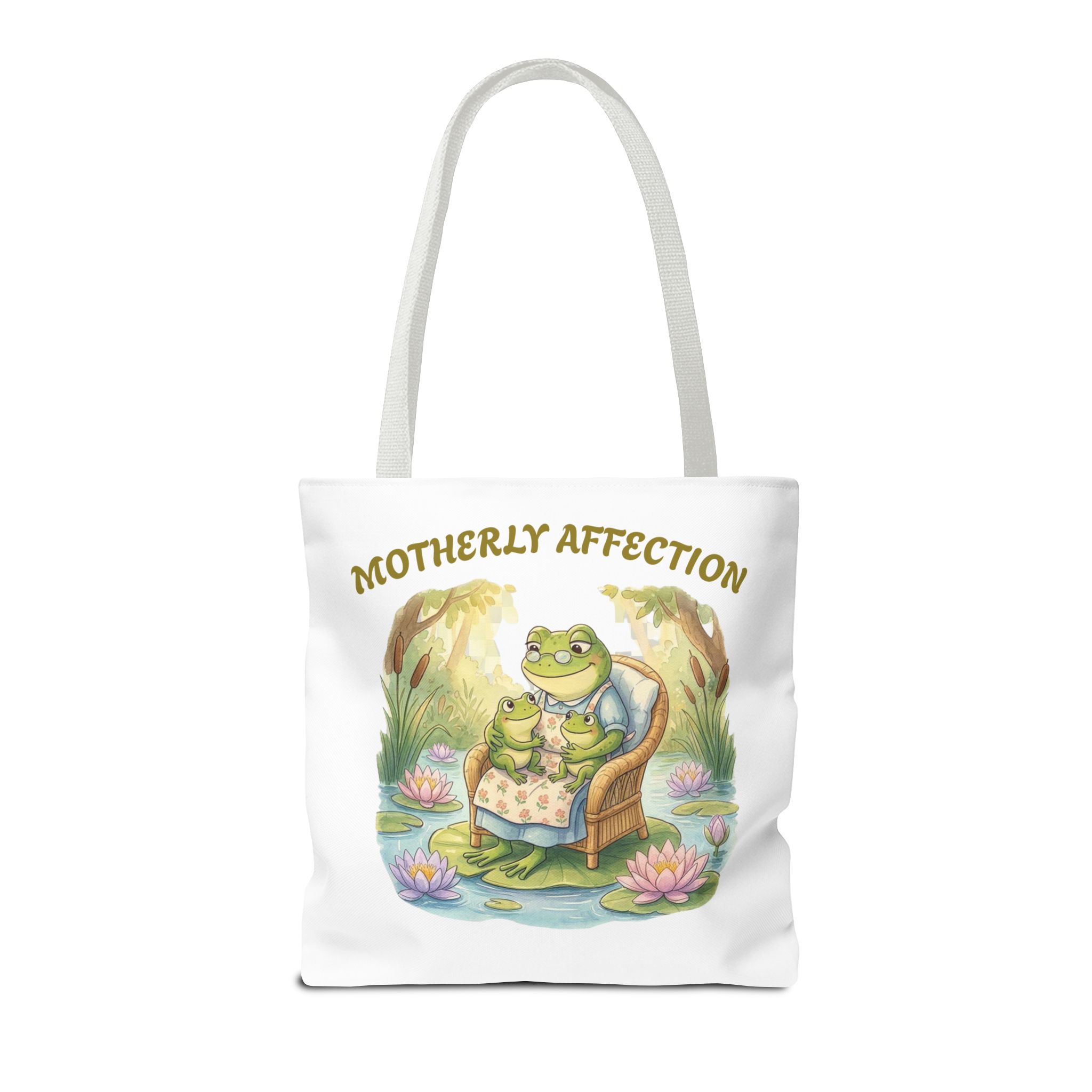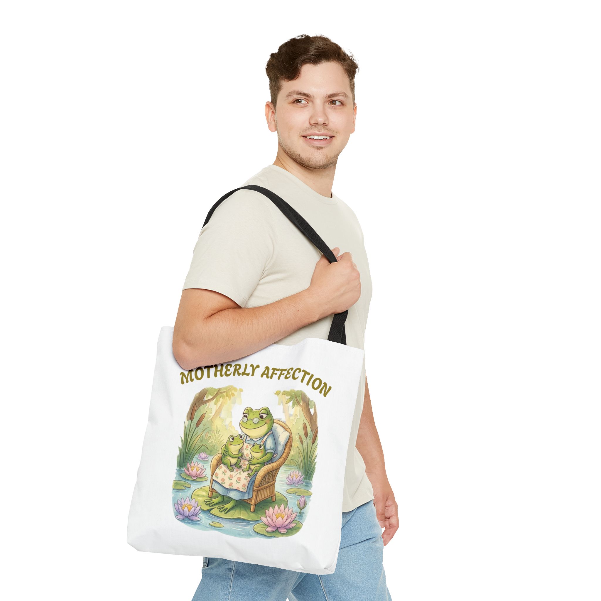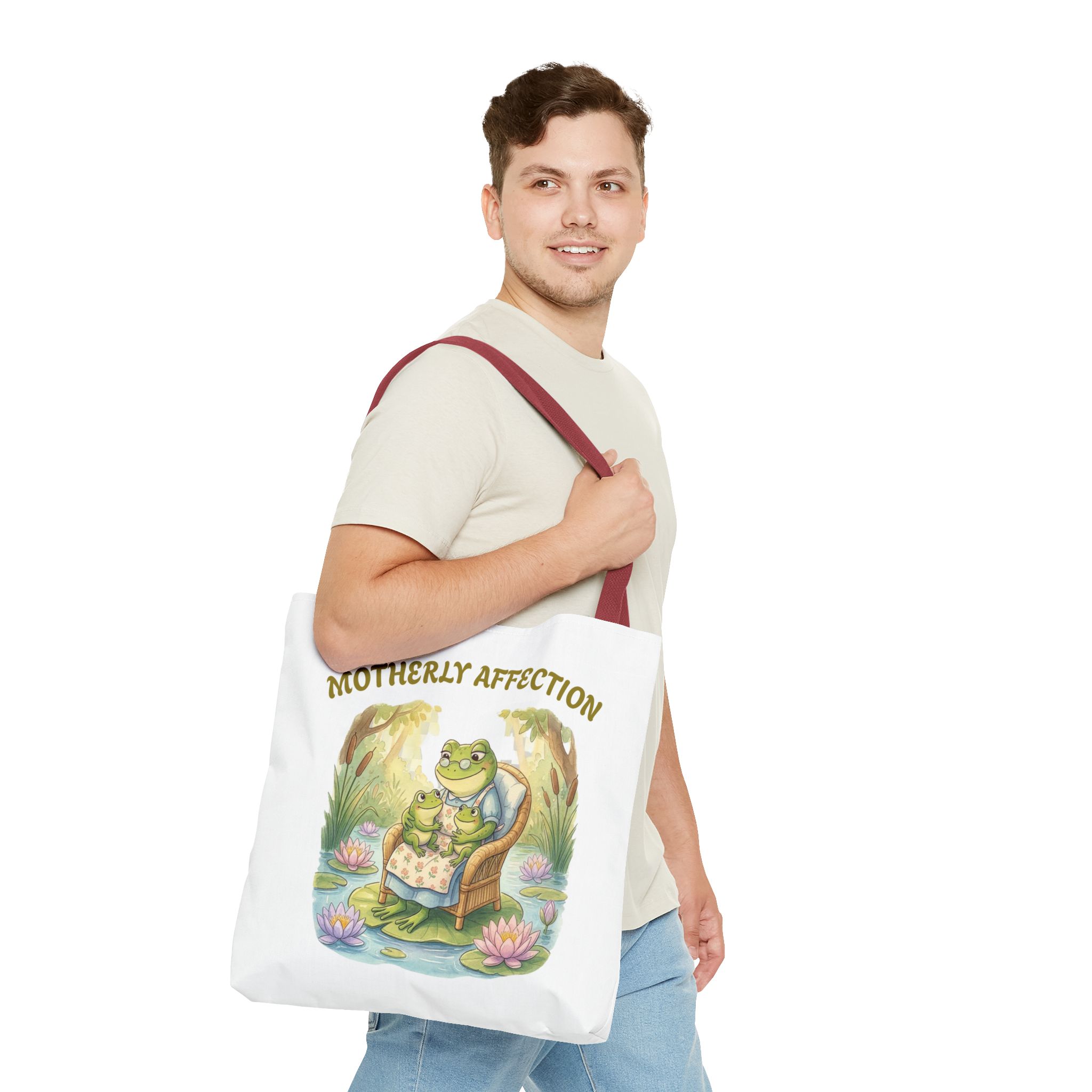 Soft, whimsical charm wrapped in everyday utility. This roomy polyester tote carries groceries, library books, or knitting projects with gentle style thanks to its boxed corners and reinforced handles. The artwork shows a cozy frog mother cradling her little one amid lily pads and warm sunlight — a quiet scene that brings calm and a smile each time you sling the bag over your shoulder. Lightweight, quick-drying fabric and a laminated interior keep contents protected, while the choice of handle colors lets you match your mood. Bring a touch of tender, cottage-core sweetness to errands, markets, and slow mornings by the water.