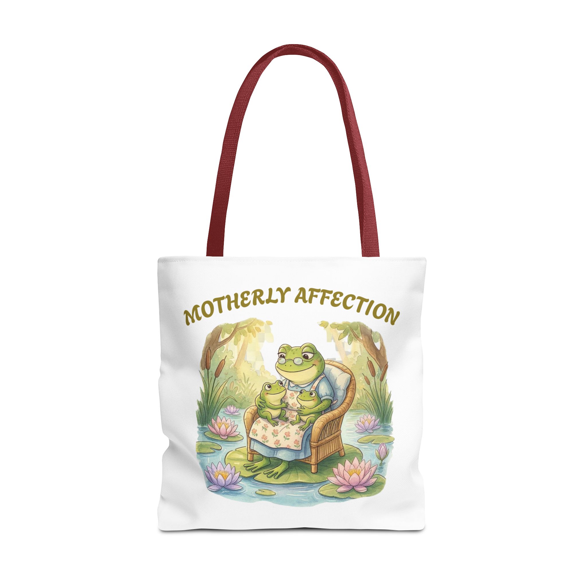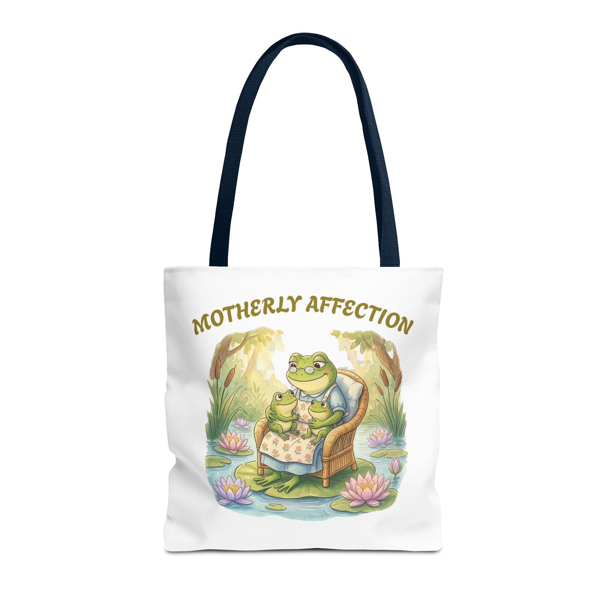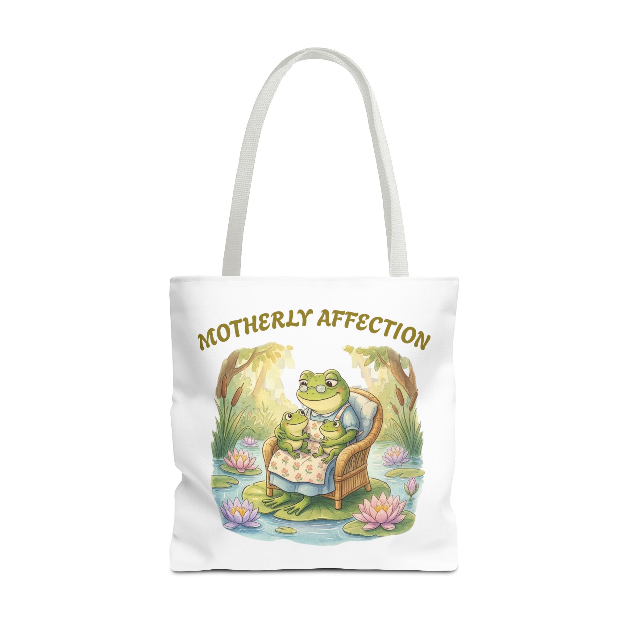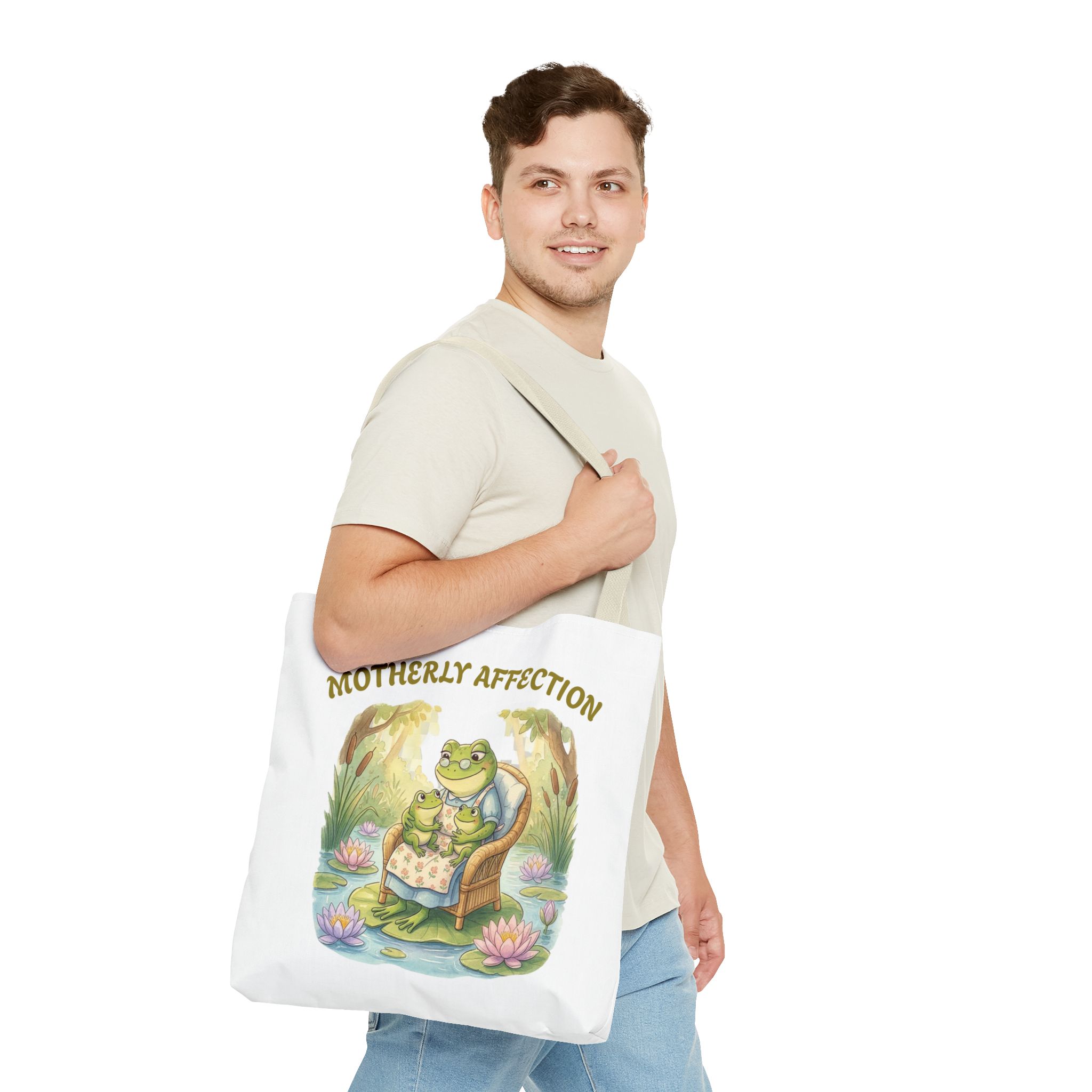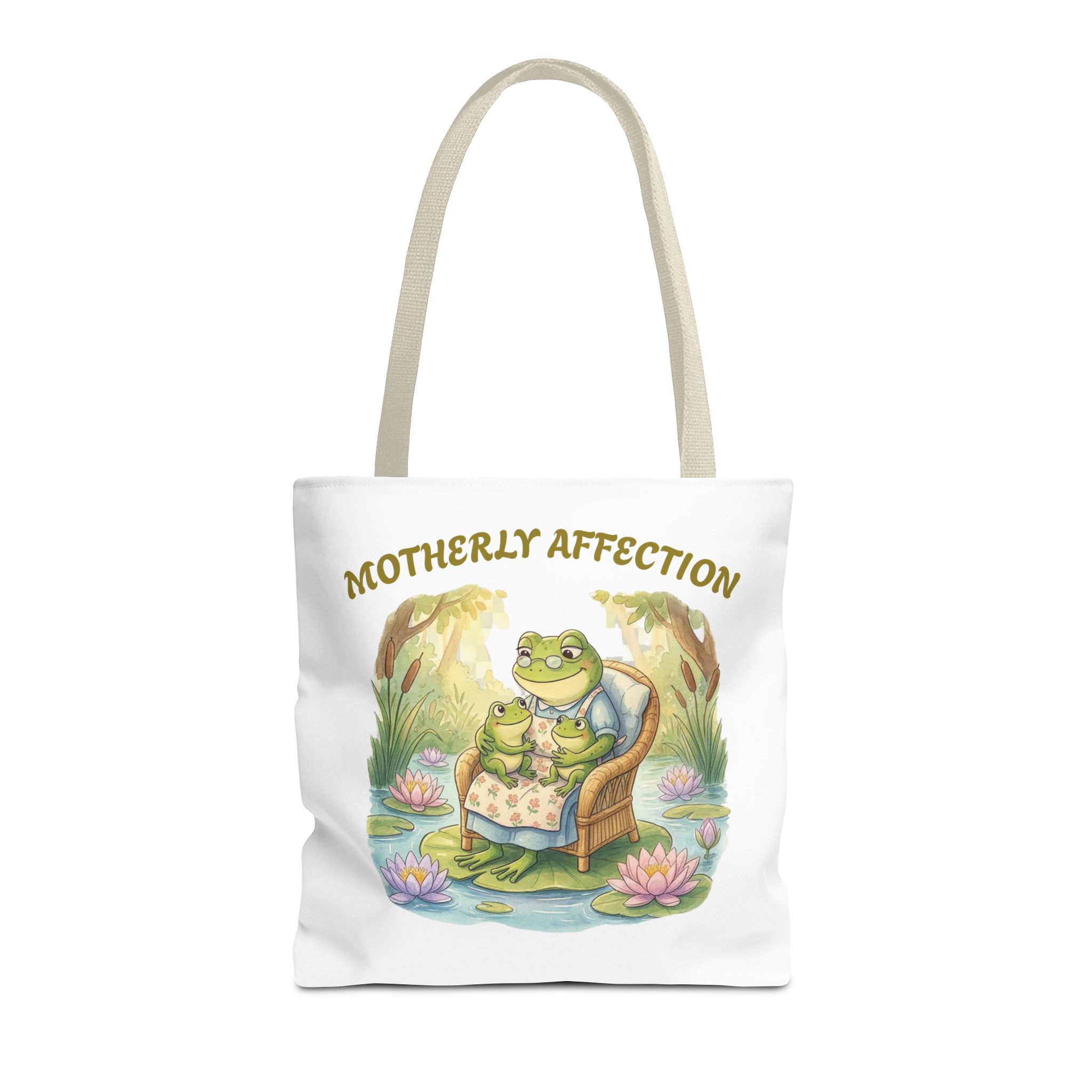 Soft, whimsical charm wrapped in everyday utility. This roomy polyester tote carries groceries, library books, or knitting projects with gentle style thanks to its boxed corners and reinforced handles. The artwork shows a cozy frog mother cradling her little one amid lily pads and warm sunlight — a quiet scene that brings calm and a smile each time you sling the bag over your shoulder. Lightweight, quick-drying fabric and a laminated interior keep contents protected, while the choice of handle colors lets you match your mood. Bring a touch of tender, cottage-core sweetness to errands, markets, and slow mornings by the water.
