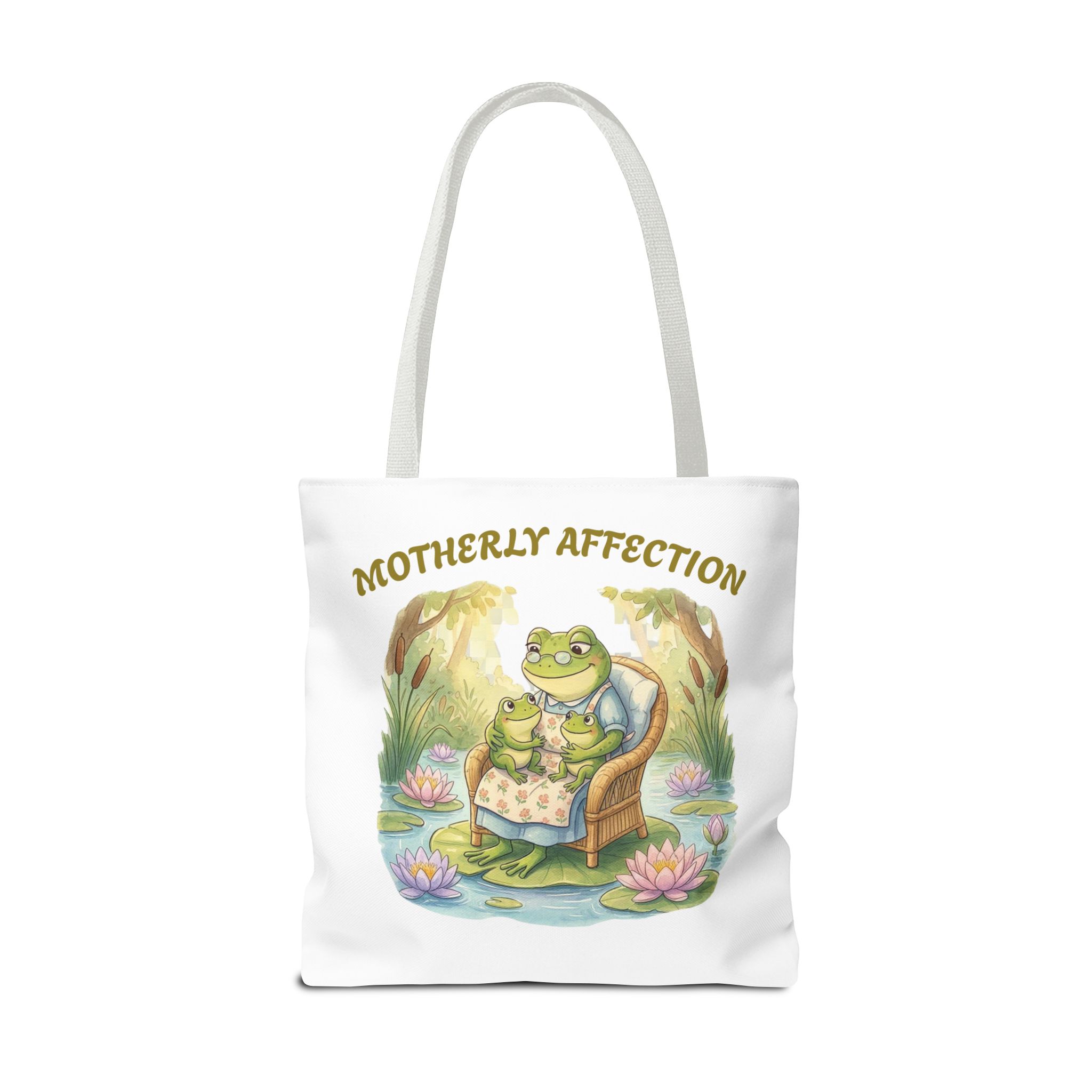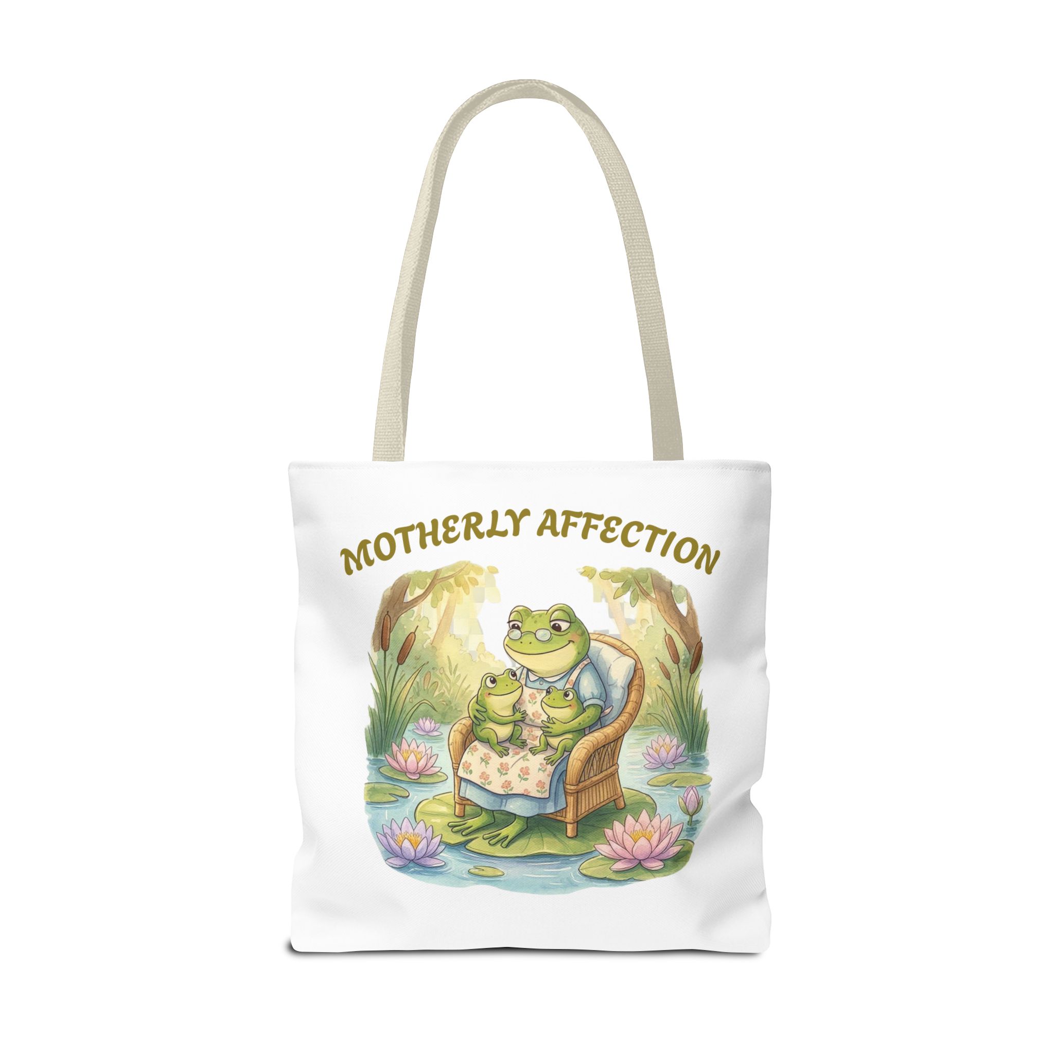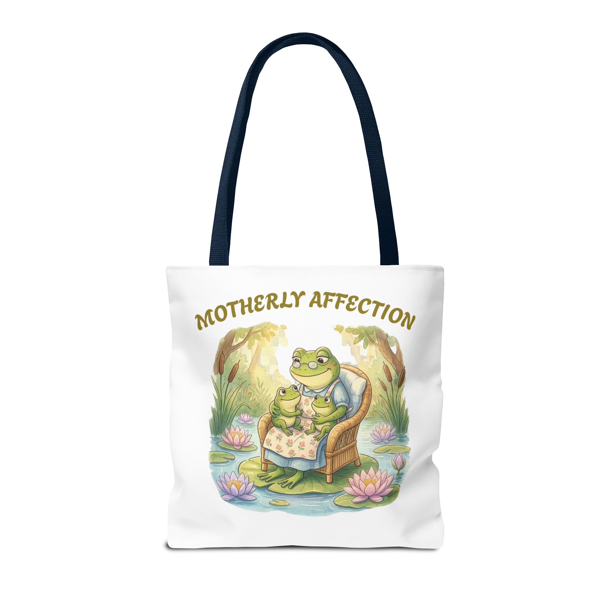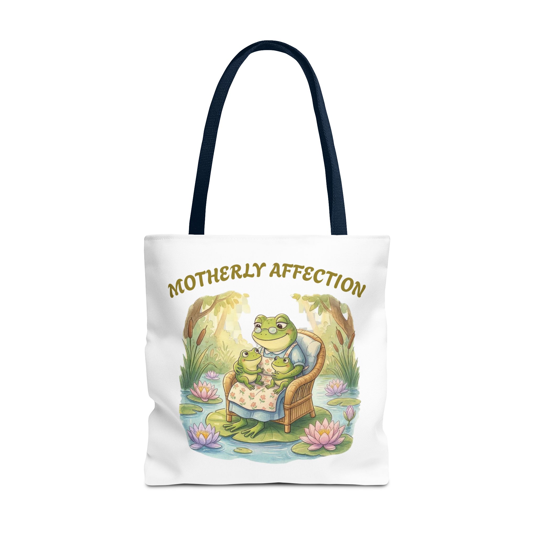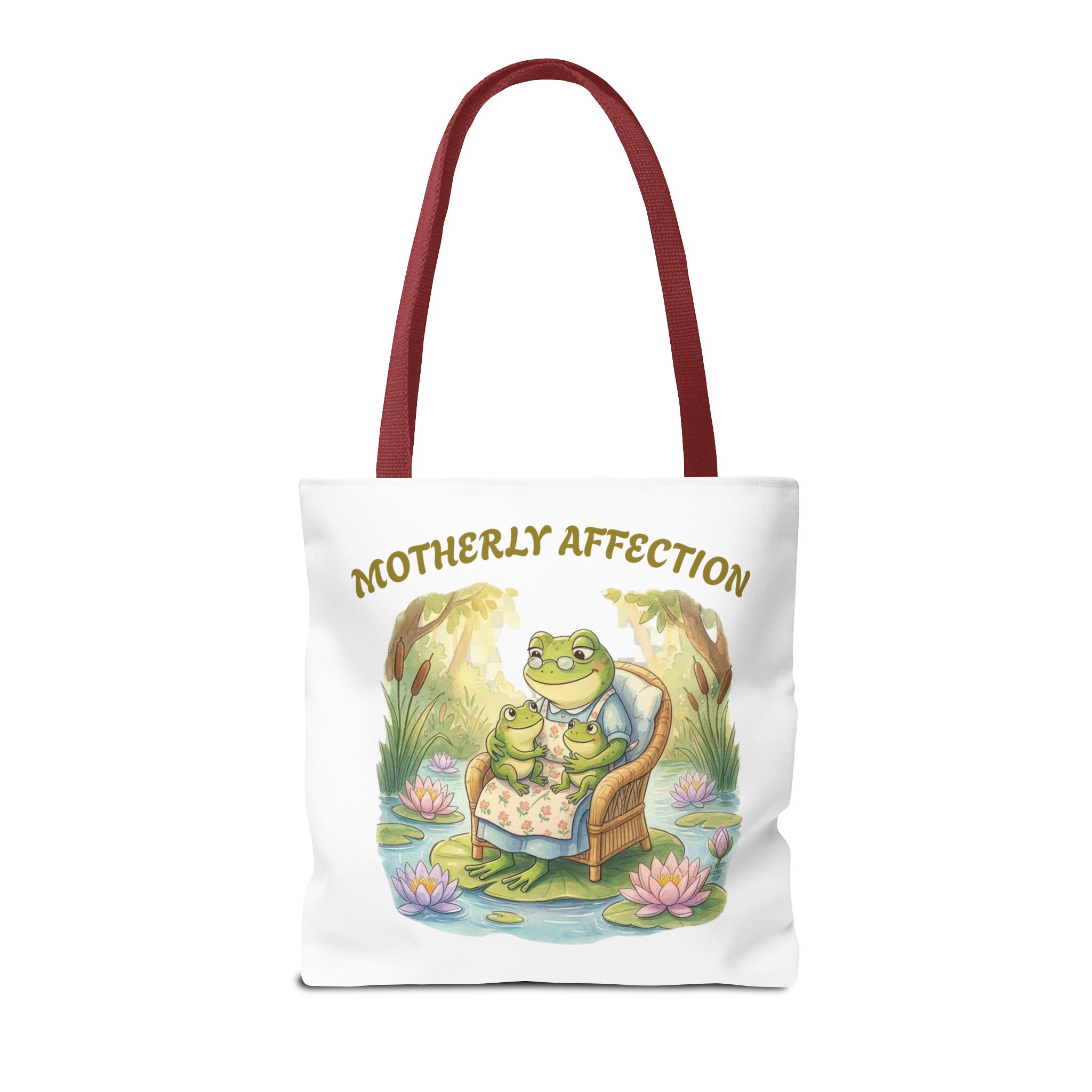 Soft, whimsical charm wrapped in everyday utility. This roomy polyester tote carries groceries, library books, or knitting projects with gentle style thanks to its boxed corners and reinforced handles. The artwork shows a cozy frog mother cradling her little one amid lily pads and warm sunlight — a quiet scene that brings calm and a smile each time you sling the bag over your shoulder. Lightweight, quick-drying fabric and a laminated interior keep contents protected, while the choice of handle colors lets you match your mood. Bring a touch of tender, cottage-core sweetness to errands, markets, and slow mornings by the water.