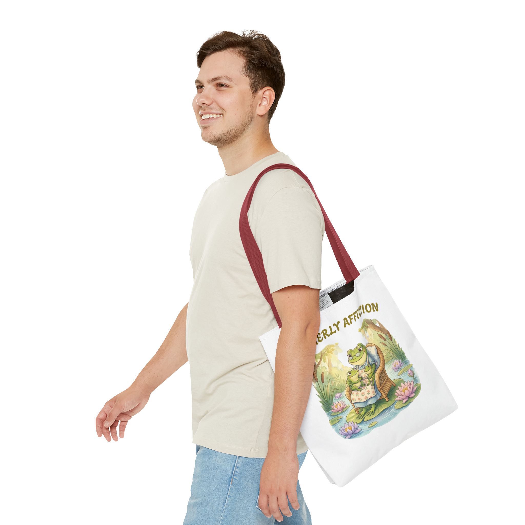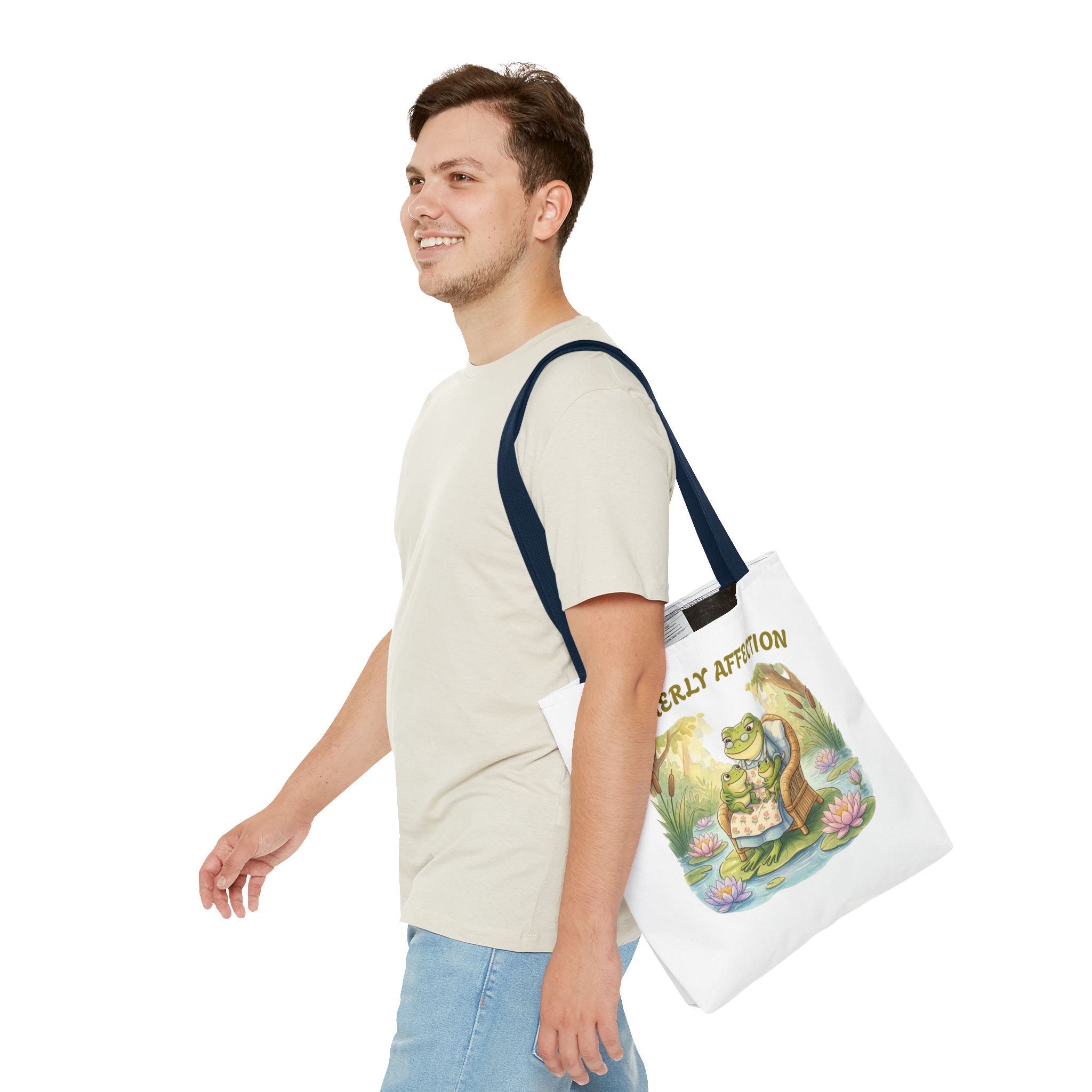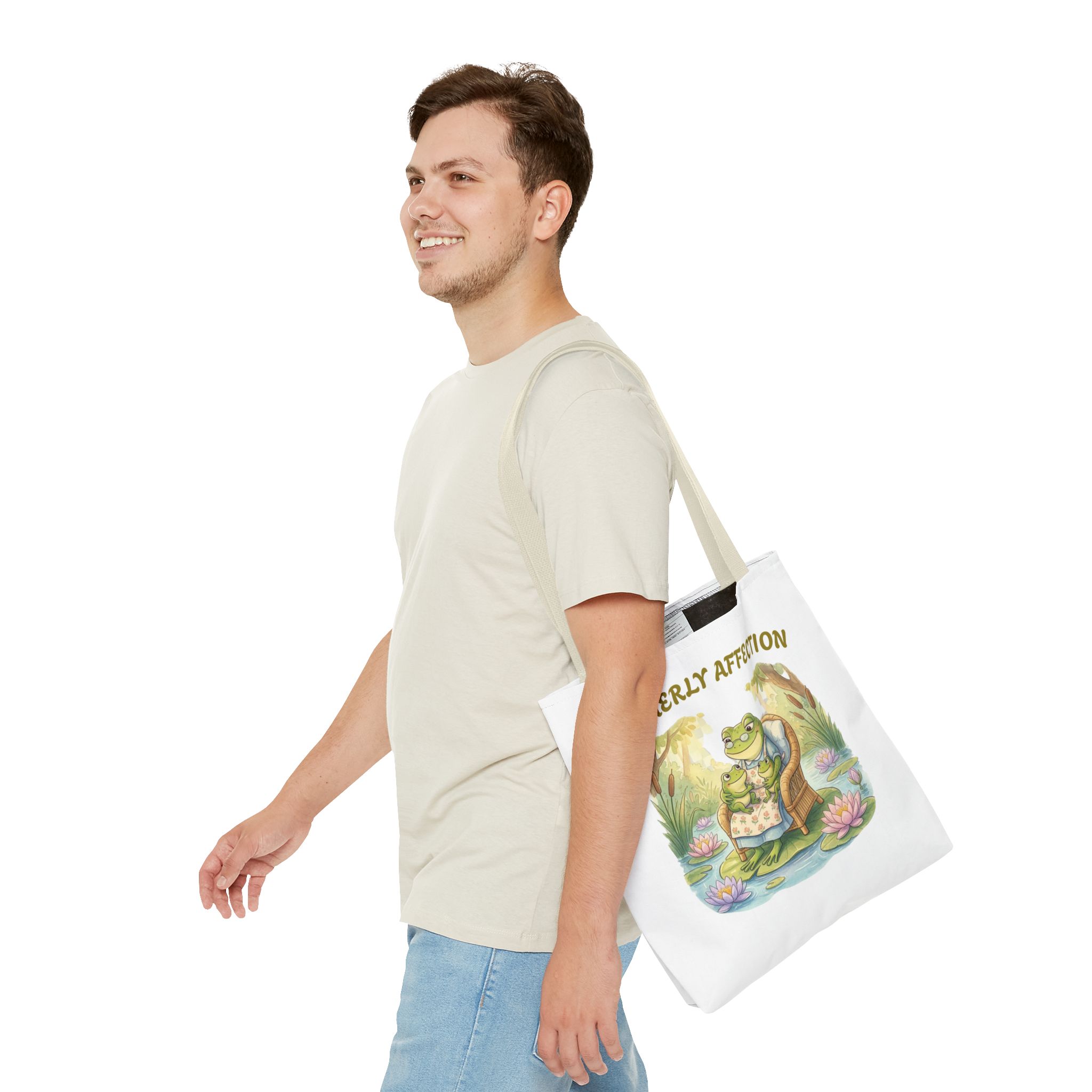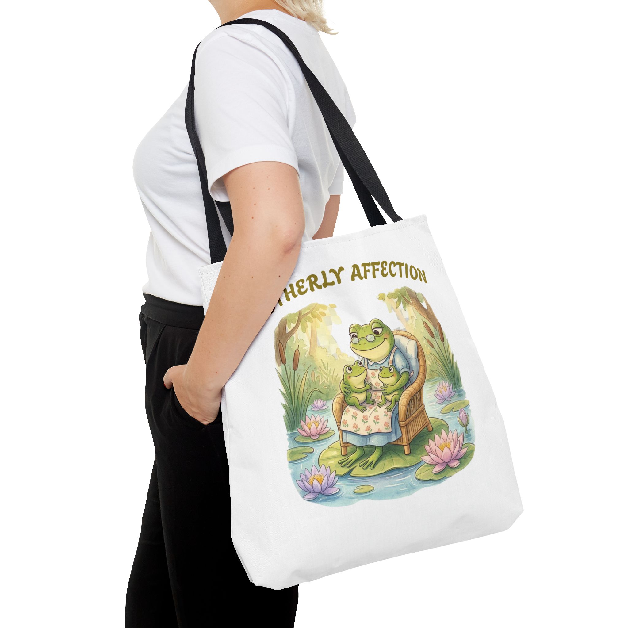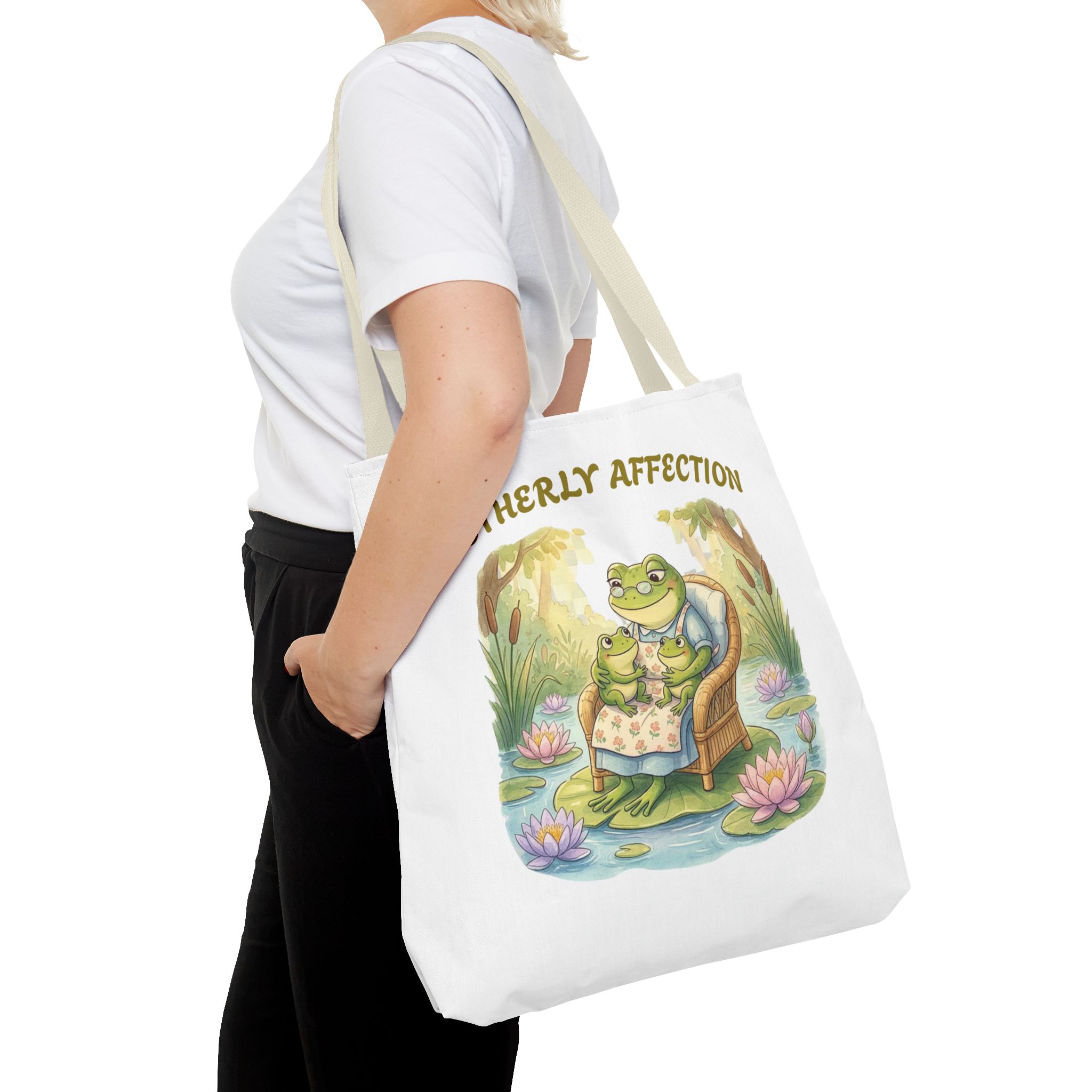 Soft, whimsical charm wrapped in everyday utility. This roomy polyester tote carries groceries, library books, or knitting projects with gentle style thanks to its boxed corners and reinforced handles. The artwork shows a cozy frog mother cradling her little one amid lily pads and warm sunlight — a quiet scene that brings calm and a smile each time you sling the bag over your shoulder. Lightweight, quick-drying fabric and a laminated interior keep contents protected, while the choice of handle colors lets you match your mood. Bring a touch of tender, cottage-core sweetness to errands, markets, and slow mornings by the water.