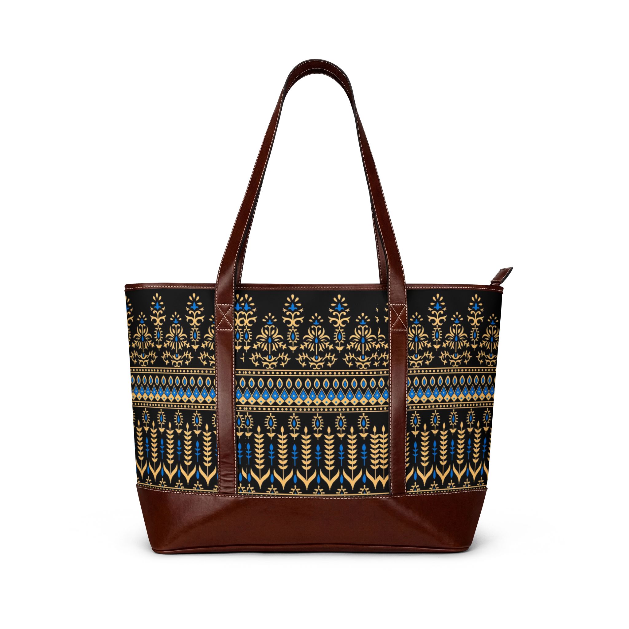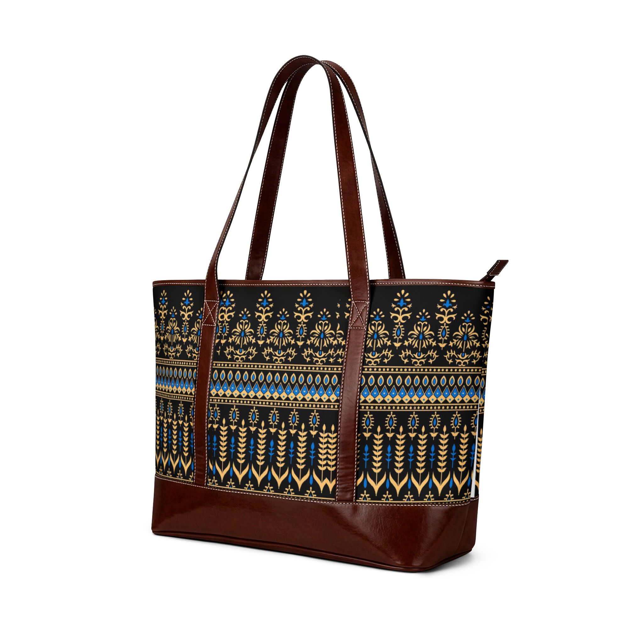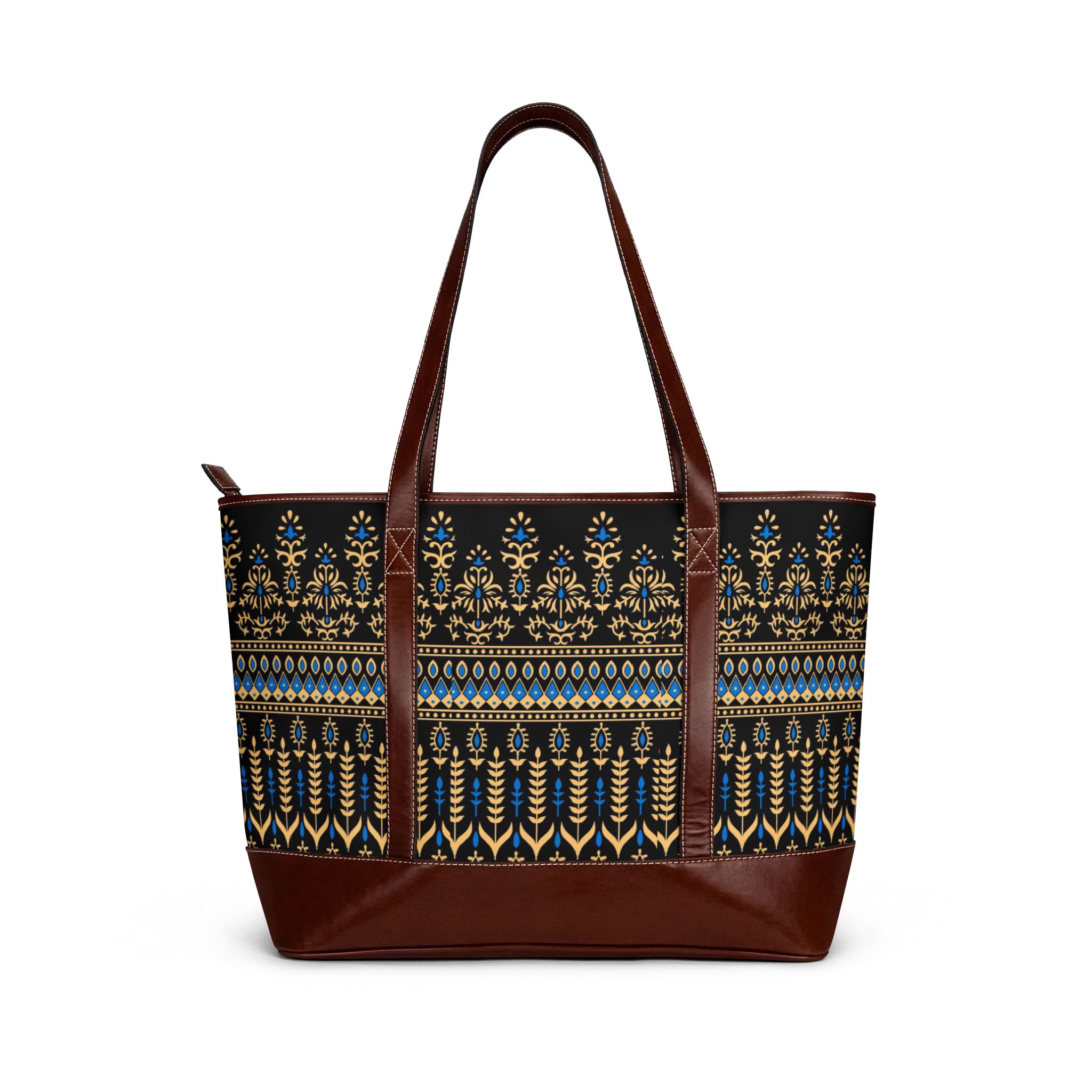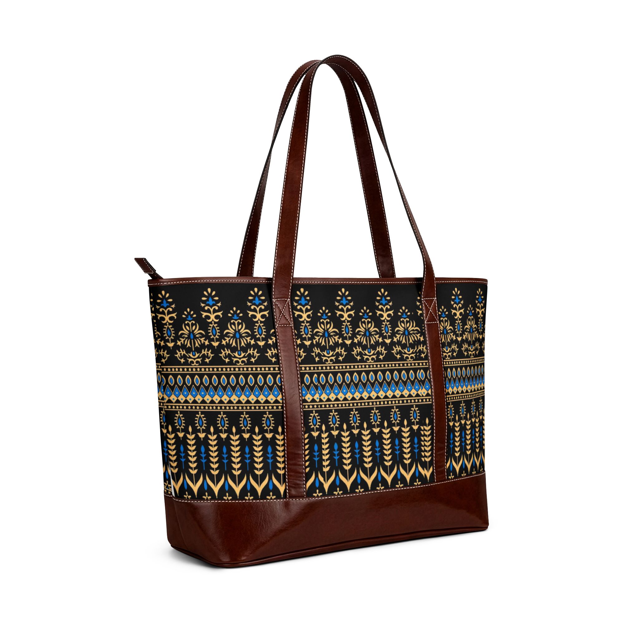 This roomy handbag blends practical design with warm, artisanal style. The woven-inspired pattern in deep navy, gold and cream brings a heritage, hand-stitched look that pairs beautifully with the rich faux-leather base and straps. Inside, a spacious main compartment and multiple interior pockets keep a phone, wallet, keys and small essentials organized and easy to reach. Water-resistant polyester protects contents from light rain or spills, while sturdy faux-leather handles sit comfortably on the shoulder for everyday wear. Carry it to markets, classes, or commute days when you want a bag that feels crafted and dependable.