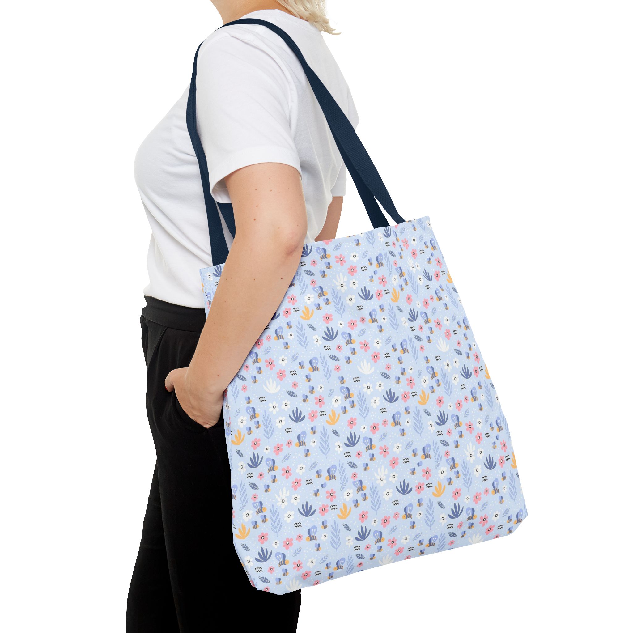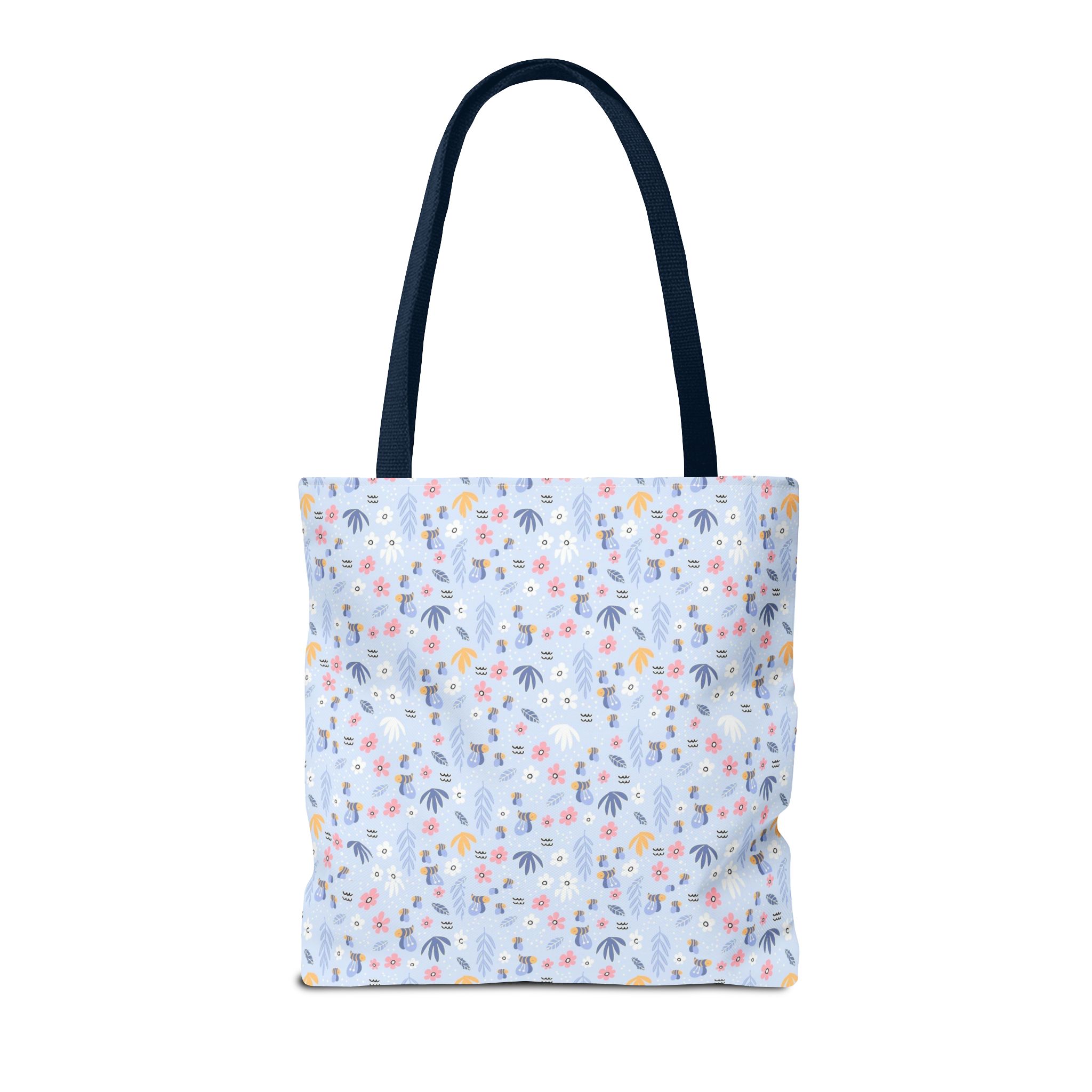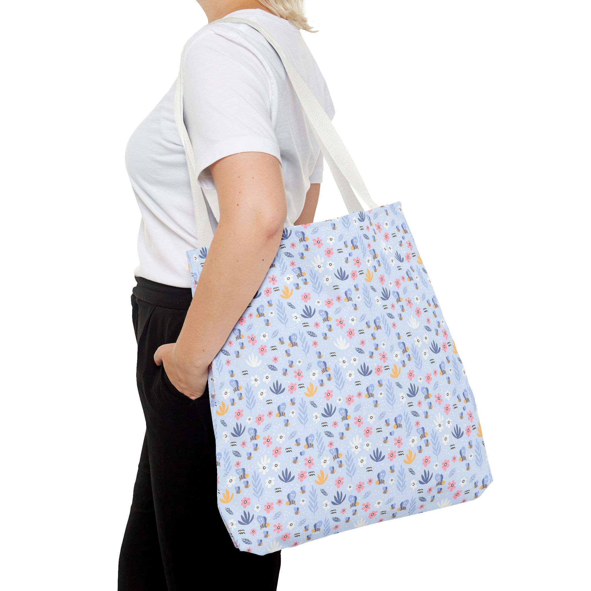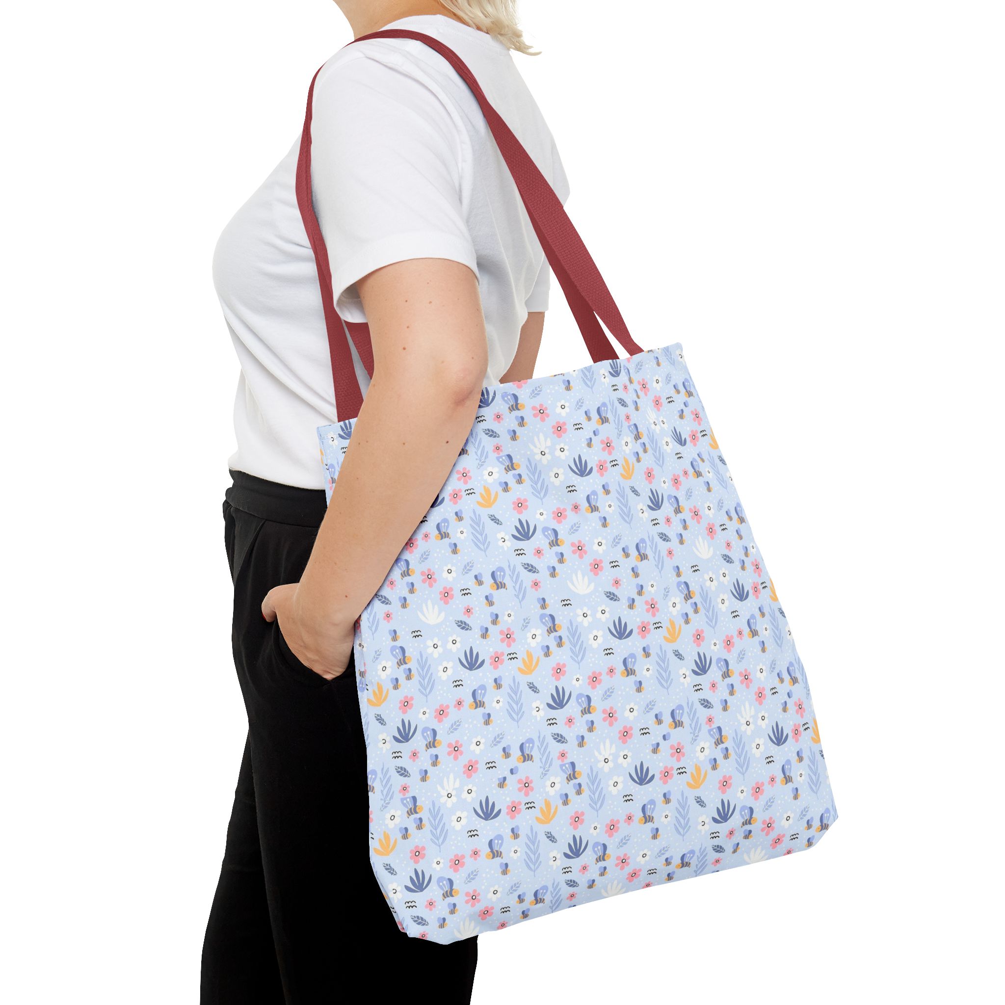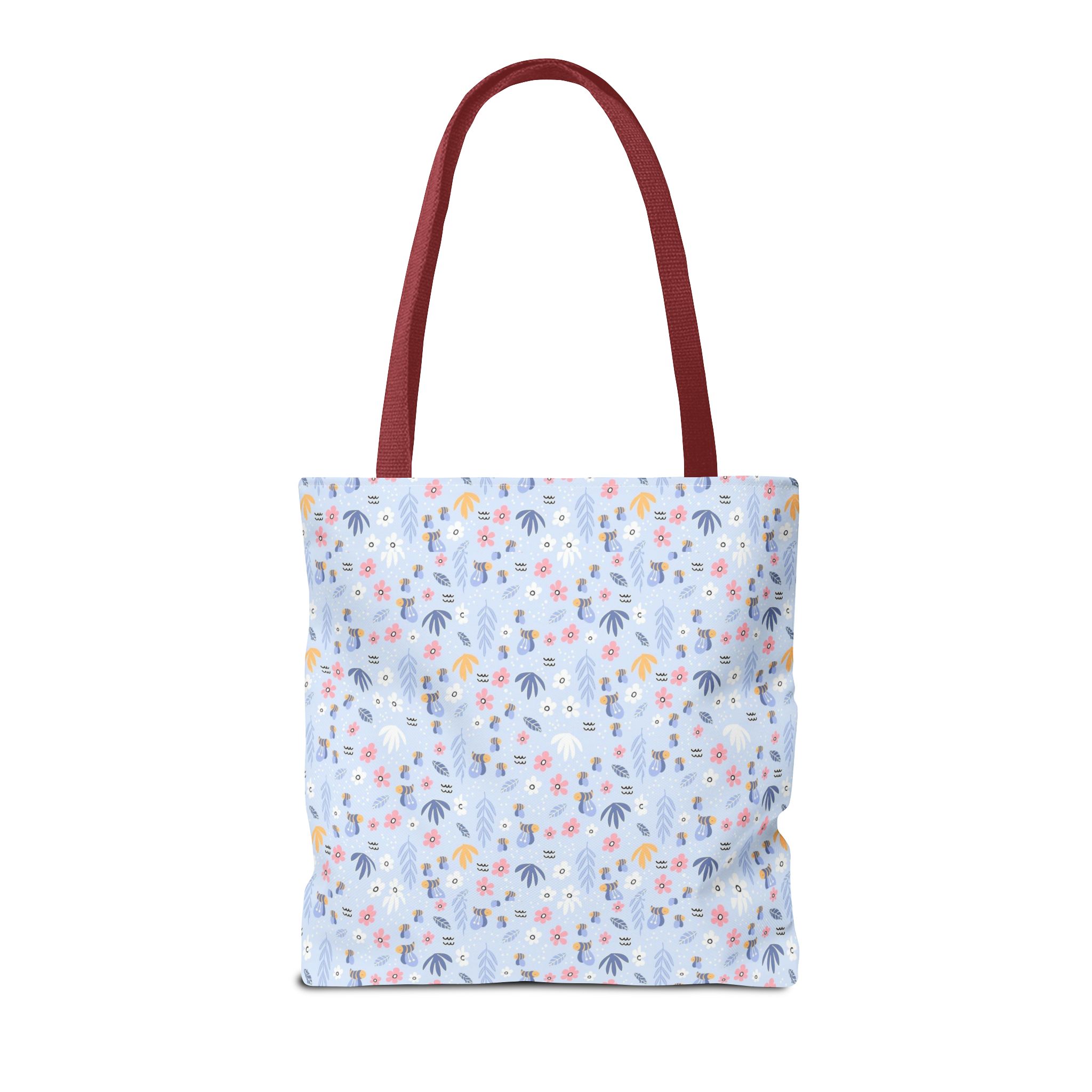 Lightweight, roomy, and quietly joyful — this printed tote brings a soft, hand-drawn floral pattern into everyday life. The pale sky-blue background and scattered blooms in warm coral, muted yellow, and soft navy feel calm and cheerful. The roomy boxed corners and medium-weight polyester body hold groceries, notebooks, or market finds with shape that lasts, while reinforced stitching and sturdy cotton handles keep everything secure. Swap handle colors to match your mood and carry a subtle, artful touch wherever you go — from morning coffee runs to slow afternoons at the farmers’ market.