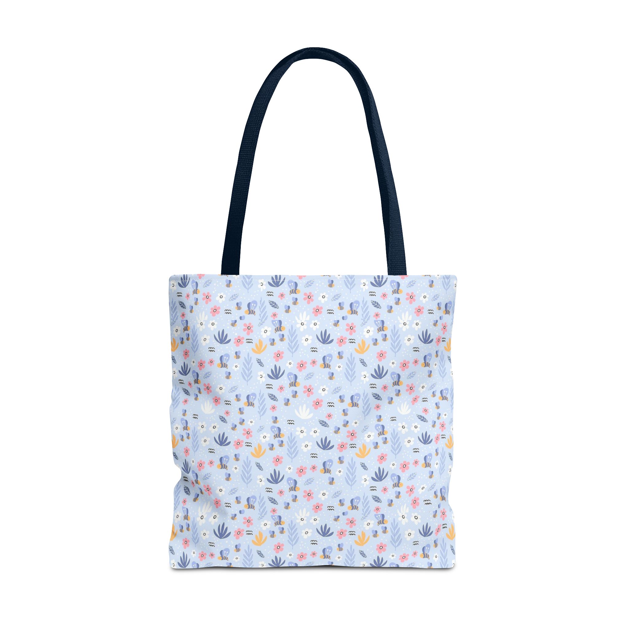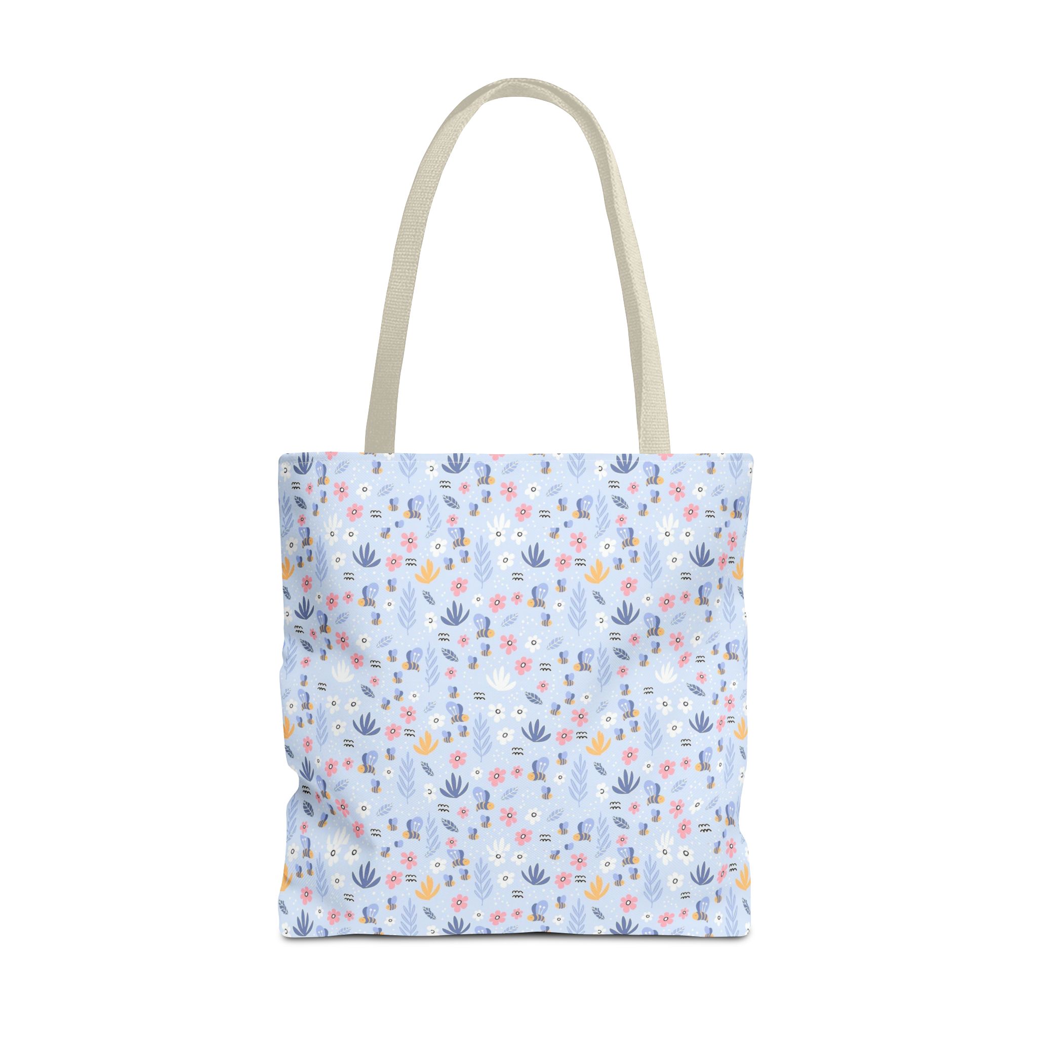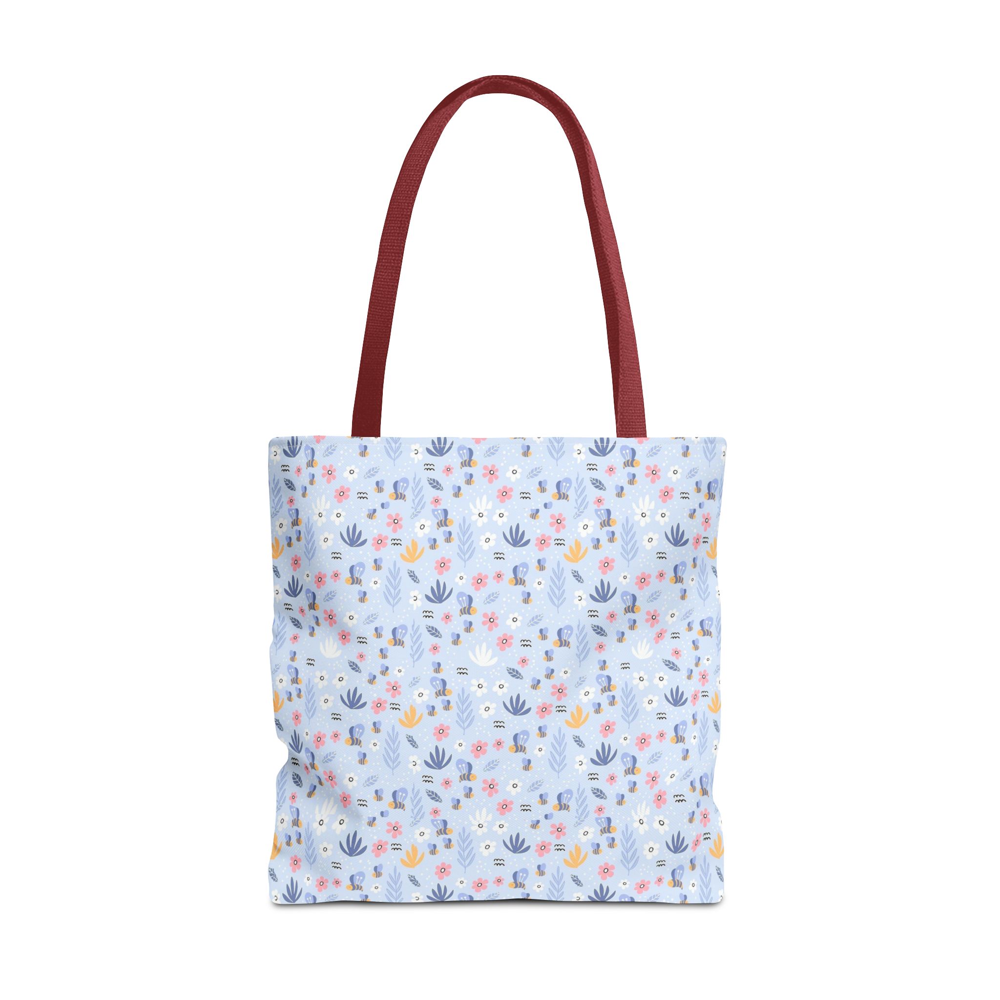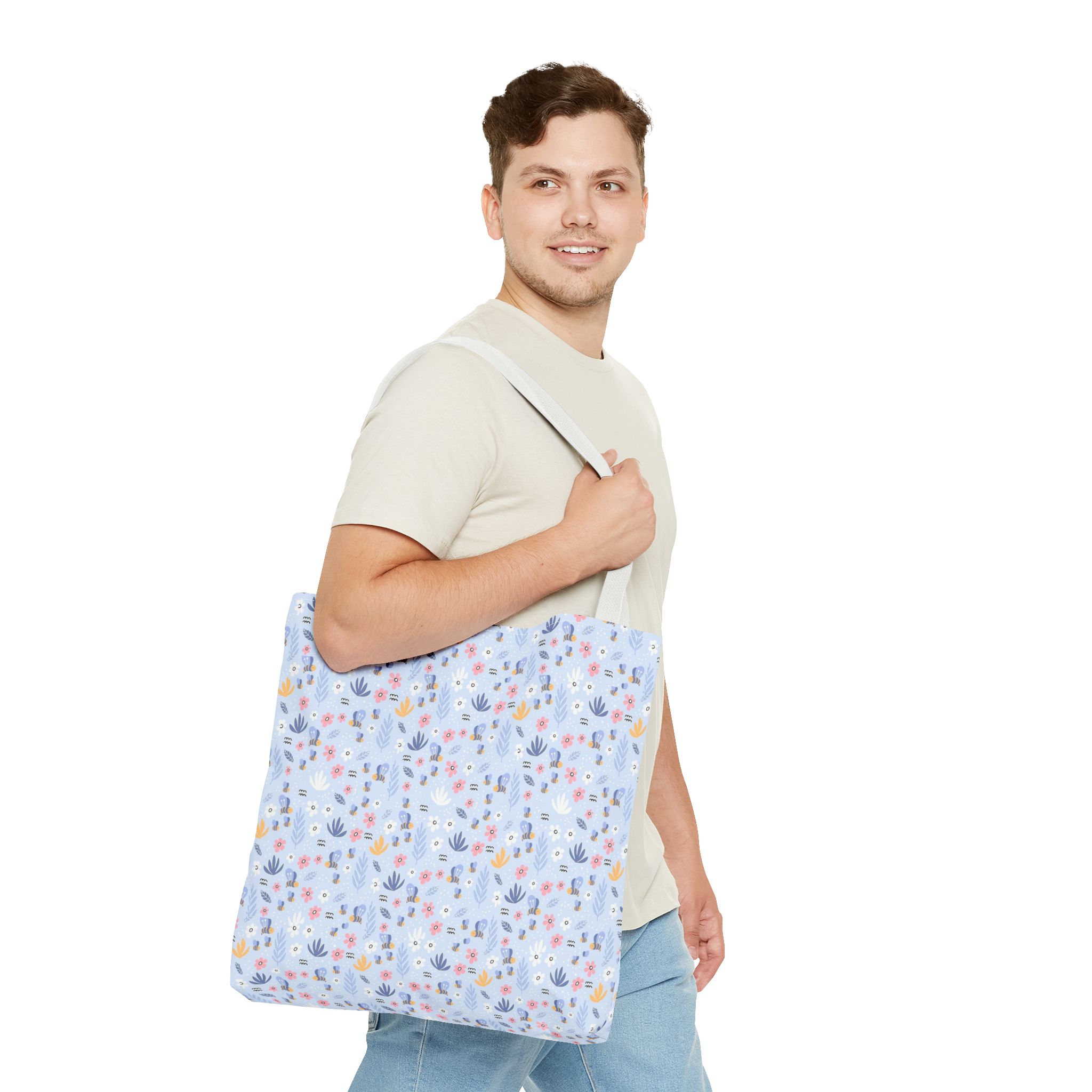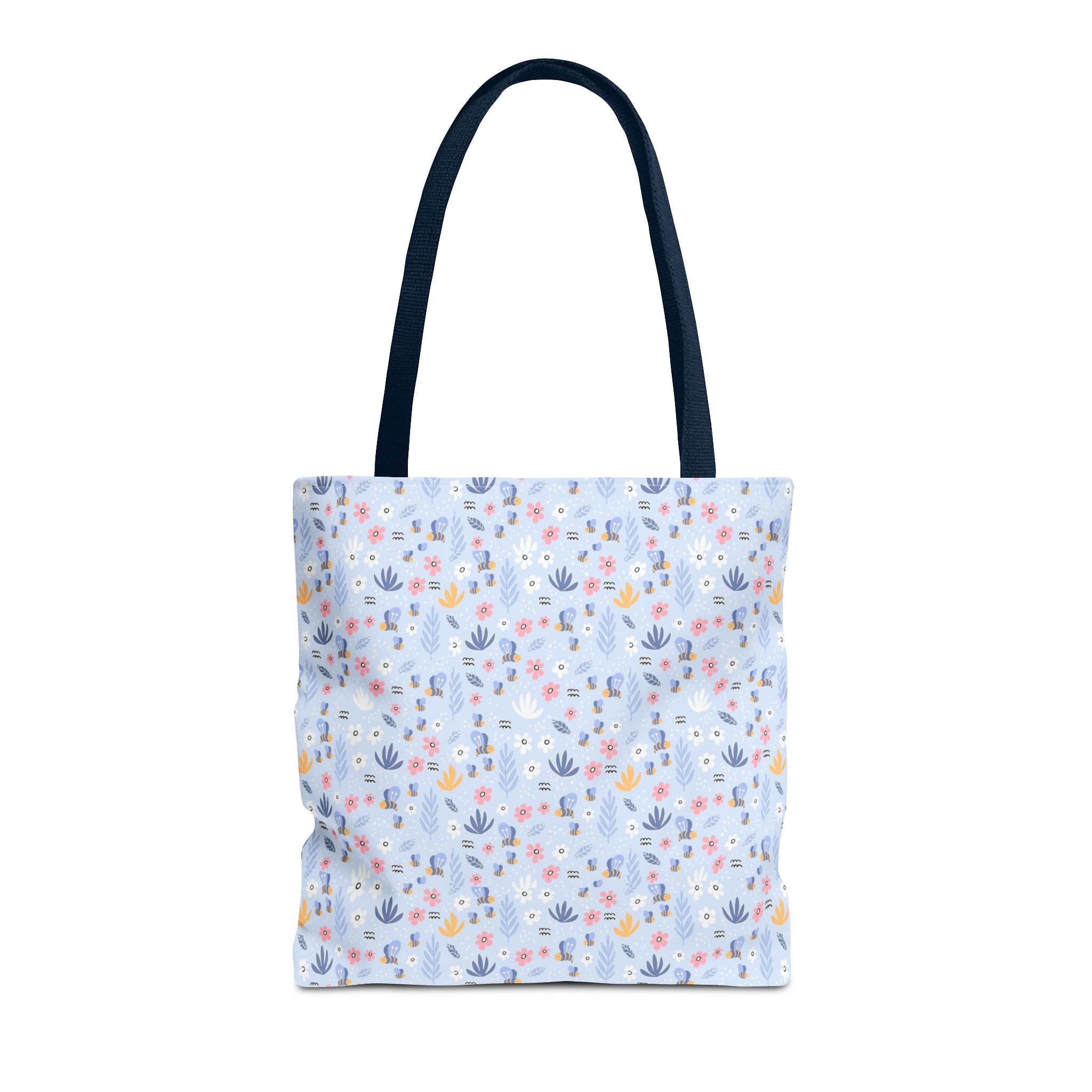 Lightweight, roomy, and quietly joyful — this printed tote brings a soft, hand-drawn floral pattern into everyday life. The pale sky-blue background and scattered blooms in warm coral, muted yellow, and soft navy feel calm and cheerful. The roomy boxed corners and medium-weight polyester body hold groceries, notebooks, or market finds with shape that lasts, while reinforced stitching and sturdy cotton handles keep everything secure. Swap handle colors to match your mood and carry a subtle, artful touch wherever you go — from morning coffee runs to slow afternoons at the farmers’ market.