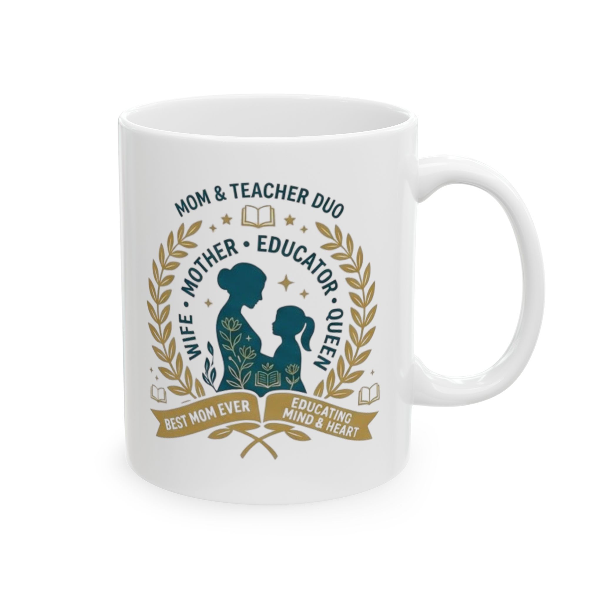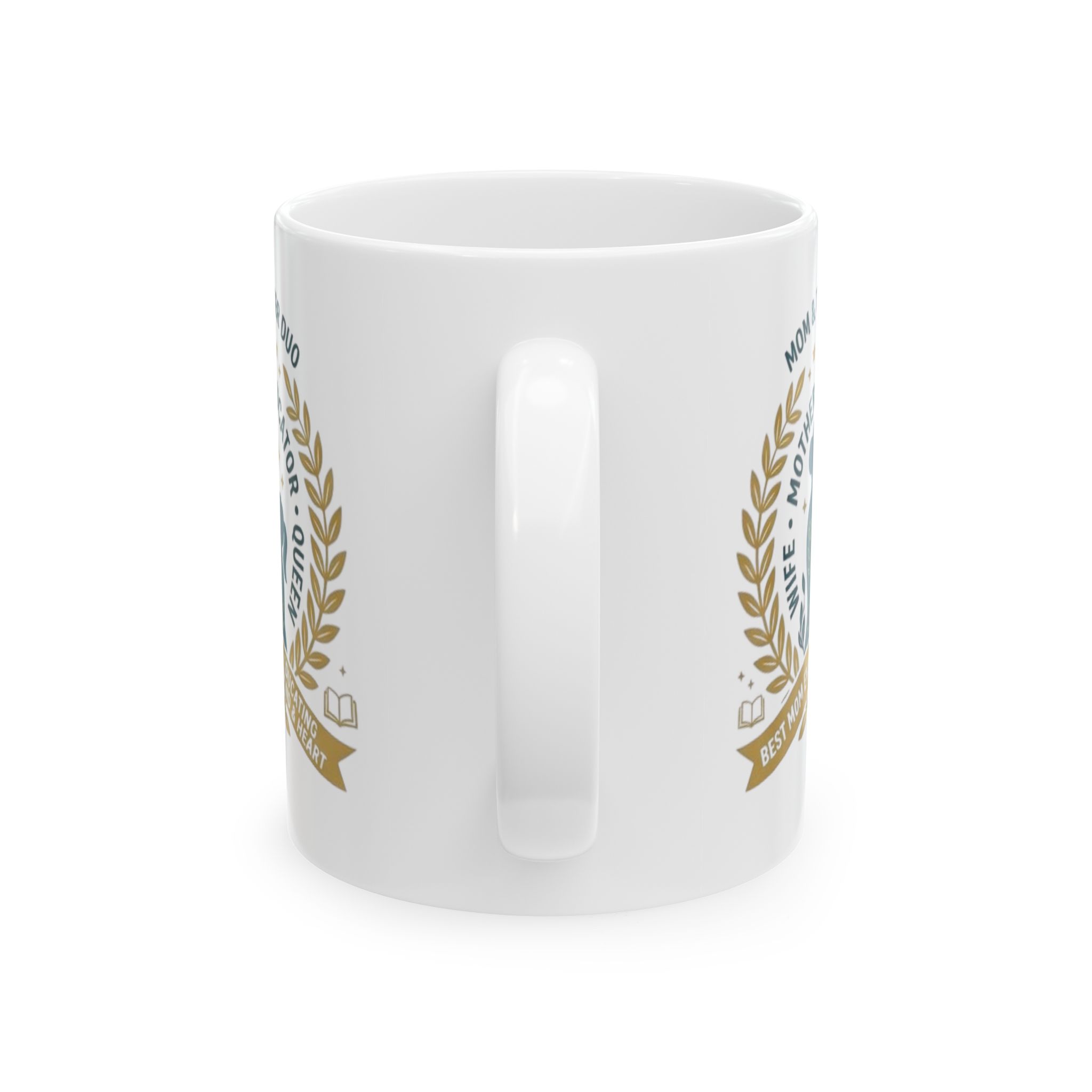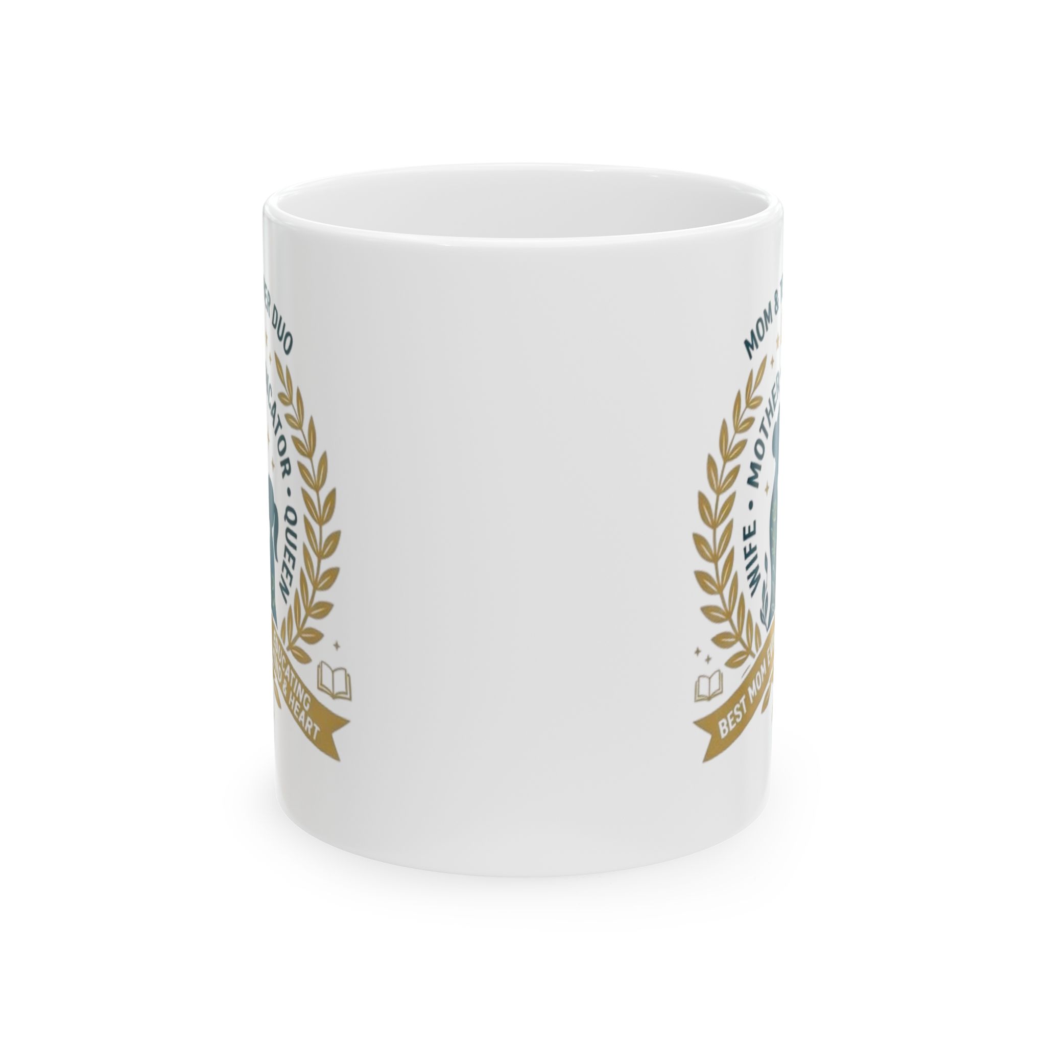 A glossy ceramic coffee mug designed to bring a little ceremony to everyday moments. The white, high-sheen surface makes the detailed crest-style artwork pop, while the comfortable C-handle keeps it easy to hold during slow mornings or busy desk hours. Choose between a compact 11 oz or a larger 15 oz for longer pours. This mug resists fading thanks to modern printing methods and is safe for microwave reheats and dishwasher convenience. Lead- and BPA-free, it blends practical durability with an elevated, approachable look that sits well on a kitchen shelf or office desk.