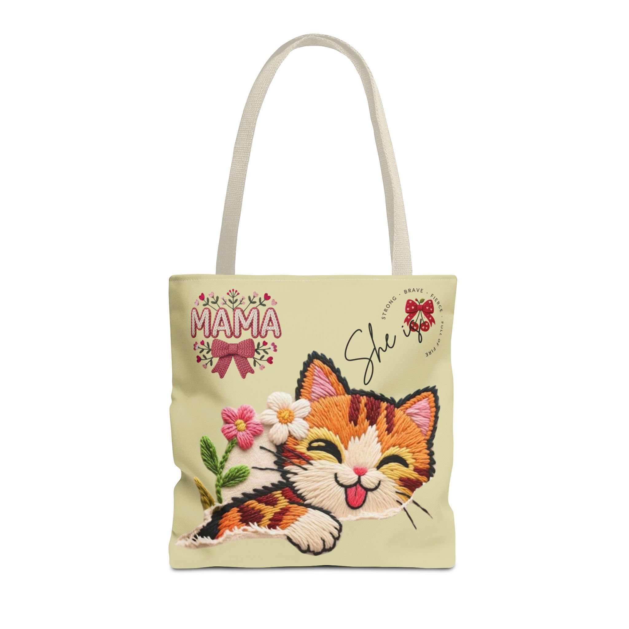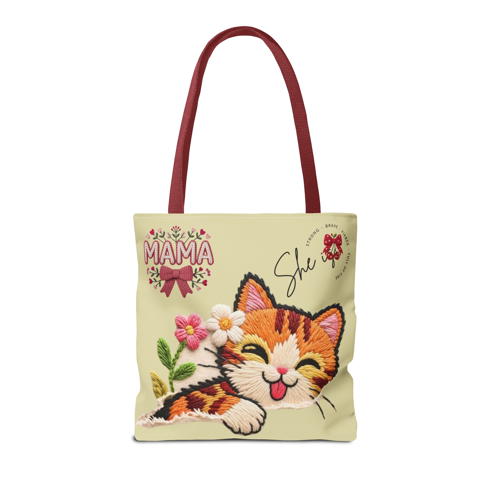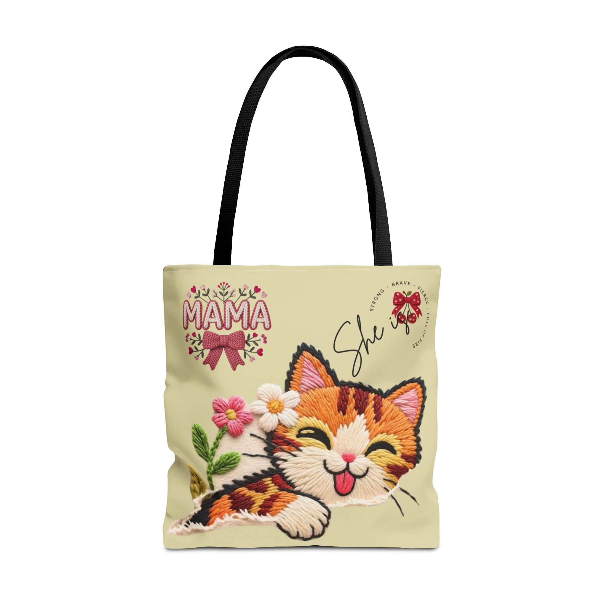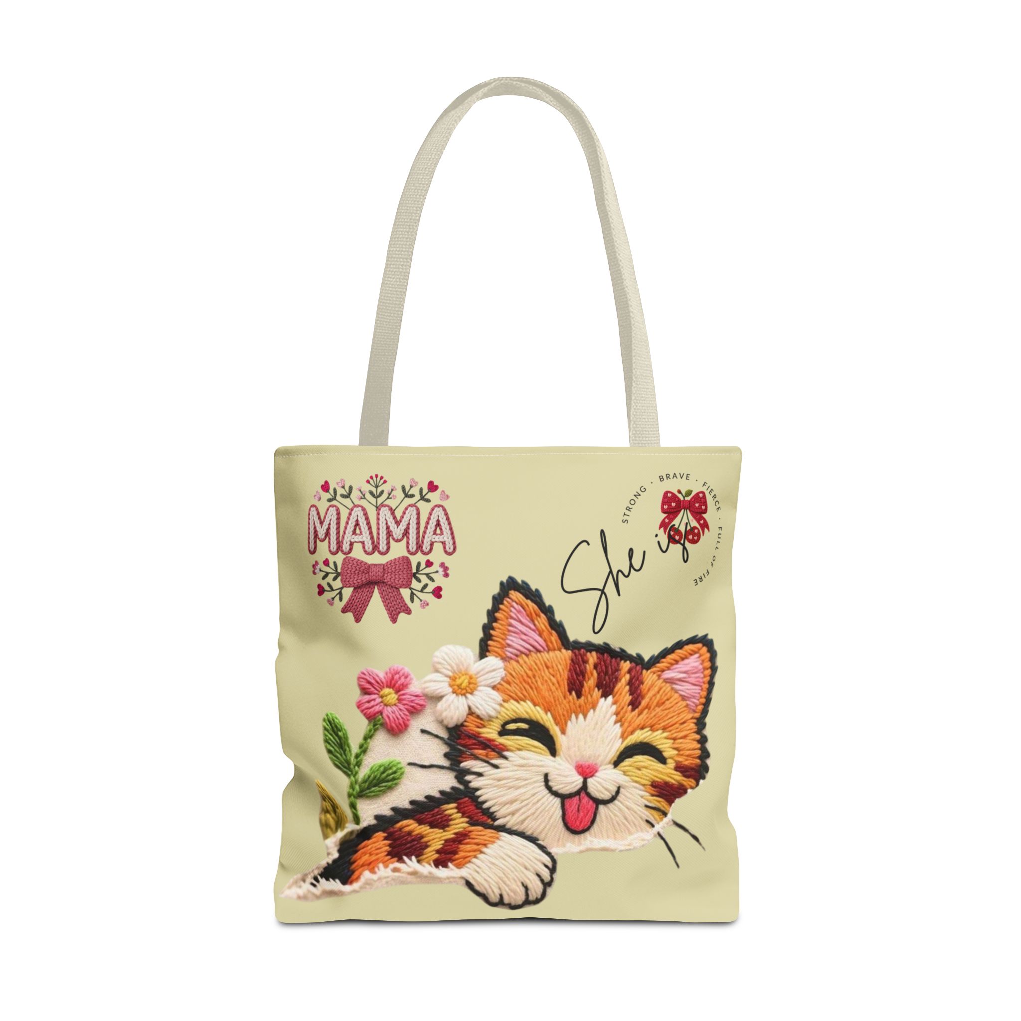 Soft cream canvas takes center stage, showcasing a hand-stitched–style tabby kitten mid-stretch, eyes closed and tongue out in a moment of pure mischief. Delicate embroidered florals and a rosy “MAMA” crest hover nearby, while a handwritten “She” adds a personal, scrapbooked touch. Lightweight yet sturdy, this tote moves from school pick-ups to farmers’ markets with casual charm. It holds groceries, notebooks, or a change of clothes without losing shape, and the boxed corners give a roomy silhouette that sits comfortably at your side. This is a warm, playful carryall made for anyone who collects cozy moments and small joys daily.