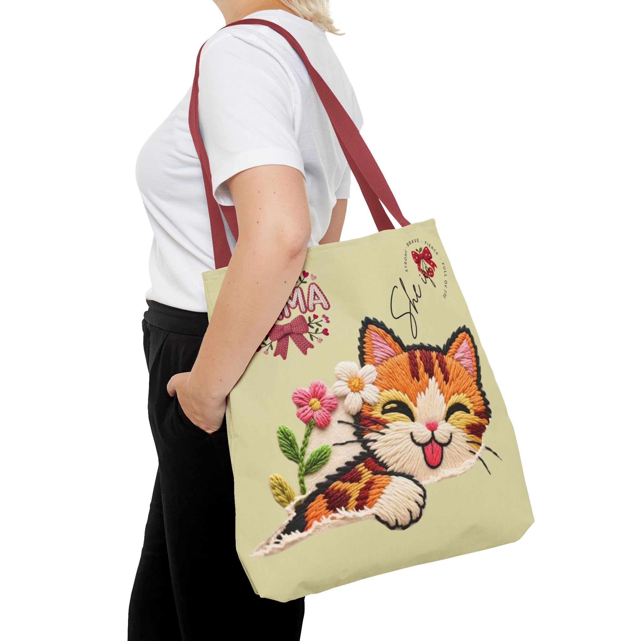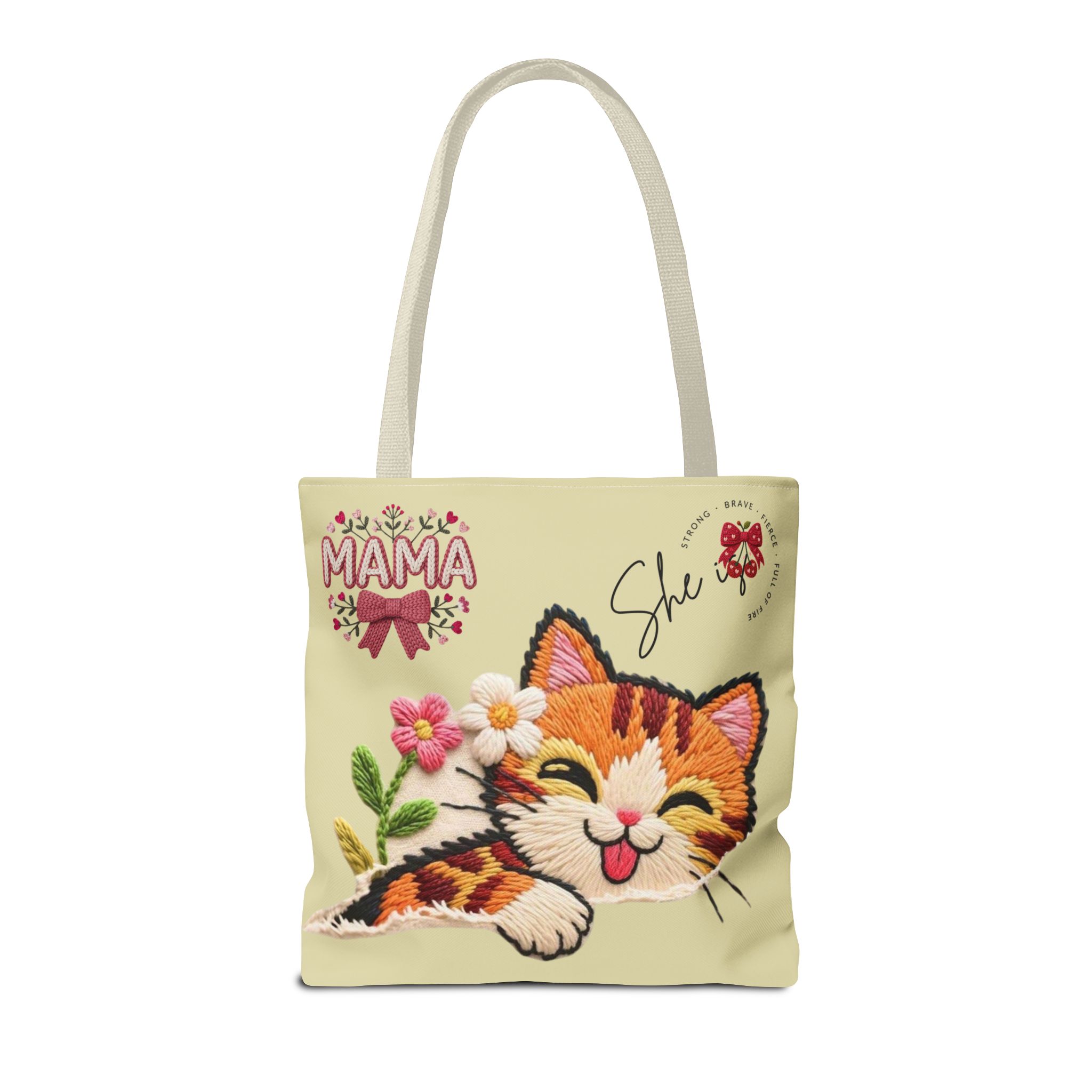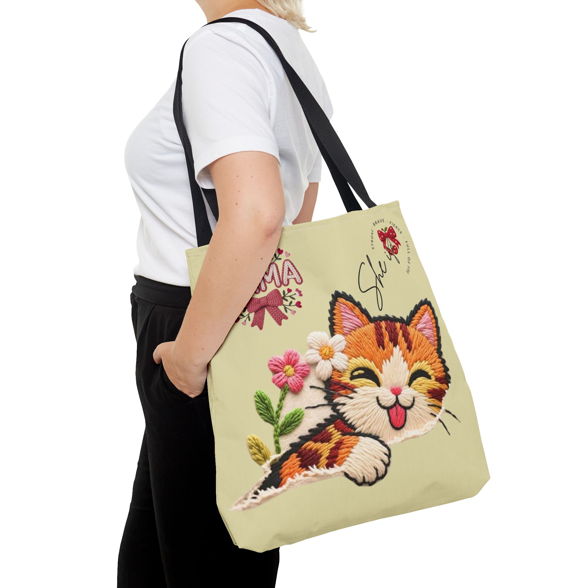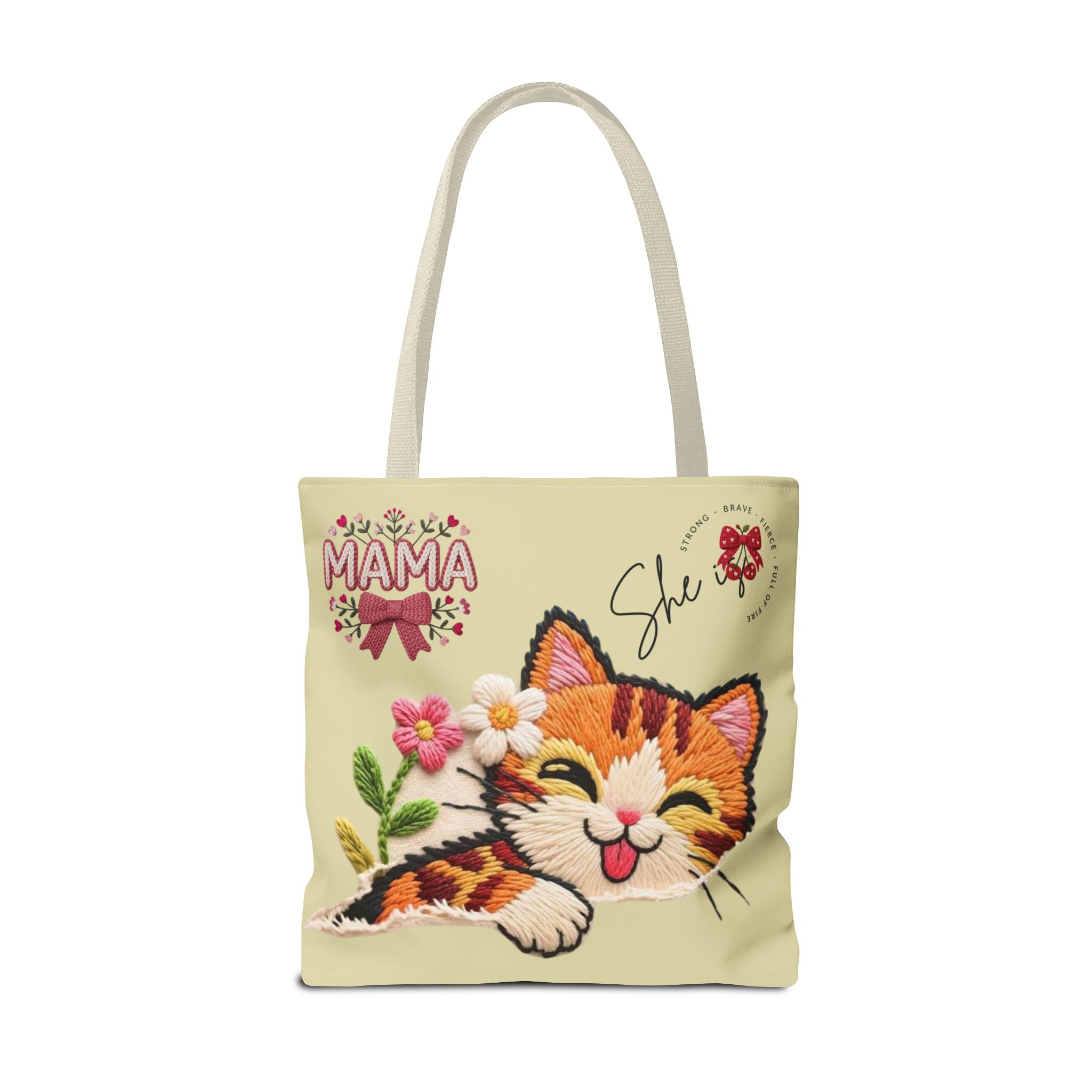Soft cream canvas takes center stage, showcasing a hand-stitched–style tabby kitten mid-stretch, eyes closed and tongue out in a moment of pure mischief. Delicate embroidered florals and a rosy “MAMA” crest hover nearby, while a handwritten “She” adds a personal, scrapbooked touch. Lightweight yet sturdy, this tote moves from school pick-ups to farmers’ markets with casual charm. It holds groceries, notebooks, or a change of clothes without losing shape, and the boxed corners give a roomy silhouette that sits comfortably at your side. This is a warm, playful carryall made for anyone who collects cozy moments and small joys daily.