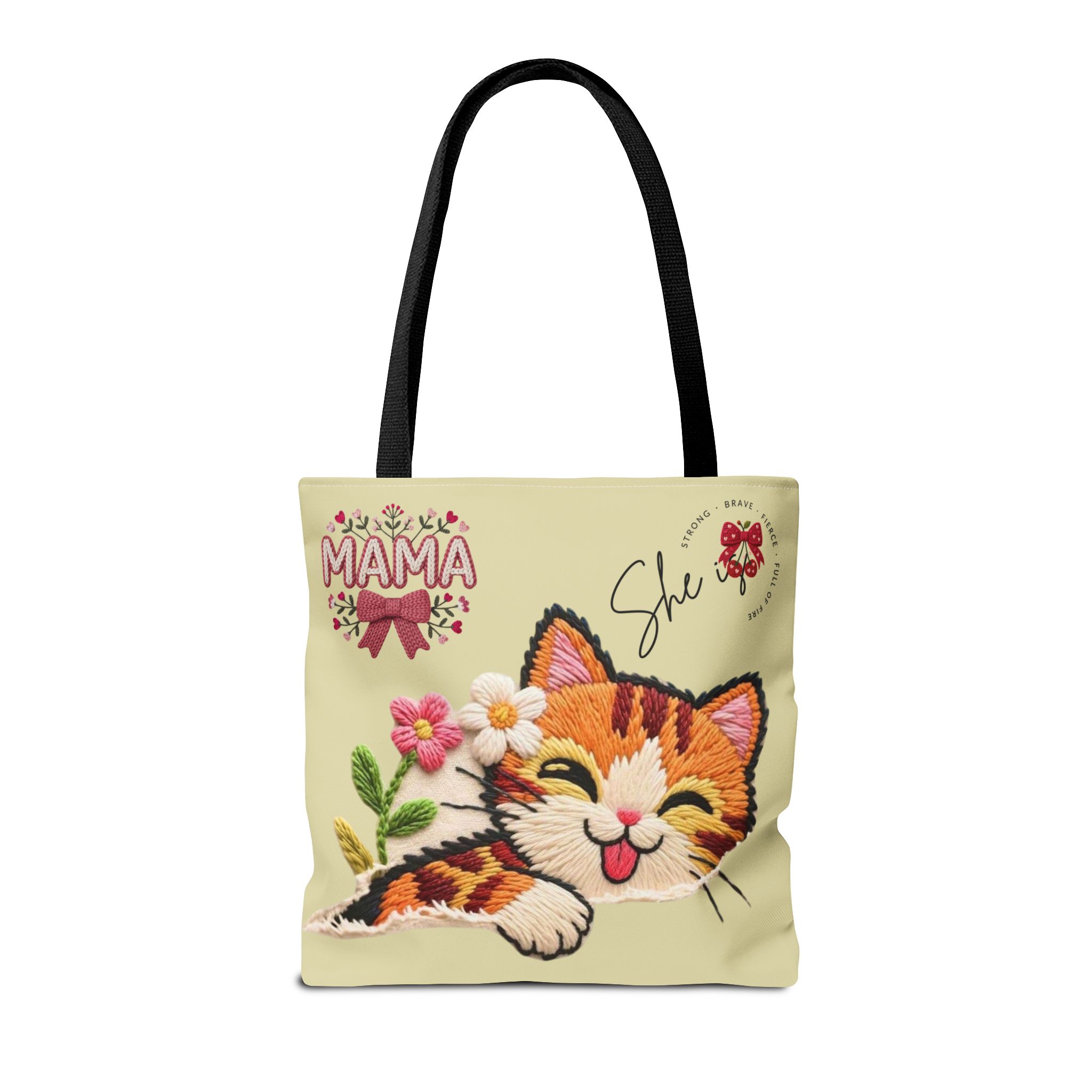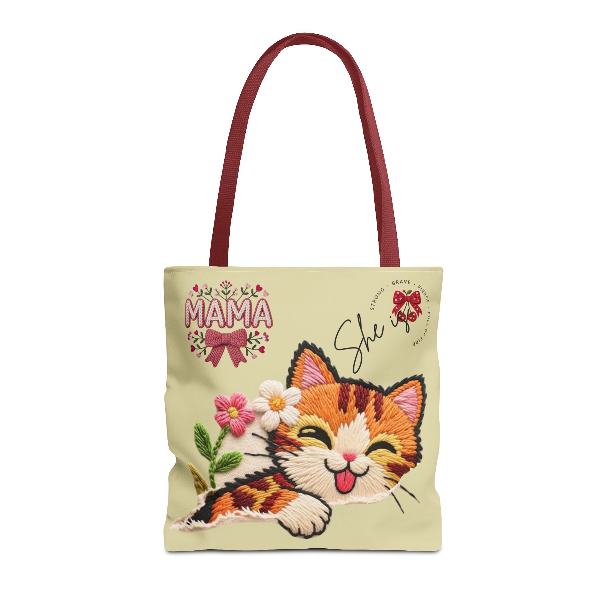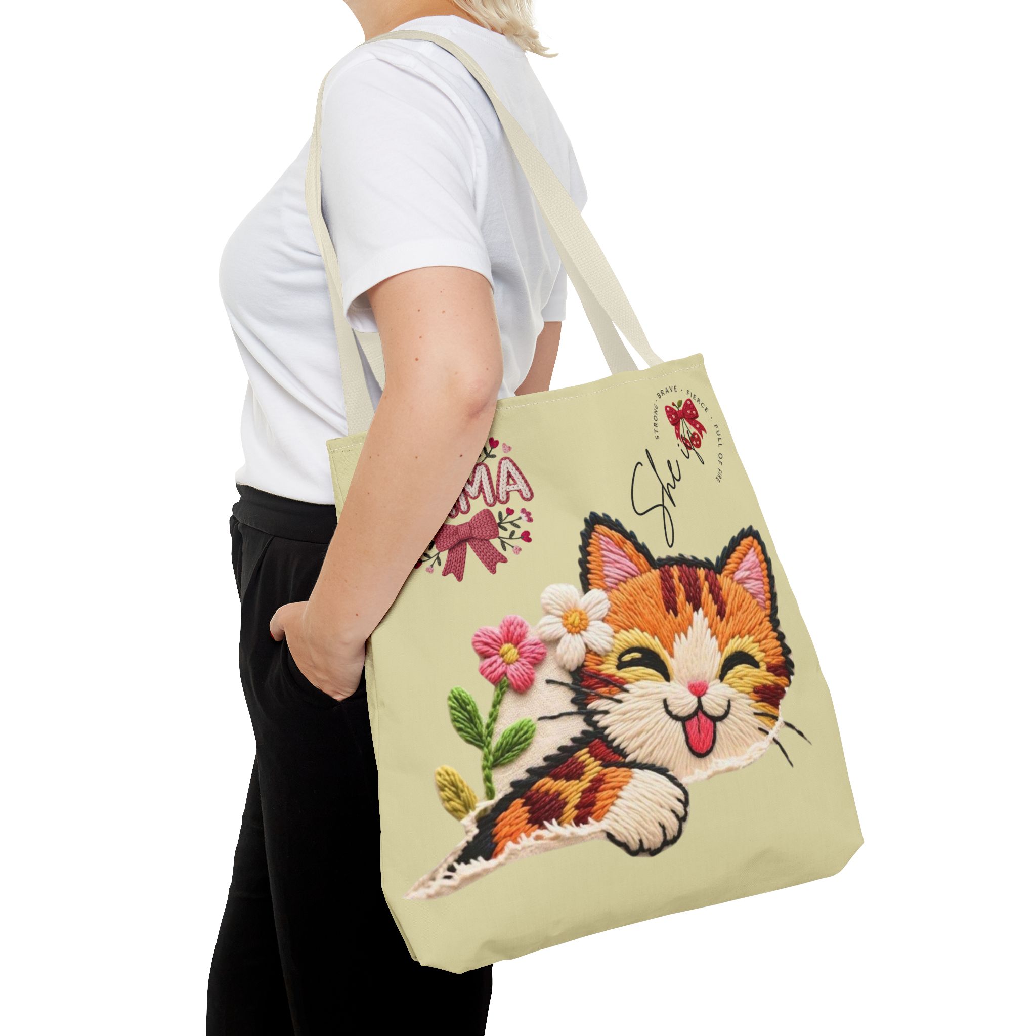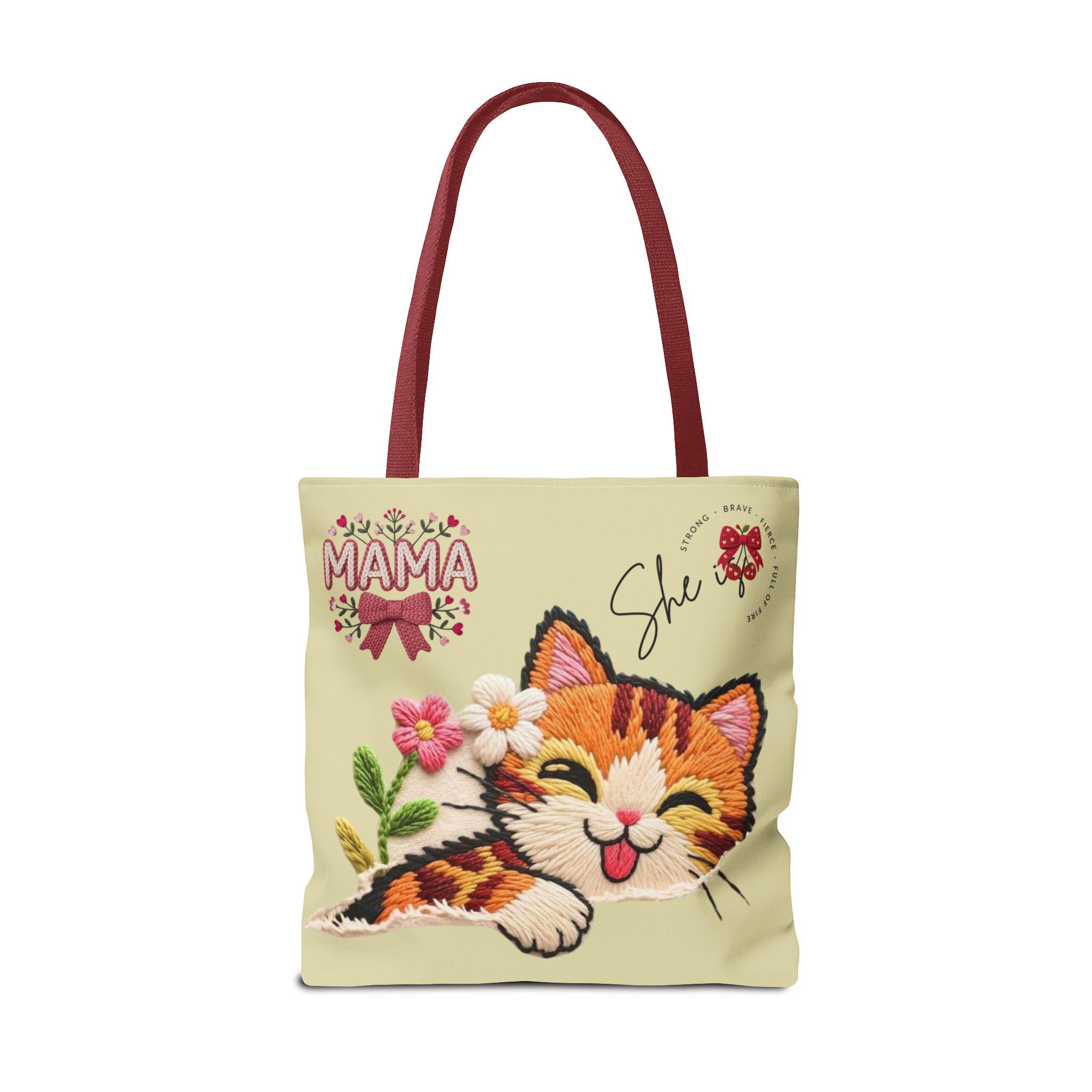 Soft cream canvas takes center stage, showcasing a hand-stitched–style tabby kitten mid-stretch, eyes closed and tongue out in a moment of pure mischief. Delicate embroidered florals and a rosy “MAMA” crest hover nearby, while a handwritten “She” adds a personal, scrapbooked touch. Lightweight yet sturdy, this tote moves from school pick-ups to farmers’ markets with casual charm. It holds groceries, notebooks, or a change of clothes without losing shape, and the boxed corners give a roomy silhouette that sits comfortably at your side. This is a warm, playful carryall made for anyone who collects cozy moments and small joys daily.