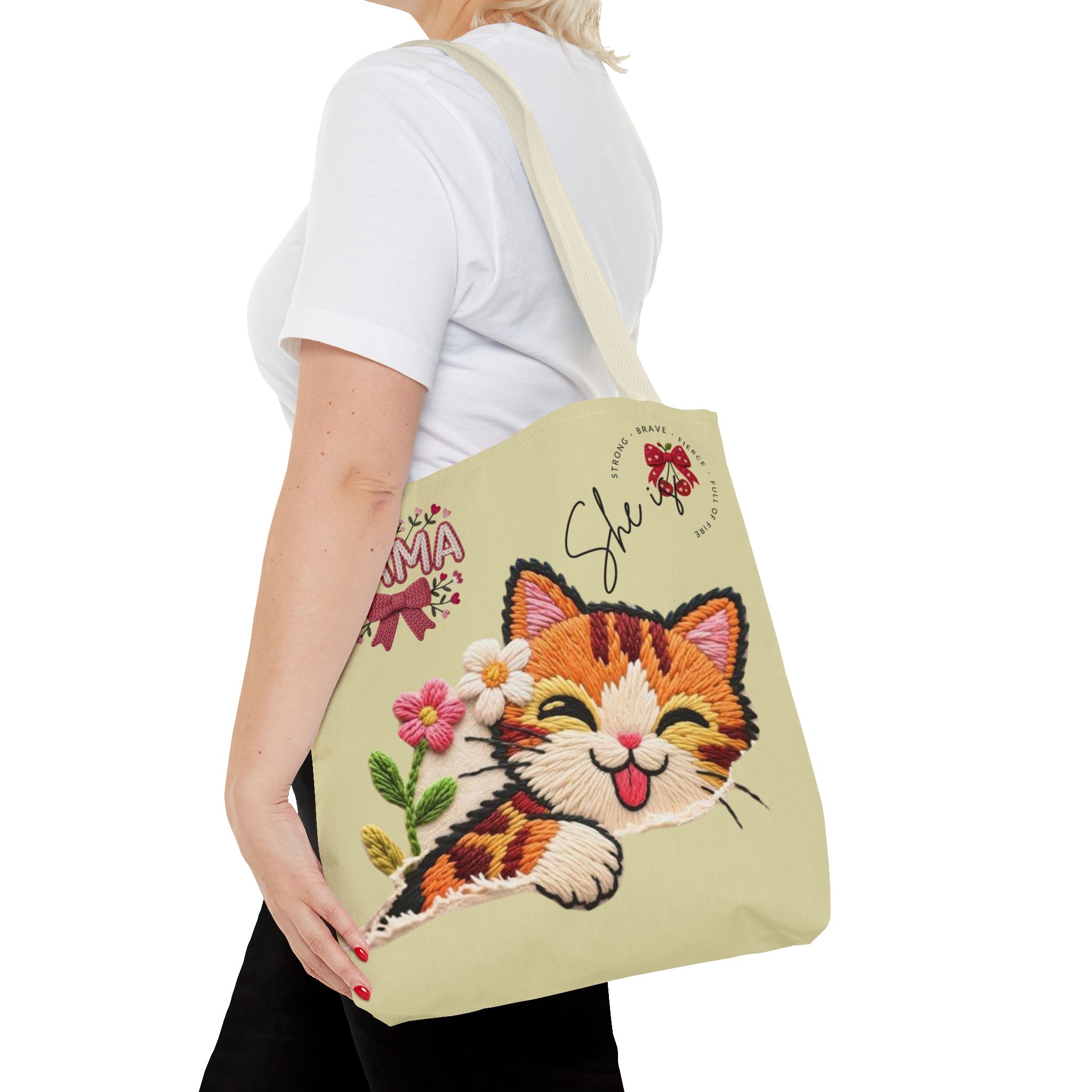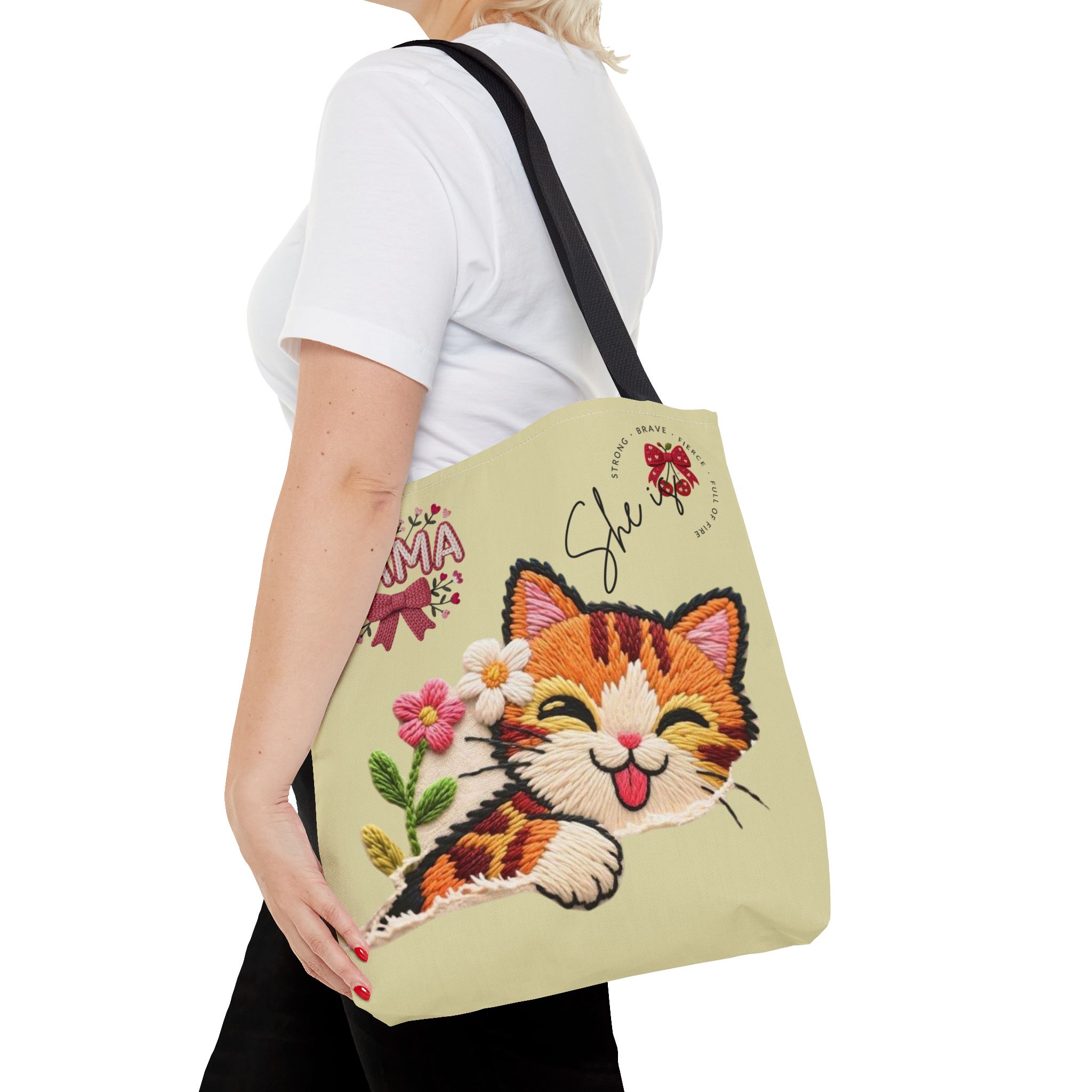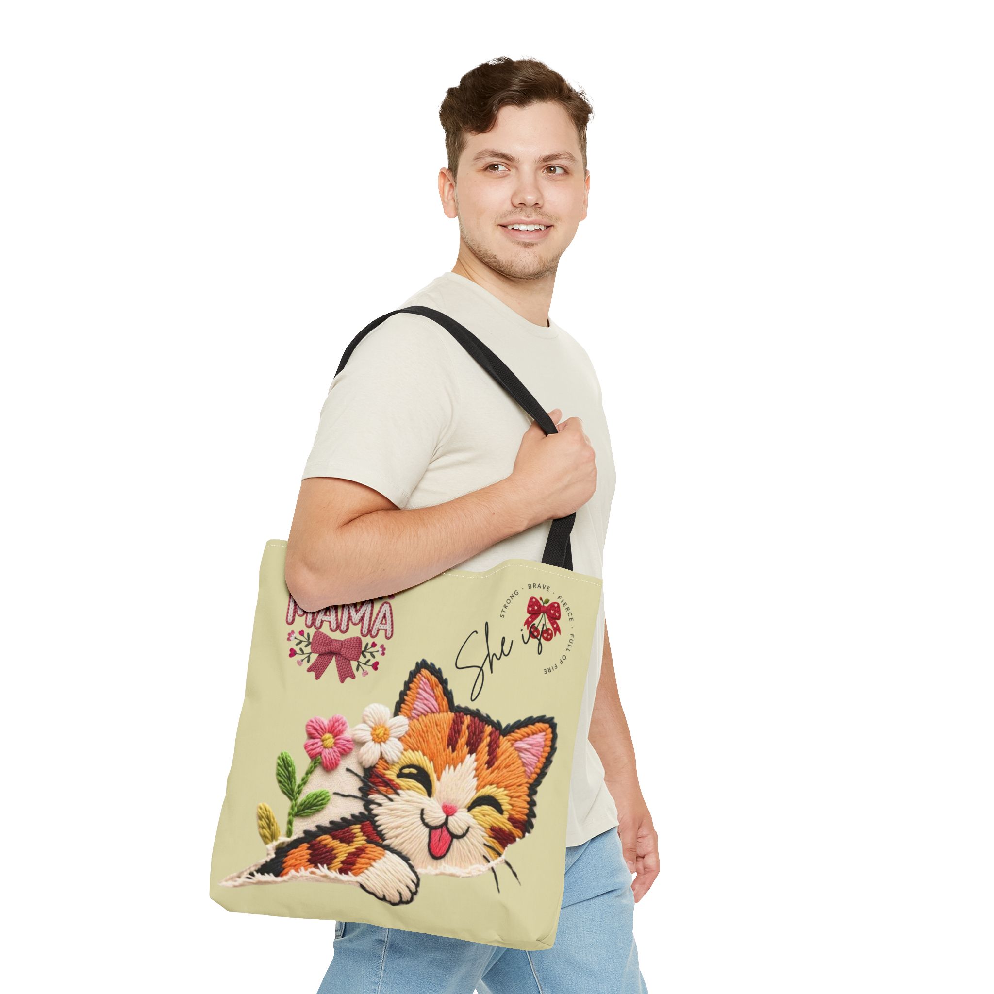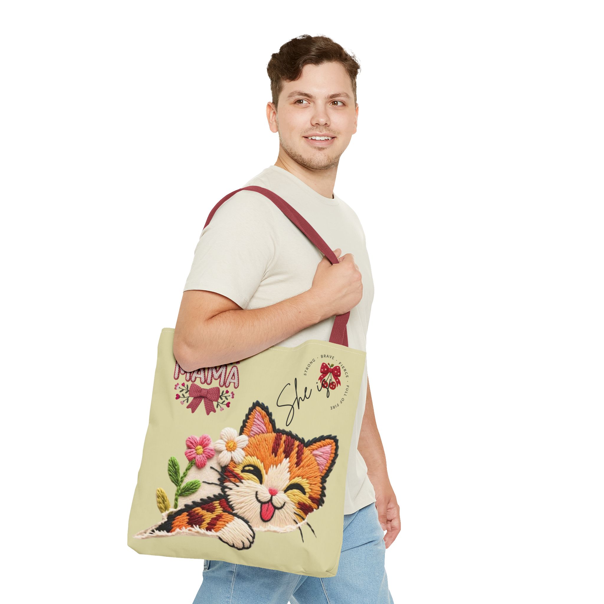 Soft cream canvas takes center stage, showcasing a hand-stitched–style tabby kitten mid-stretch, eyes closed and tongue out in a moment of pure mischief. Delicate embroidered florals and a rosy “MAMA” crest hover nearby, while a handwritten “She” adds a personal, scrapbooked touch. Lightweight yet sturdy, this tote moves from school pick-ups to farmers’ markets with casual charm. It holds groceries, notebooks, or a change of clothes without losing shape, and the boxed corners give a roomy silhouette that sits comfortably at your side. This is a warm, playful carryall made for anyone who collects cozy moments and small joys daily.