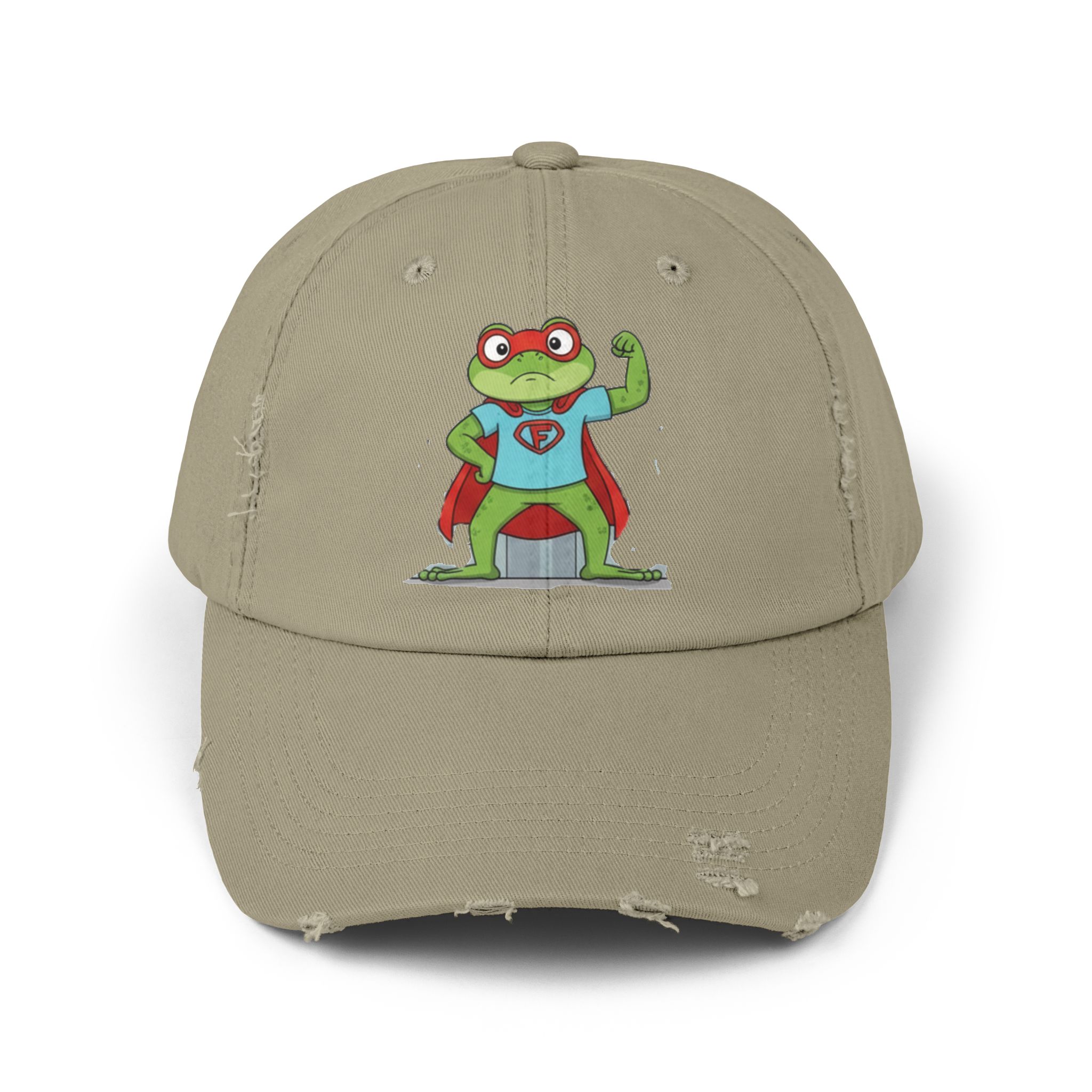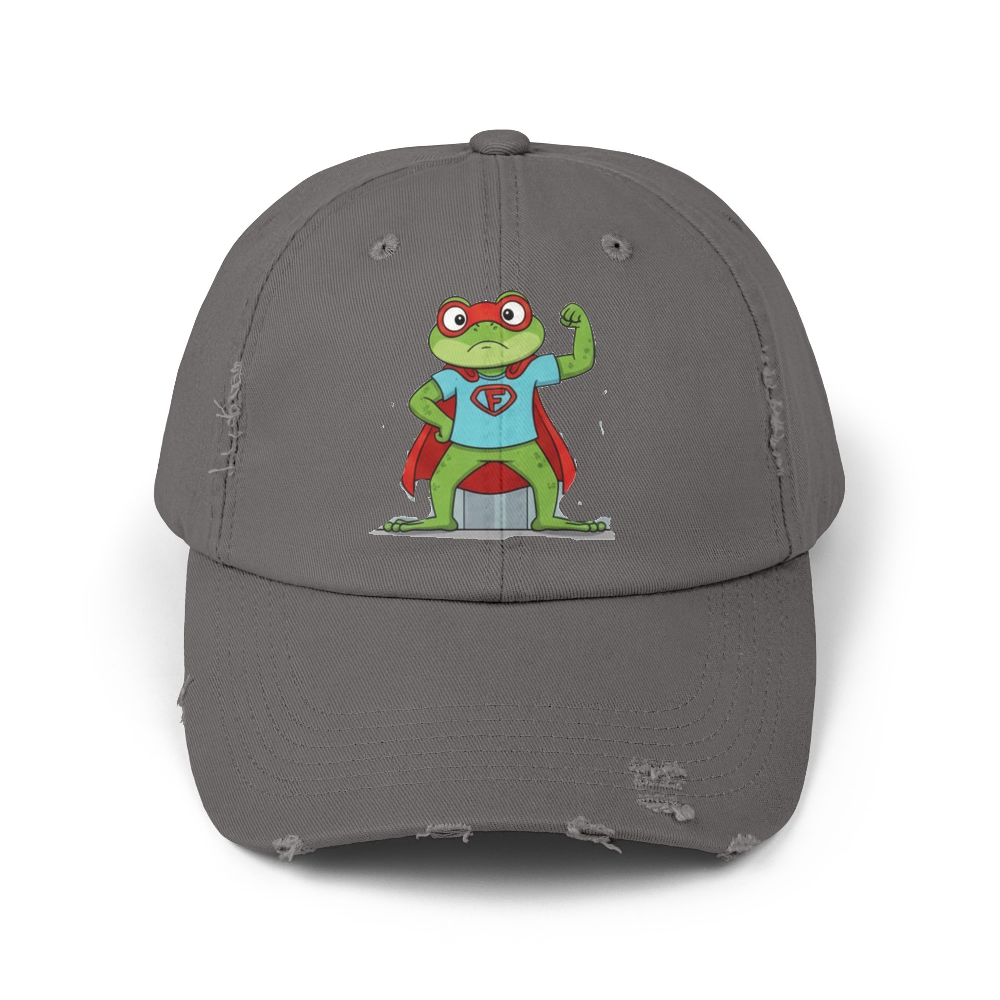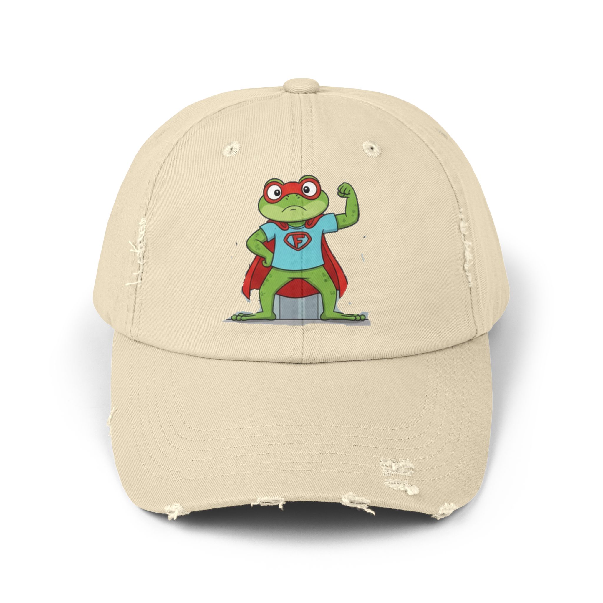 A laid-back, vintage-style cap that brings a playful, nostalgic energy to everyday wear. The soft, distressed cotton twill and low-profile, unstructured body let the hat sit comfortably and casually. A cheeky superhero frog print adds a whimsical, hand-drawn charm—like a small, confident mascot that nods to childhood comics and backyard adventures. Subtle distressing and D-ring strap details give each hat its own character, so it feels like a well-loved staple from day one. Wear it on slow weekend mornings, while running errands, or to add a lighthearted touch to outdoor meetups and casual gatherings.