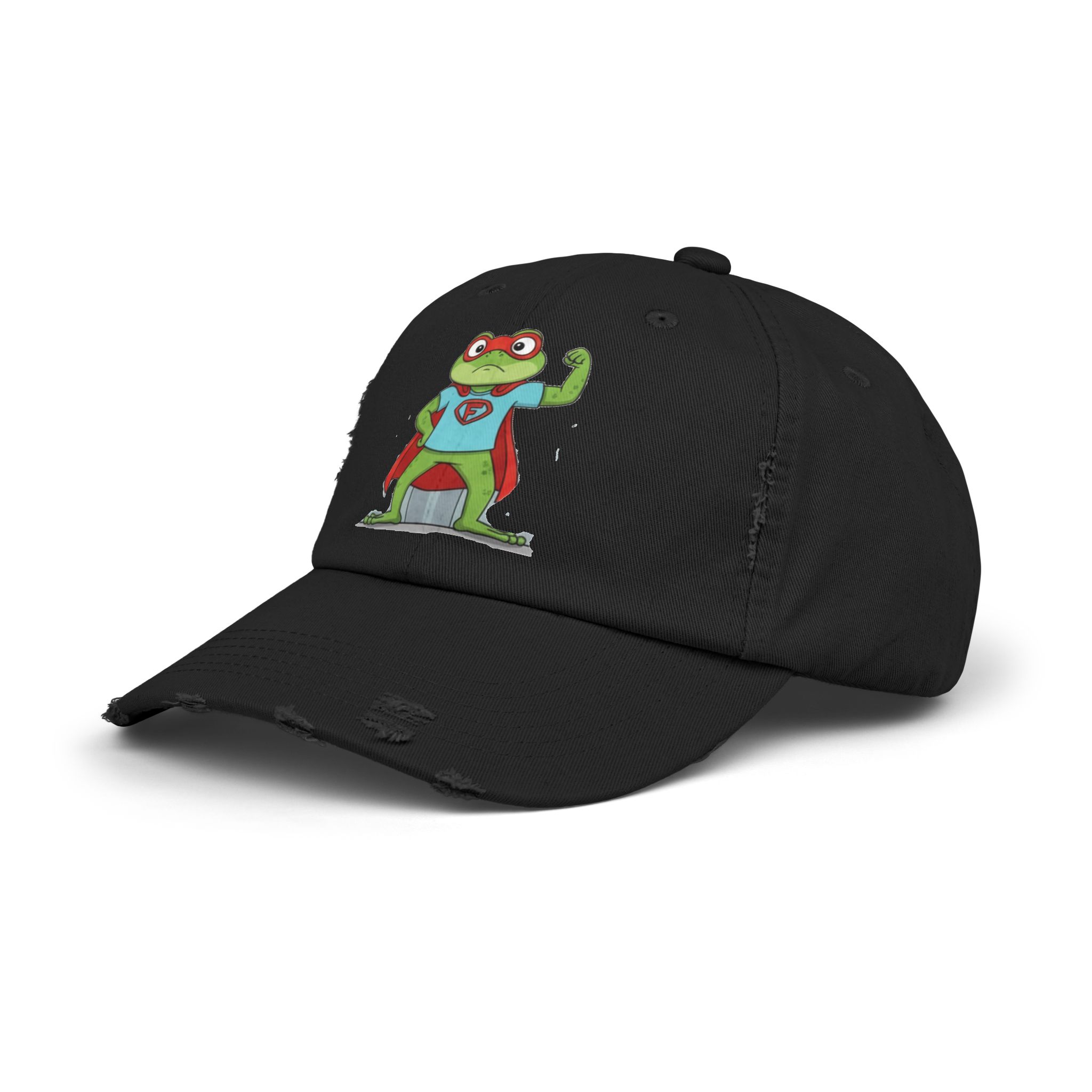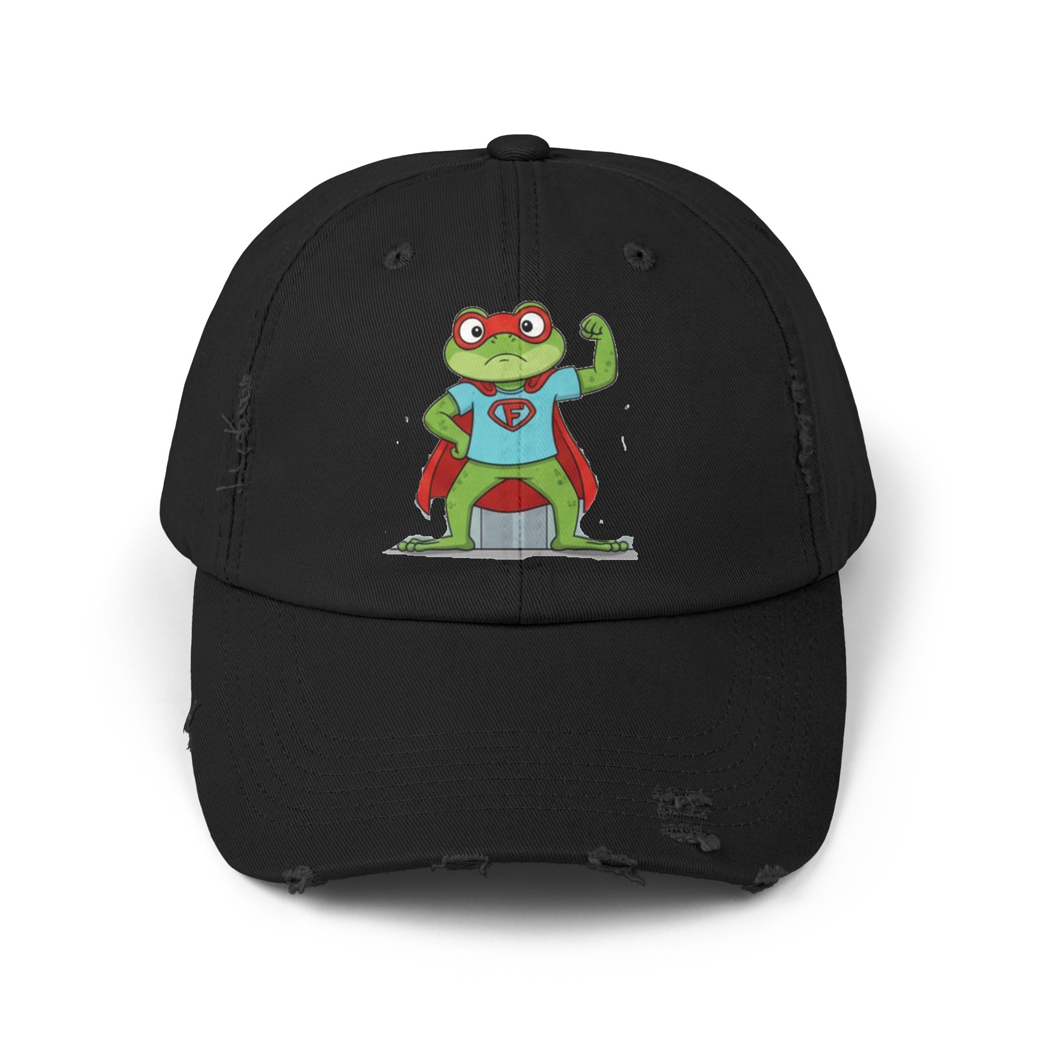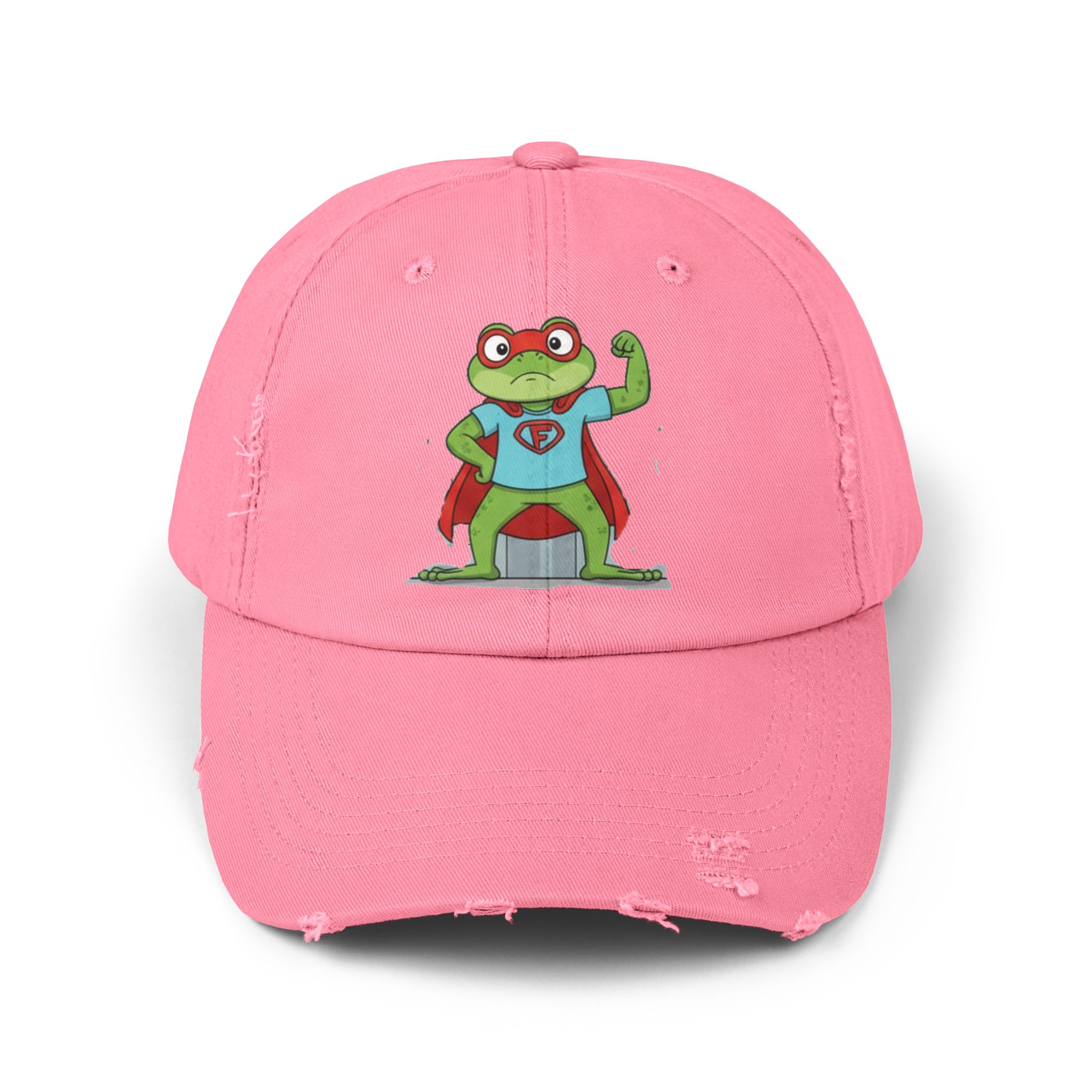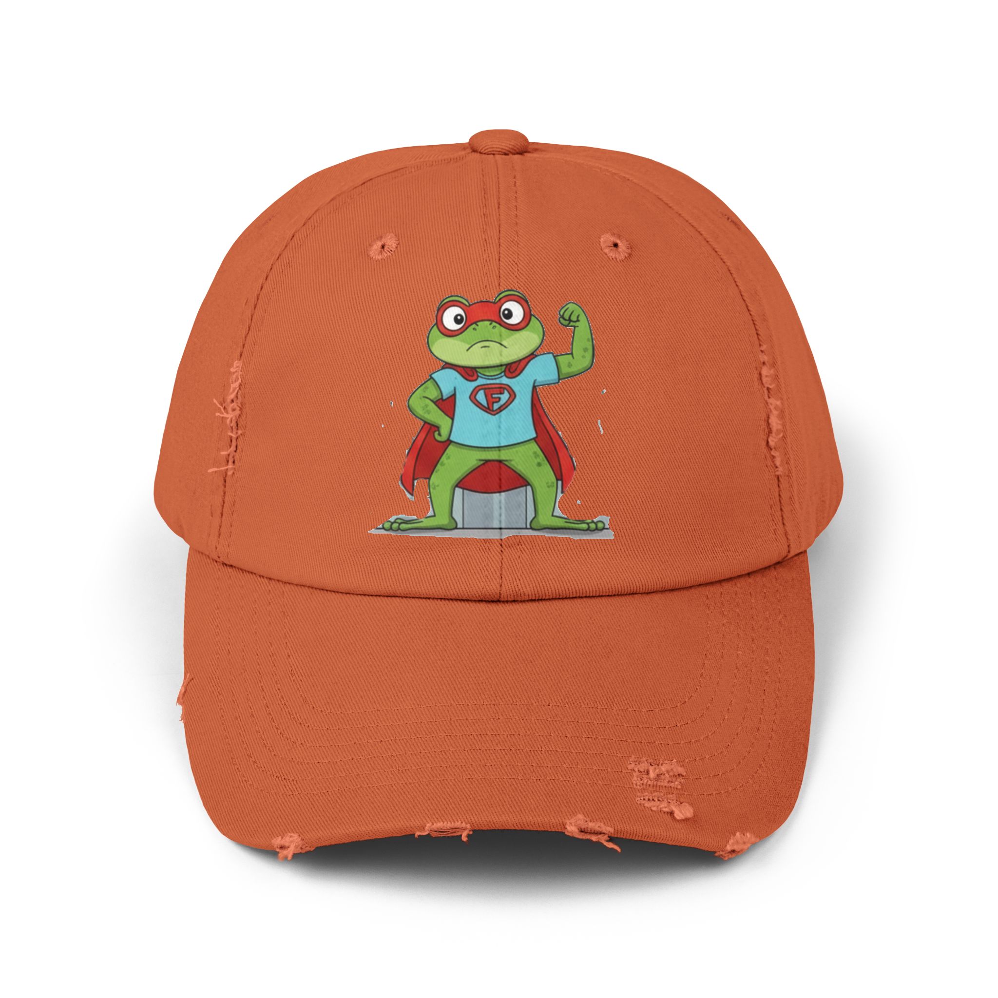 A laid-back, vintage-style cap that brings a playful, nostalgic energy to everyday wear. The soft, distressed cotton twill and low-profile, unstructured body let the hat sit comfortably and casually. A cheeky superhero frog print adds a whimsical, hand-drawn charm—like a small, confident mascot that nods to childhood comics and backyard adventures. Subtle distressing and D-ring strap details give each hat its own character, so it feels like a well-loved staple from day one. Wear it on slow weekend mornings, while running errands, or to add a lighthearted touch to outdoor meetups and casual gatherings.