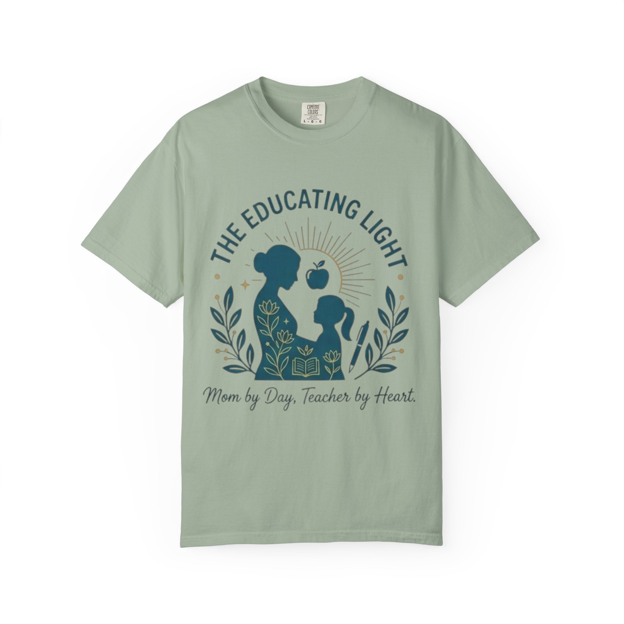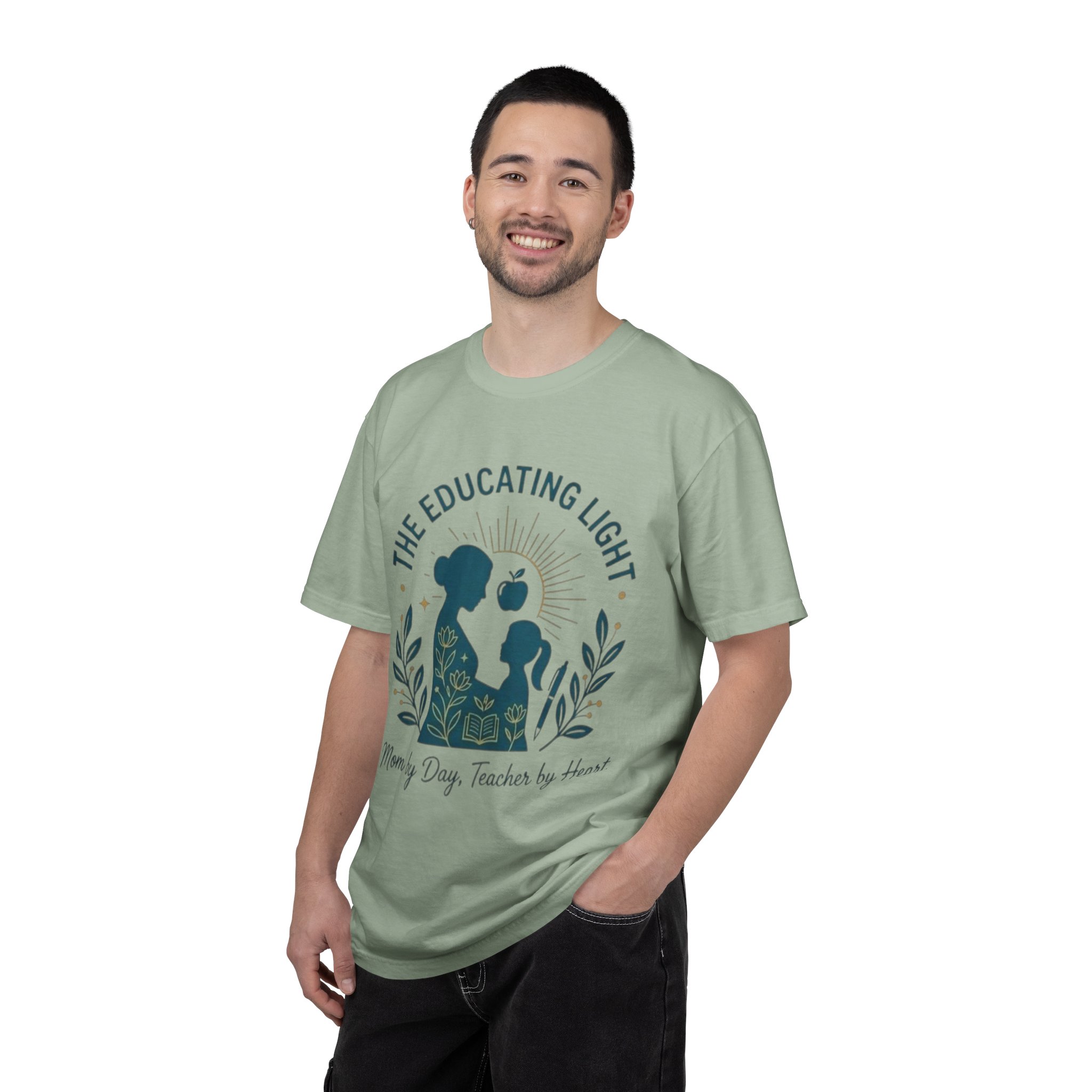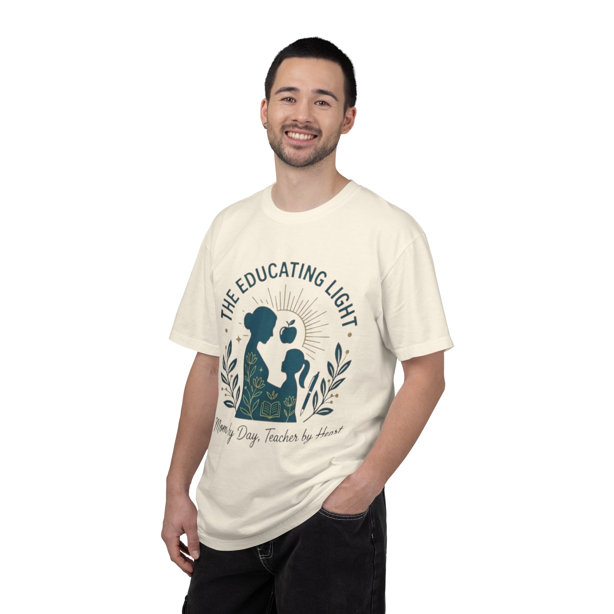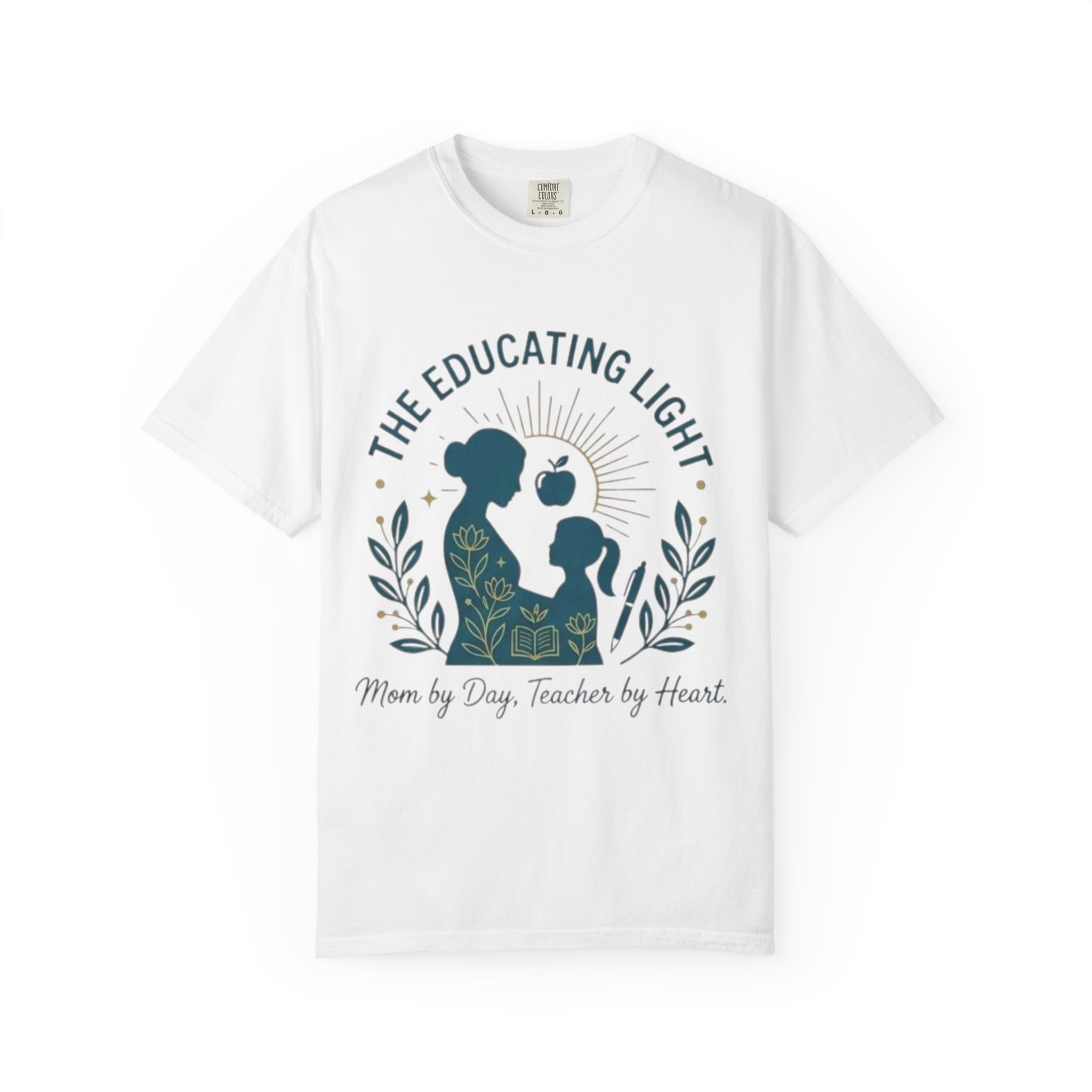 Soft, sturdy, and quietly expressive — this garment-dyed tee wears like a lived-in favorite while carrying a heartfelt message. The front artwork gently silhouettes a mother and child framed by leafy motifs and a small apple, with the wording “The Educating Light” above and “Mom by Day, Teacher by Heart” below. It reads like a warm nod to the women who balance lesson plans and lullabies: calm, capable, and cared for. The heavyweight cotton and relaxed cut give it structure without stiffness; the garment-dye treatment softens the fiber and deepens color so the print sits in harmony with the fabric. Wear it to parent-teacher evenings, school drop-offs, or slow weekend mornings — it layers easily under a cardigan or stands on its own as a quiet statement of devotion to both family and classroom.
