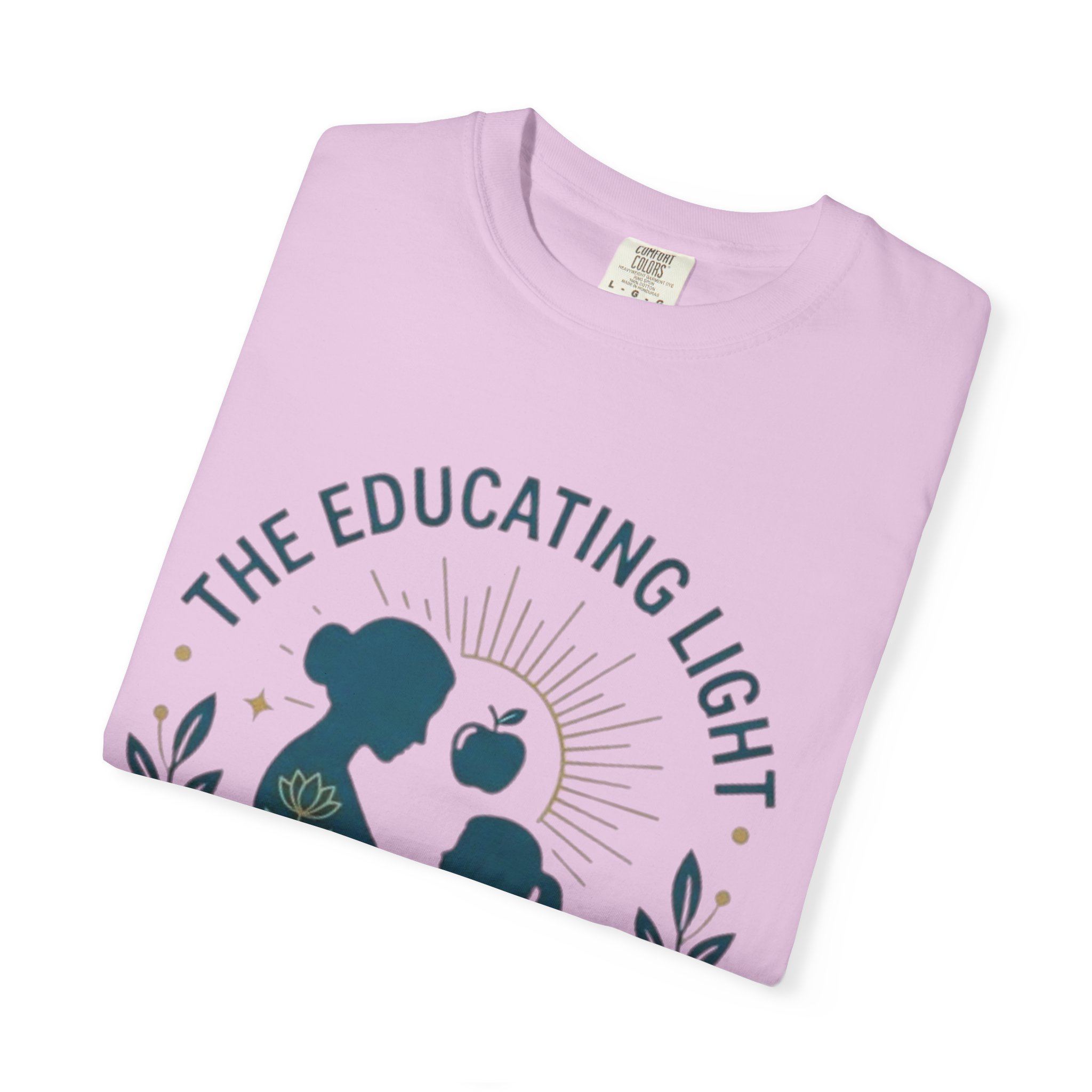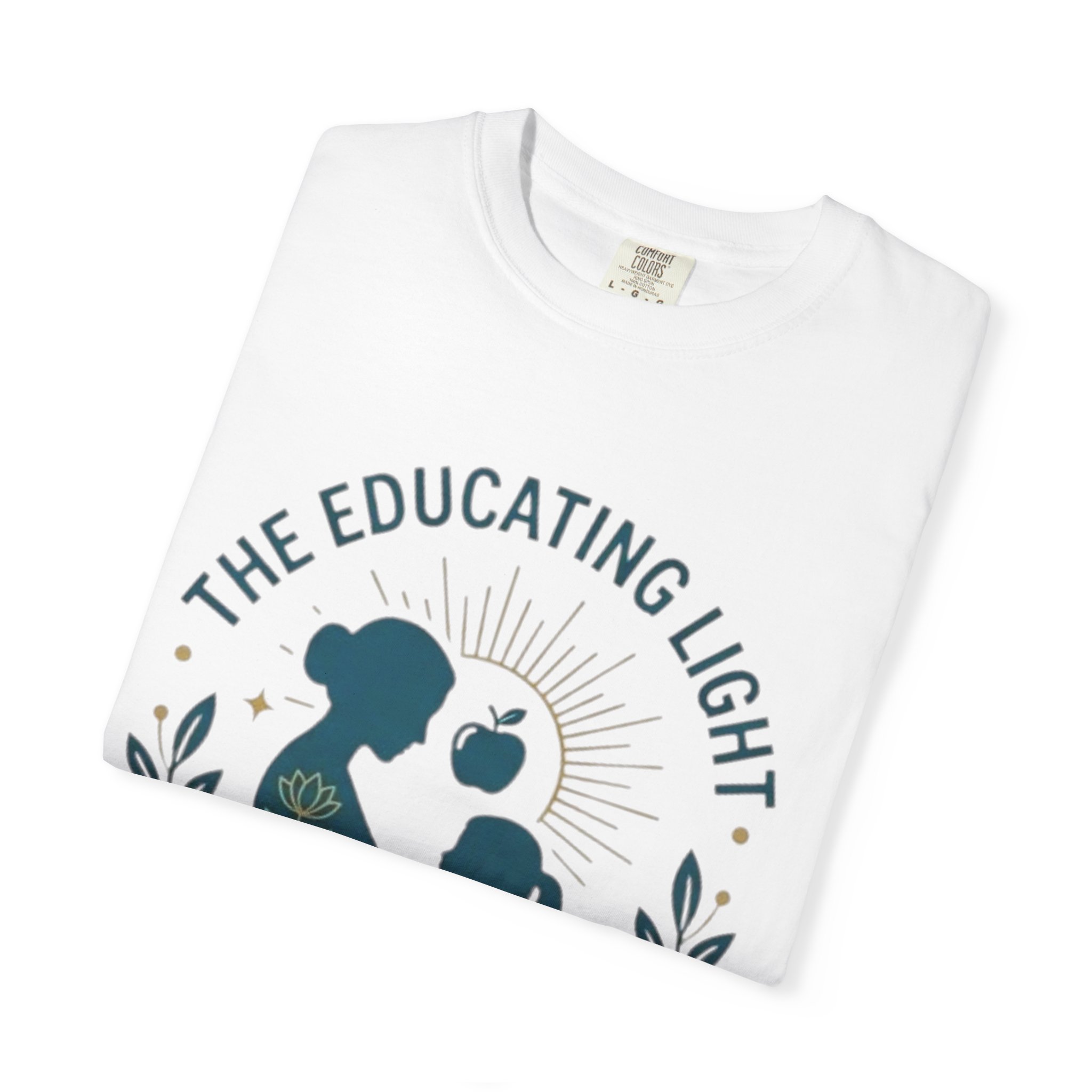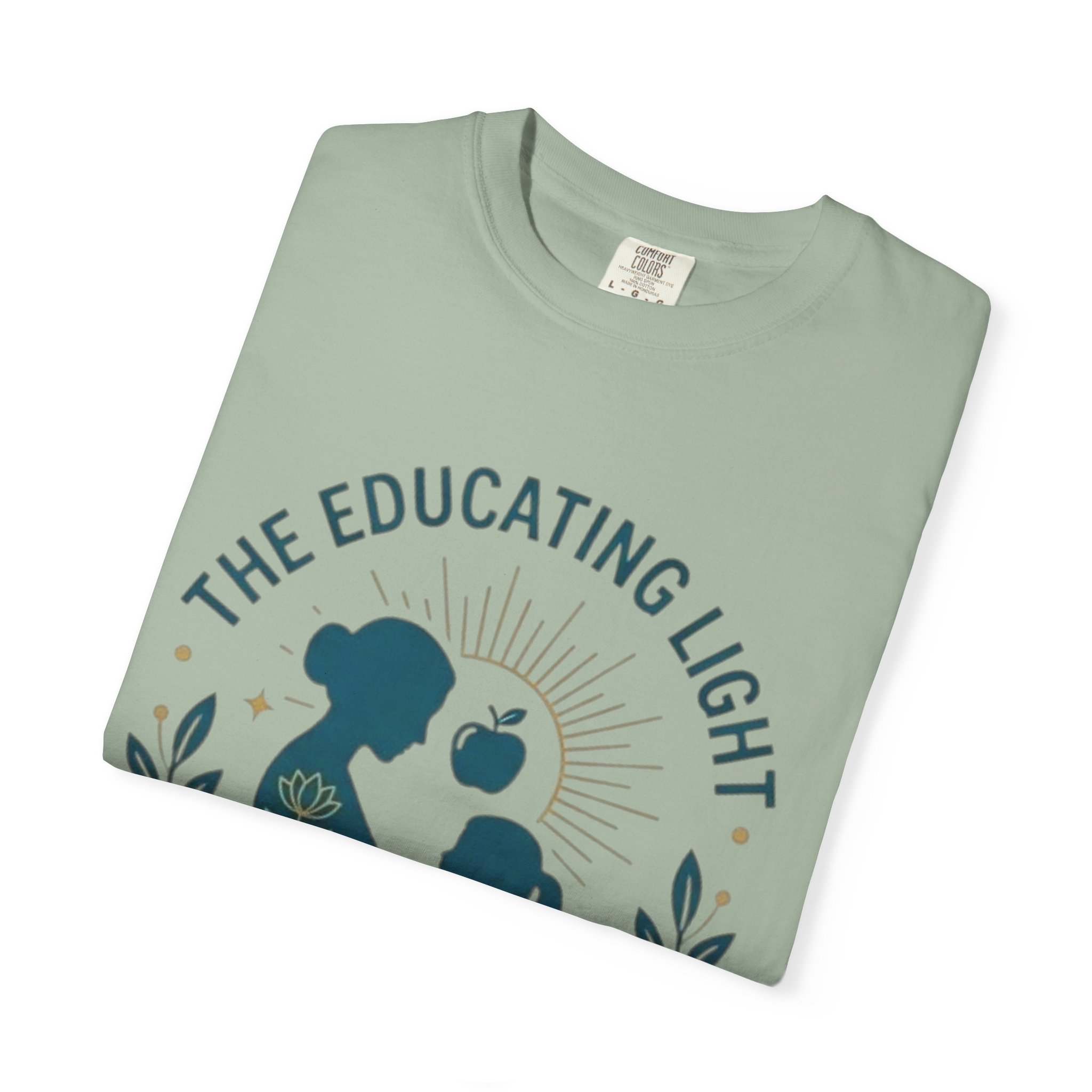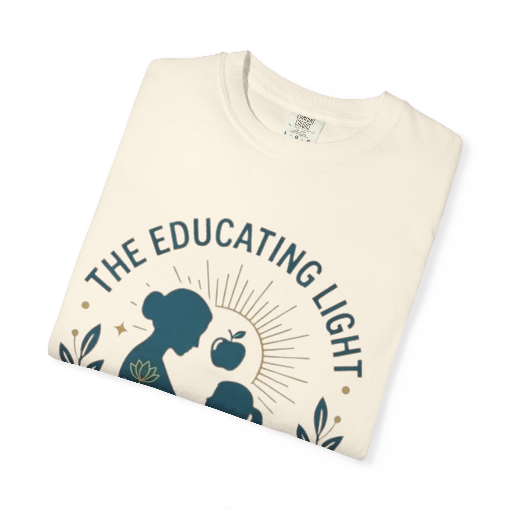 Soft, sturdy, and quietly expressive — this garment-dyed tee wears like a lived-in favorite while carrying a heartfelt message. The front artwork gently silhouettes a mother and child framed by leafy motifs and a small apple, with the wording “The Educating Light” above and “Mom by Day, Teacher by Heart” below. It reads like a warm nod to the women who balance lesson plans and lullabies: calm, capable, and cared for. The heavyweight cotton and relaxed cut give it structure without stiffness; the garment-dye treatment softens the fiber and deepens color so the print sits in harmony with the fabric. Wear it to parent-teacher evenings, school drop-offs, or slow weekend mornings — it layers easily under a cardigan or stands on its own as a quiet statement of devotion to both family and classroom.